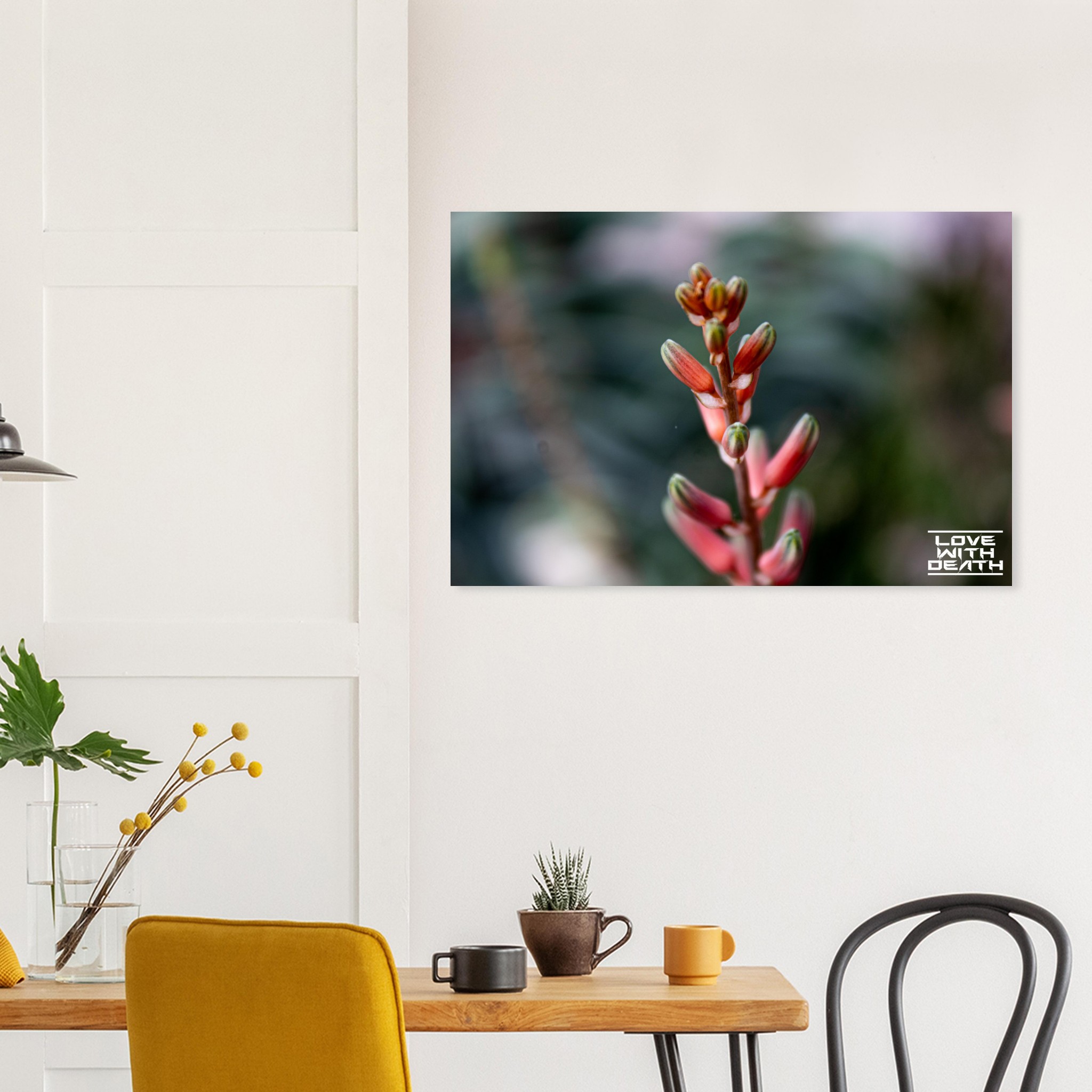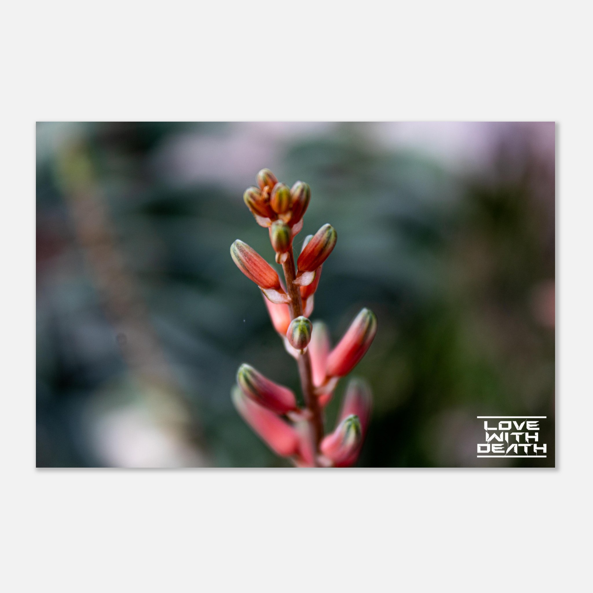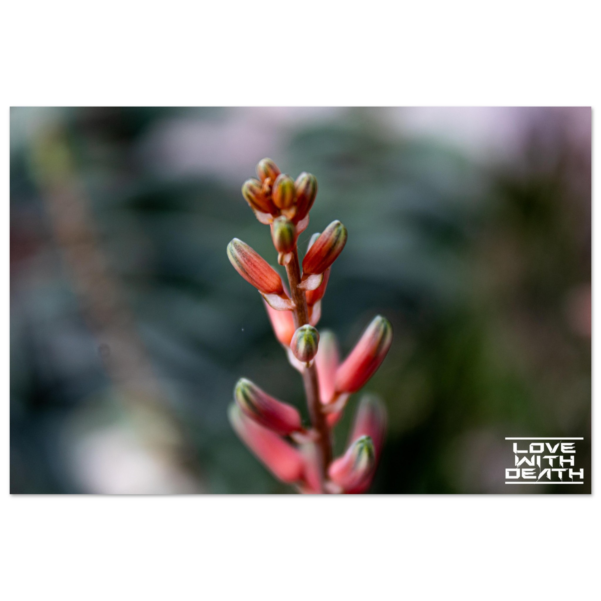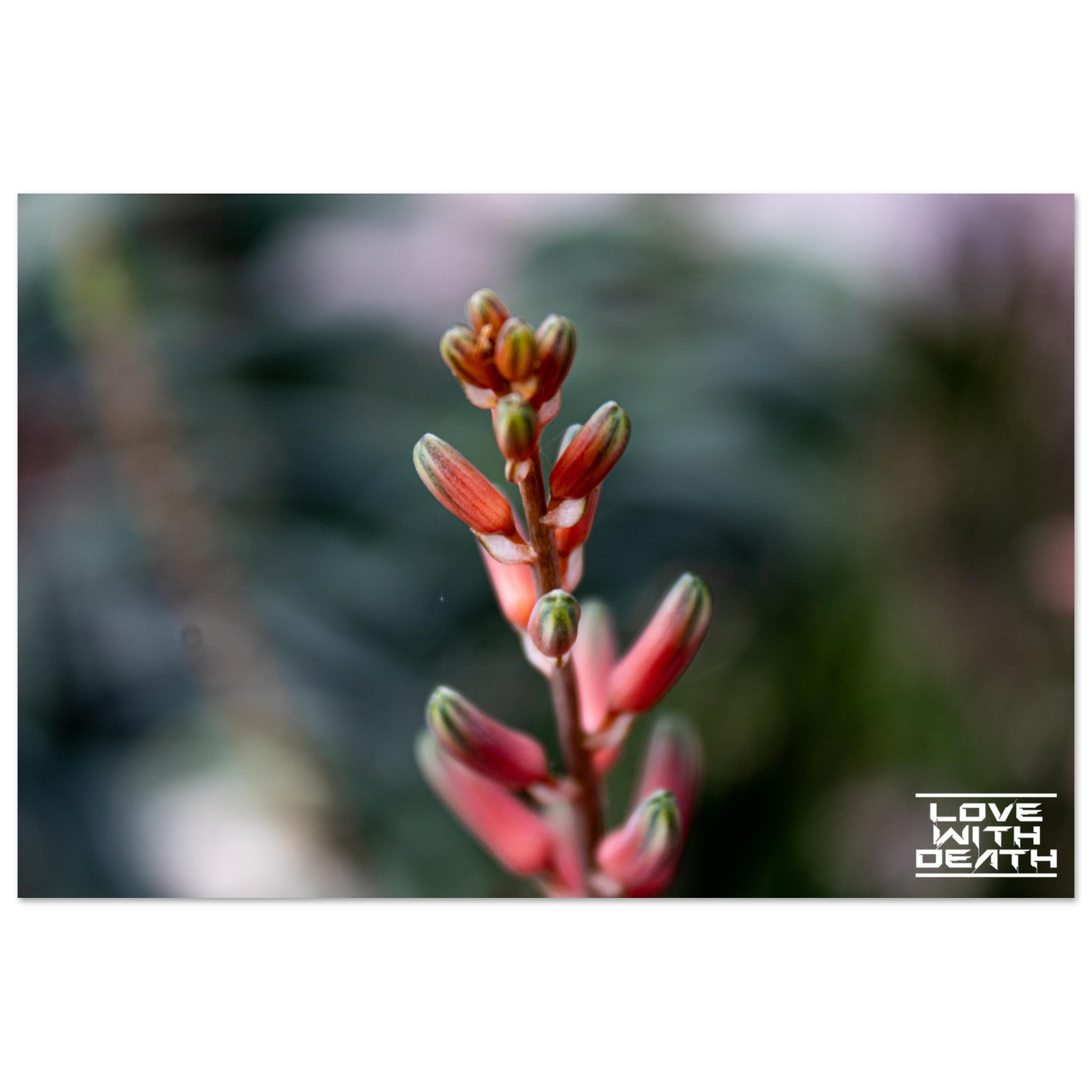 This close-up captures the delicate beauty of a plant in budding glory. The warm red and green hues of the buds gently contrast with the soft, blurred background, emphasizing the elegance and fragility of nature.