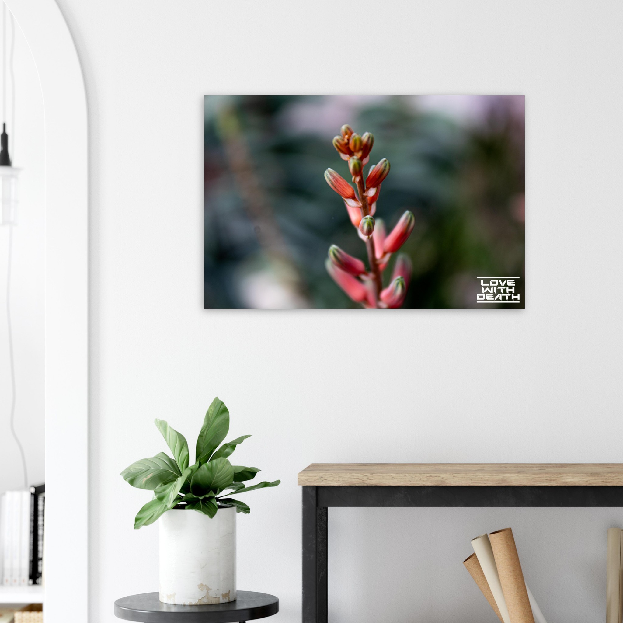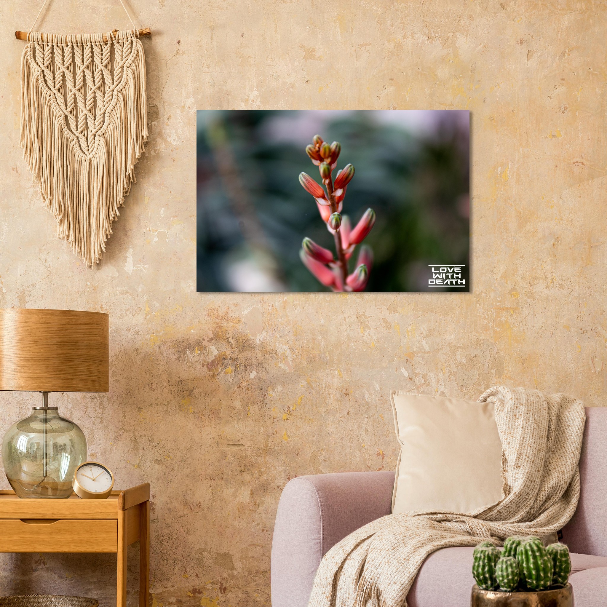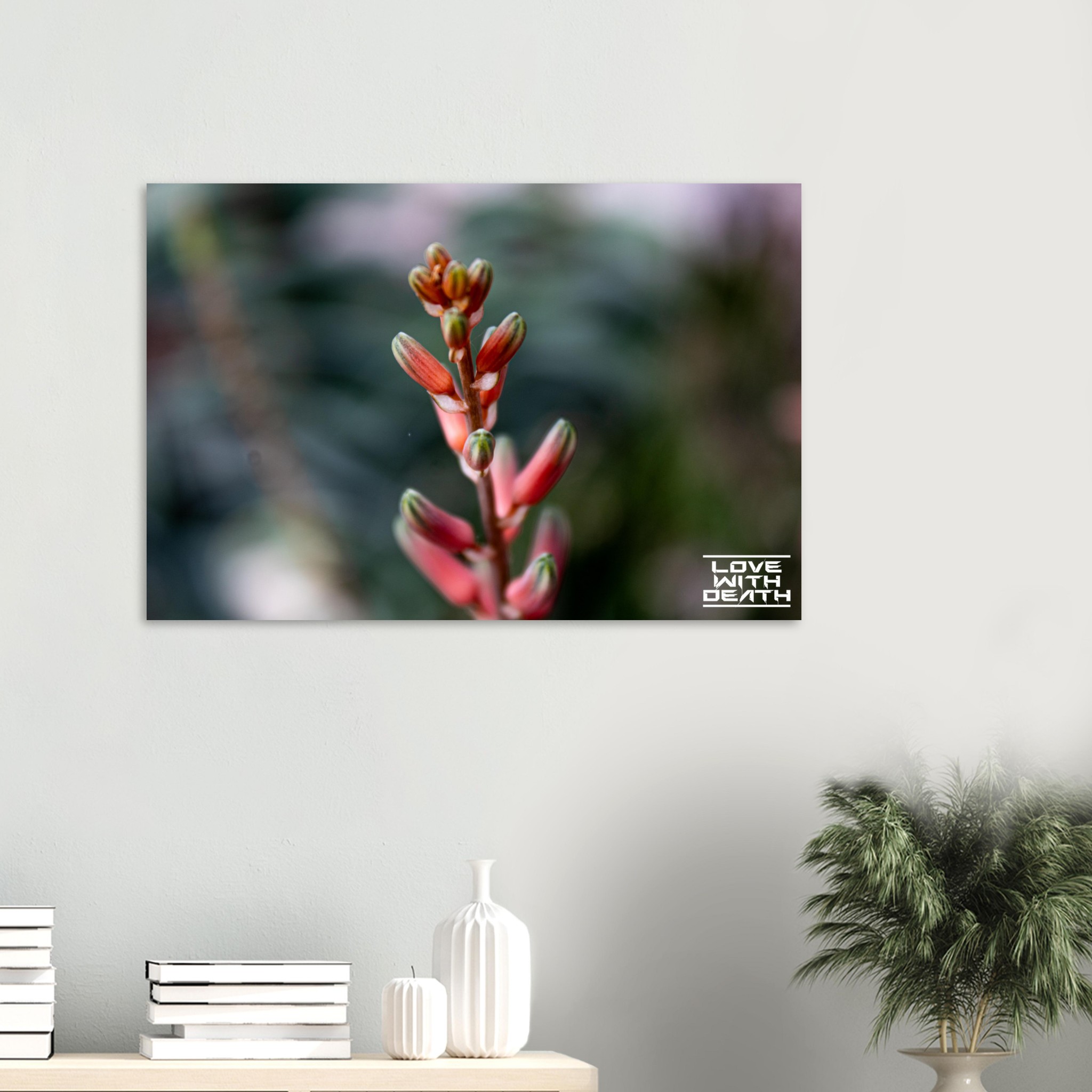 This close-up captures the delicate beauty of a plant in budding glory. The warm red and green hues of the buds gently contrast with the soft, blurred background, emphasizing the elegance and fragility of nature.