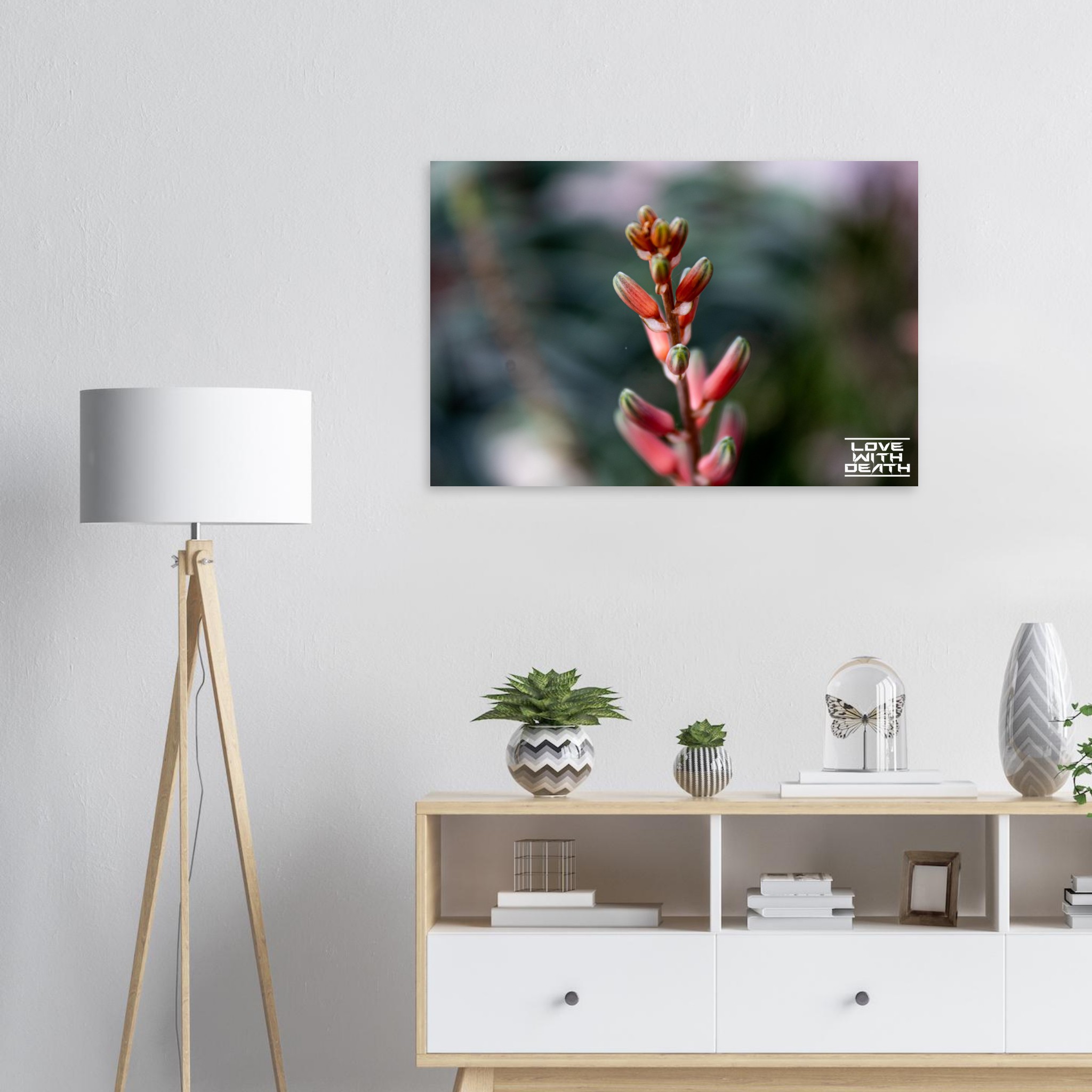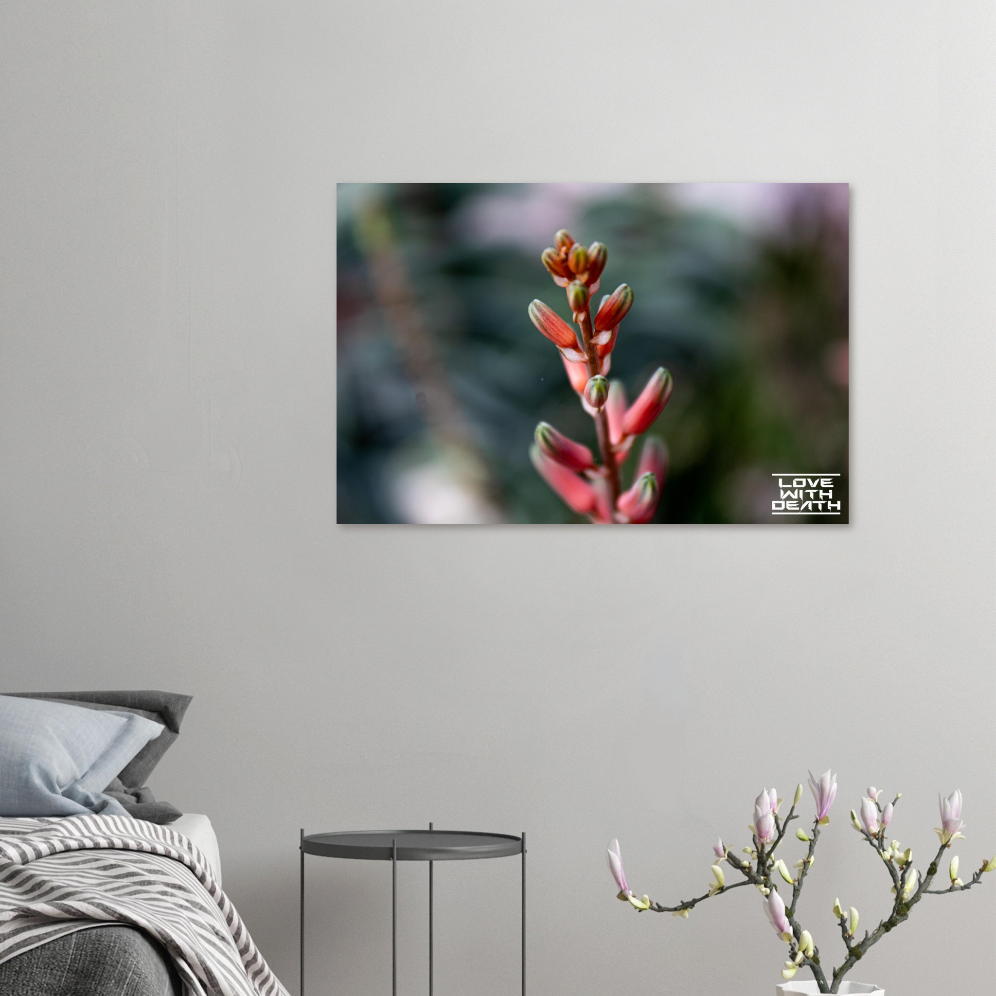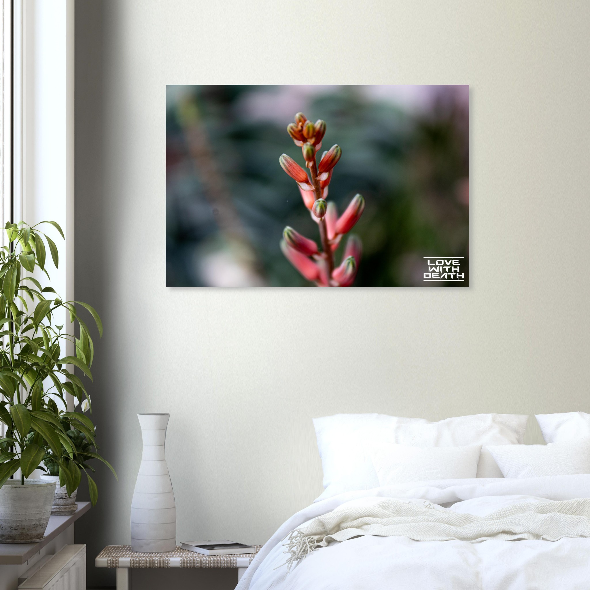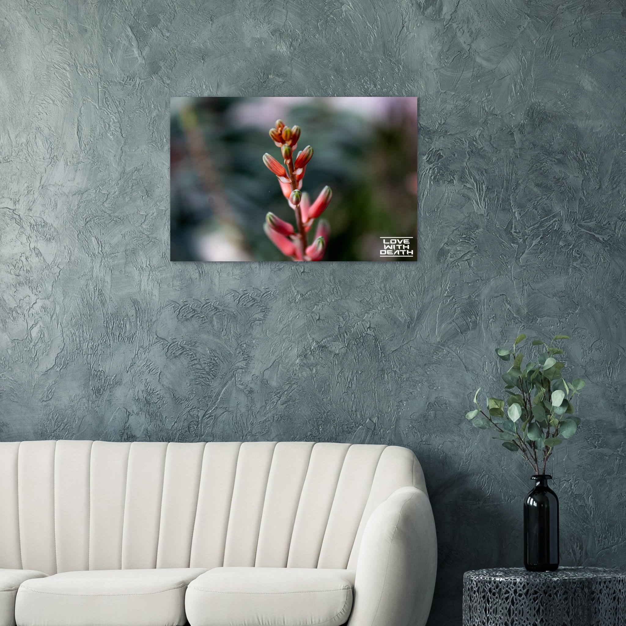 This close-up captures the delicate beauty of a plant in budding glory. The warm red and green hues of the buds gently contrast with the soft, blurred background, emphasizing the elegance and fragility of nature.