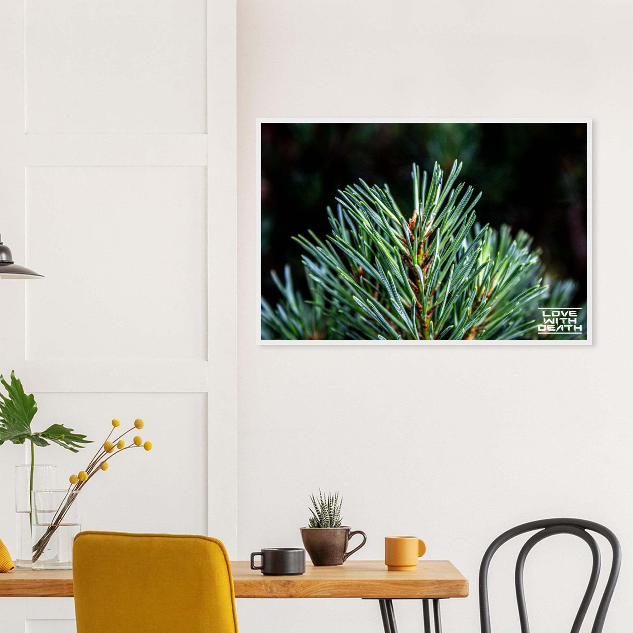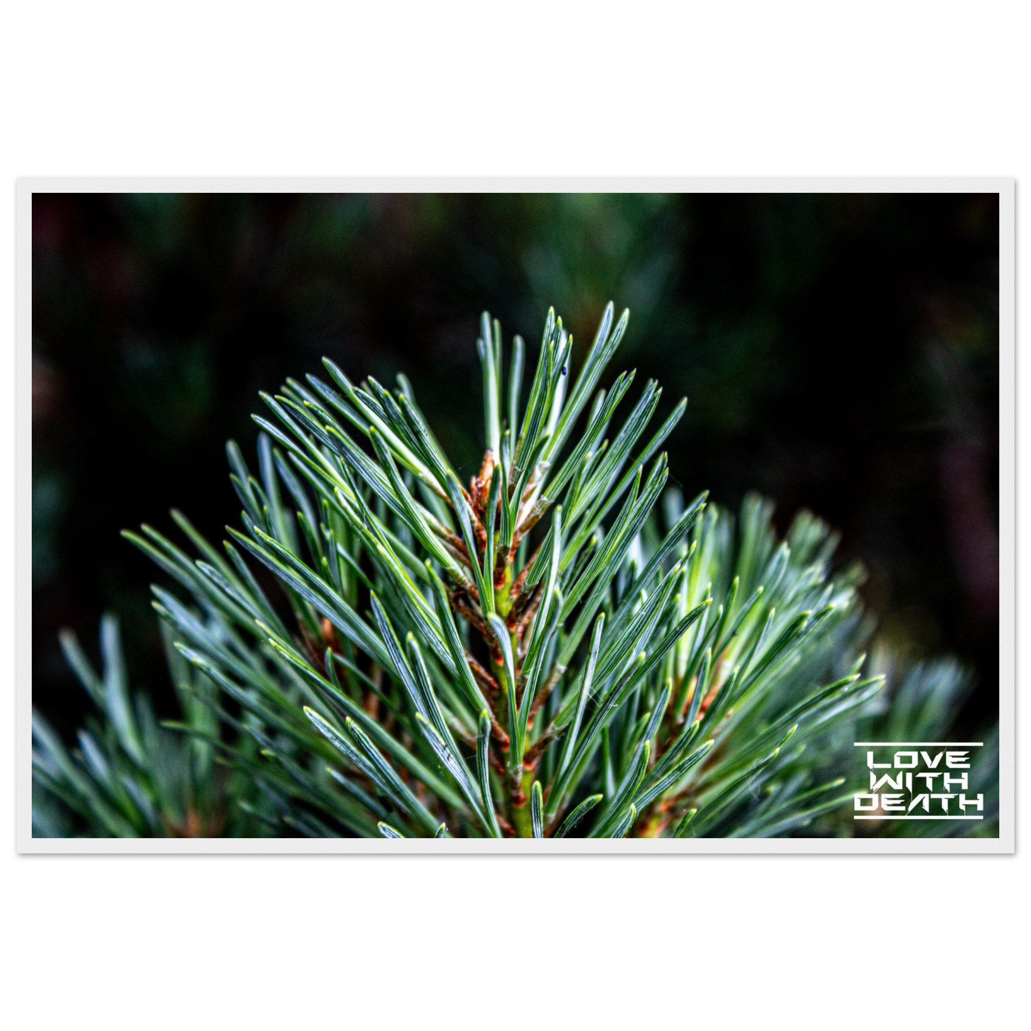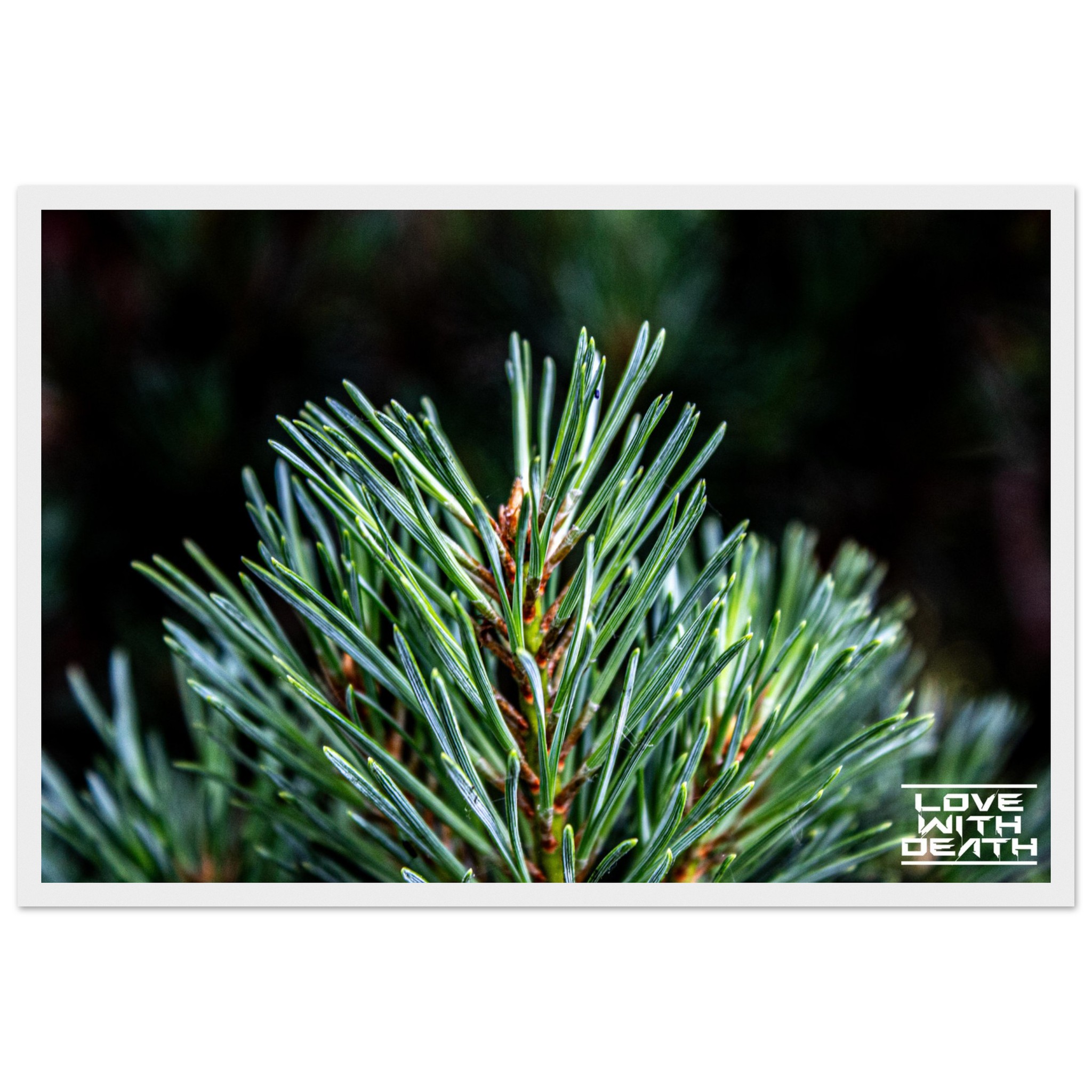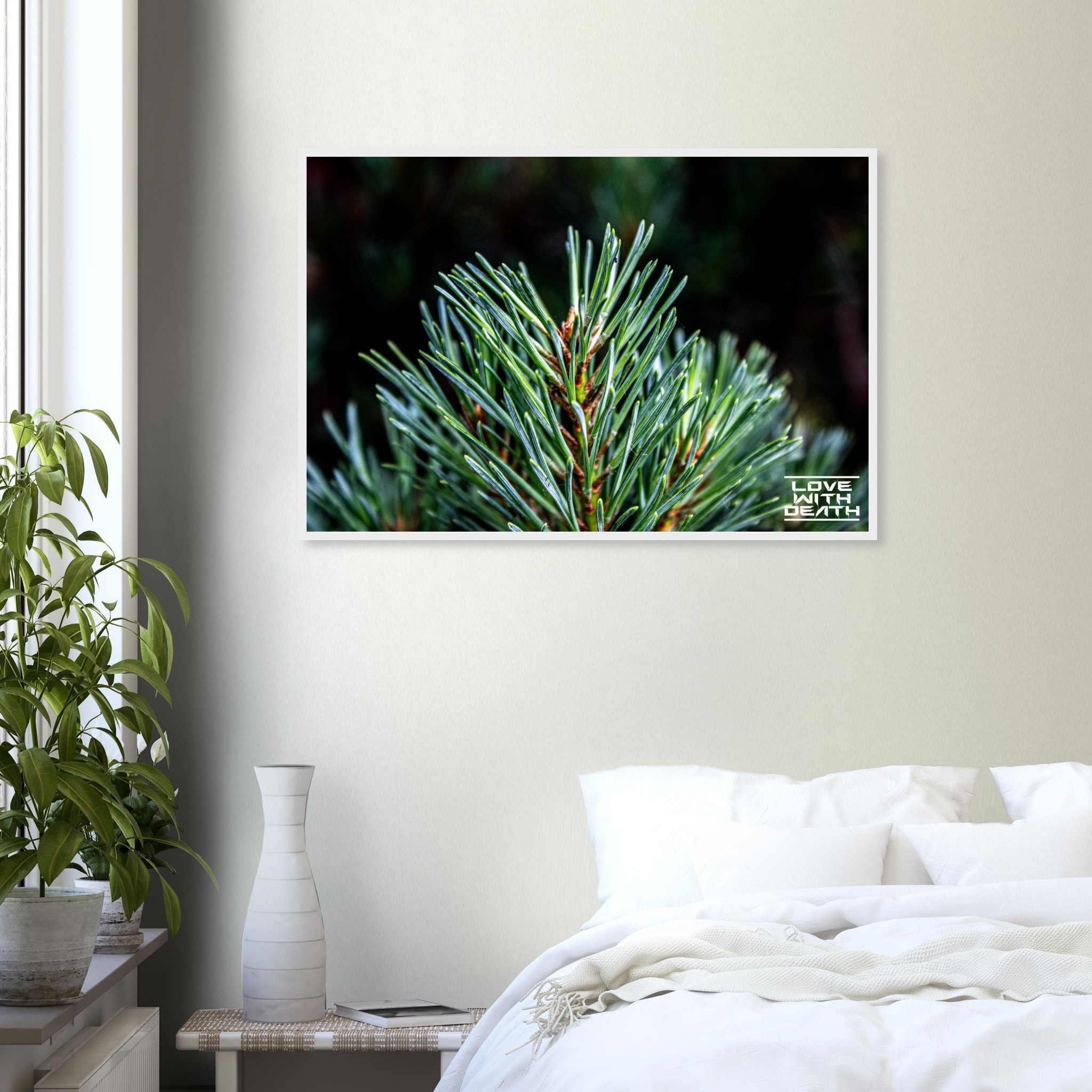 A close-up shot of a fresh pine needle branch. The fine, green needles are sharply focused, while the background fades into a pleasant bokeh. This image symbolizes serenity and the resilience of nature, perfect for the winter season or as a reminder of the forest.
