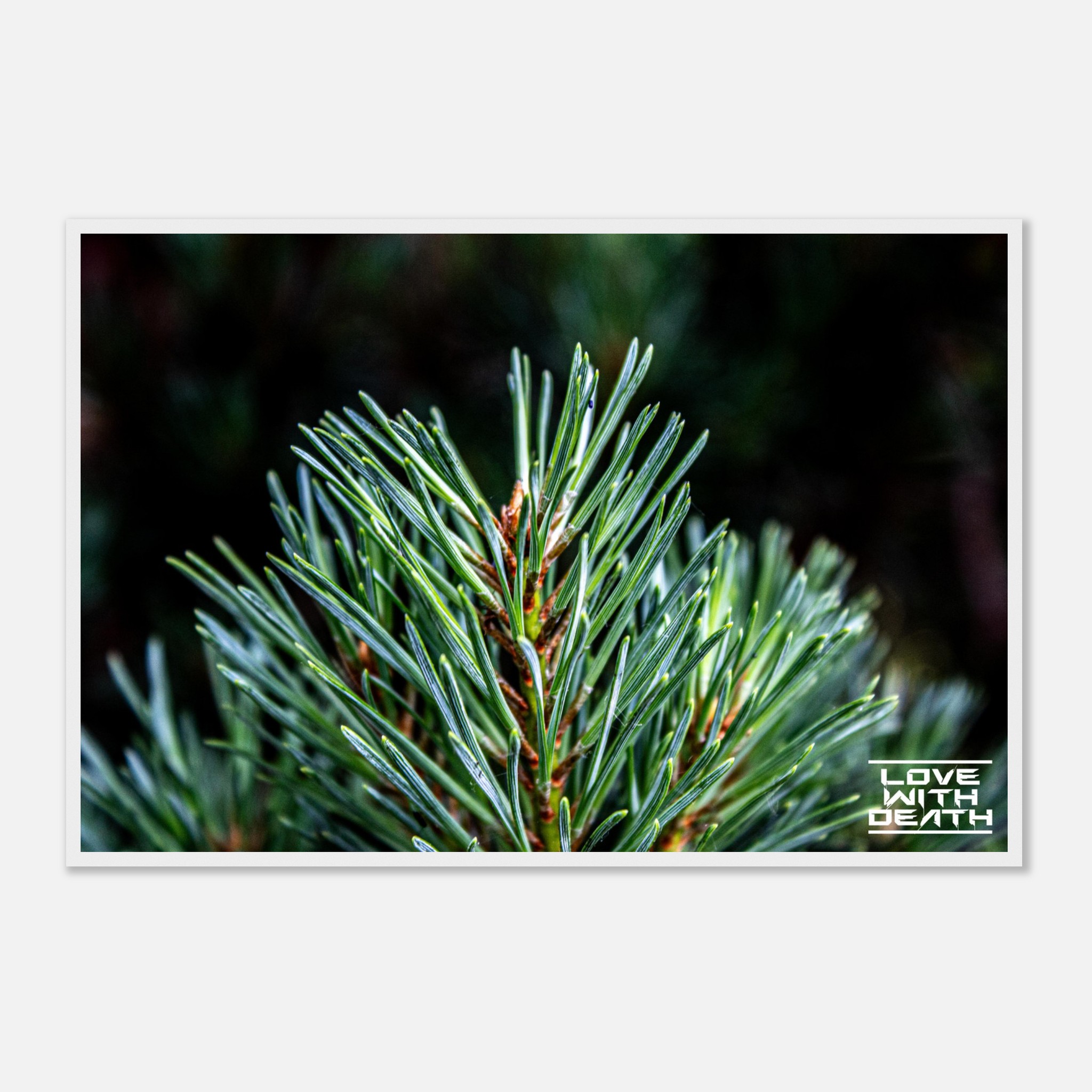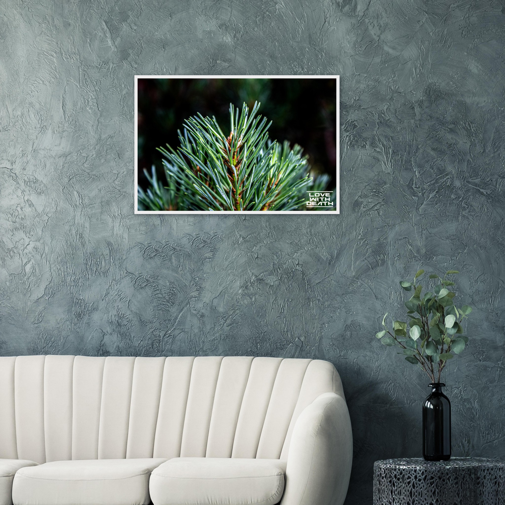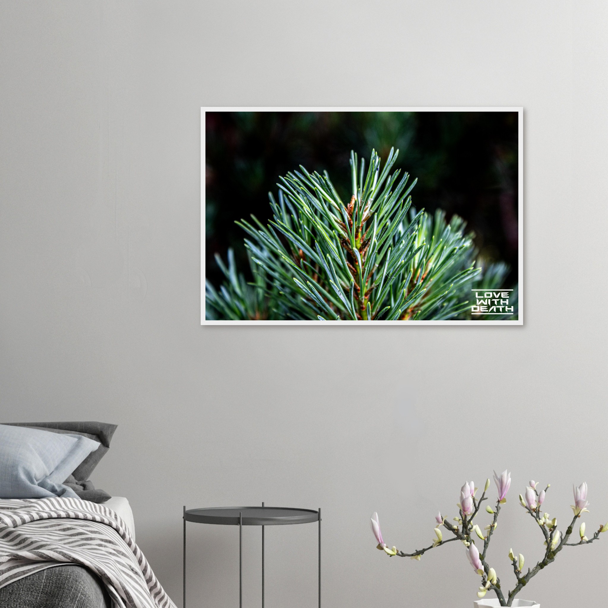 A close-up shot of a fresh pine needle branch. The fine, green needles are sharply focused, while the background fades into a pleasant bokeh. This image symbolizes serenity and the resilience of nature, perfect for the winter season or as a reminder of the forest.