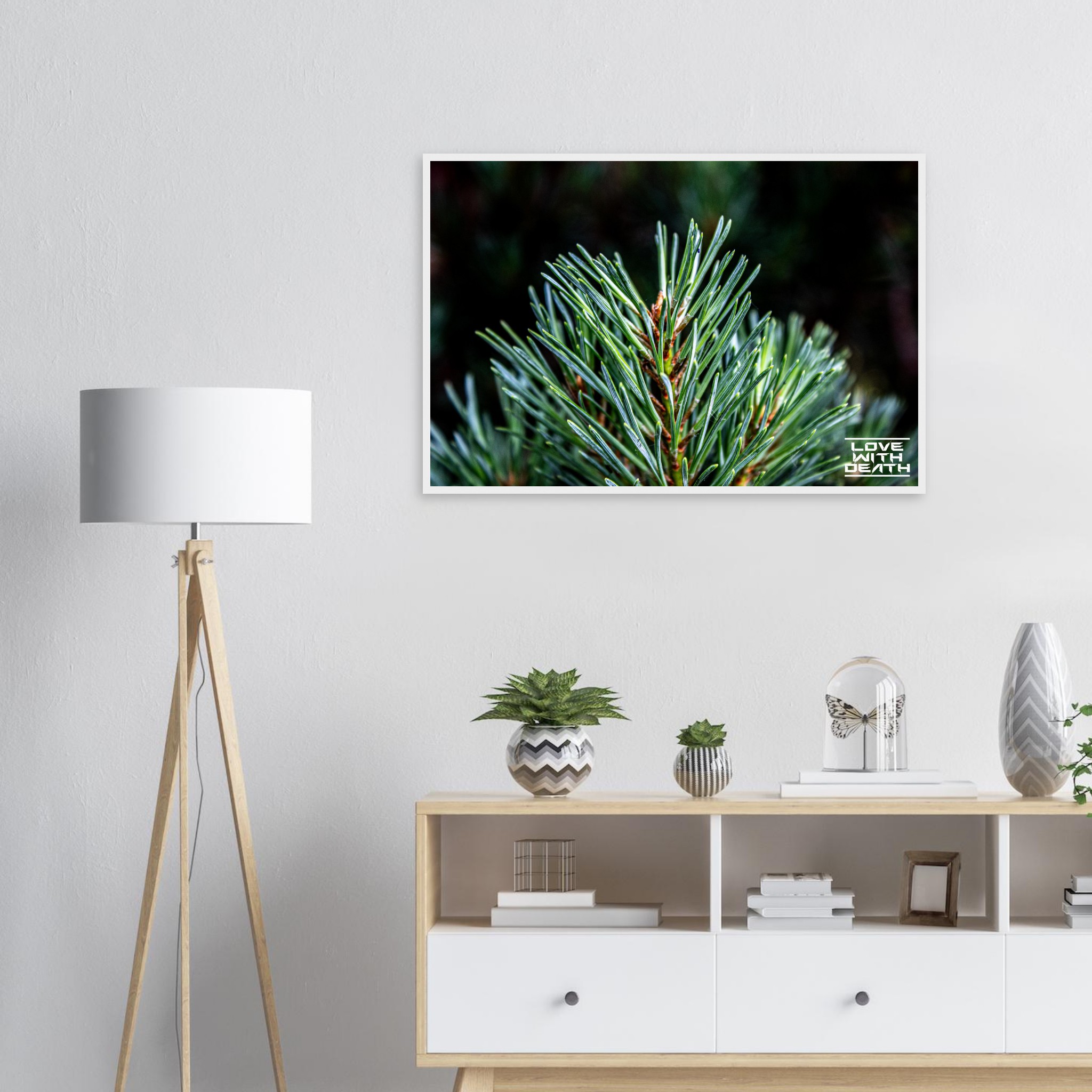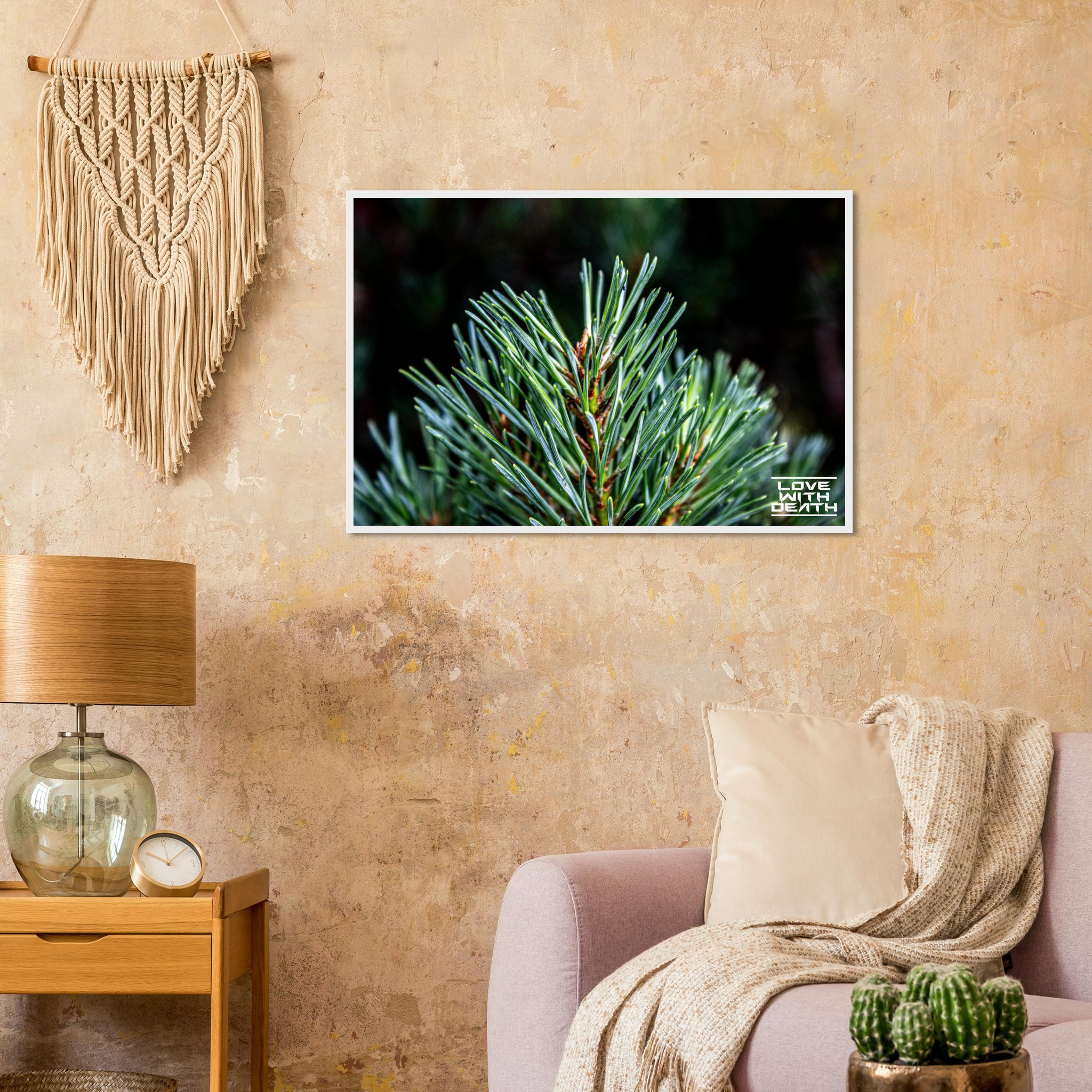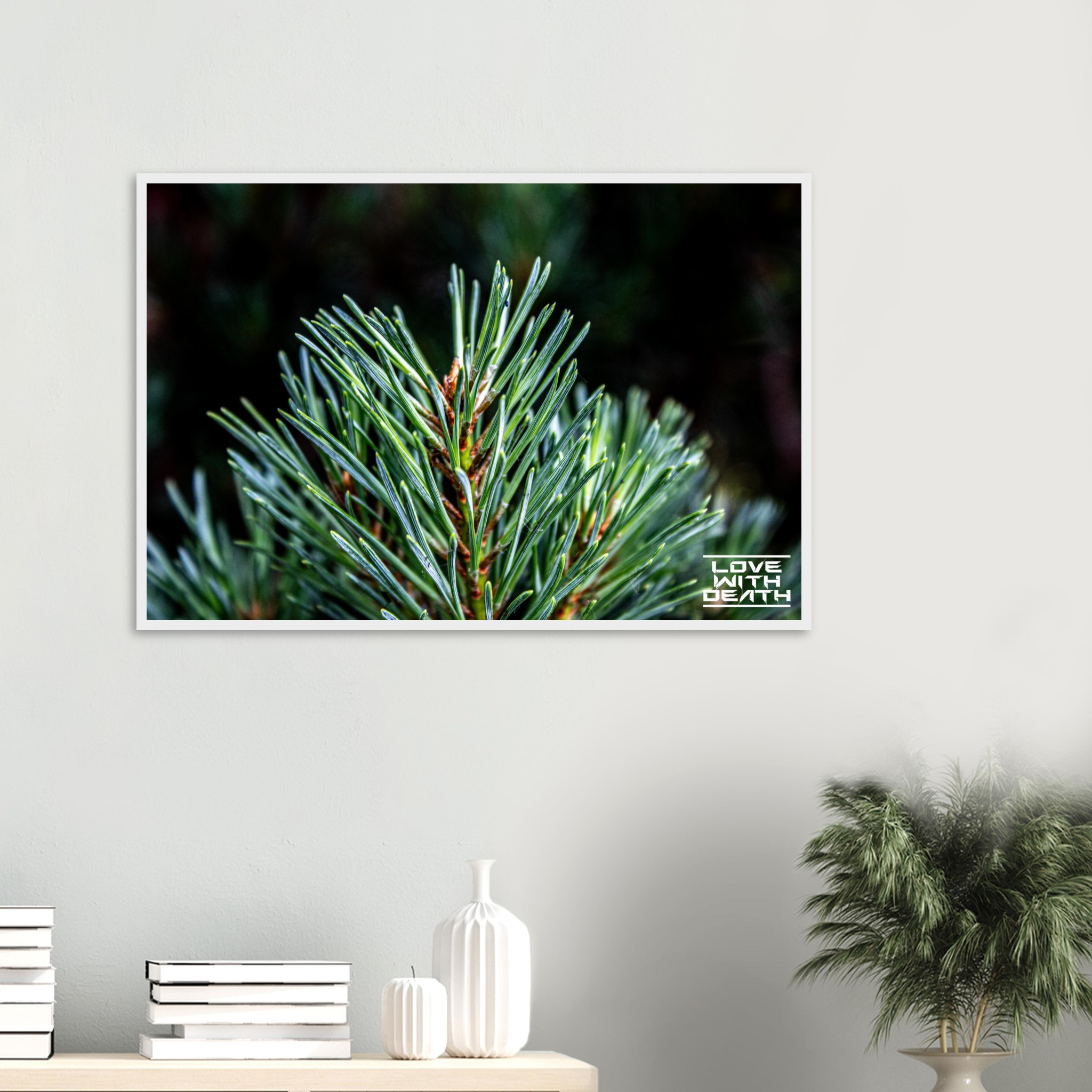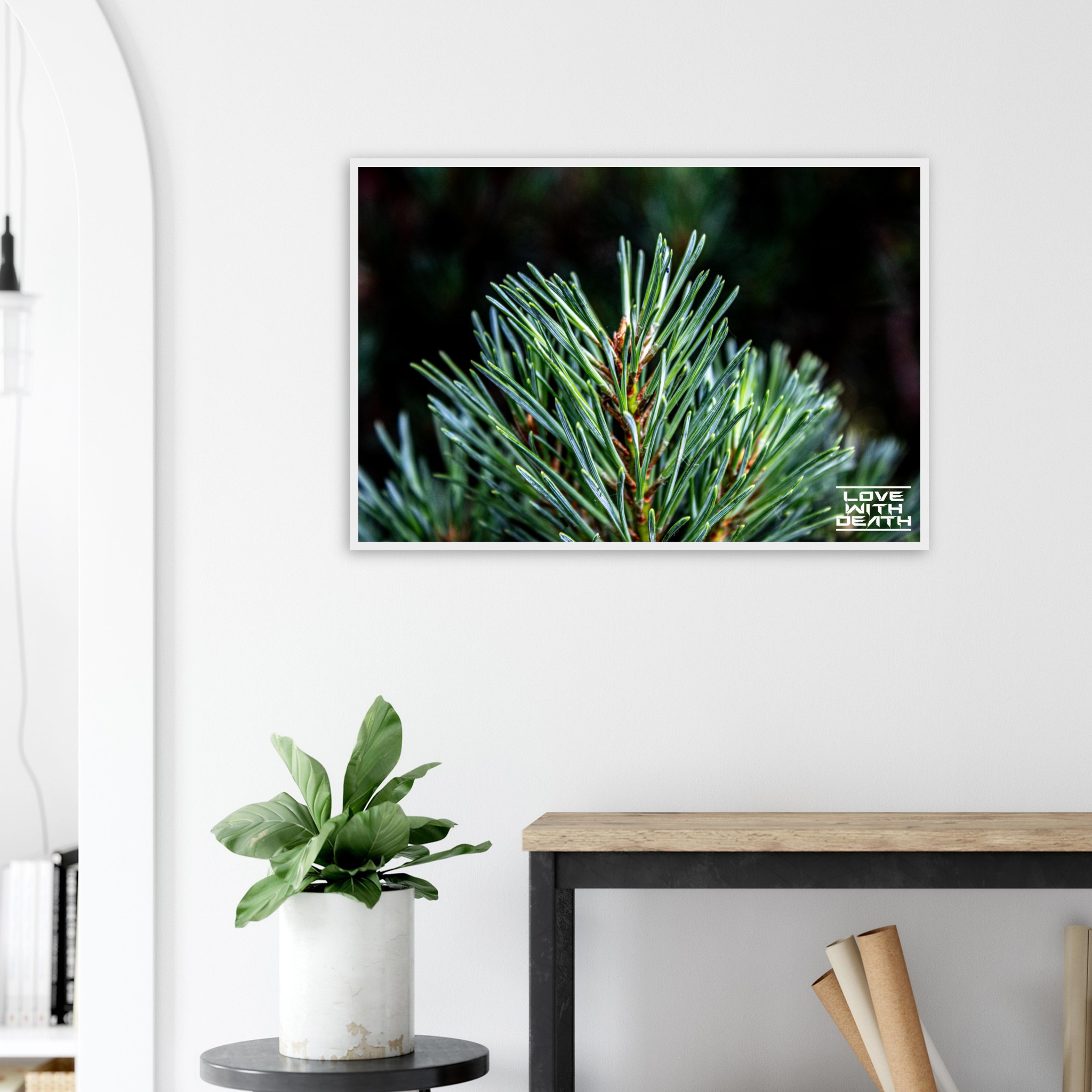 A close-up shot of a fresh pine needle branch. The fine, green needles are sharply focused, while the background fades into a pleasant bokeh. This image symbolizes serenity and the resilience of nature, perfect for the winter season or as a reminder of the forest.