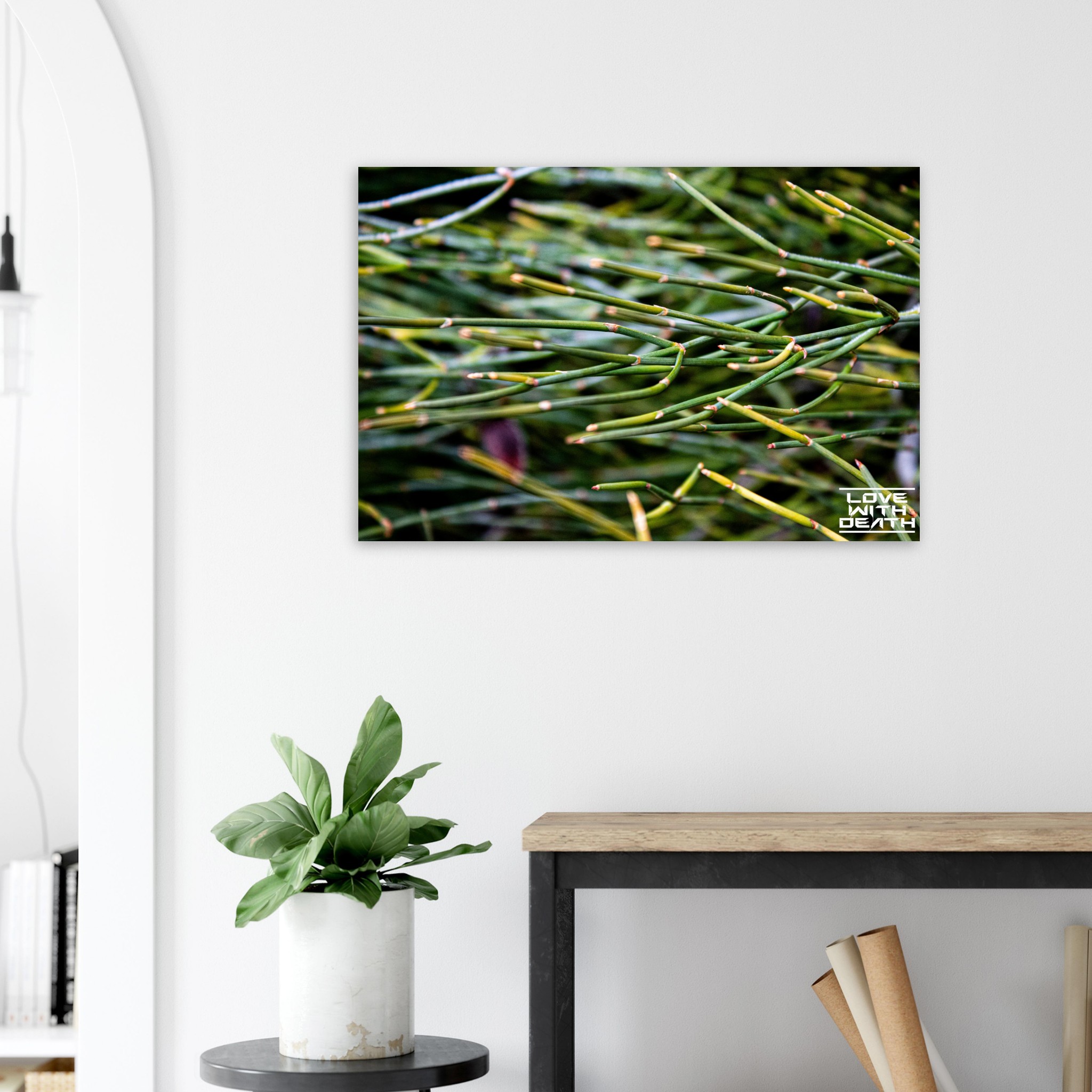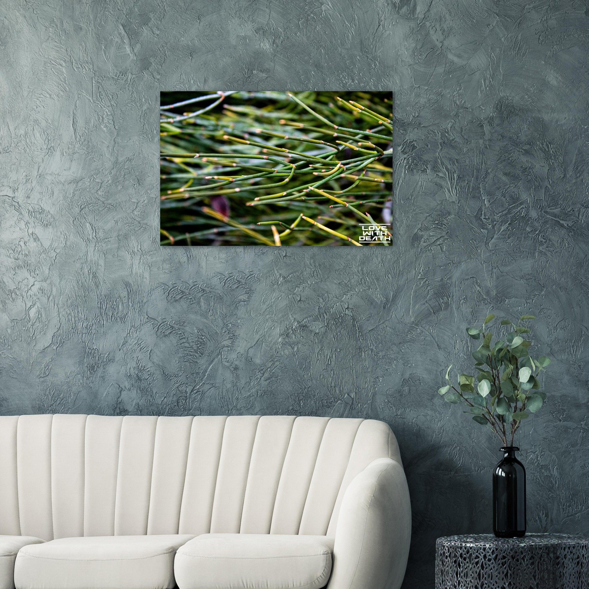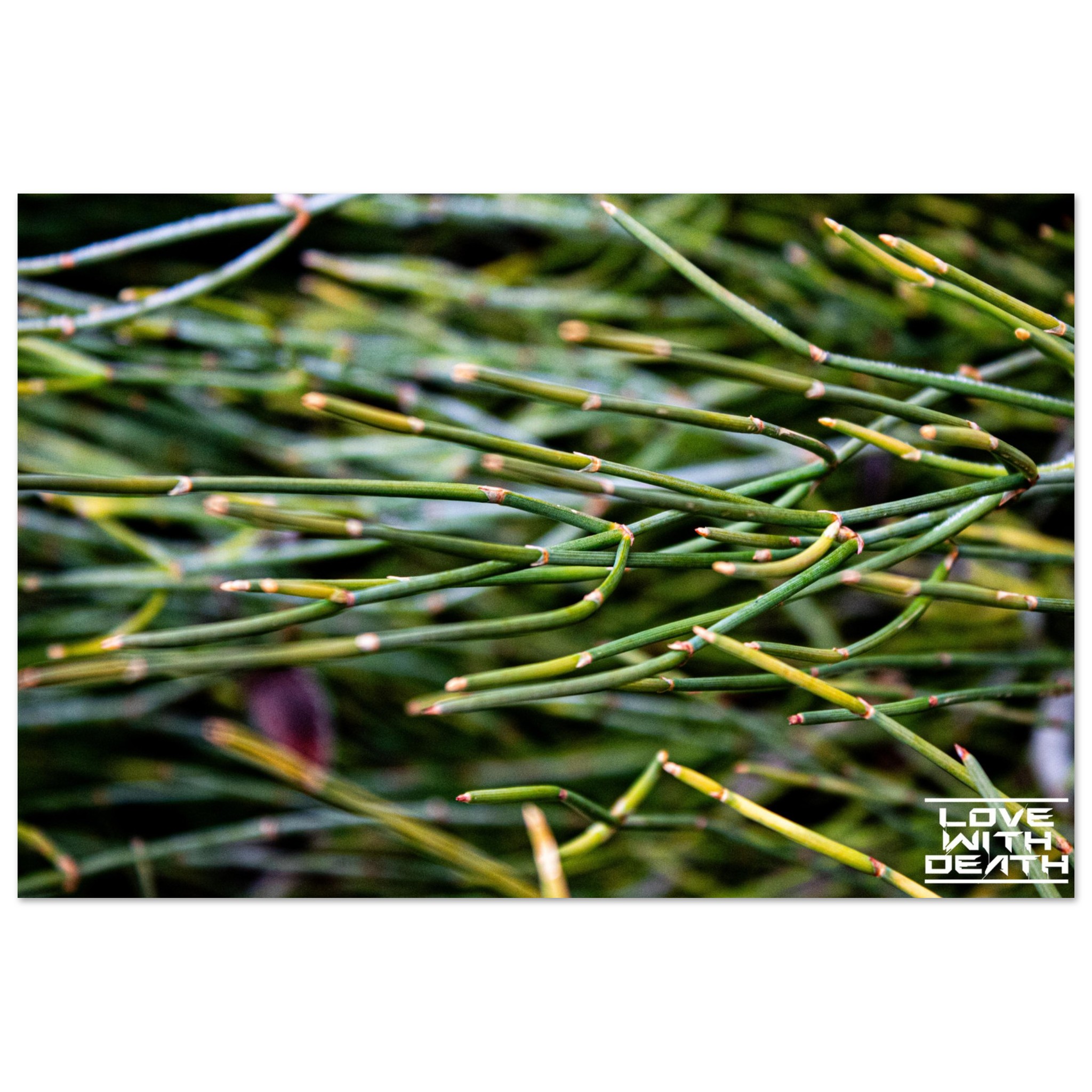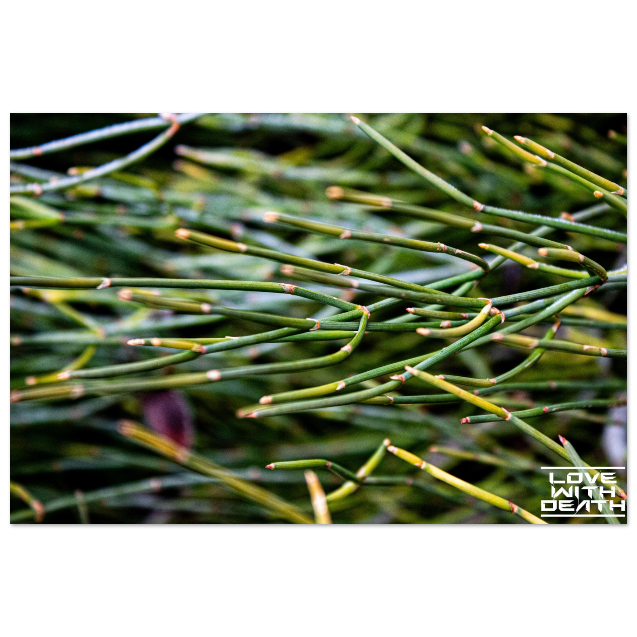 This photo captures a close-up of delicate, needle-like plants arranged in a complex yet harmonious pattern. The fine green-yellow tips add a touch of dynamism, while the soft color contrasts highlight the organic aesthetic.