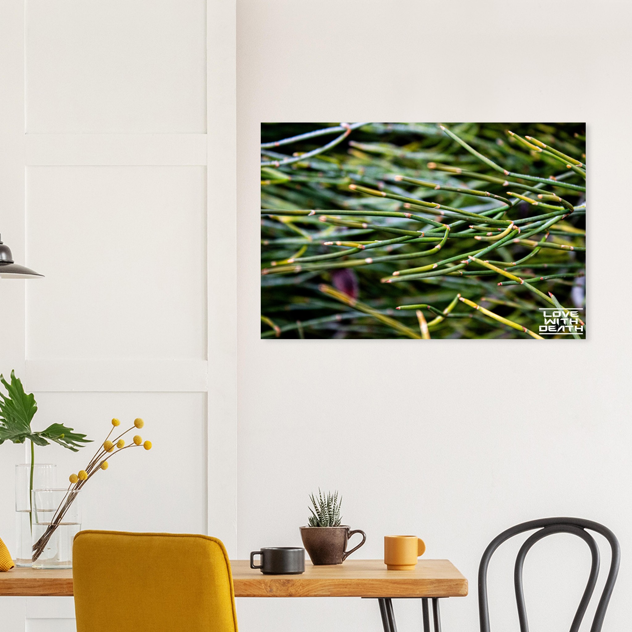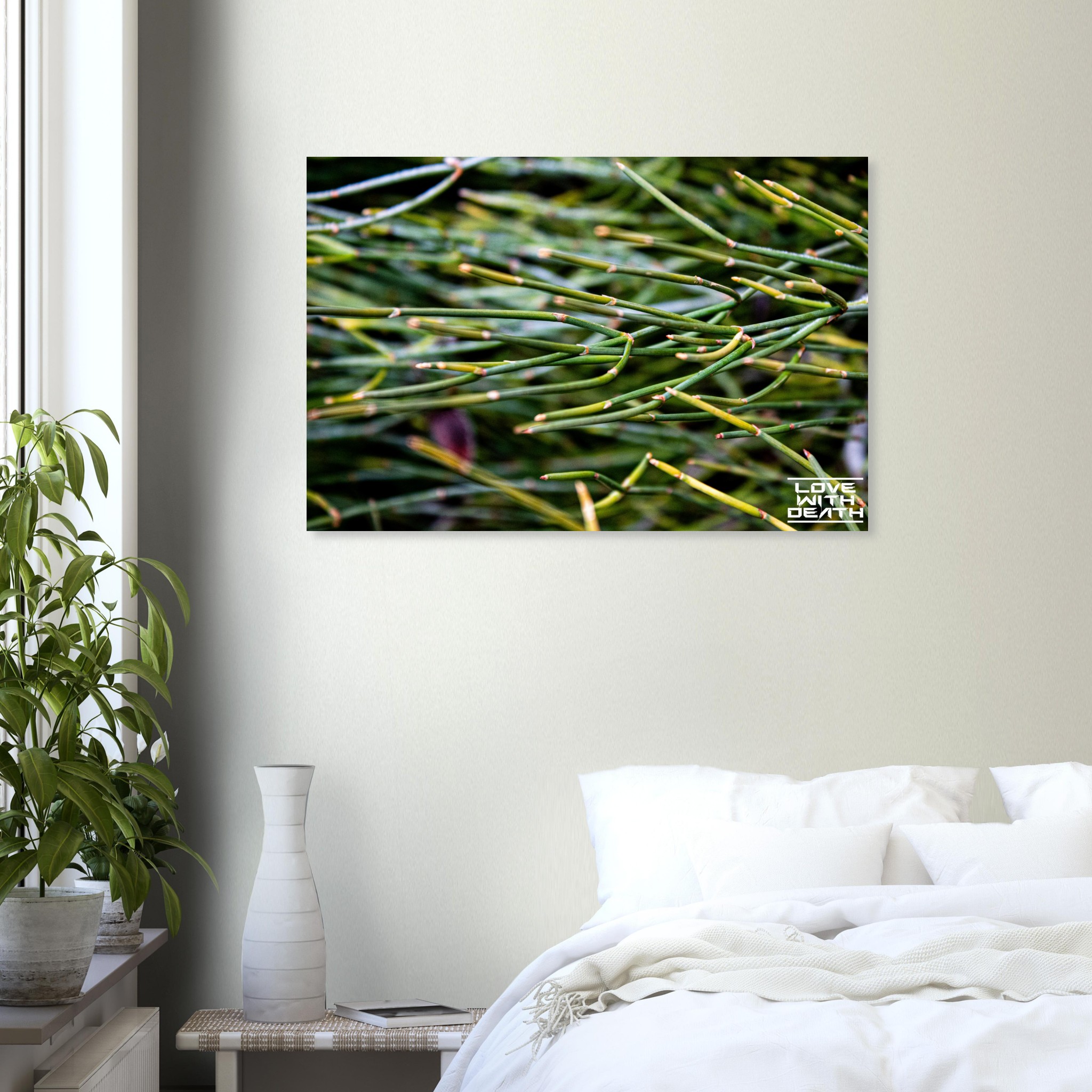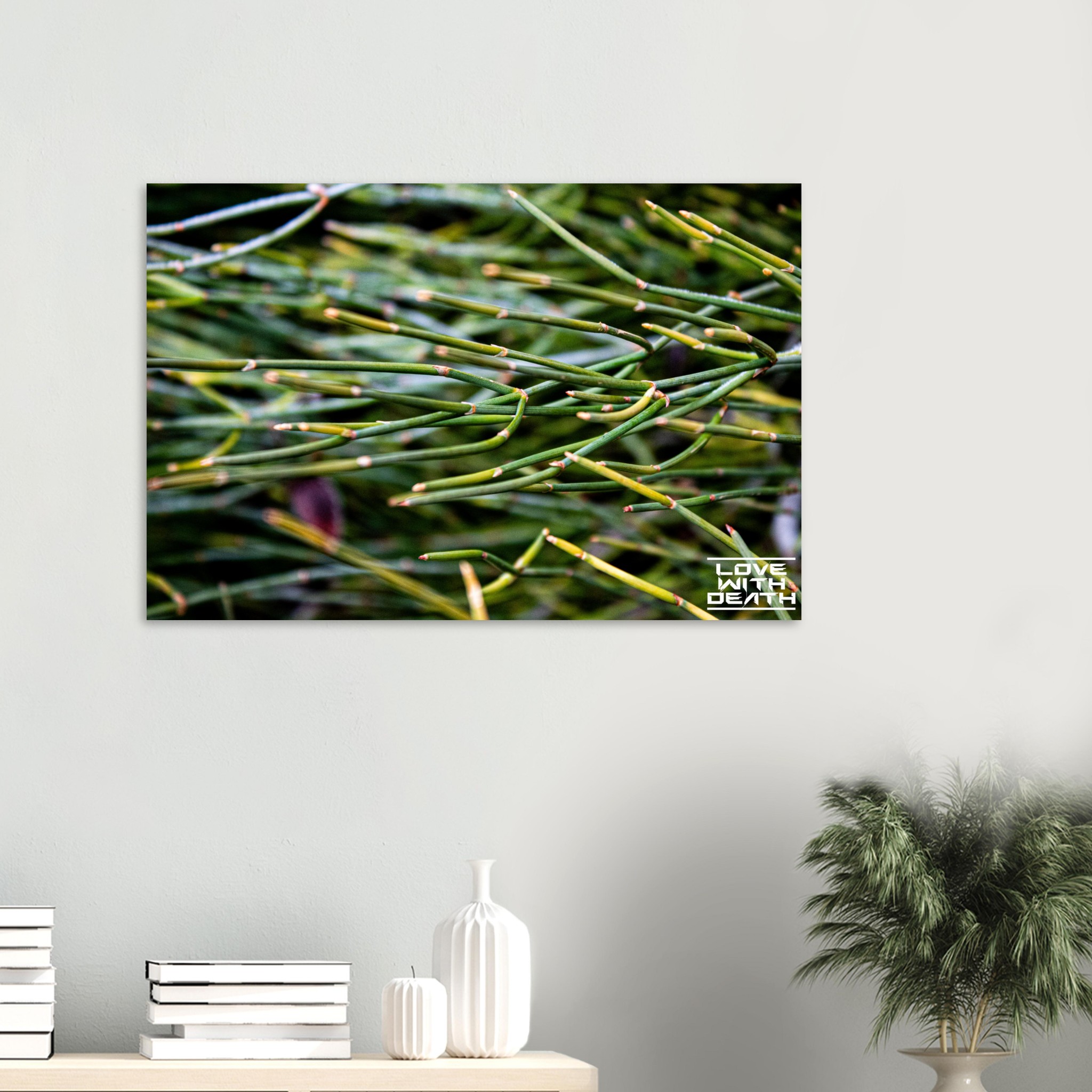 This photo captures a close-up of delicate, needle-like plants arranged in a complex yet harmonious pattern. The fine green-yellow tips add a touch of dynamism, while the soft color contrasts highlight the organic aesthetic.