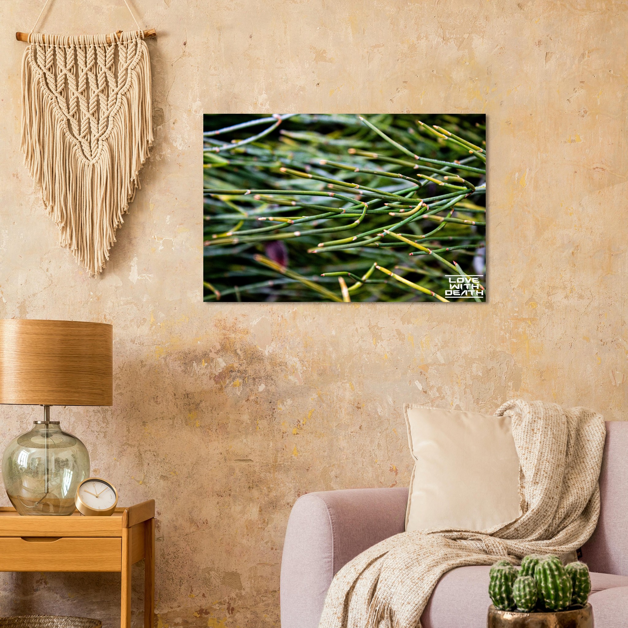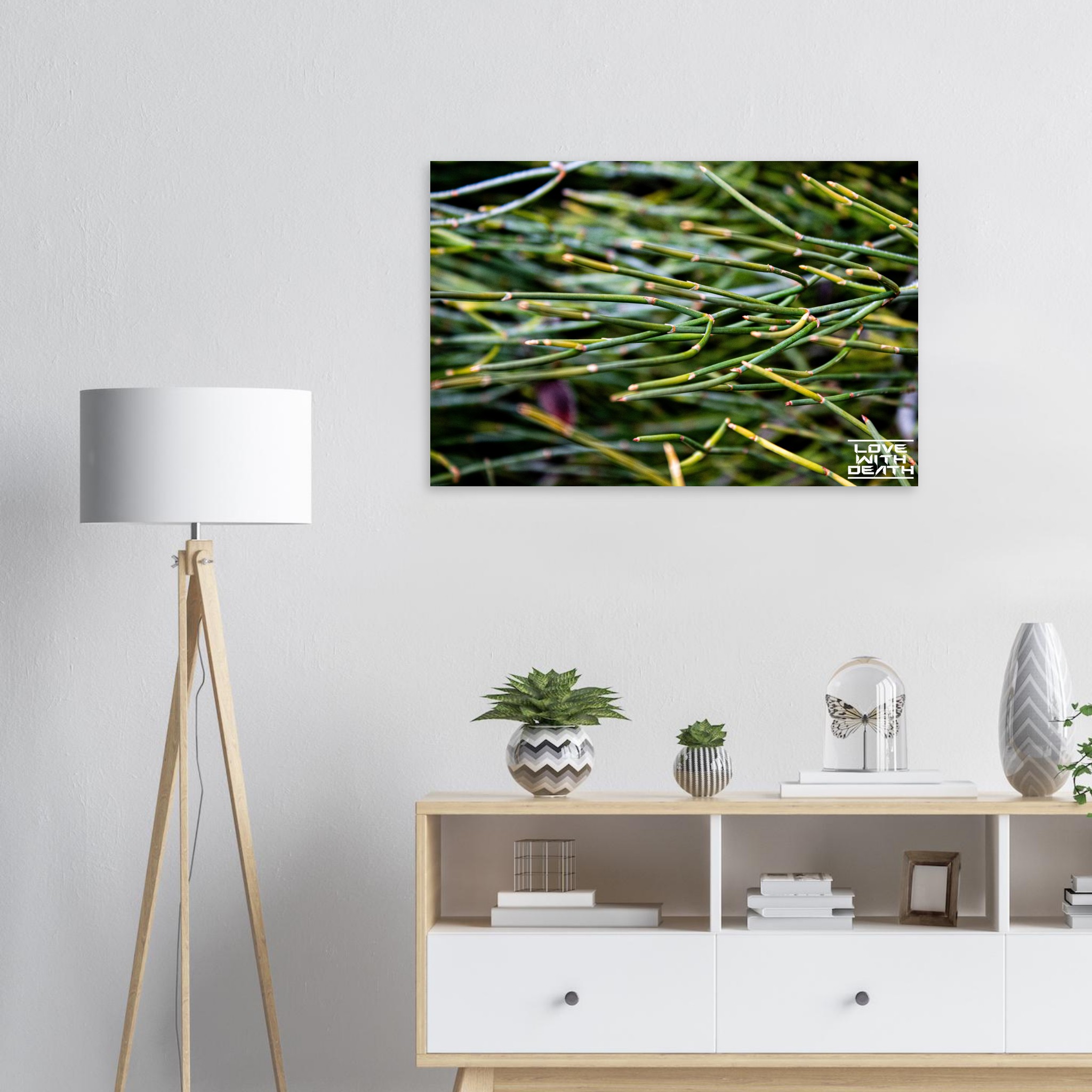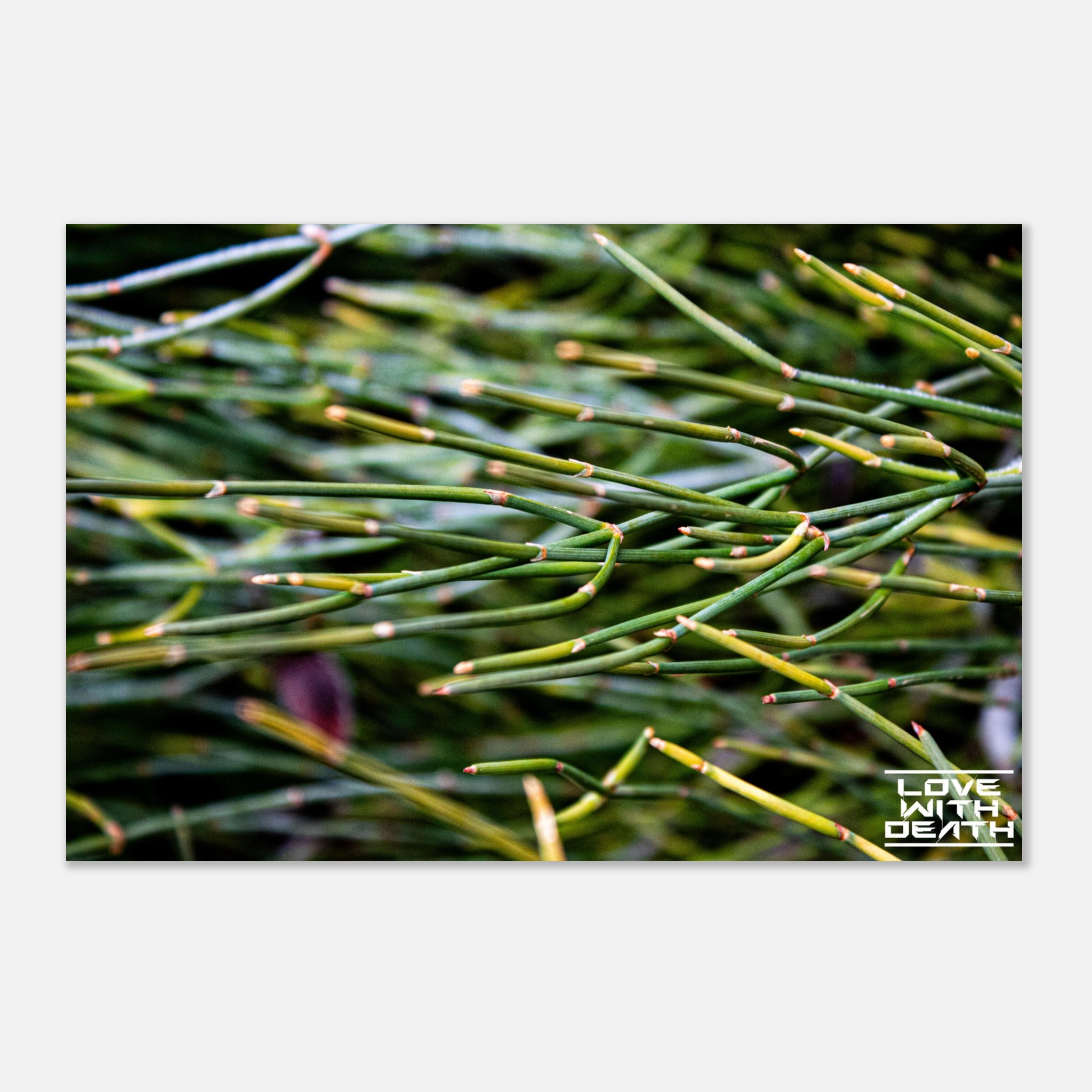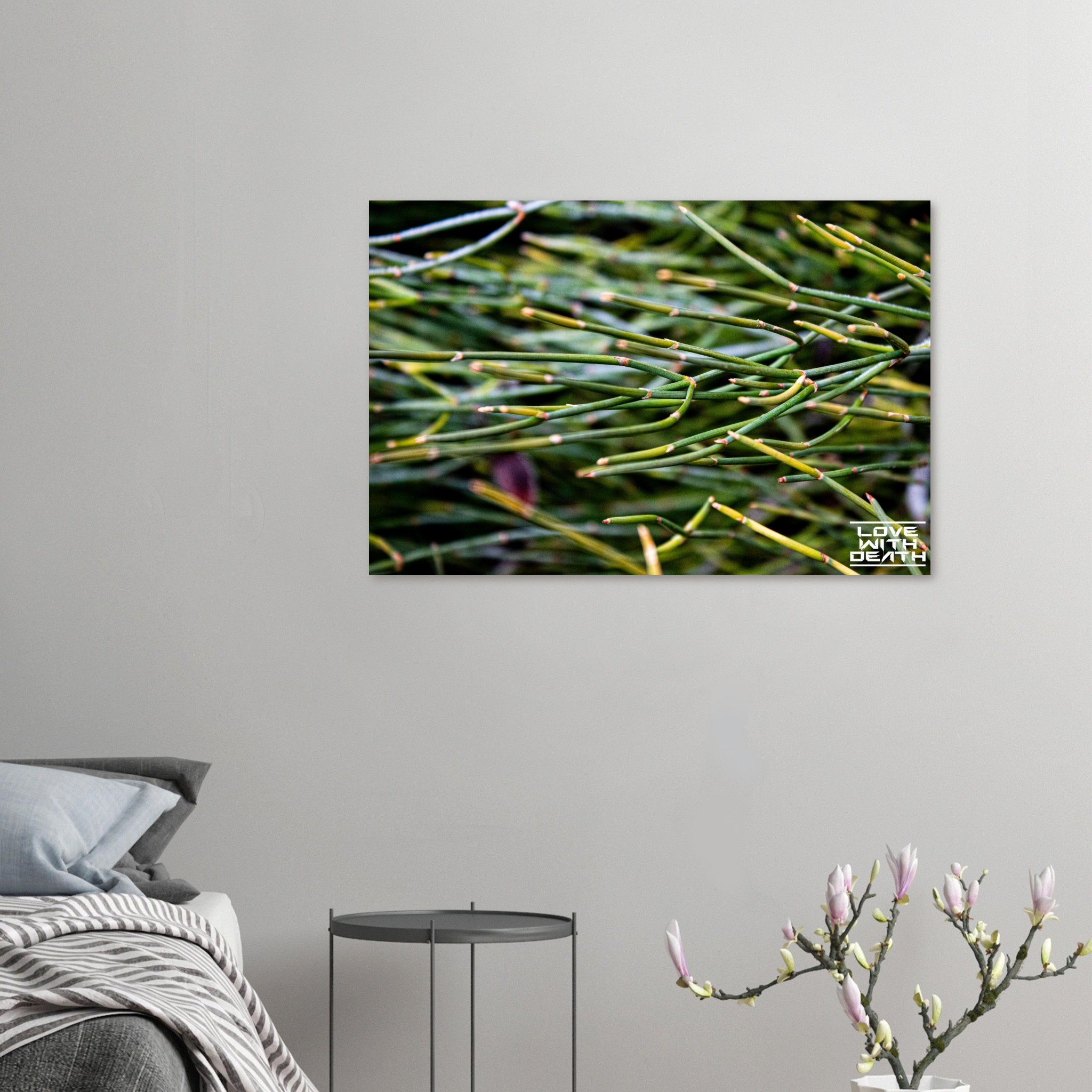 This photo captures a close-up of delicate, needle-like plants arranged in a complex yet harmonious pattern. The fine green-yellow tips add a touch of dynamism, while the soft color contrasts highlight the organic aesthetic.