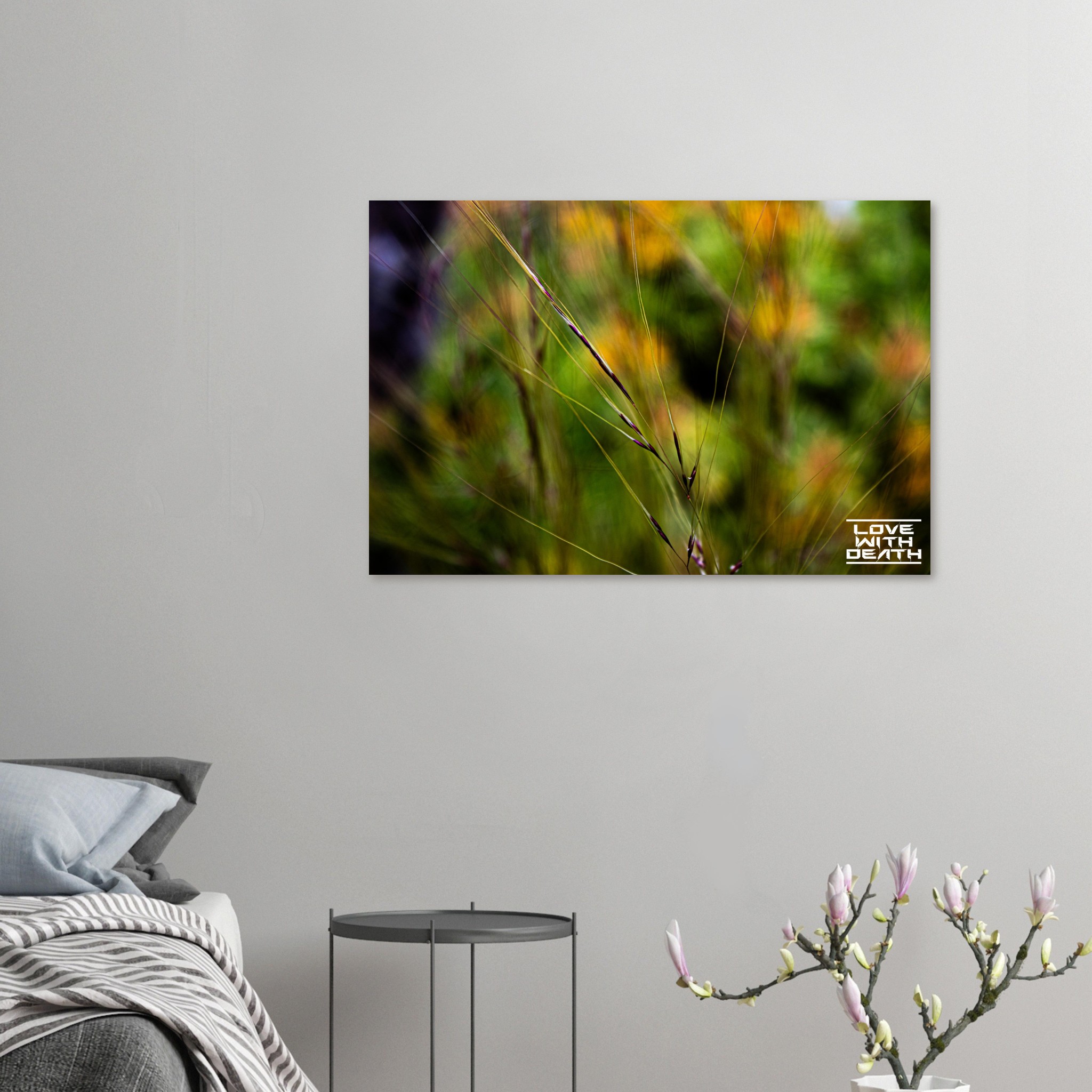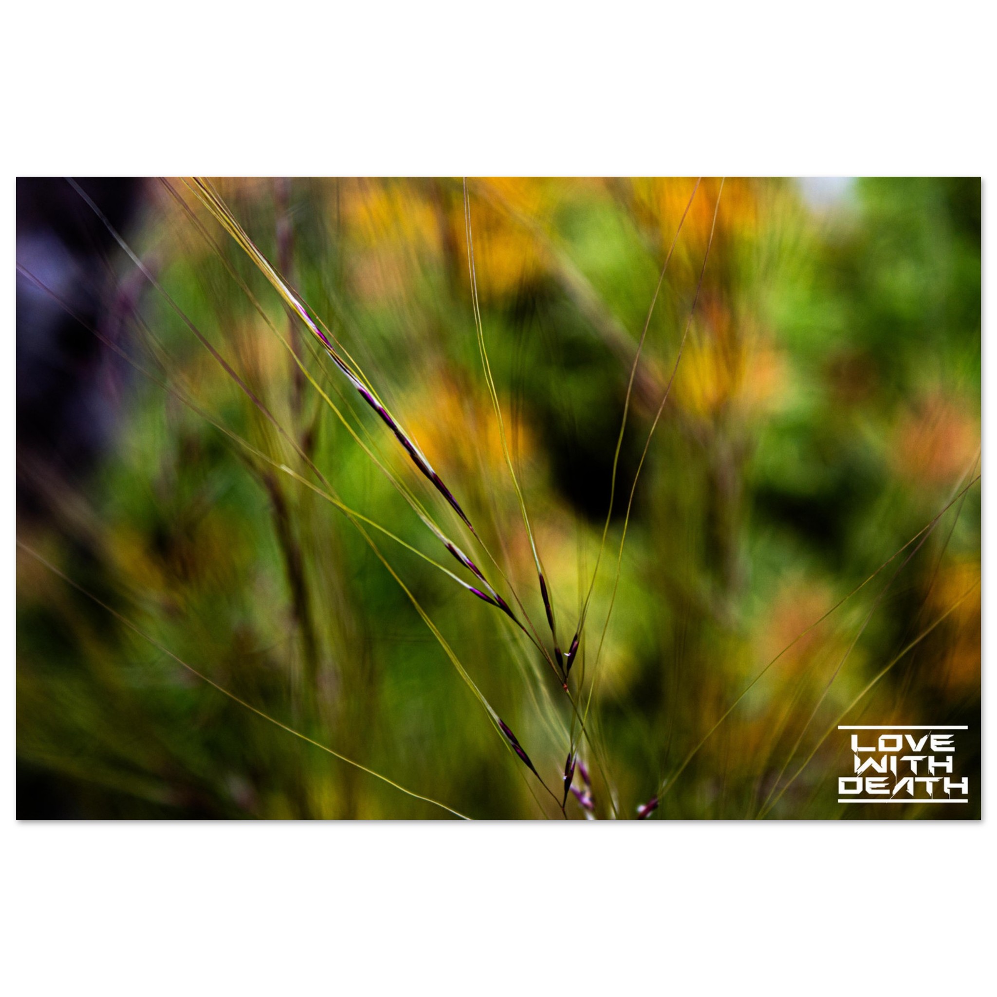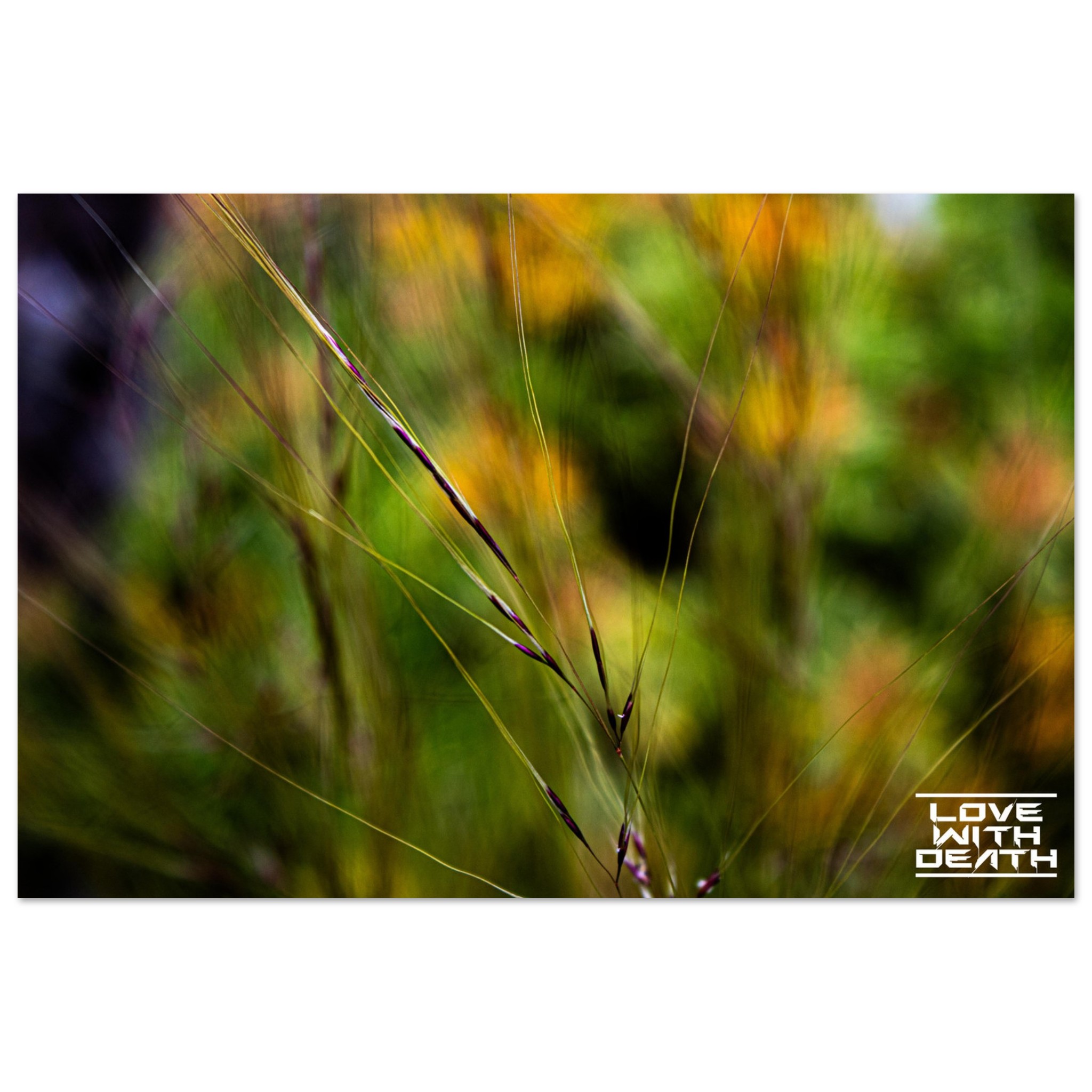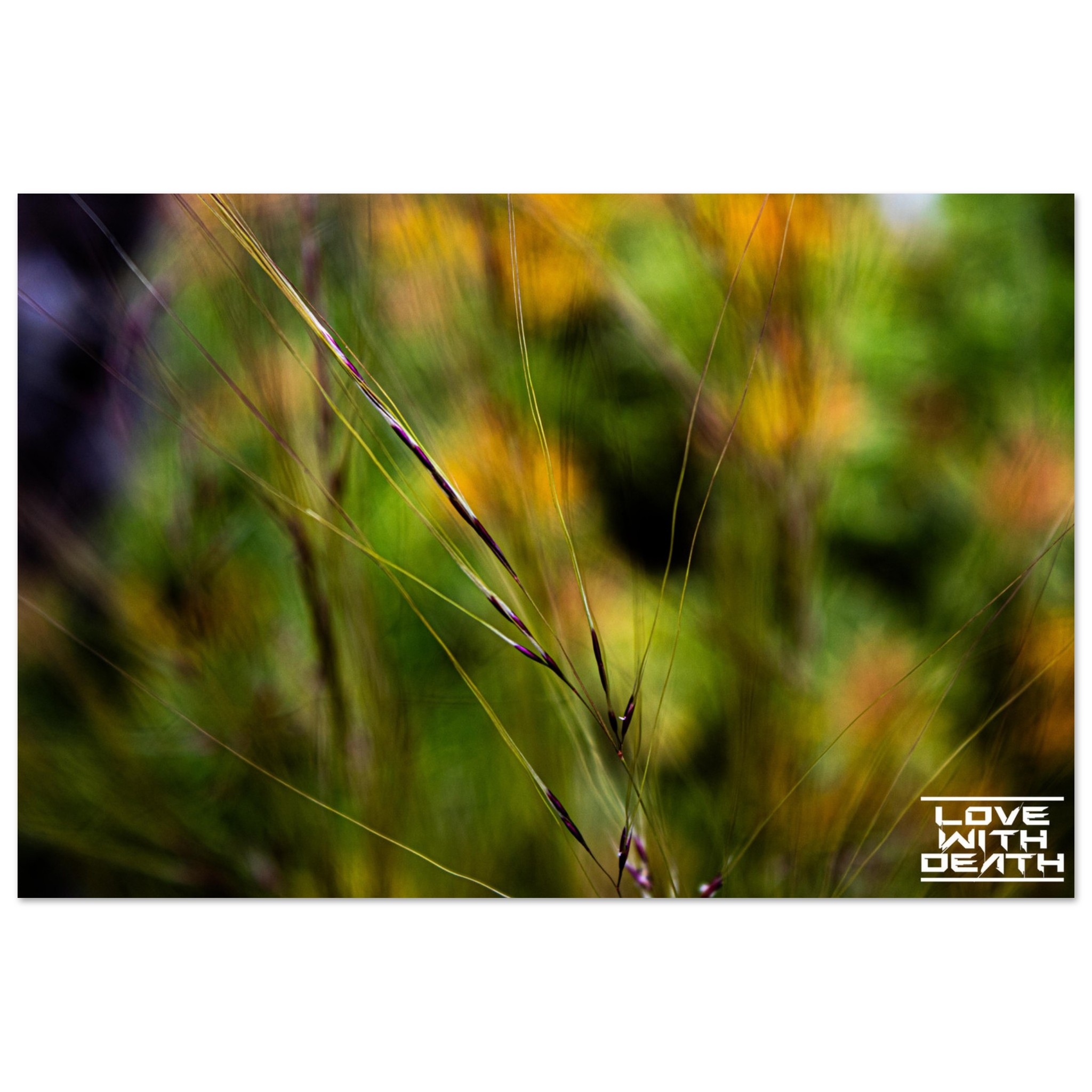 A captivating image of delicate grass blades swaying gracefully in the wind. The warm color palette of the blurred background in yellow and green tones evokes an autumnal ambiance, highlighting the gentle motion of the blades.
