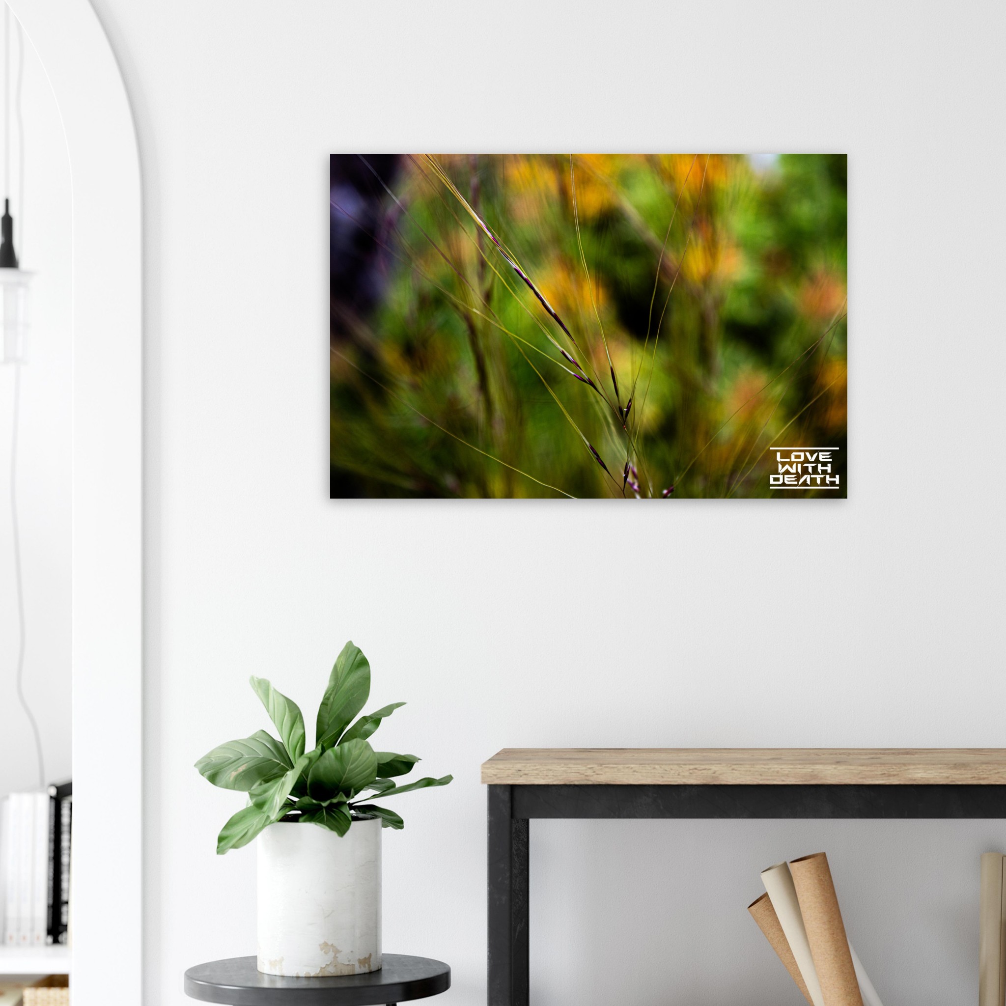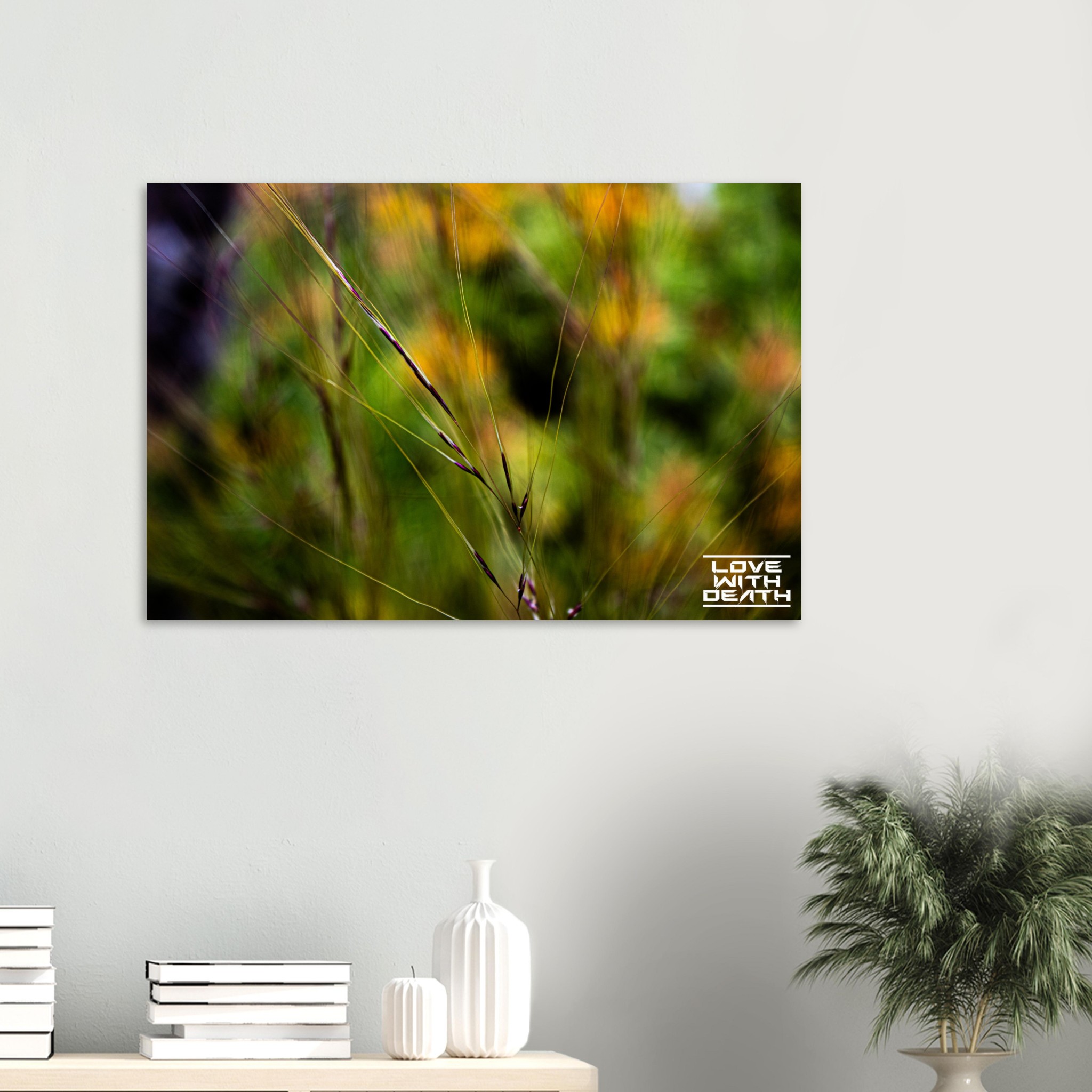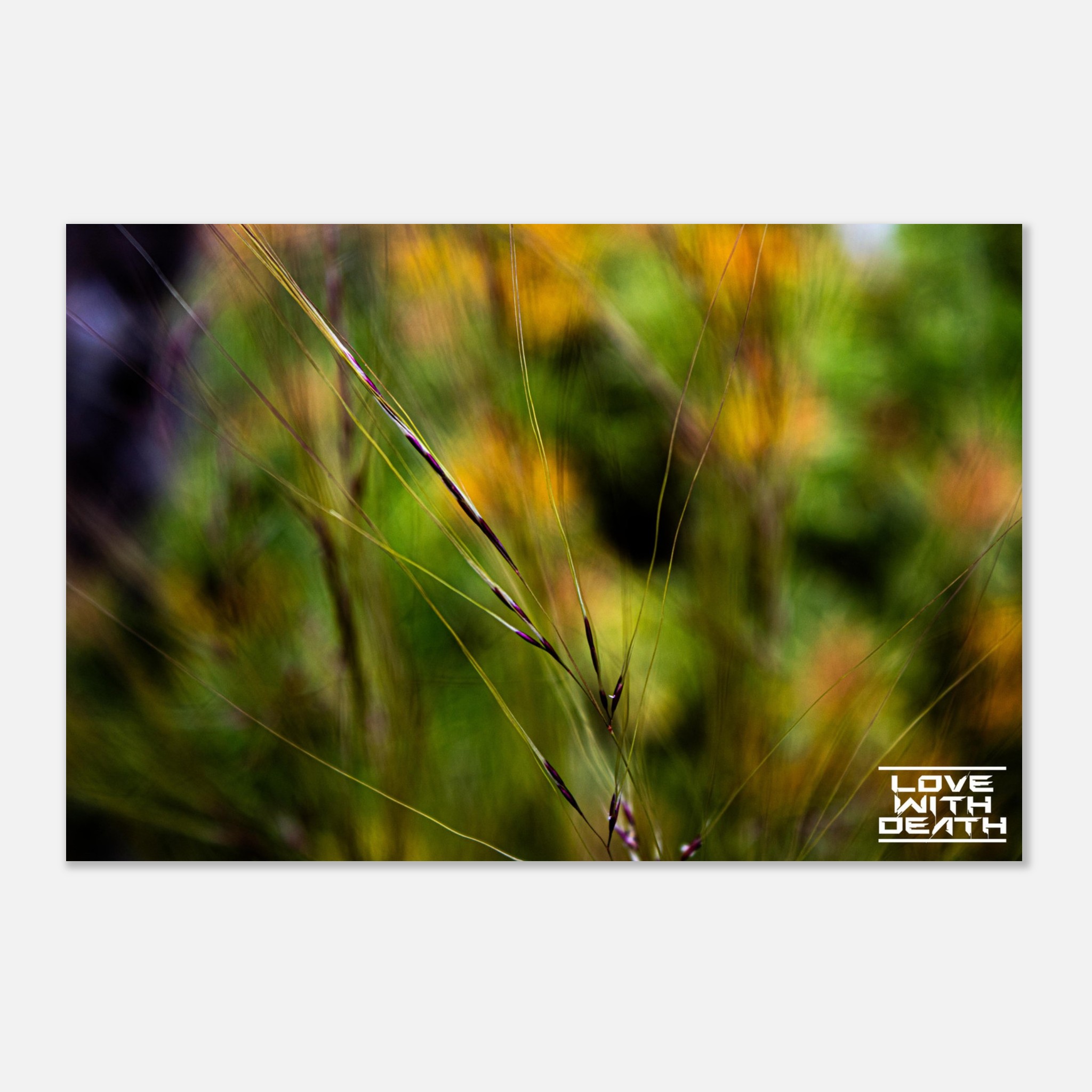 A captivating image of delicate grass blades swaying gracefully in the wind. The warm color palette of the blurred background in yellow and green tones evokes an autumnal ambiance, highlighting the gentle motion of the blades.