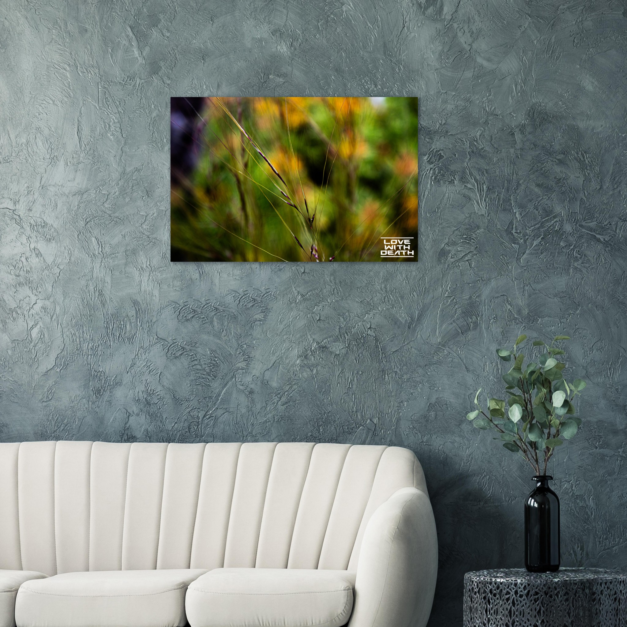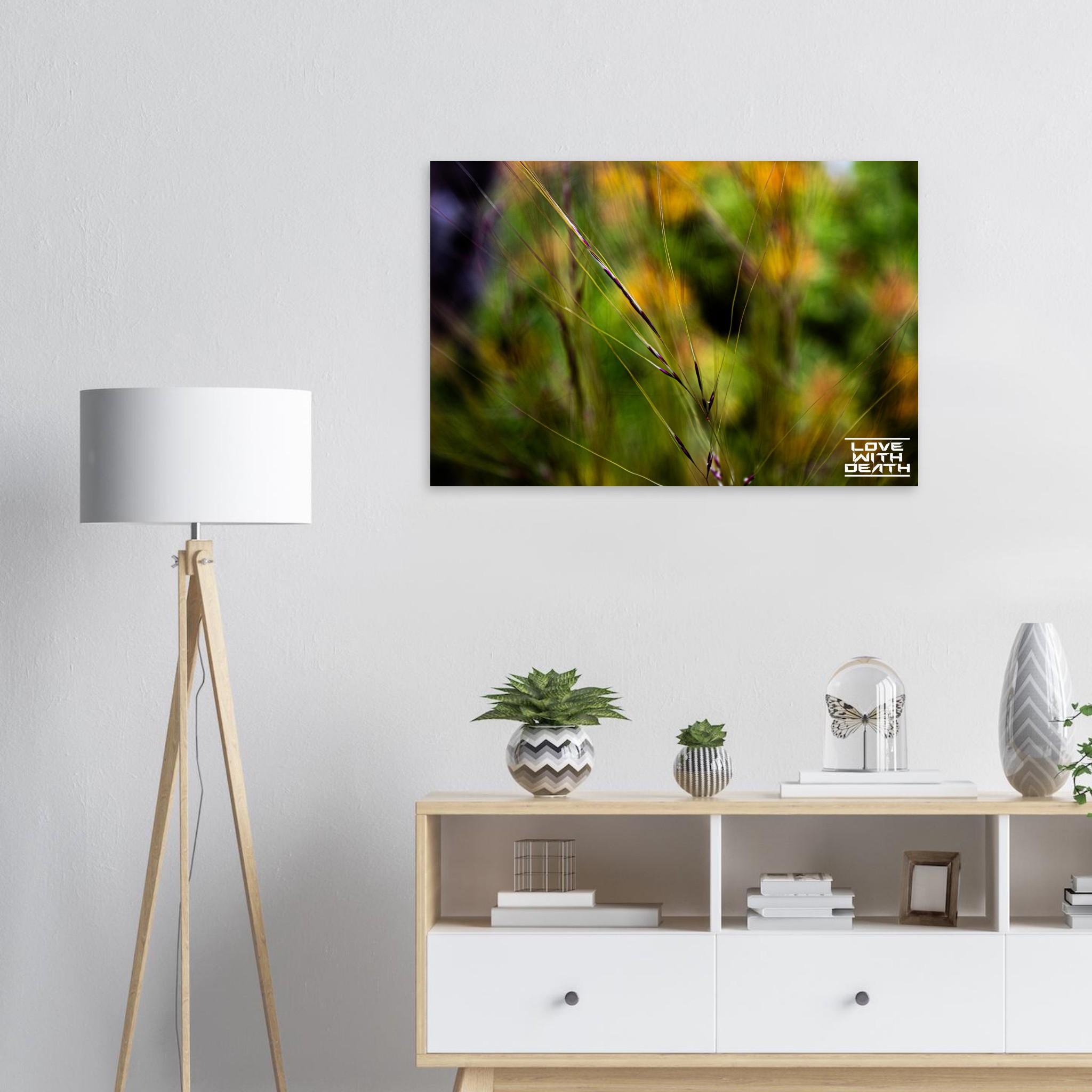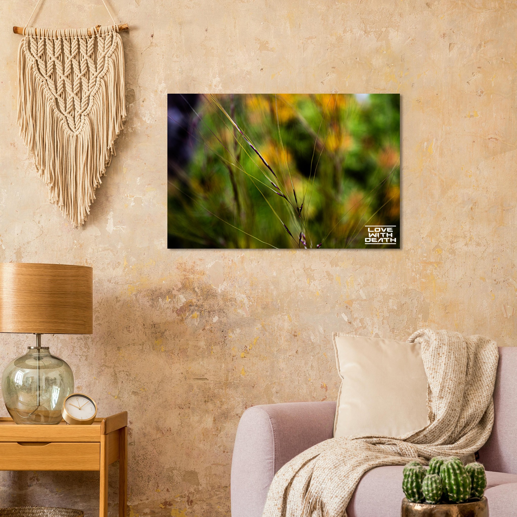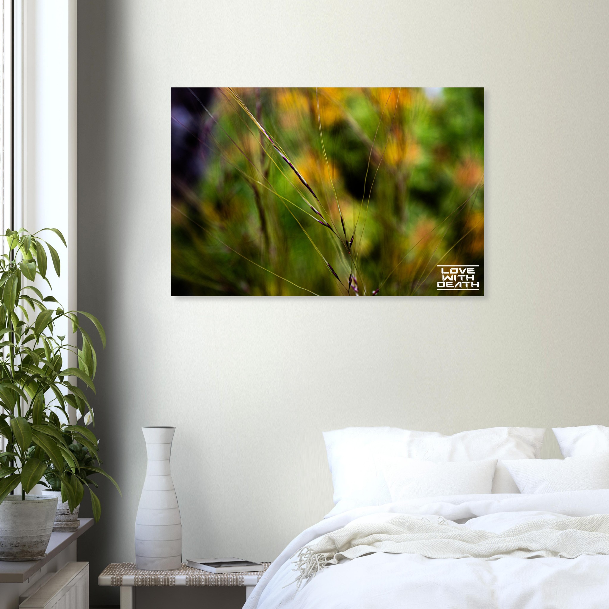 A captivating image of delicate grass blades swaying gracefully in the wind. The warm color palette of the blurred background in yellow and green tones evokes an autumnal ambiance, highlighting the gentle motion of the blades.