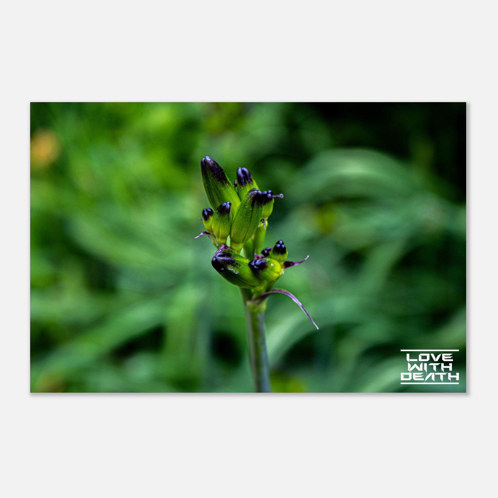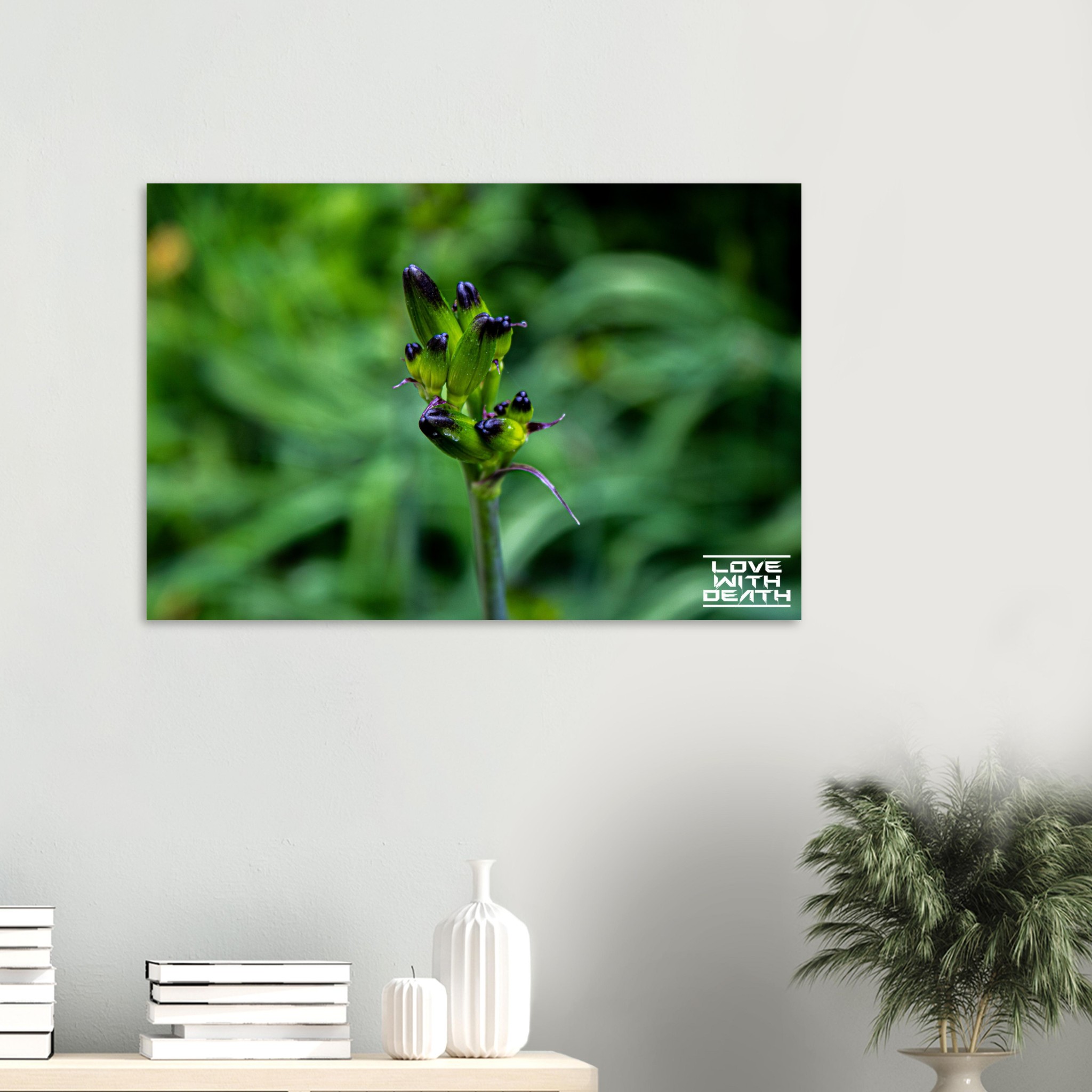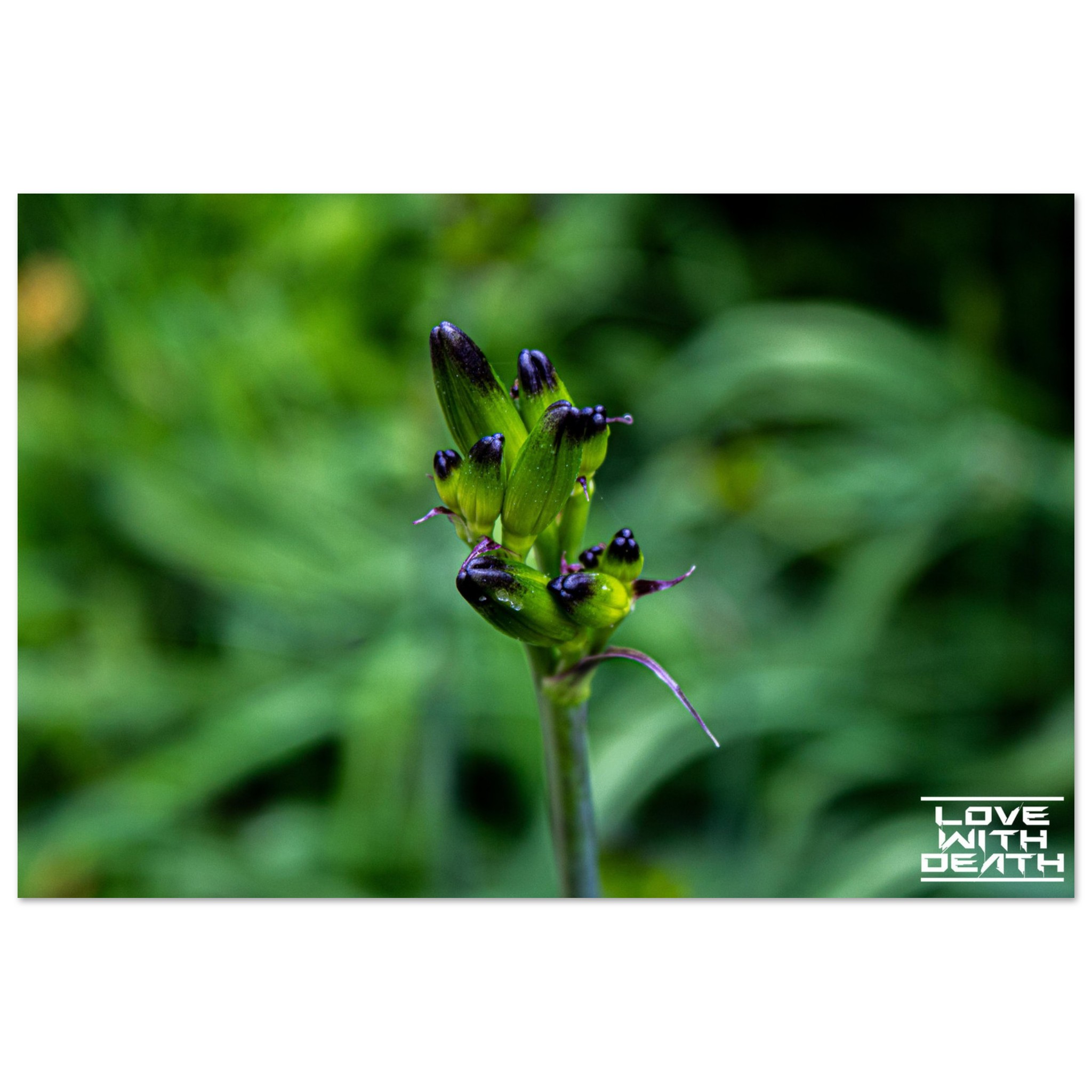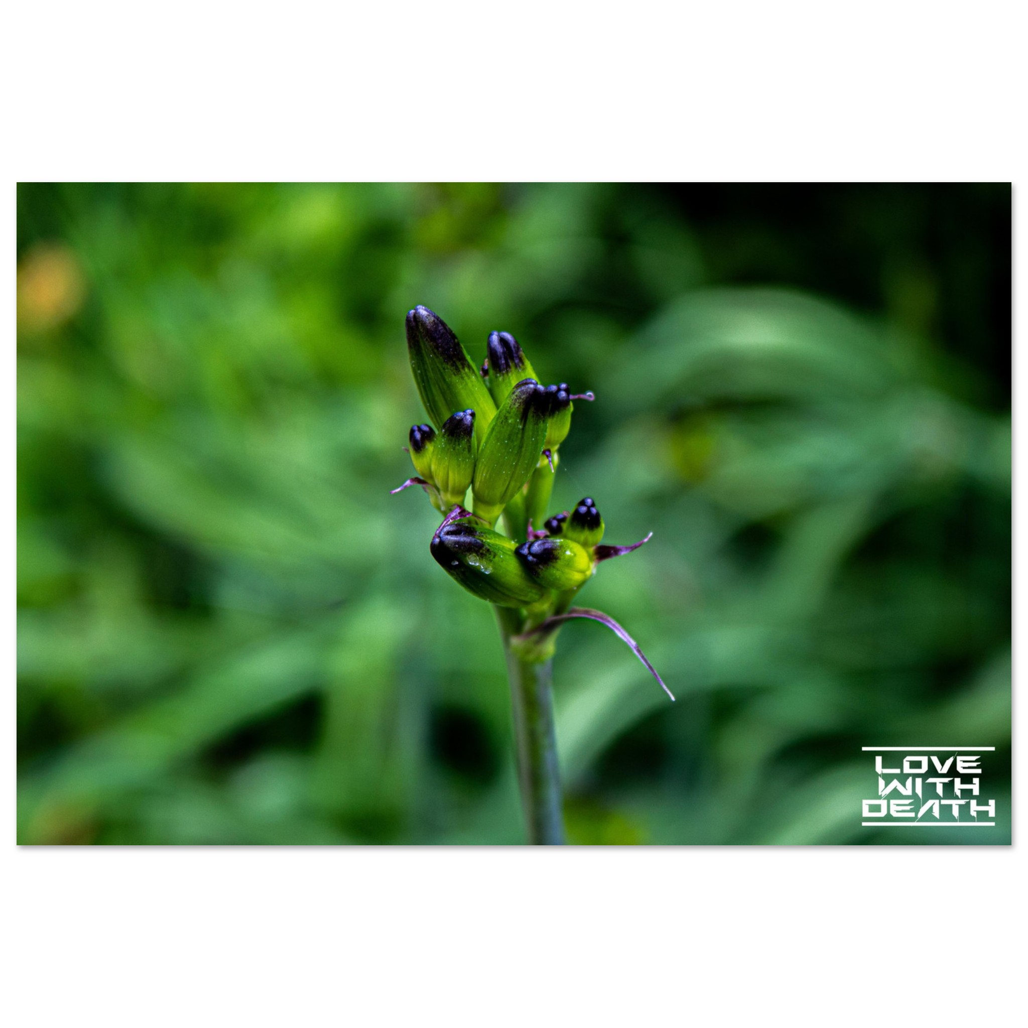 This image captures a close-up of a young plant stem with tender buds. The glossy black tips and vibrant green foliage stand out dramatically against the softly blurred background. It evokes the quiet elegance of growth and natural beauty in its simplest form.