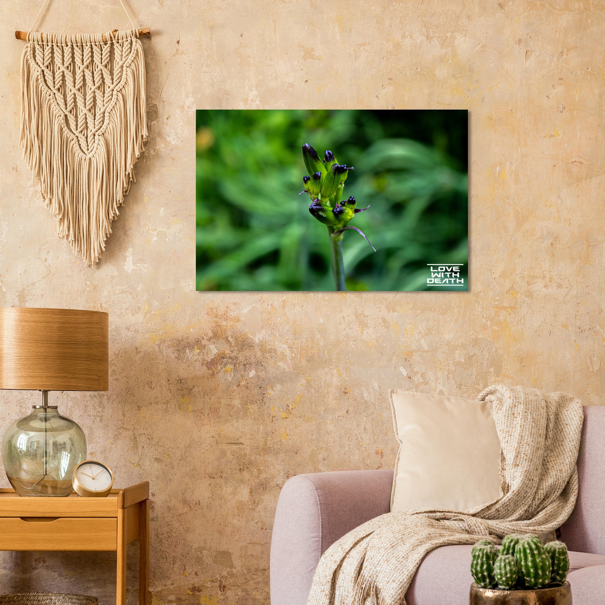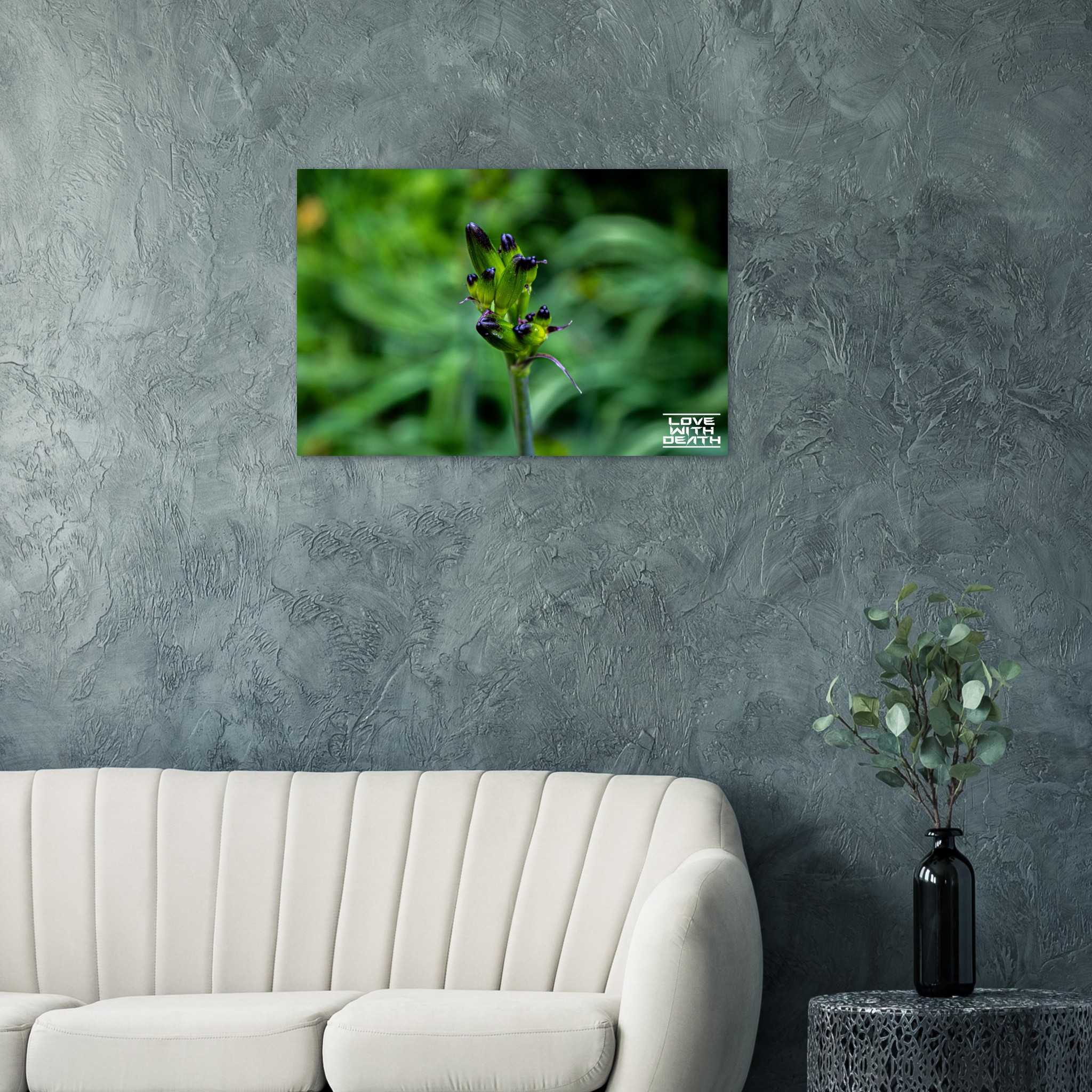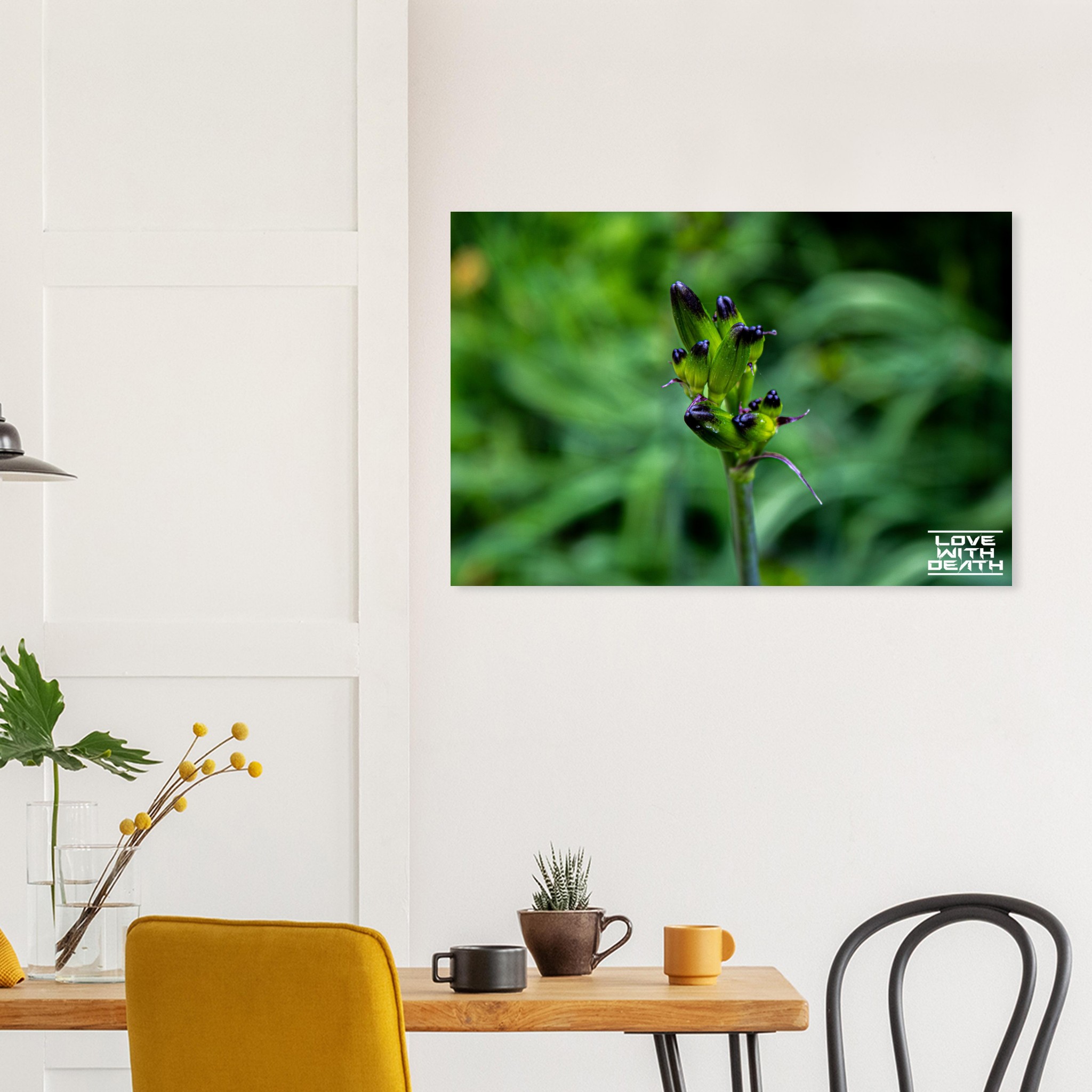 This image captures a close-up of a young plant stem with tender buds. The glossy black tips and vibrant green foliage stand out dramatically against the softly blurred background. It evokes the quiet elegance of growth and natural beauty in its simplest form.