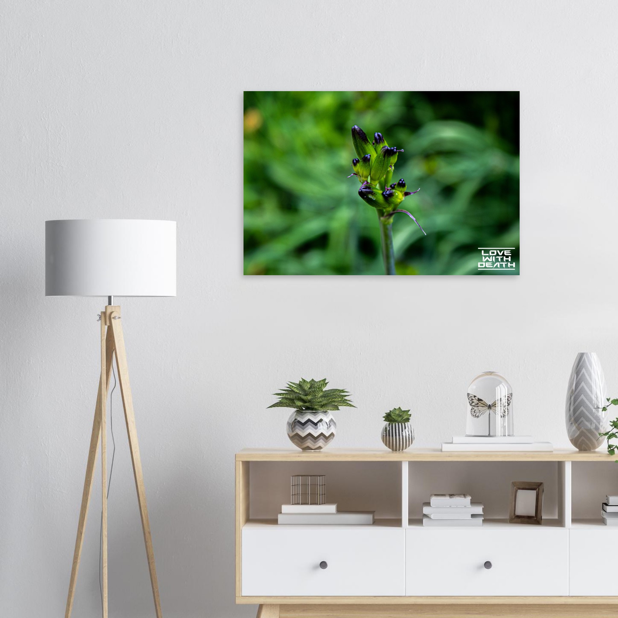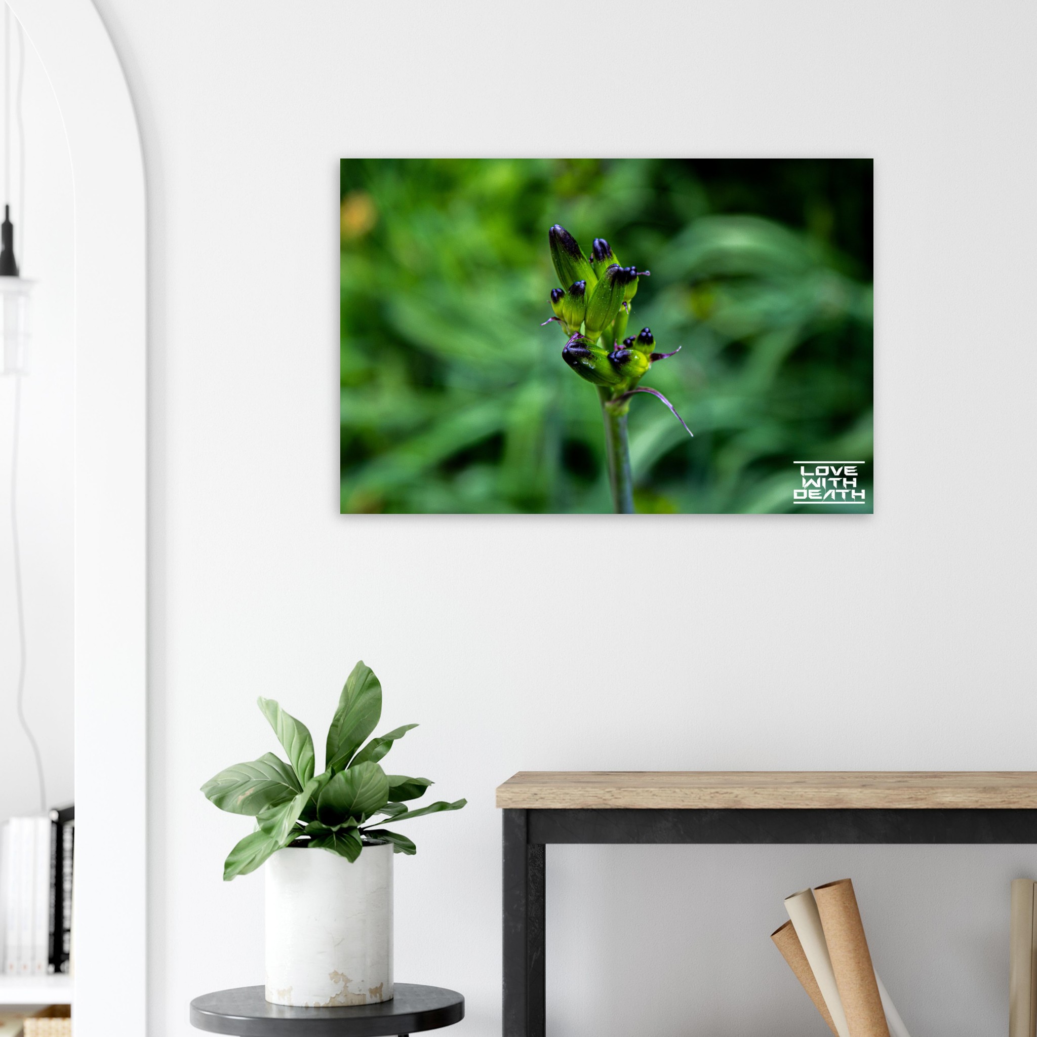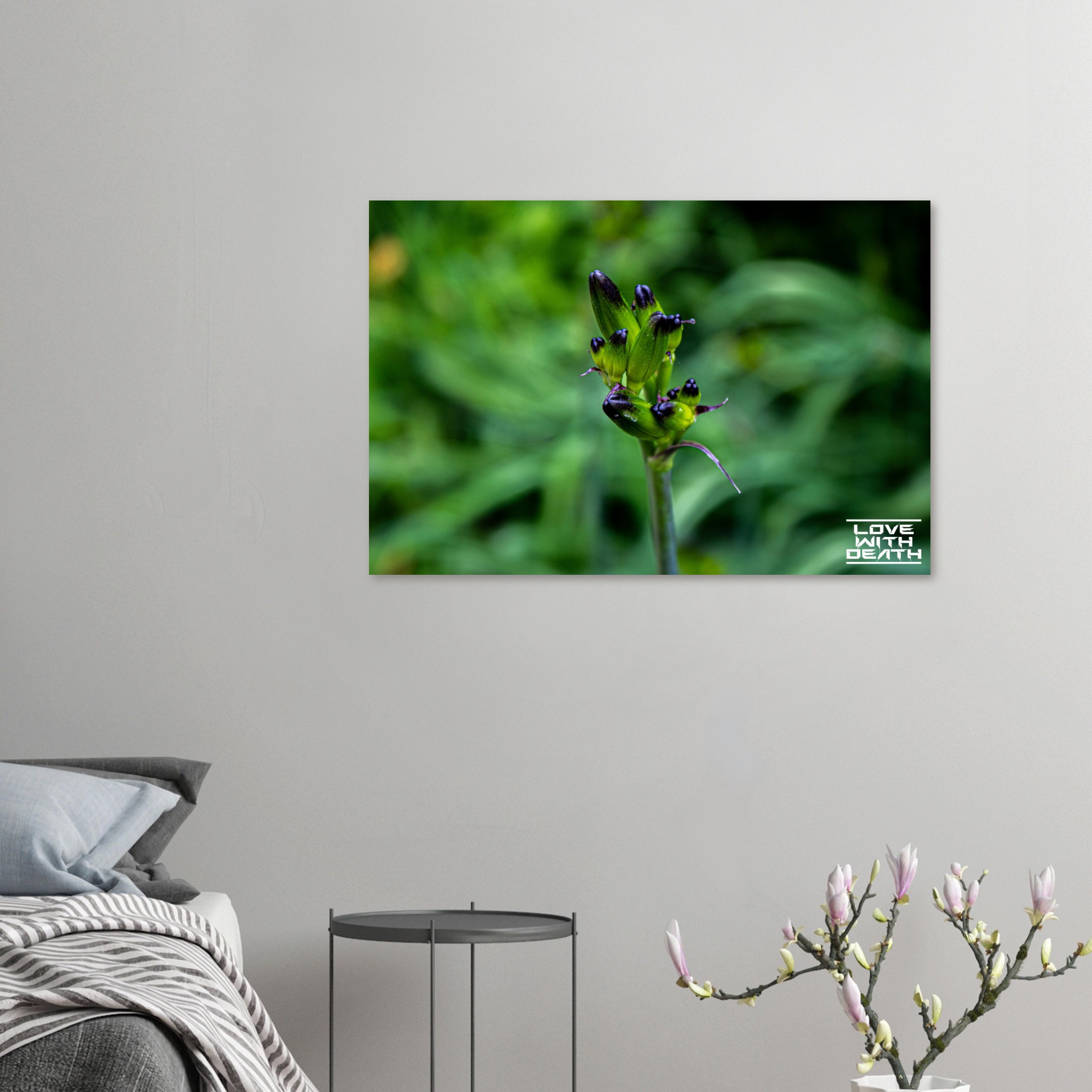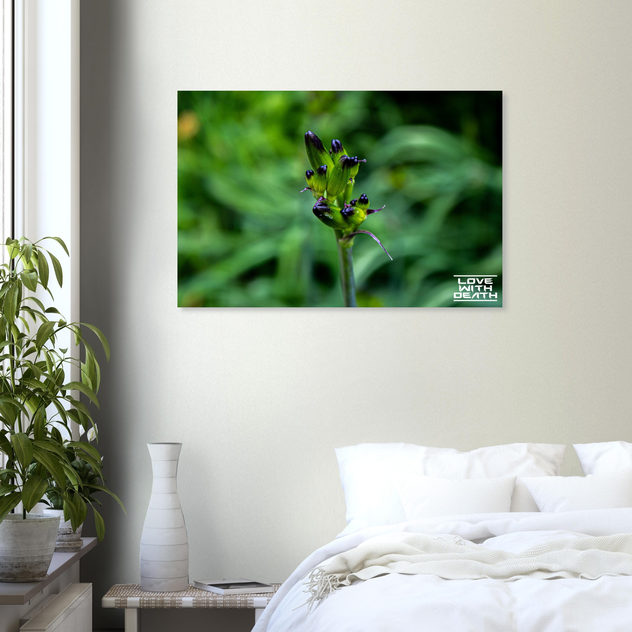 This image captures a close-up of a young plant stem with tender buds. The glossy black tips and vibrant green foliage stand out dramatically against the softly blurred background. It evokes the quiet elegance of growth and natural beauty in its simplest form.