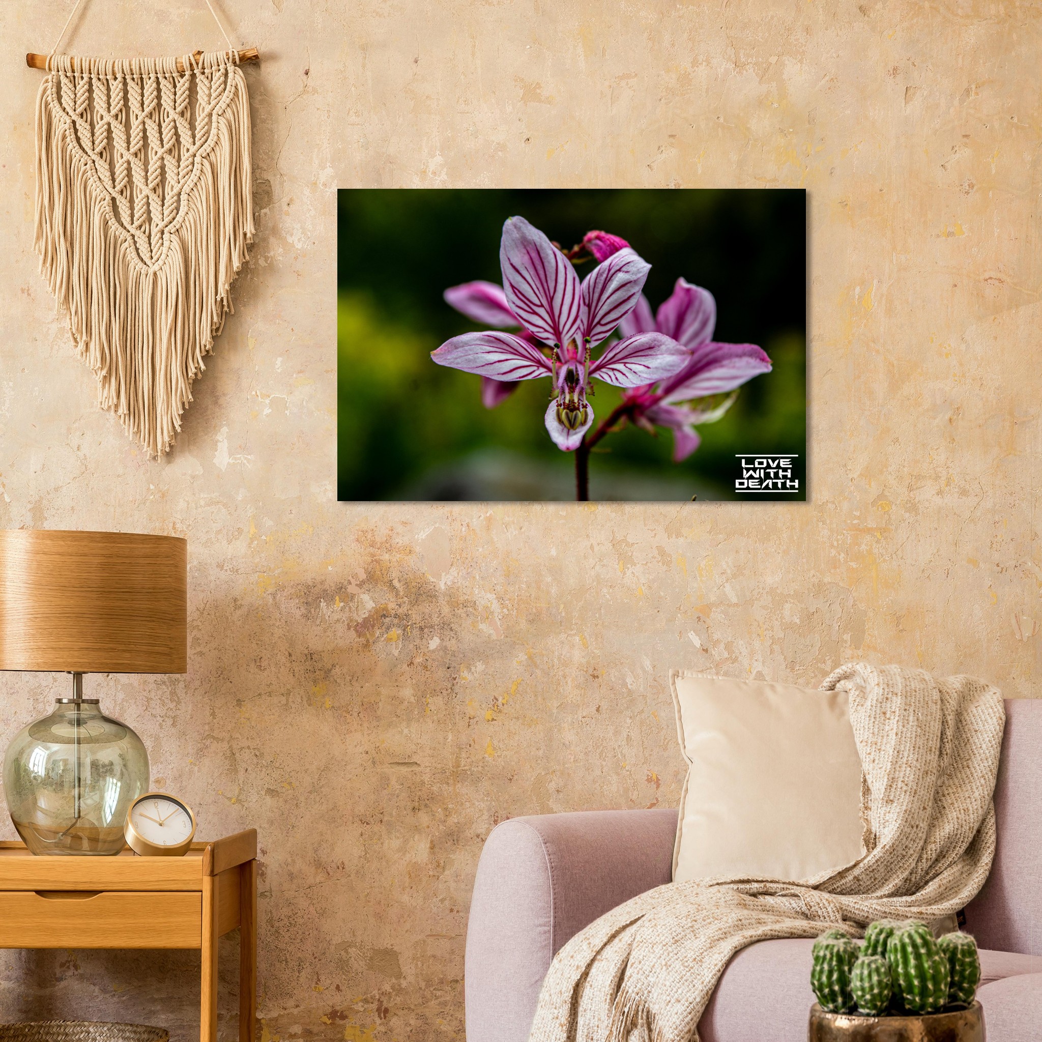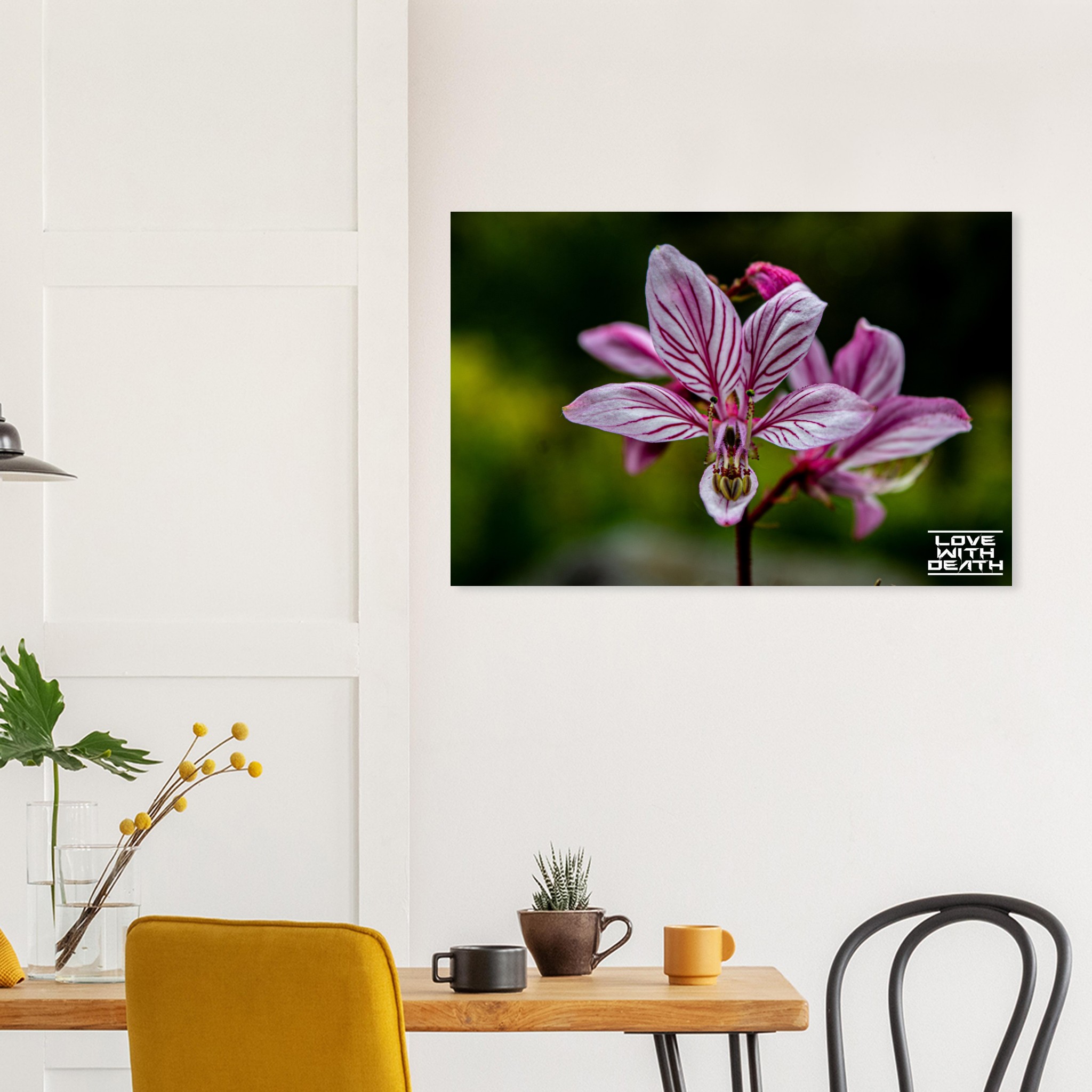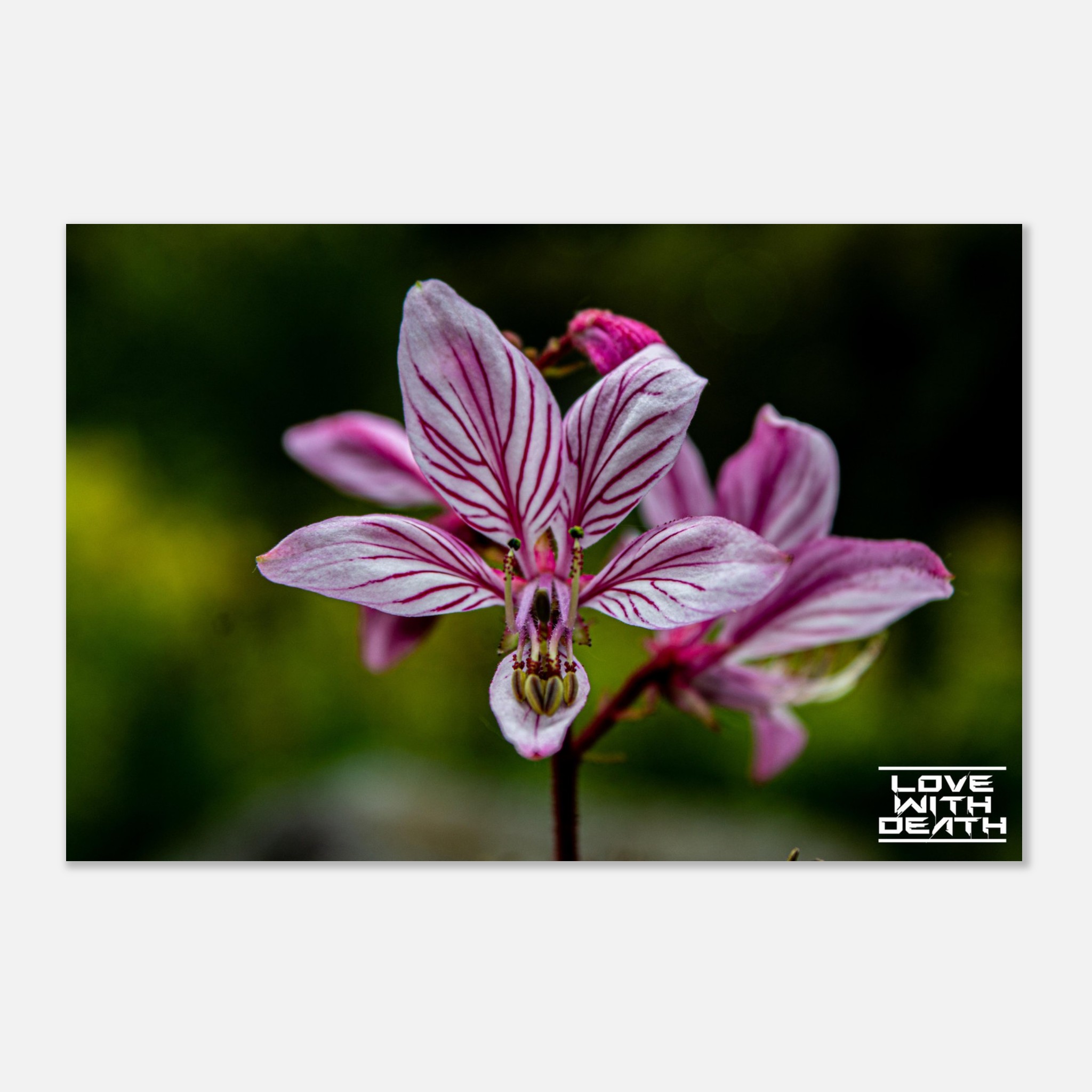 This close-up showcases a unique flower with white petals intricately veined in vivid purple. The flower’s complex structure is emphasized by the interplay of contrast and focus, while the soft green background enhances its natural beauty.
