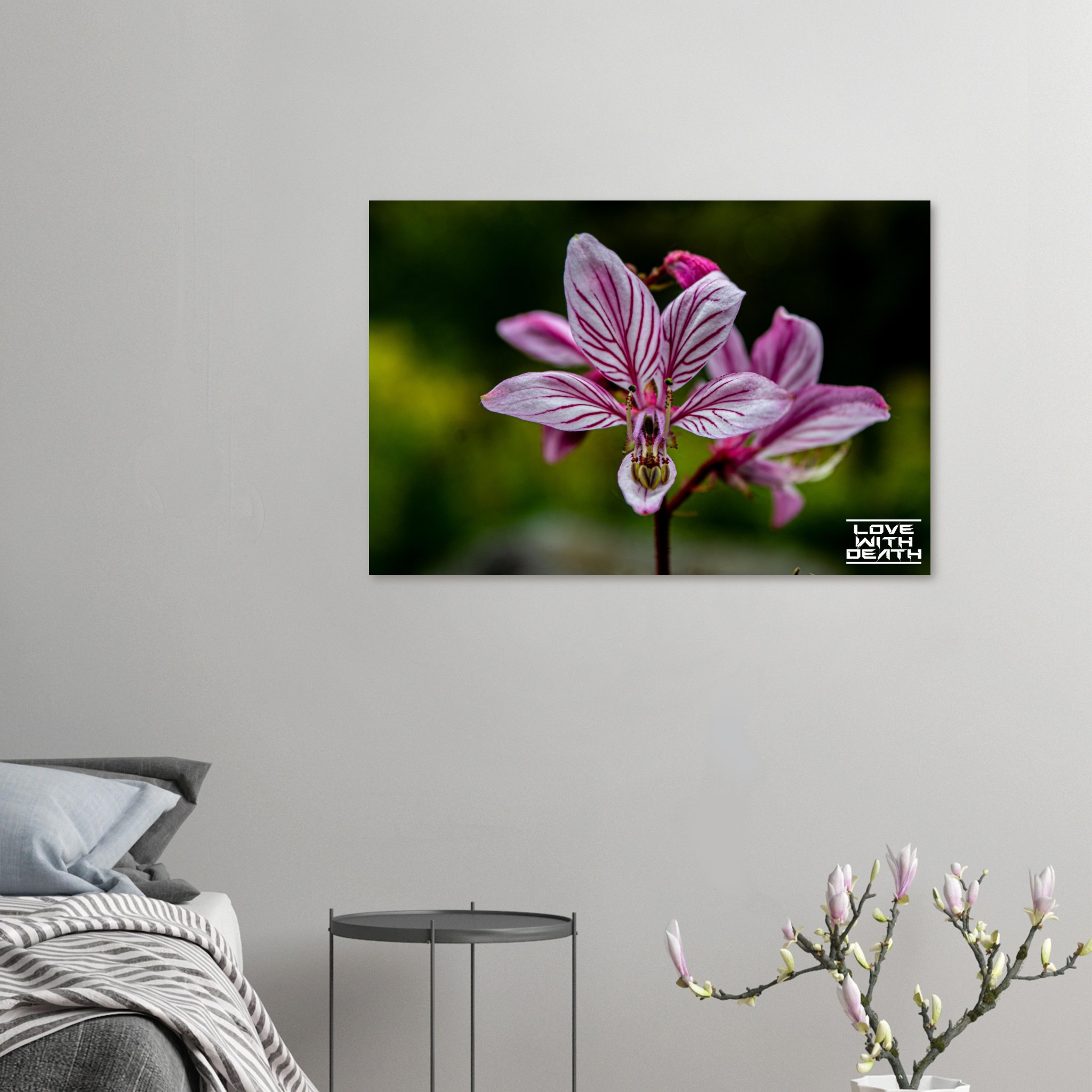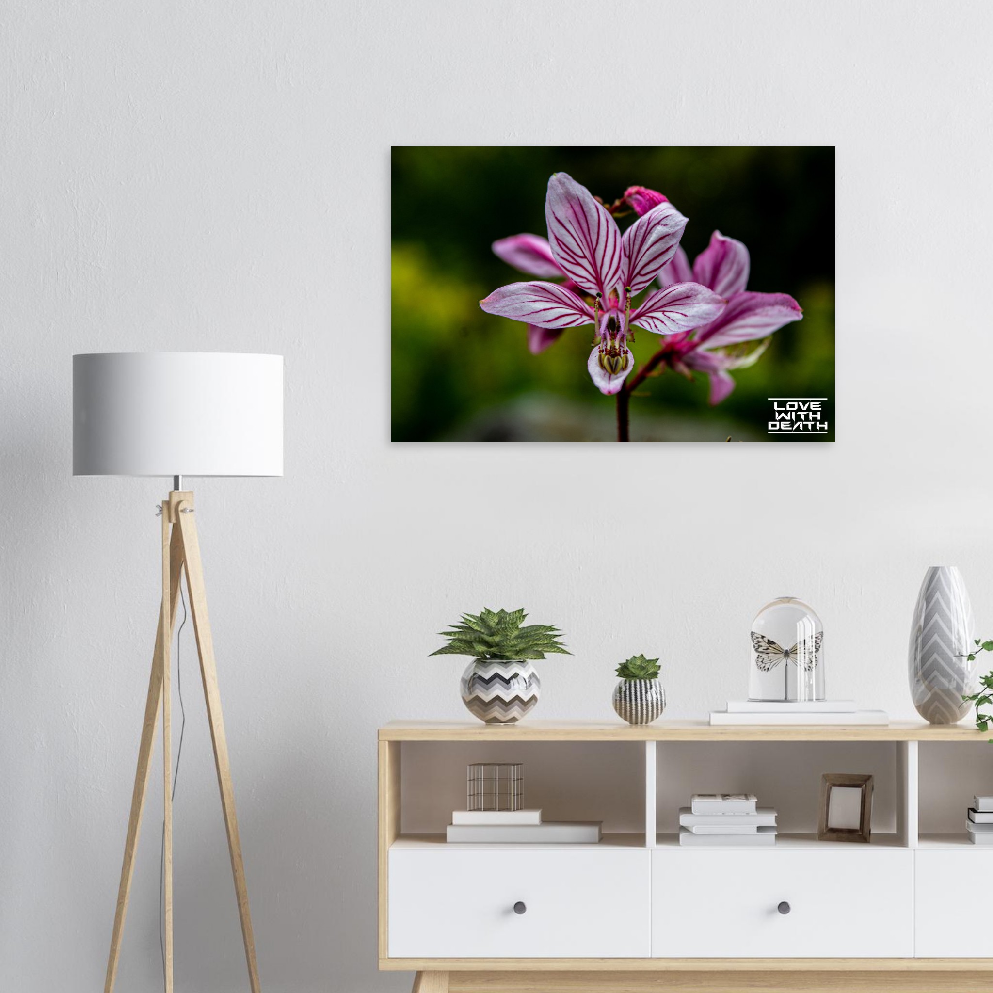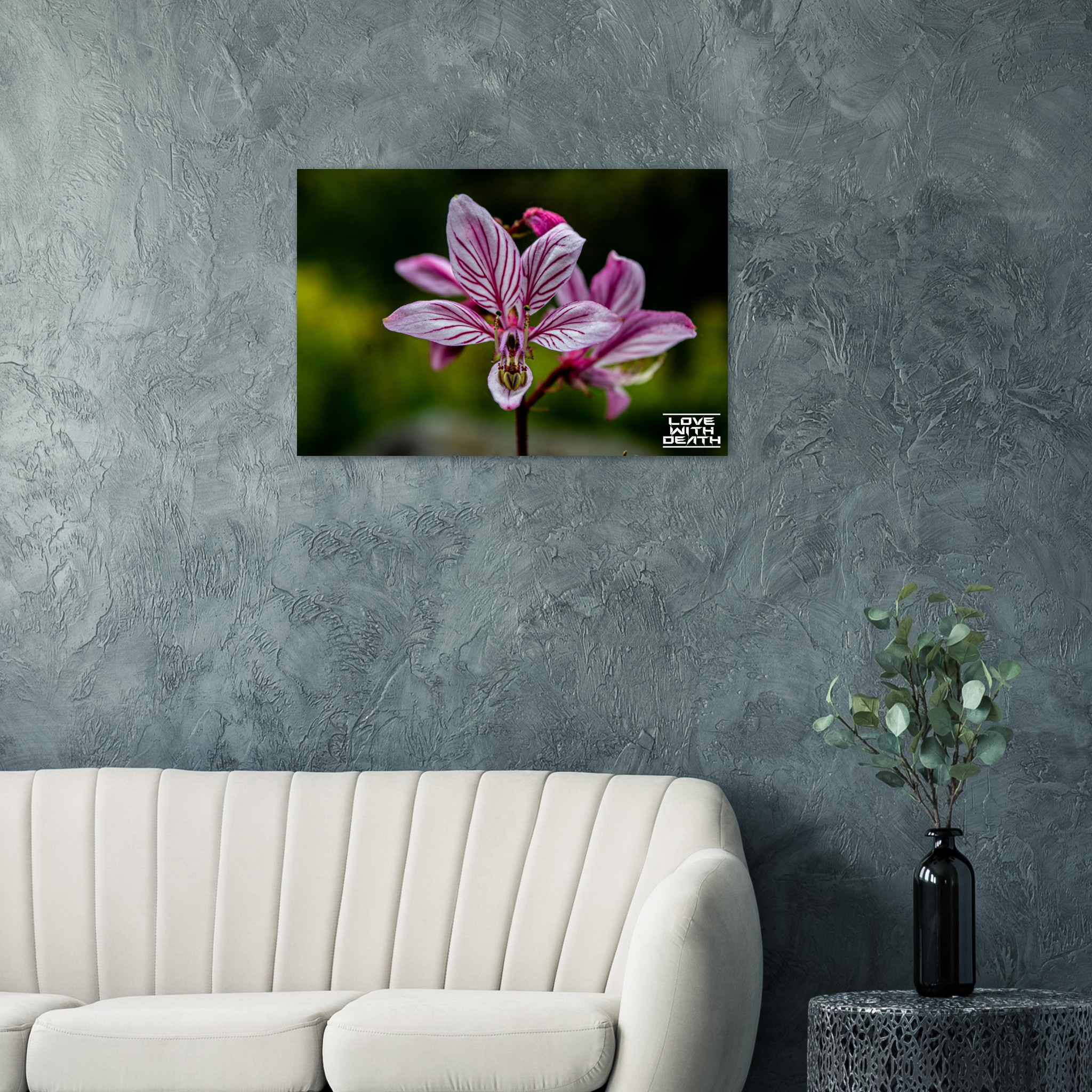 This close-up showcases a unique flower with white petals intricately veined in vivid purple. The flower’s complex structure is emphasized by the interplay of contrast and focus, while the soft green background enhances its natural beauty.
