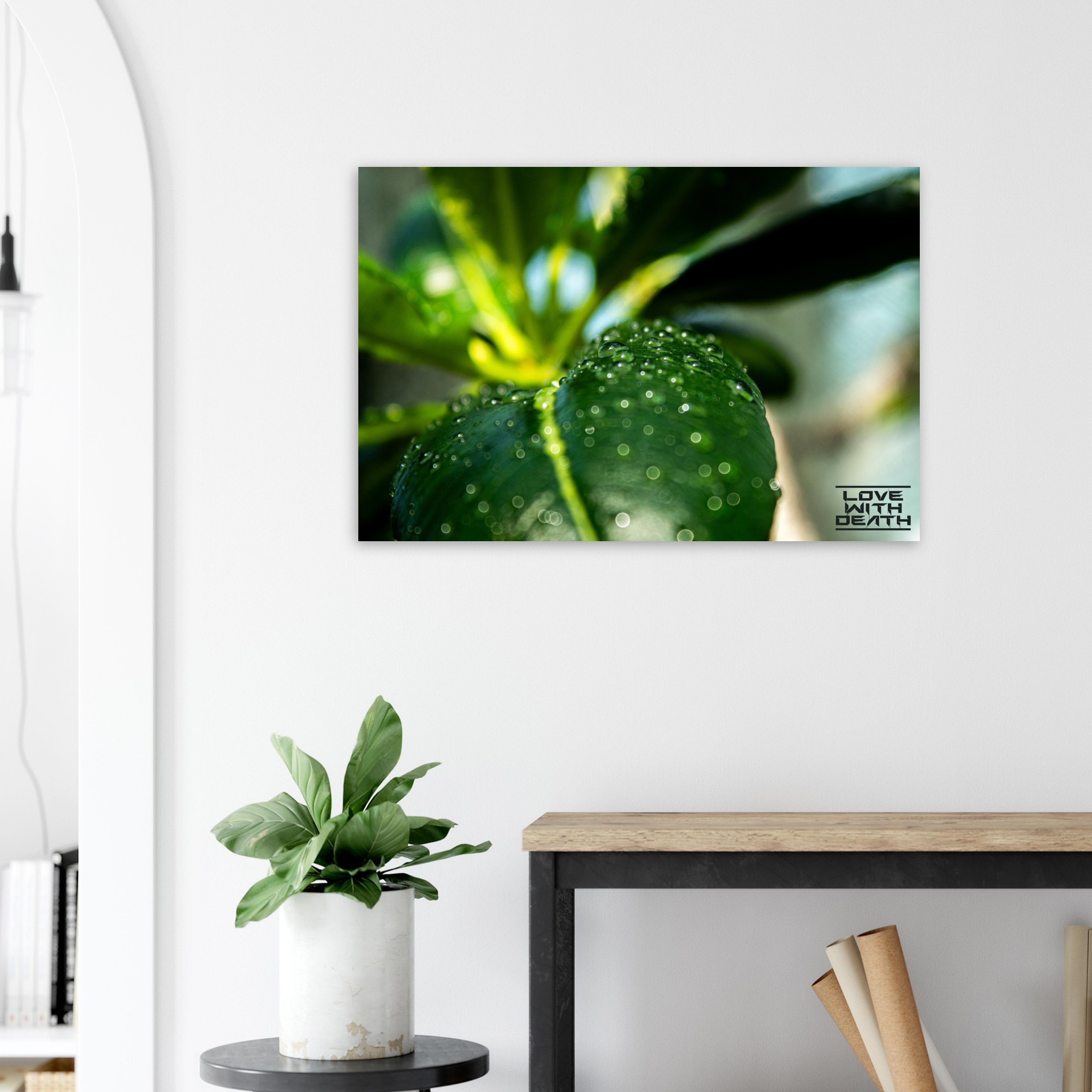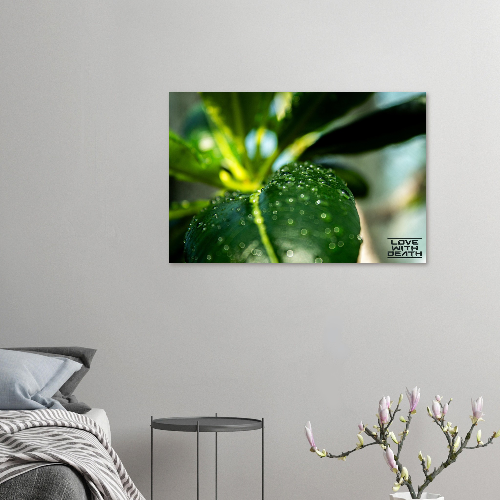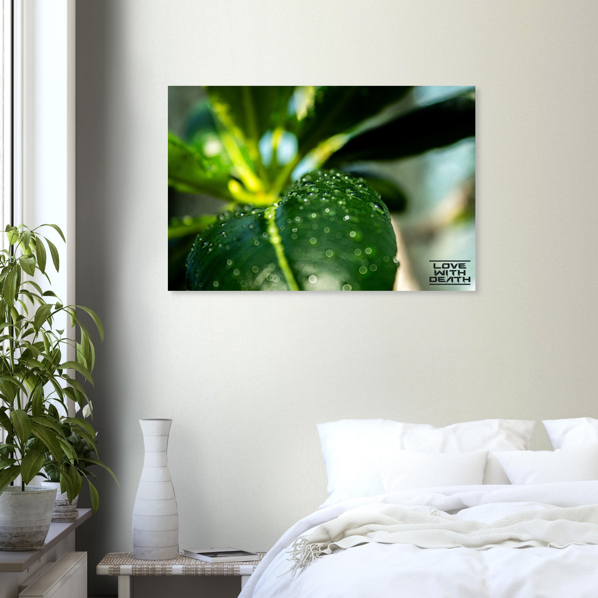 A captivating macro shot that captures the beauty of a green leaf adorned with glistening dewdrops. The natural light and soft bokeh in the background lend the image depth and a soothing atmosphere. The droplets reflect the clarity and freshness of a morning, while the vibrant green of the leaf radiates life and energy.
