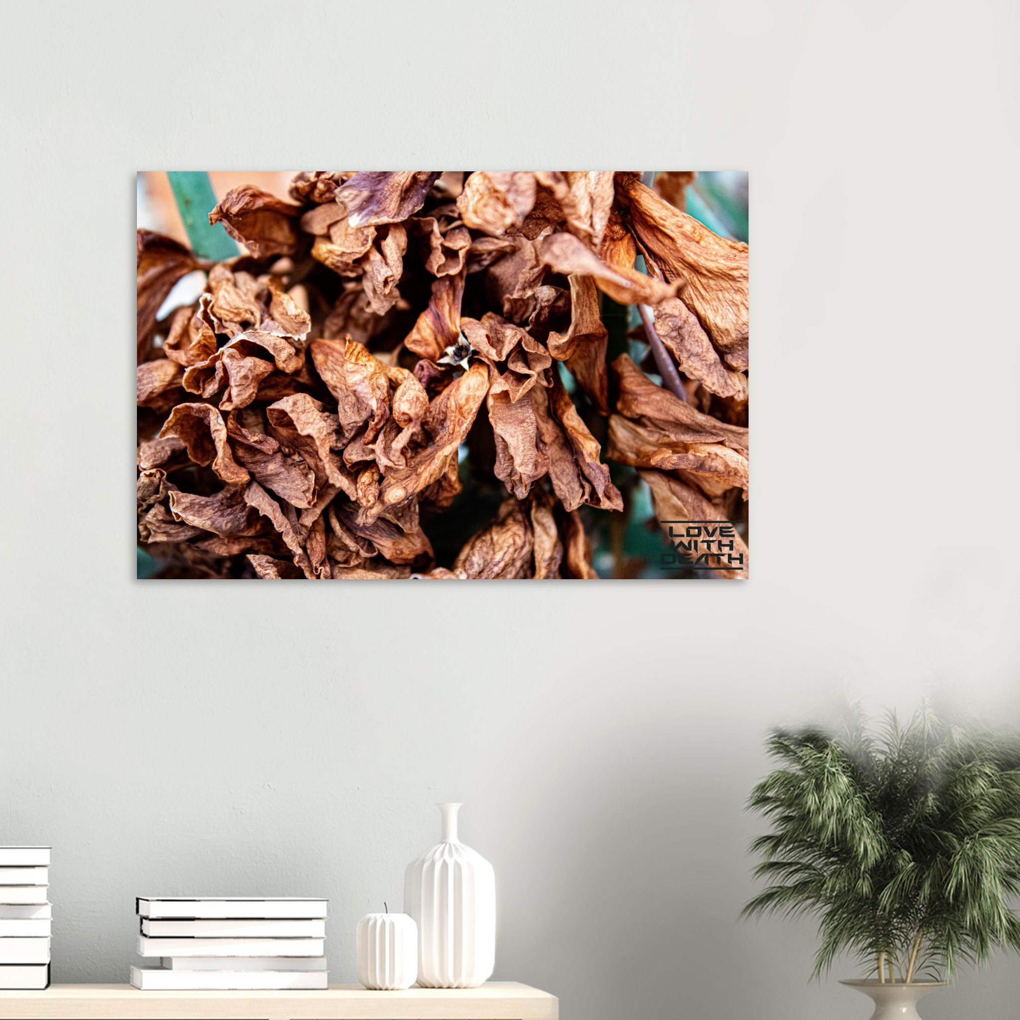 A close-up of dried leaves, showcasing their fragile structure and warm color palette, symbolizing the cycle of life and impermanence. This scene invites contemplation of the beauty found in transience.