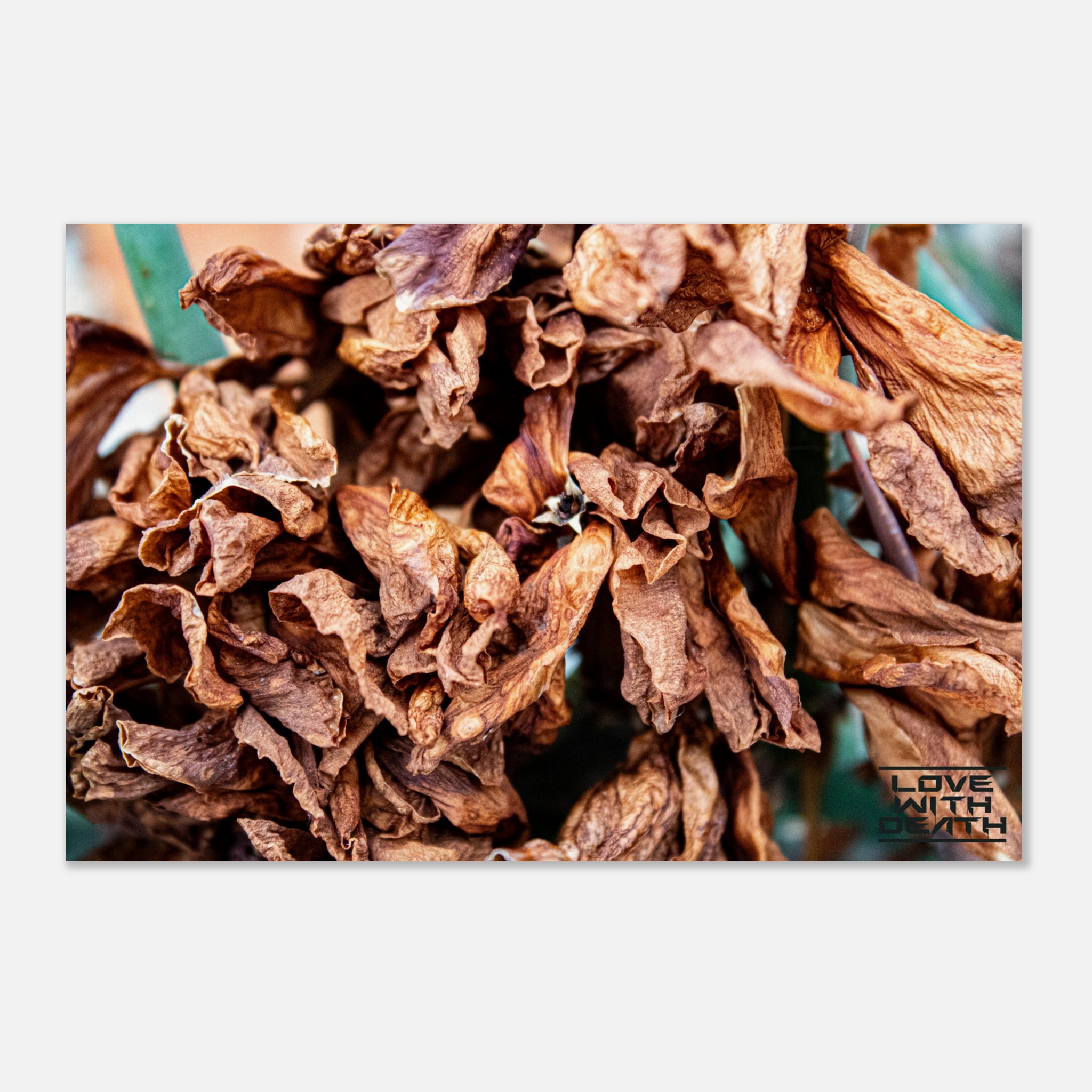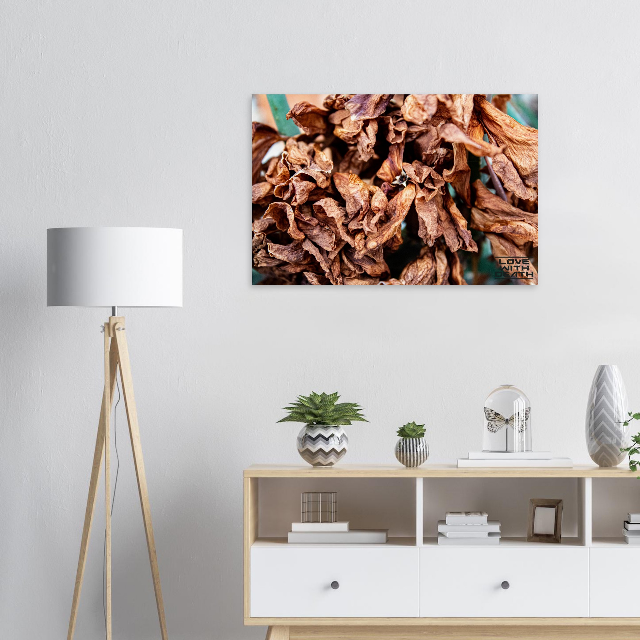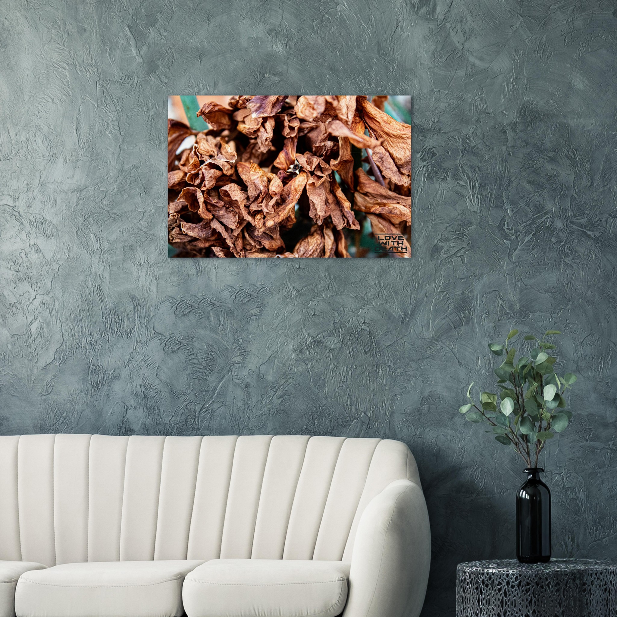 A close-up of dried leaves, showcasing their fragile structure and warm color palette, symbolizing the cycle of life and impermanence. This scene invites contemplation of the beauty found in transience.