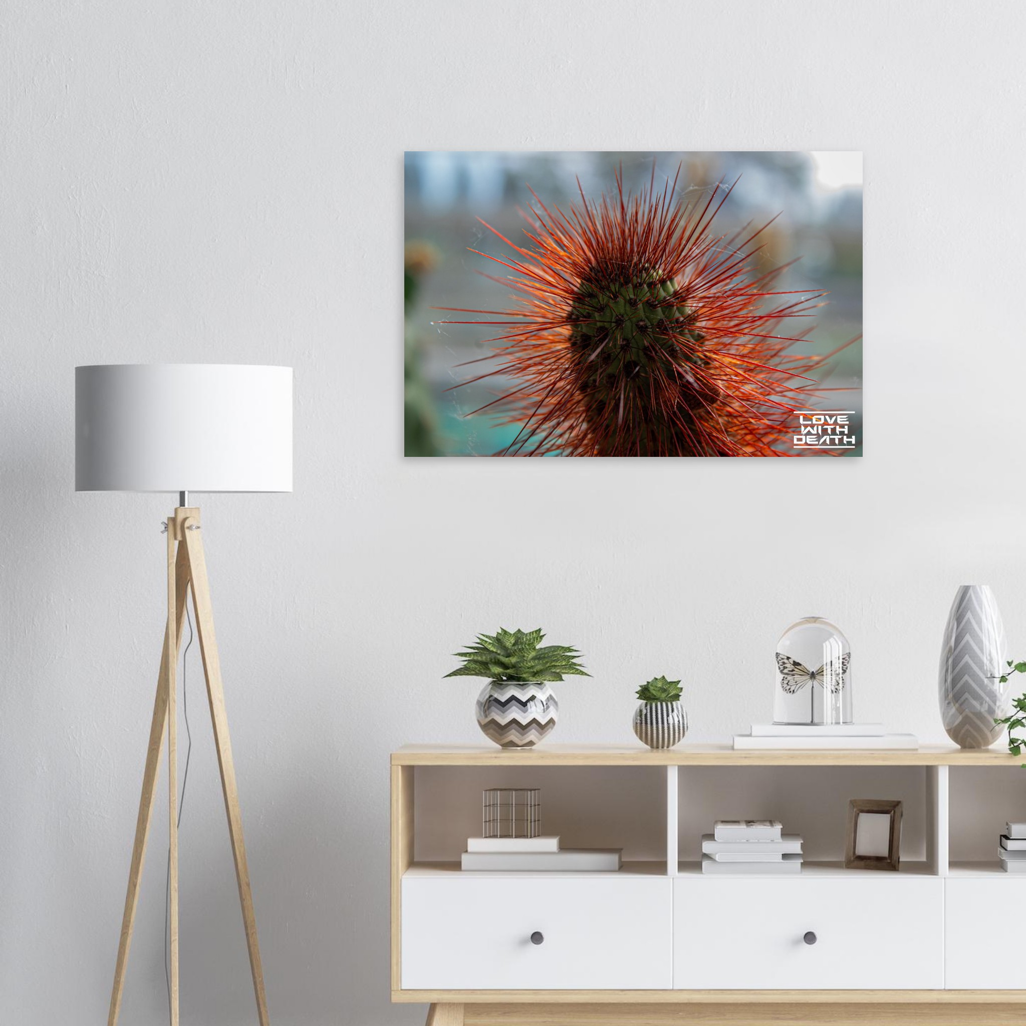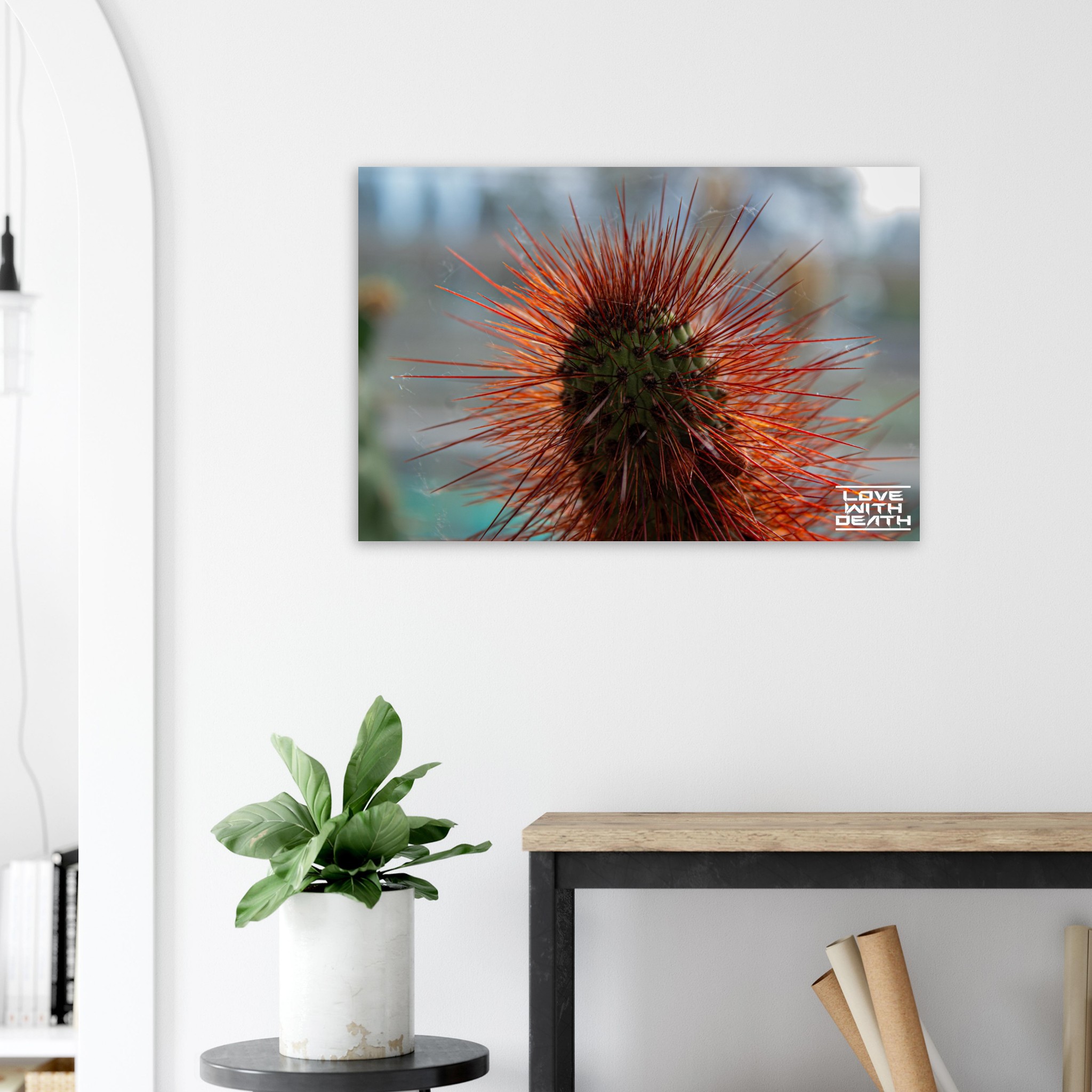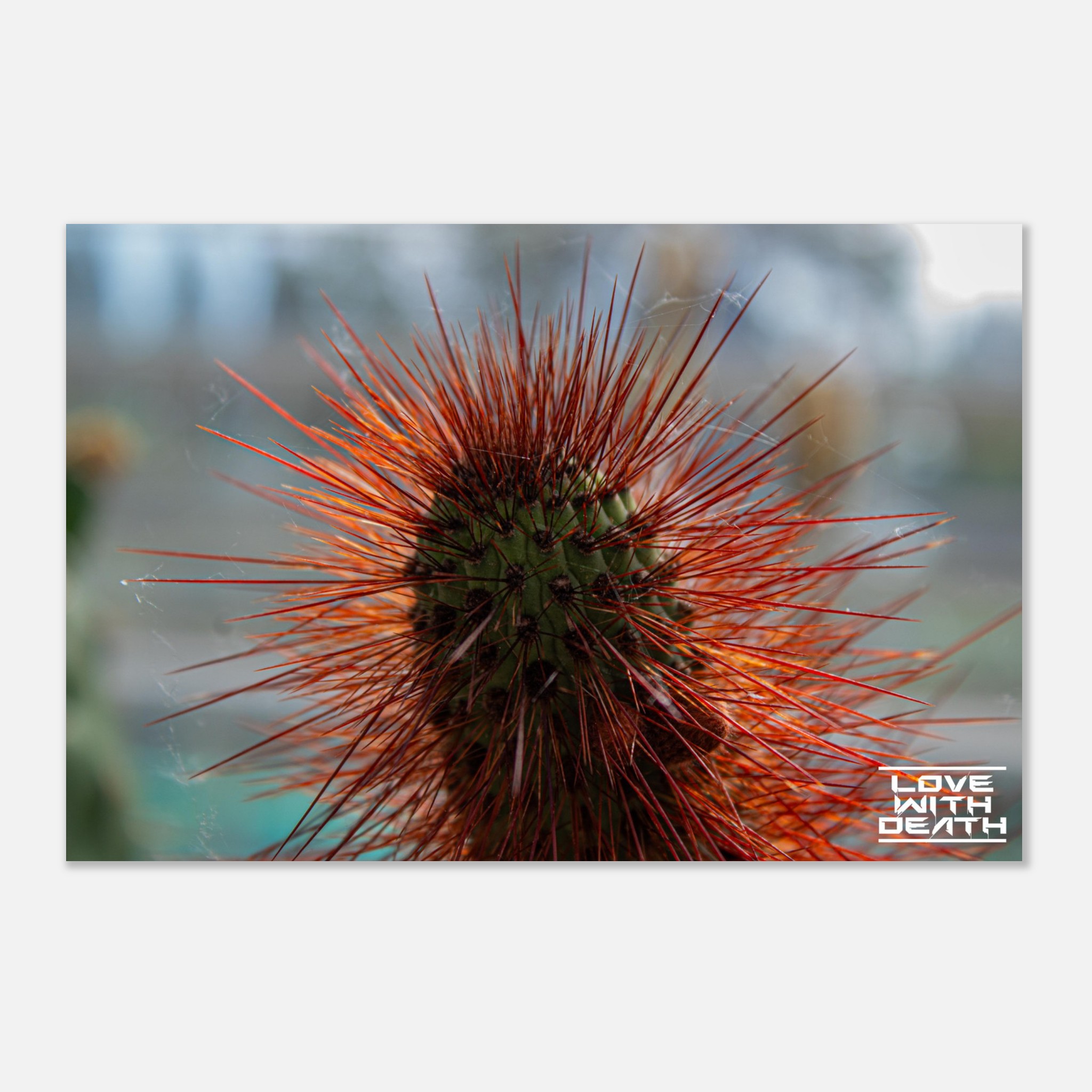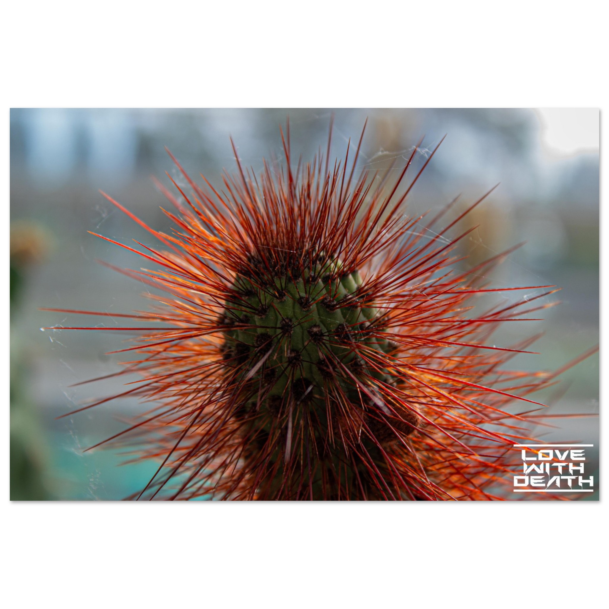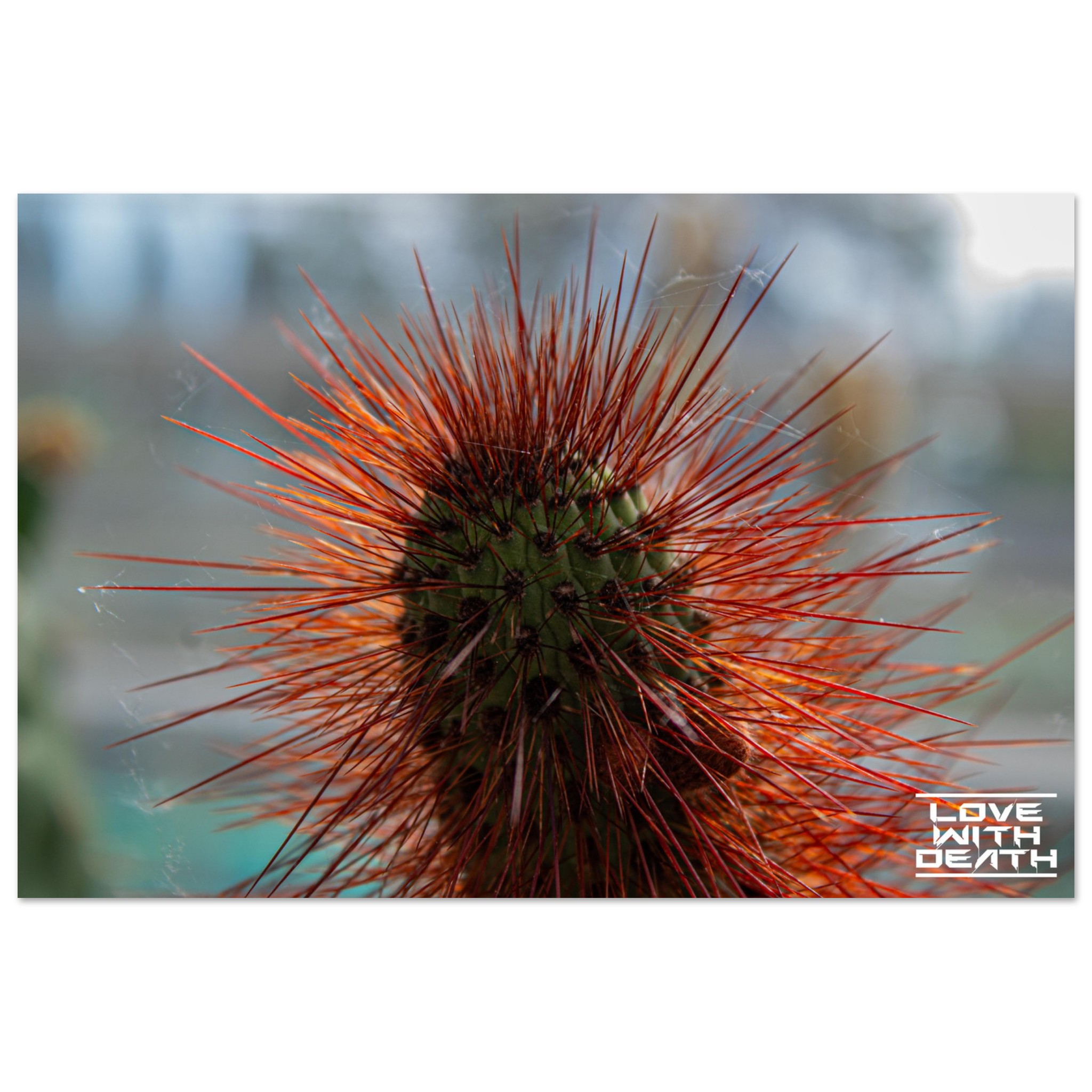 A captivating portrait of a cactus with its fiery red spines instantly drawing attention. The delicate cobwebs among the spines add a touch of fragility amidst the rugged beauty of nature.
