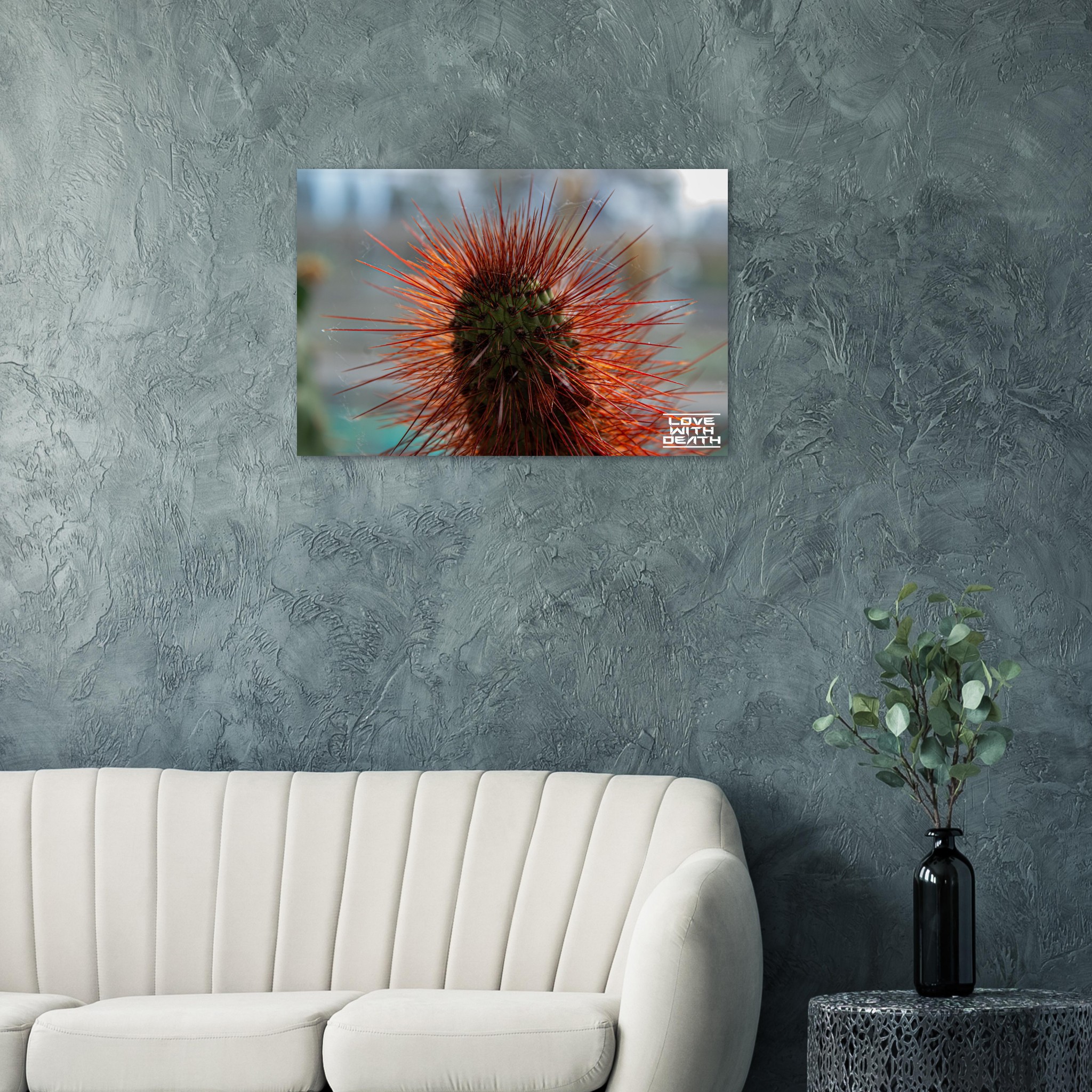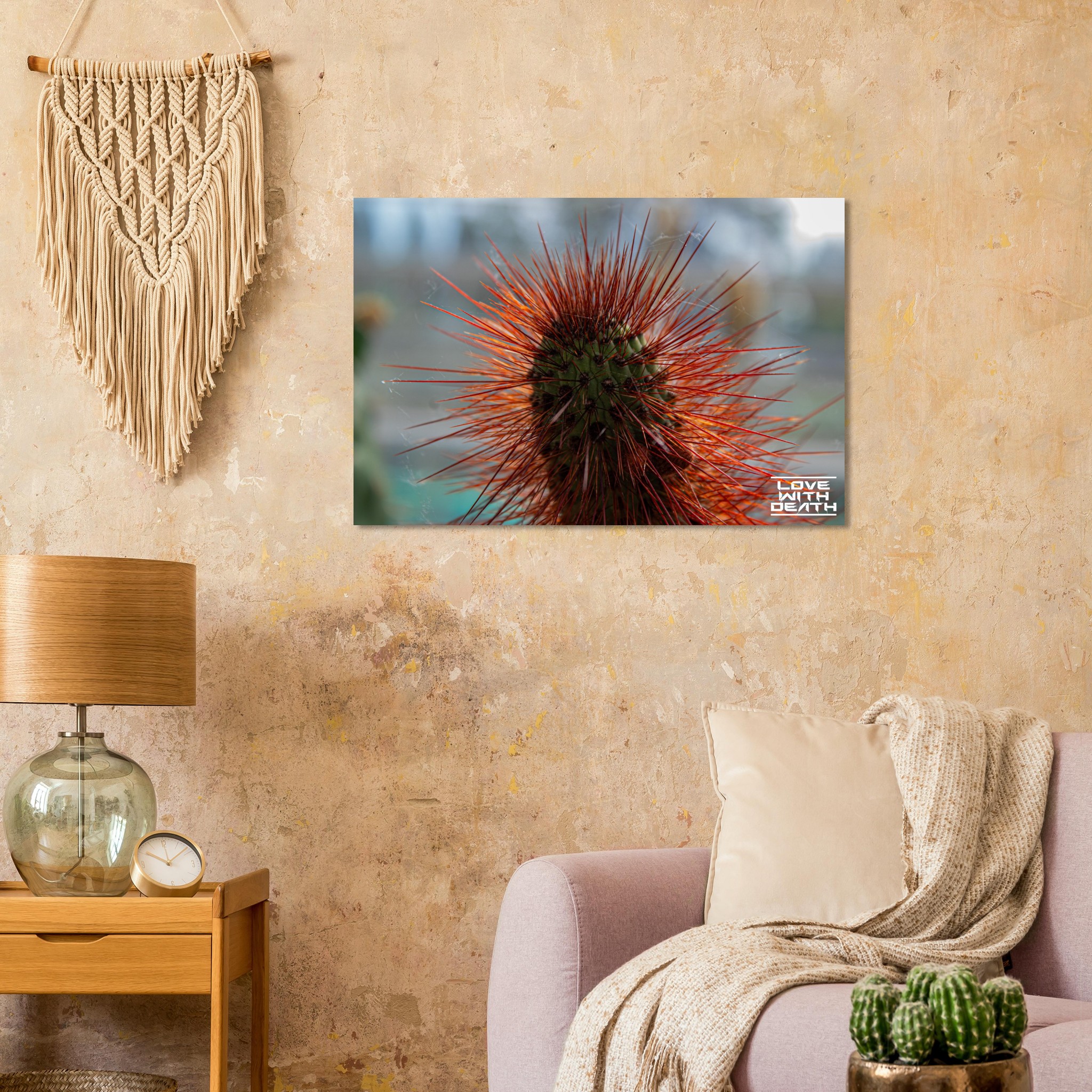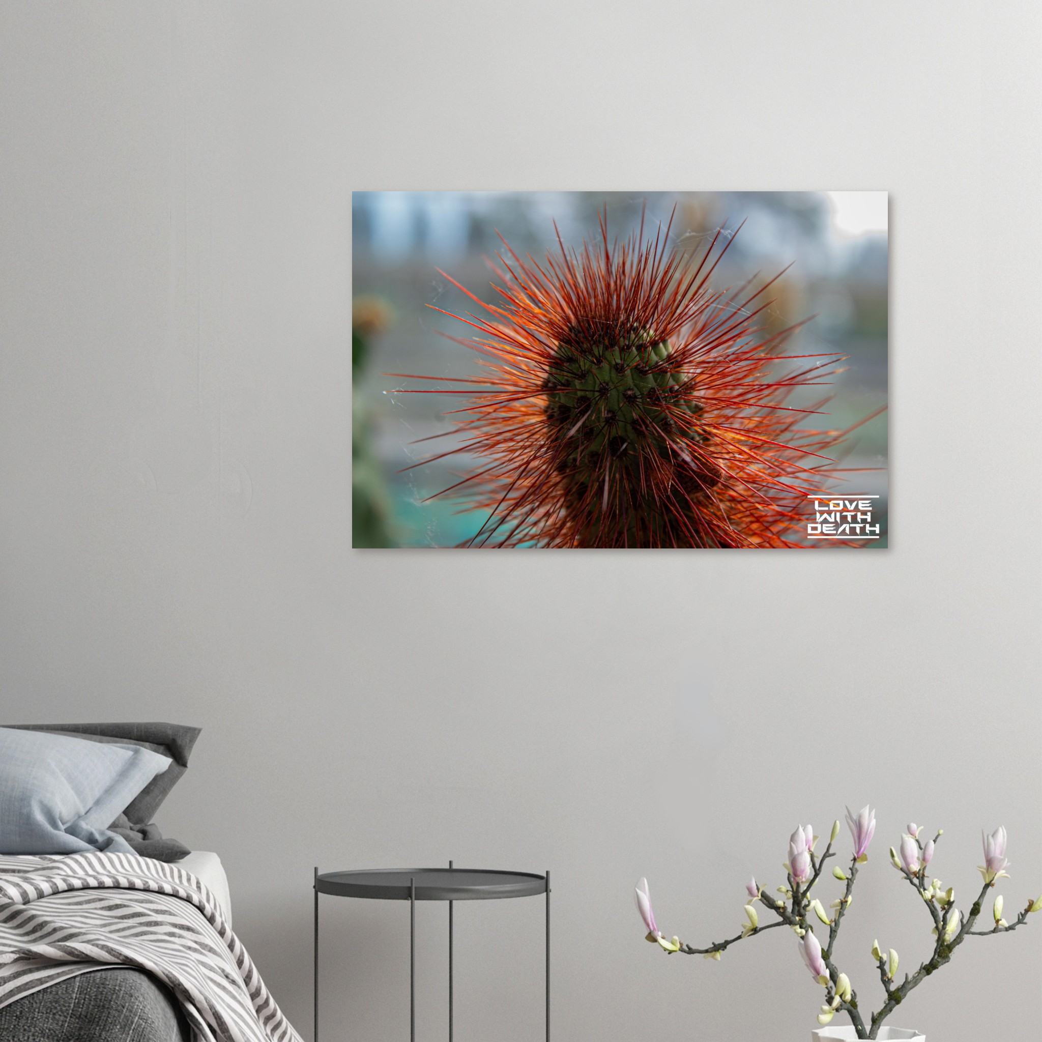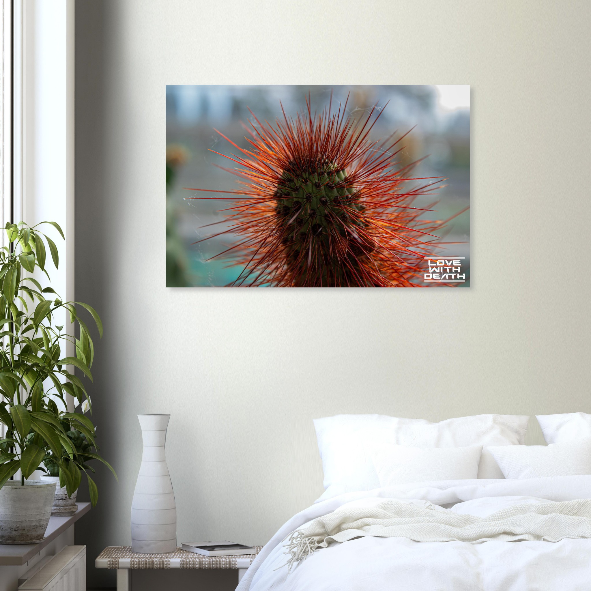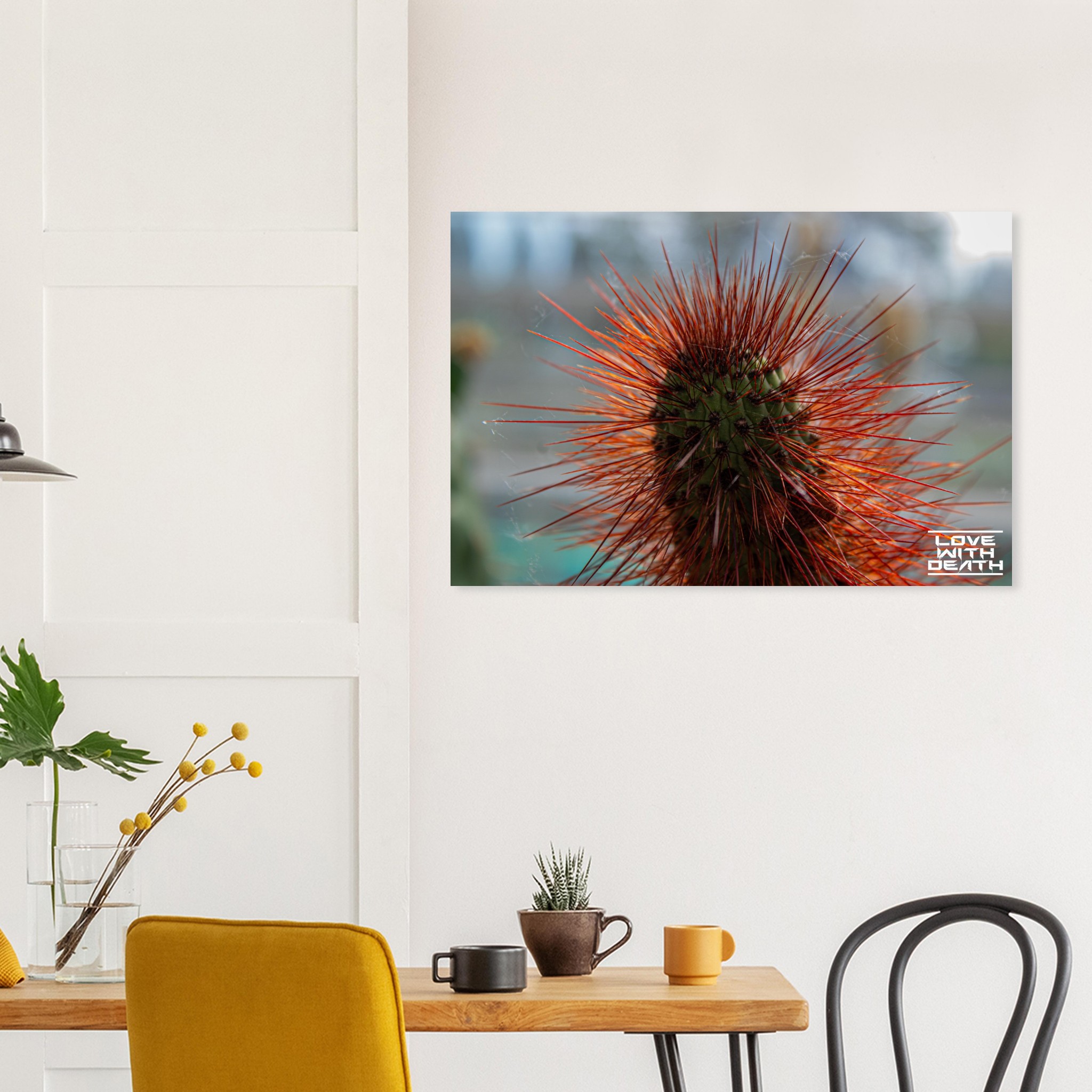 A captivating portrait of a cactus with its fiery red spines instantly drawing attention. The delicate cobwebs among the spines add a touch of fragility amidst the rugged beauty of nature.