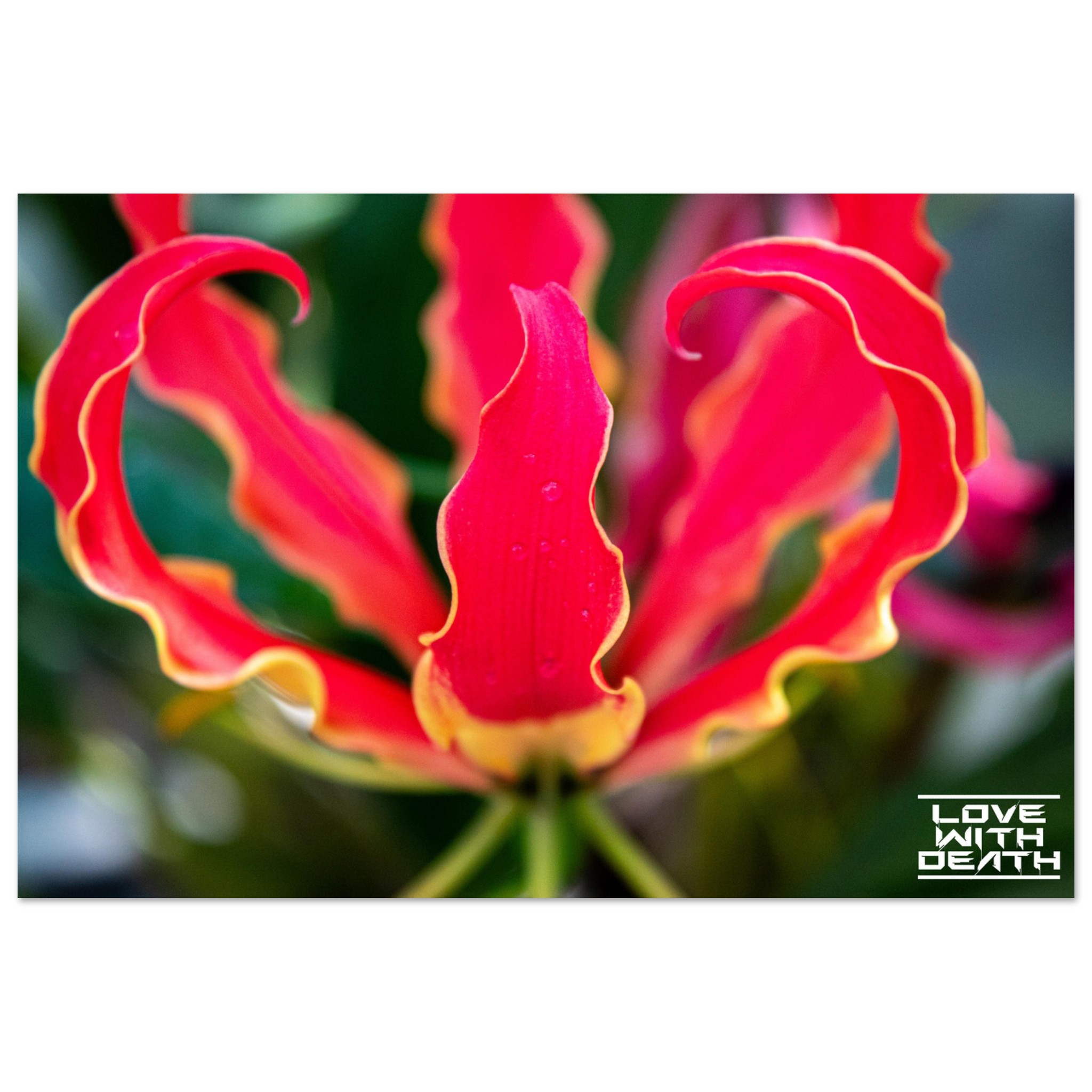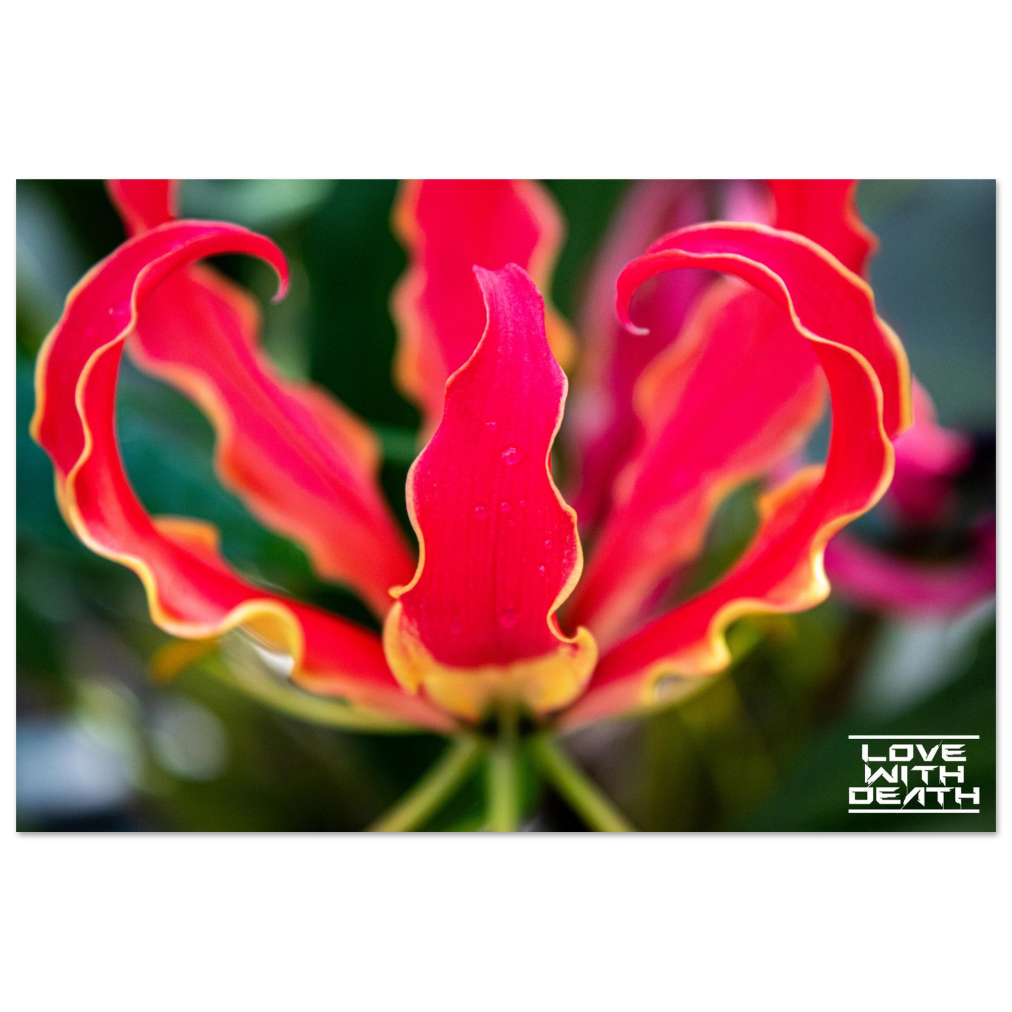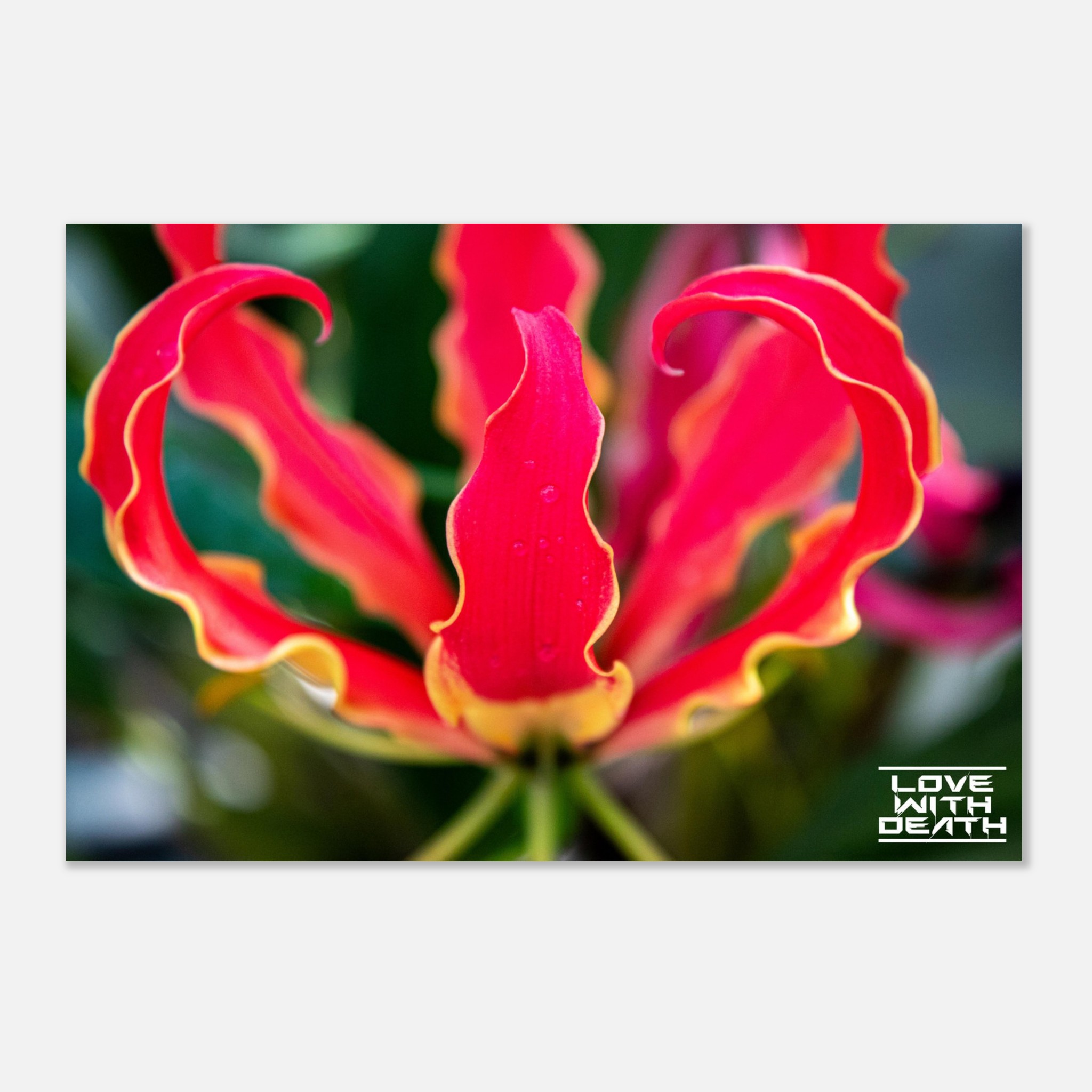 A stunning macro shot of an exotic flower, whose vibrant red and yellow hues resemble flickering flames. The curved petals and striking contrasts create a dramatic yet elegant scene. Gentle dewdrops on the petals enhance the natural beauty and delicate texture.