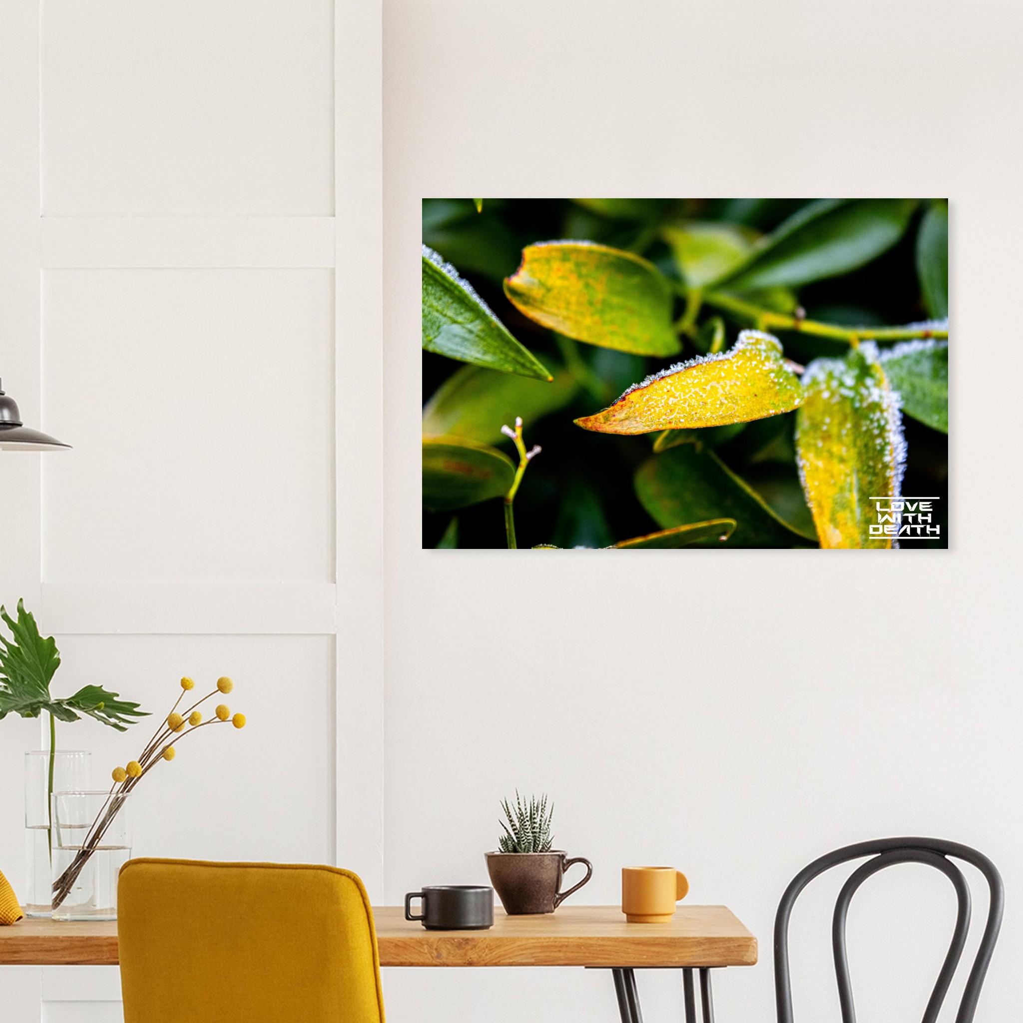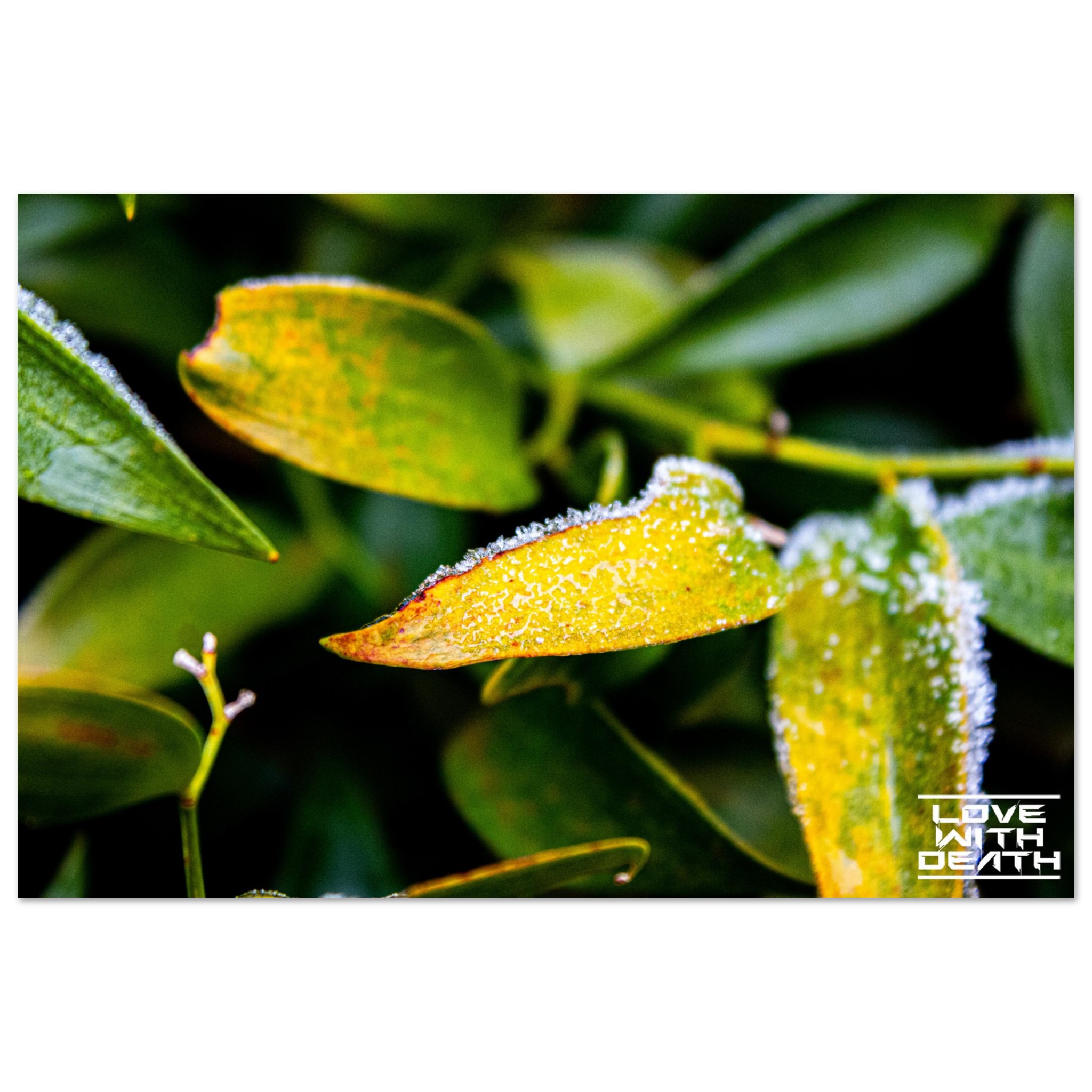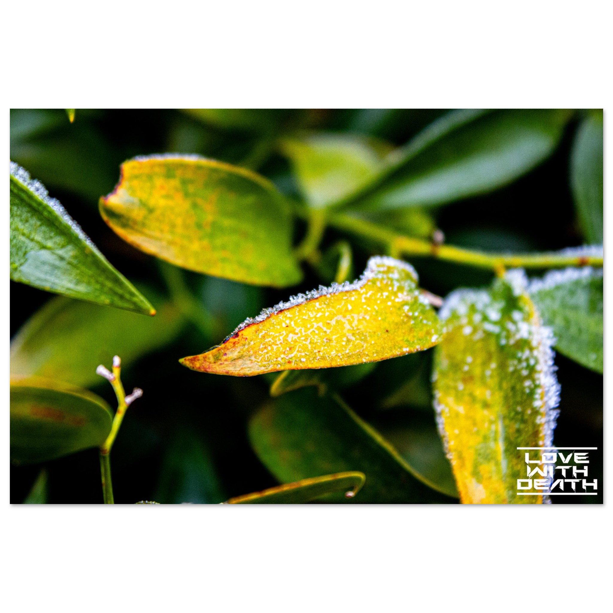 This image captures a single leaf delicately rimmed by the first frost of winter. The warm yellow and green hues of the leaf contrast beautifully with the cold, sparkling ice crystals, showcasing nature’s beauty in a transitional moment.