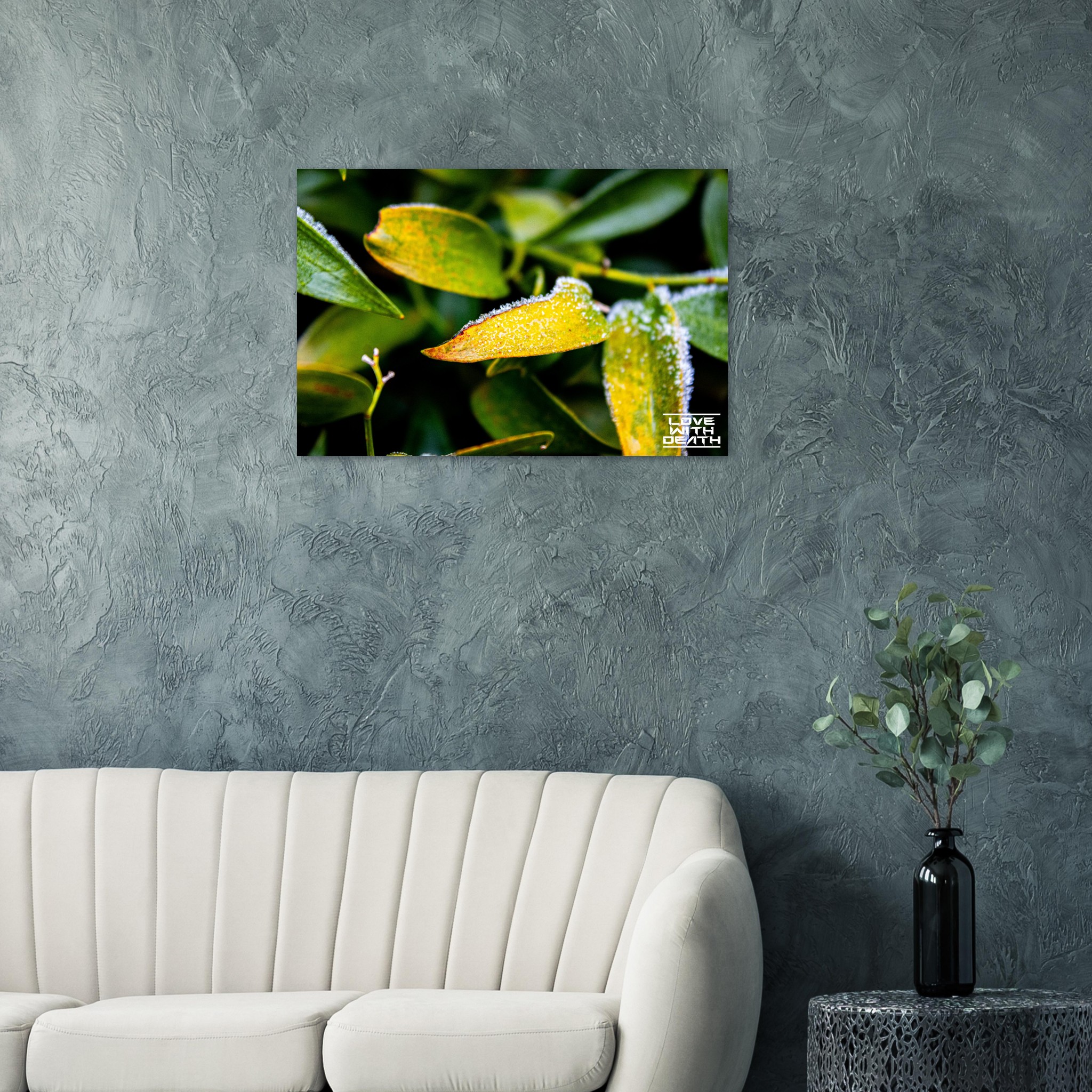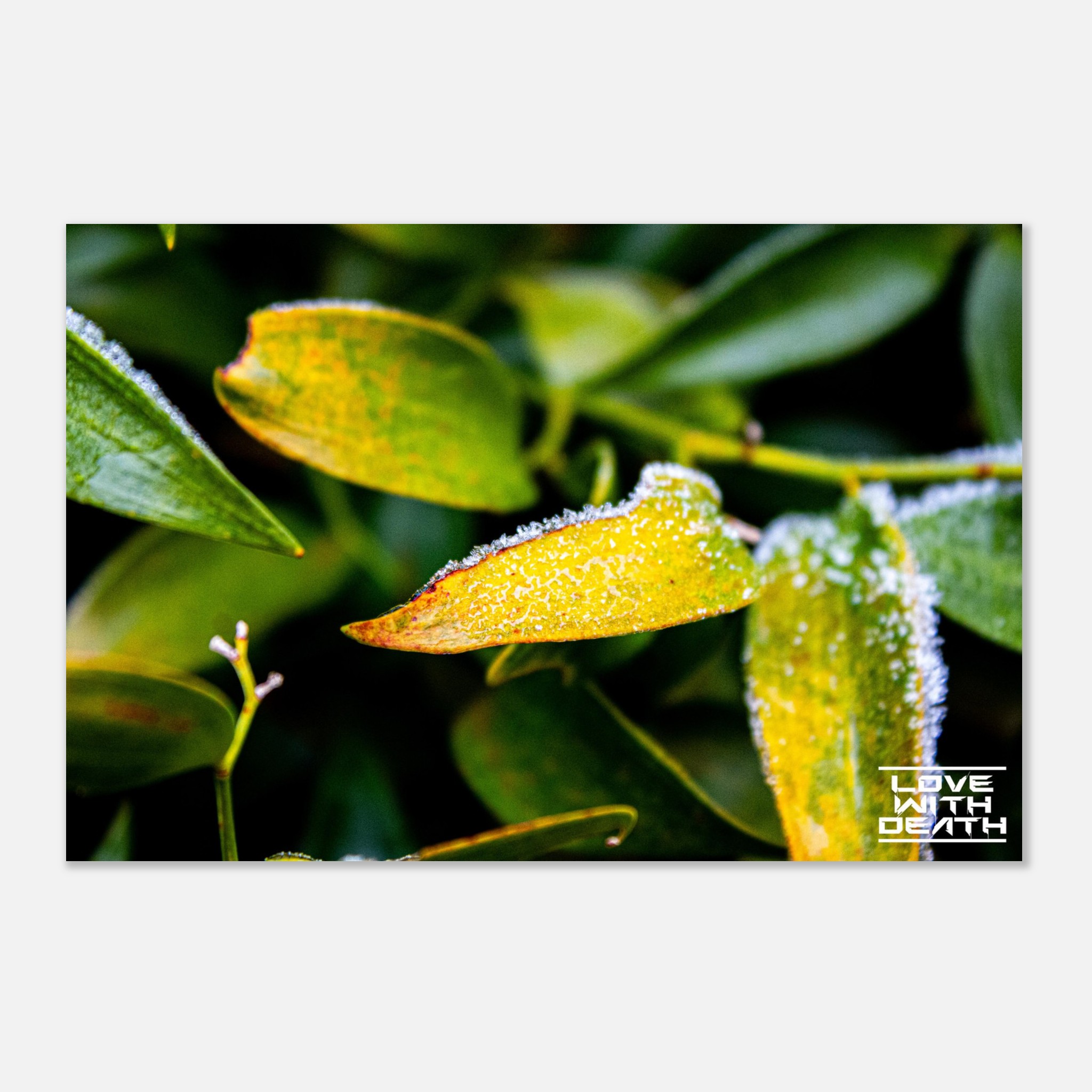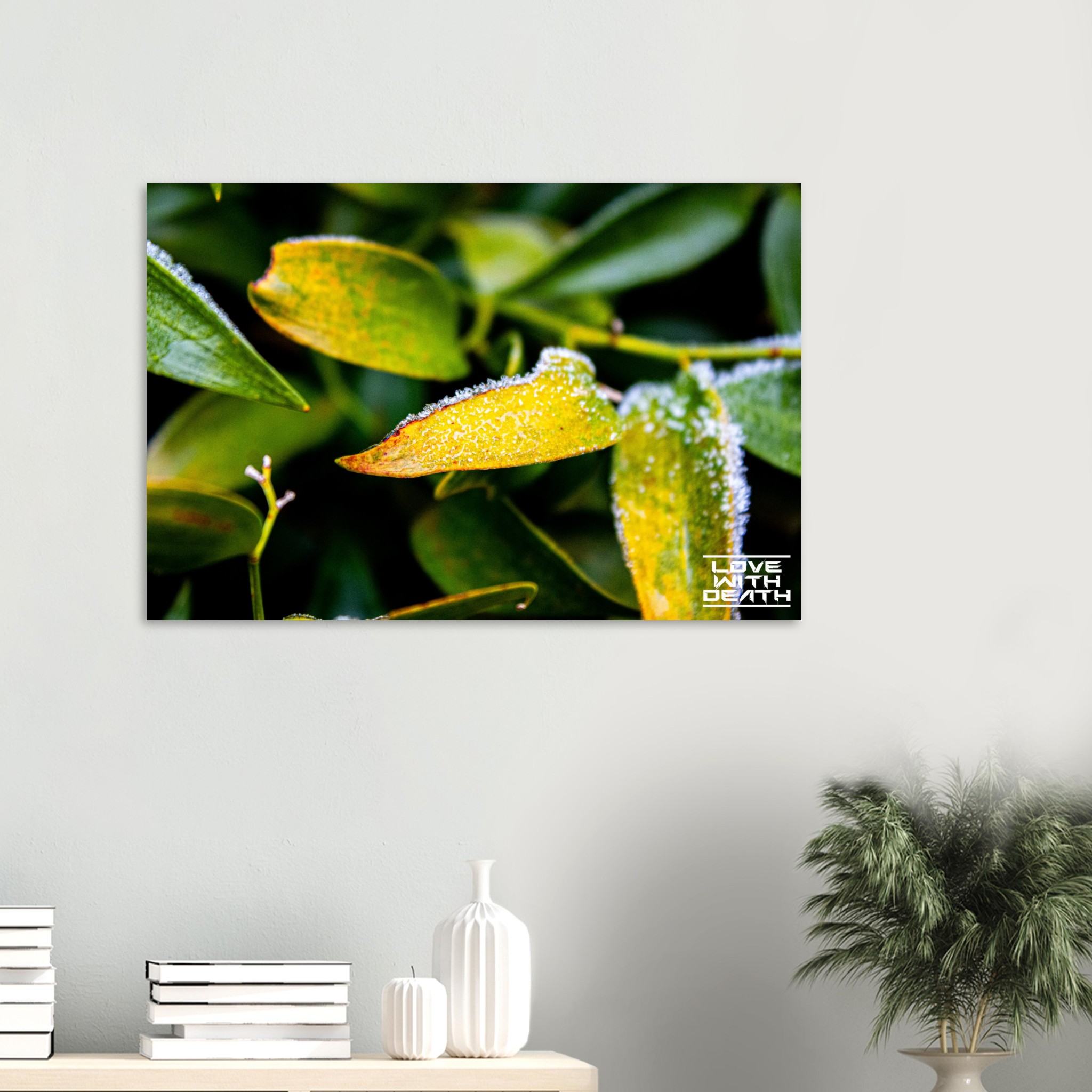 This image captures a single leaf delicately rimmed by the first frost of winter. The warm yellow and green hues of the leaf contrast beautifully with the cold, sparkling ice crystals, showcasing nature’s beauty in a transitional moment.