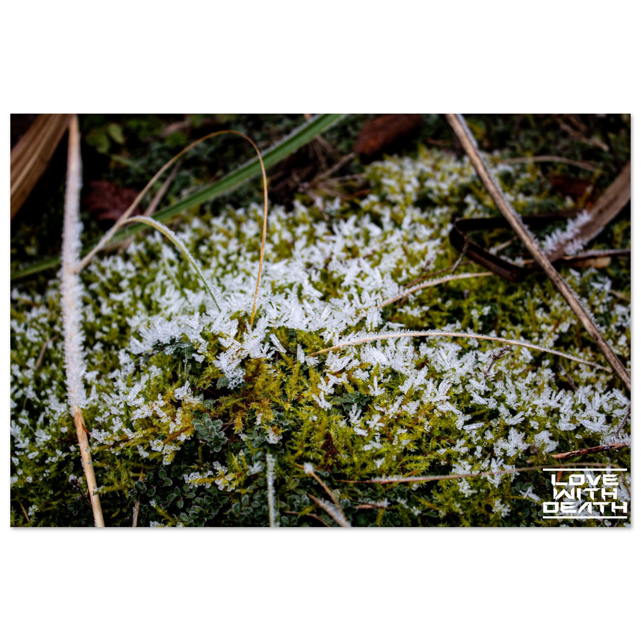 A detailed macro shot of moss covered in a layer of frost. The intricate ice crystals create an artistic pattern, capturing the chill and beauty of winter. The interplay between moss structures and grasses brings harmony to the green and white tones.