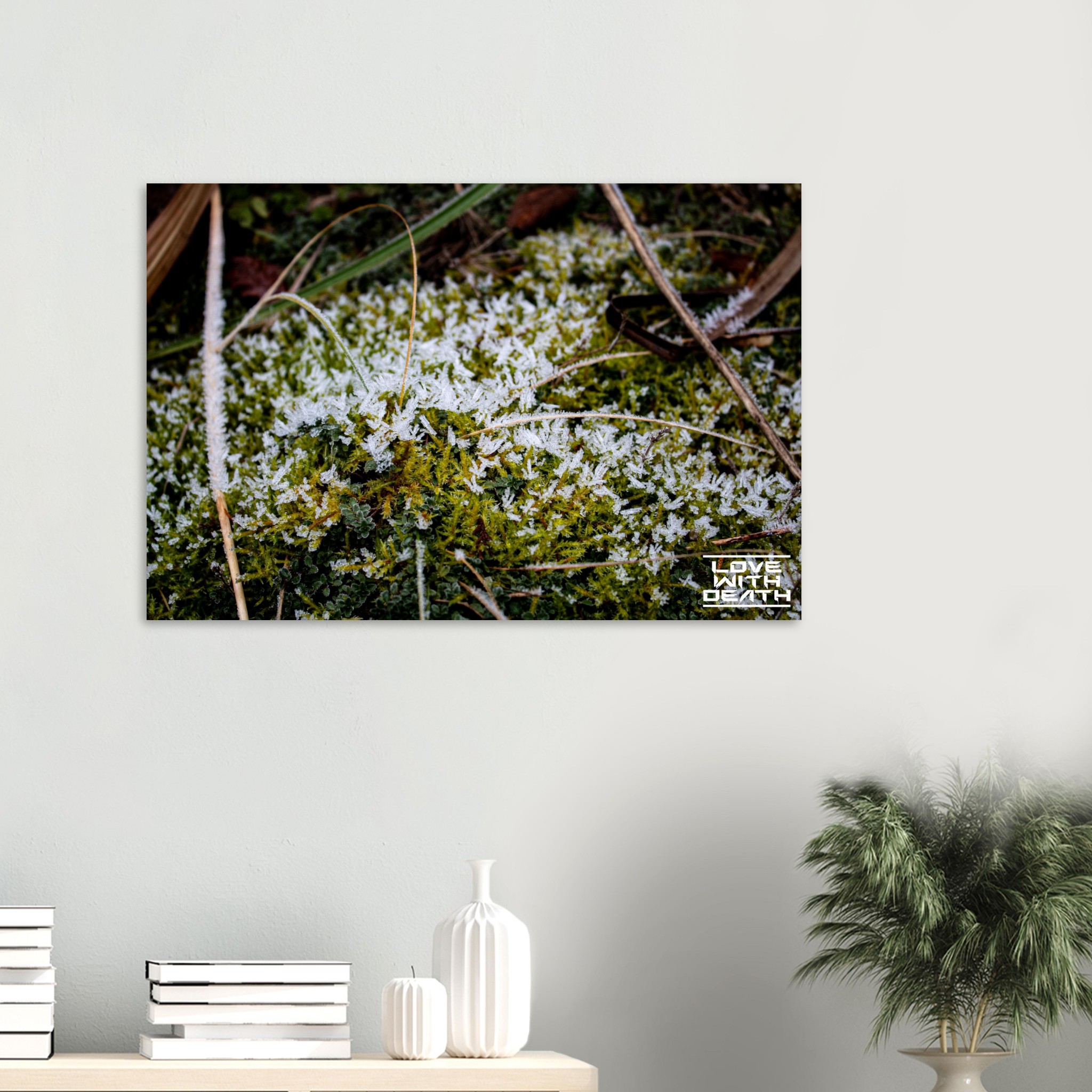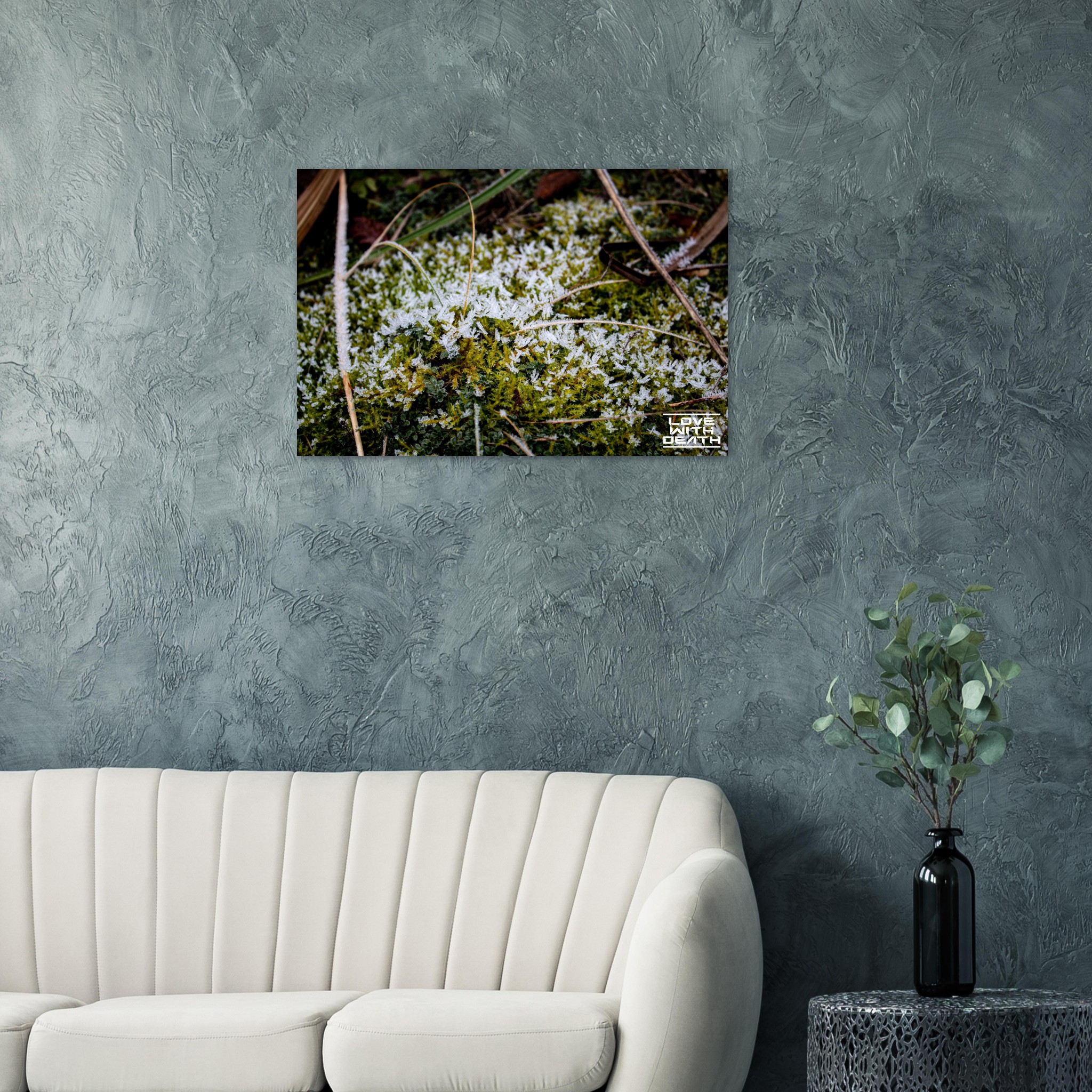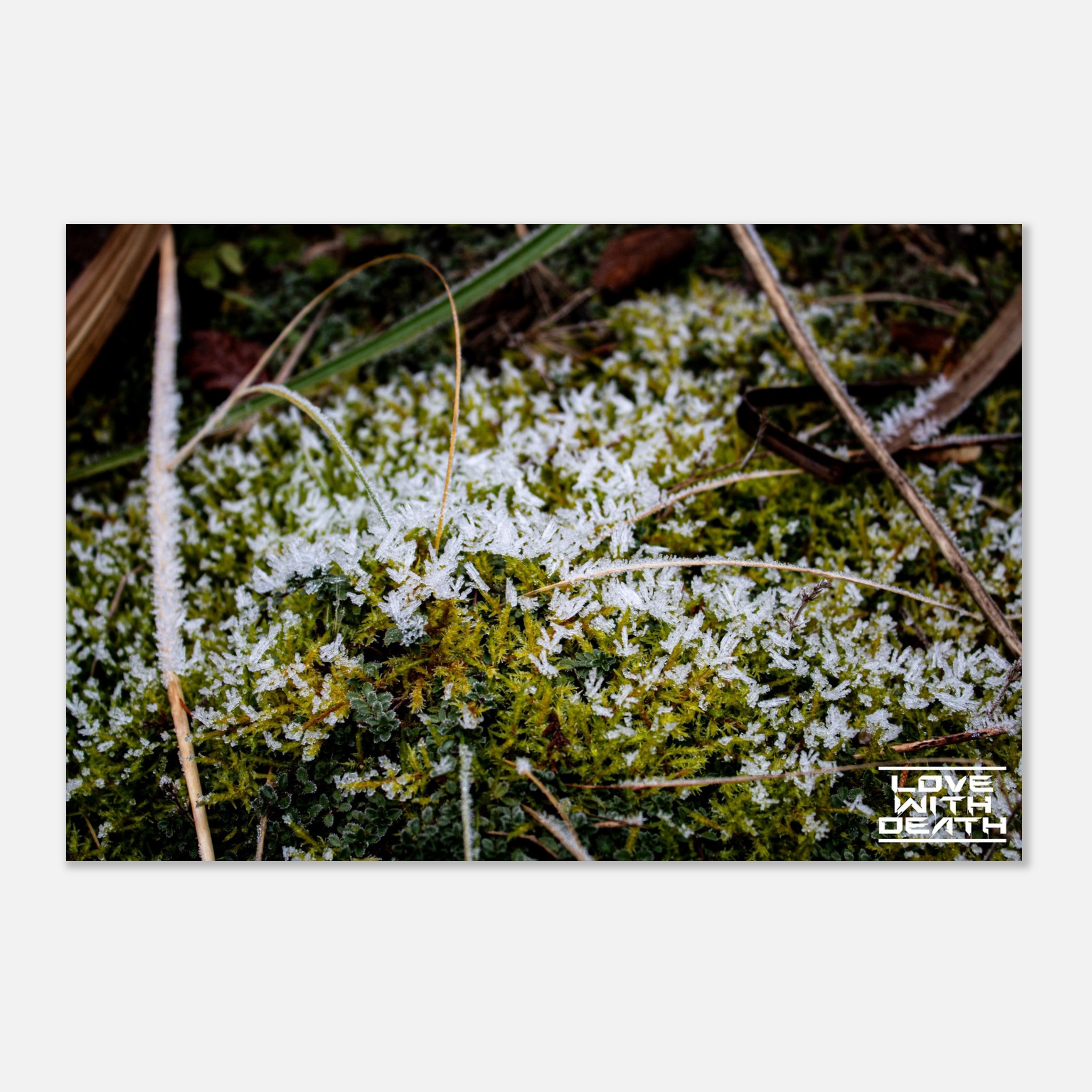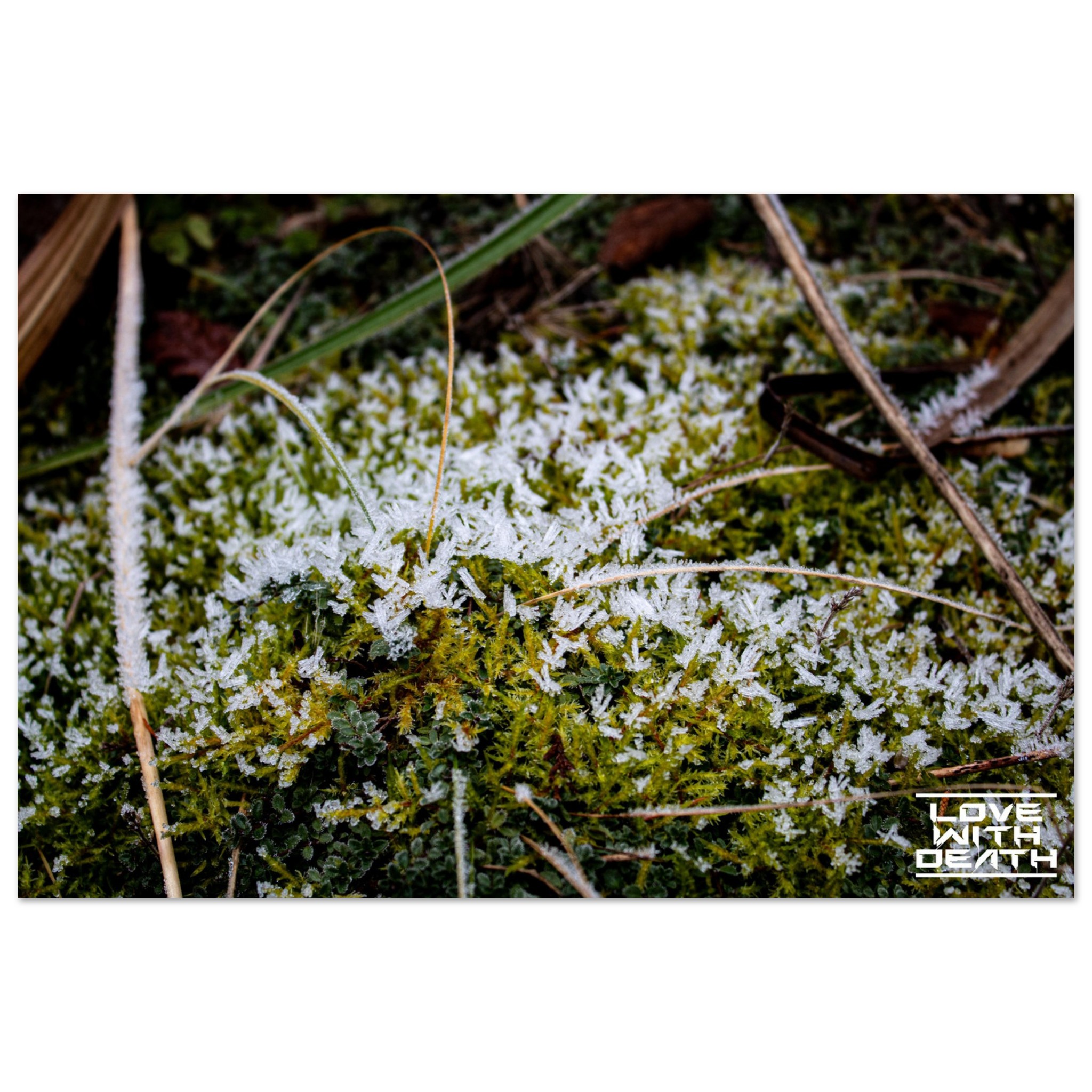 A detailed macro shot of moss covered in a layer of frost. The intricate ice crystals create an artistic pattern, capturing the chill and beauty of winter. The interplay between moss structures and grasses brings harmony to the green and white tones.