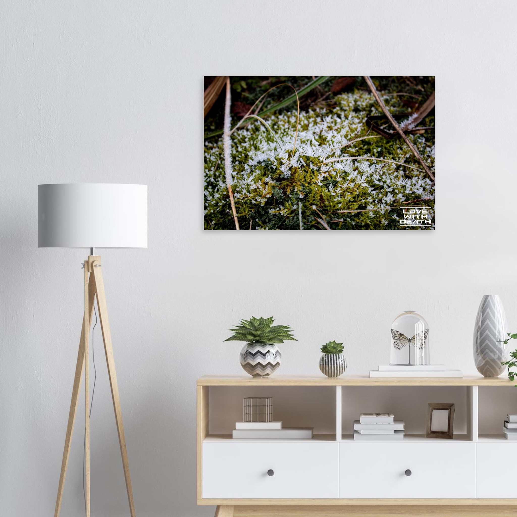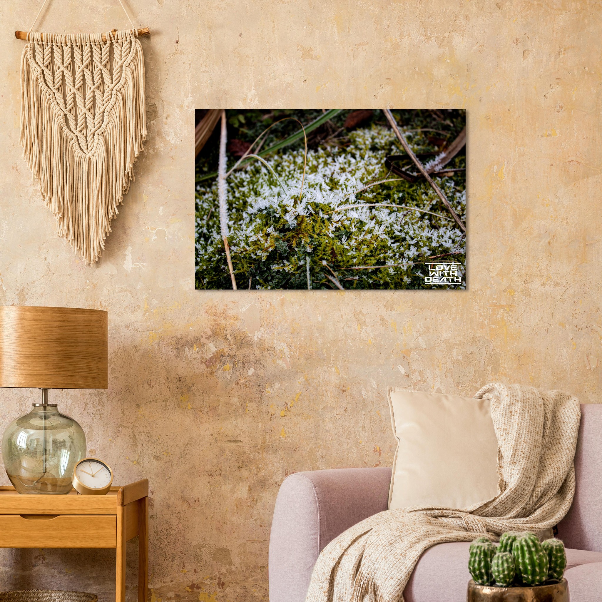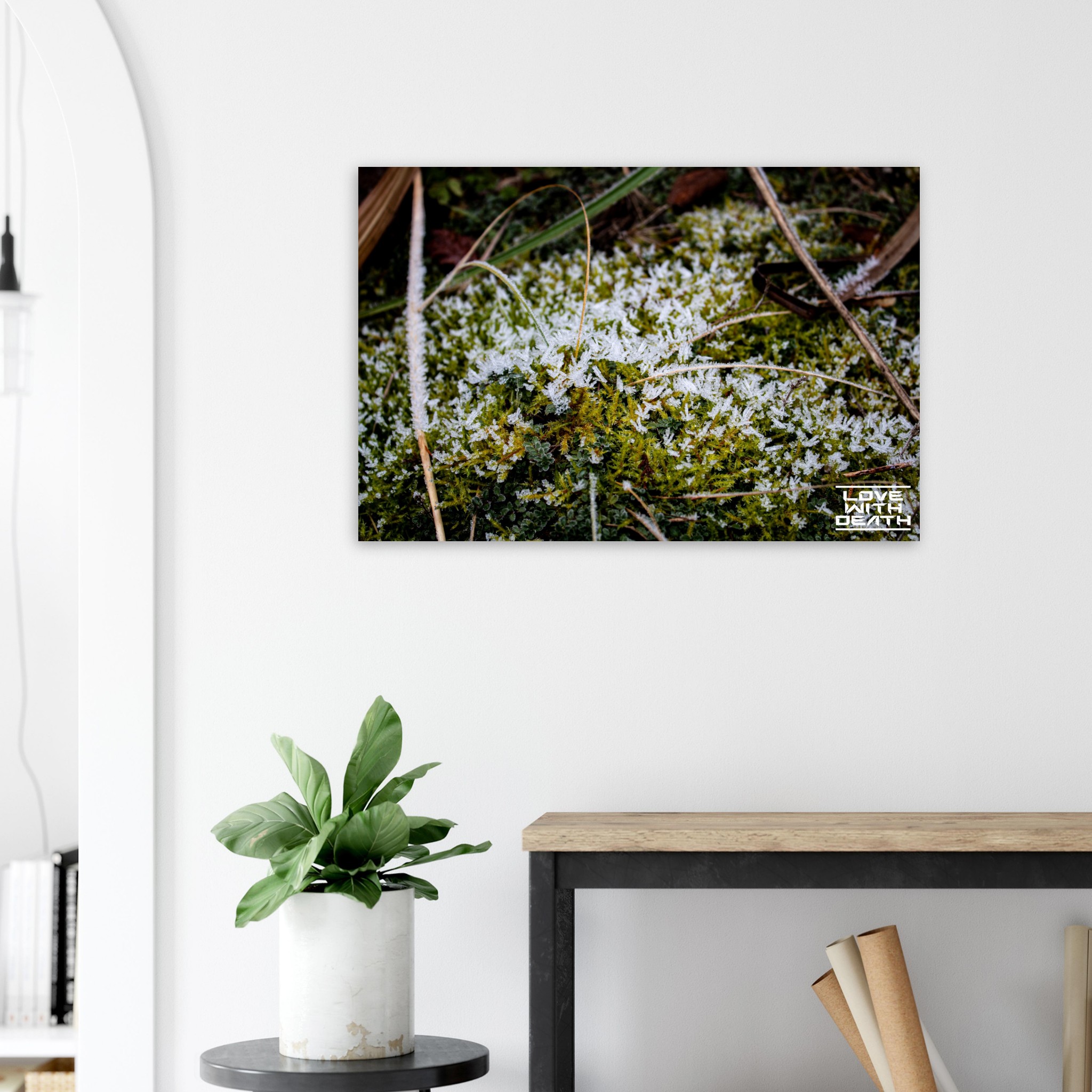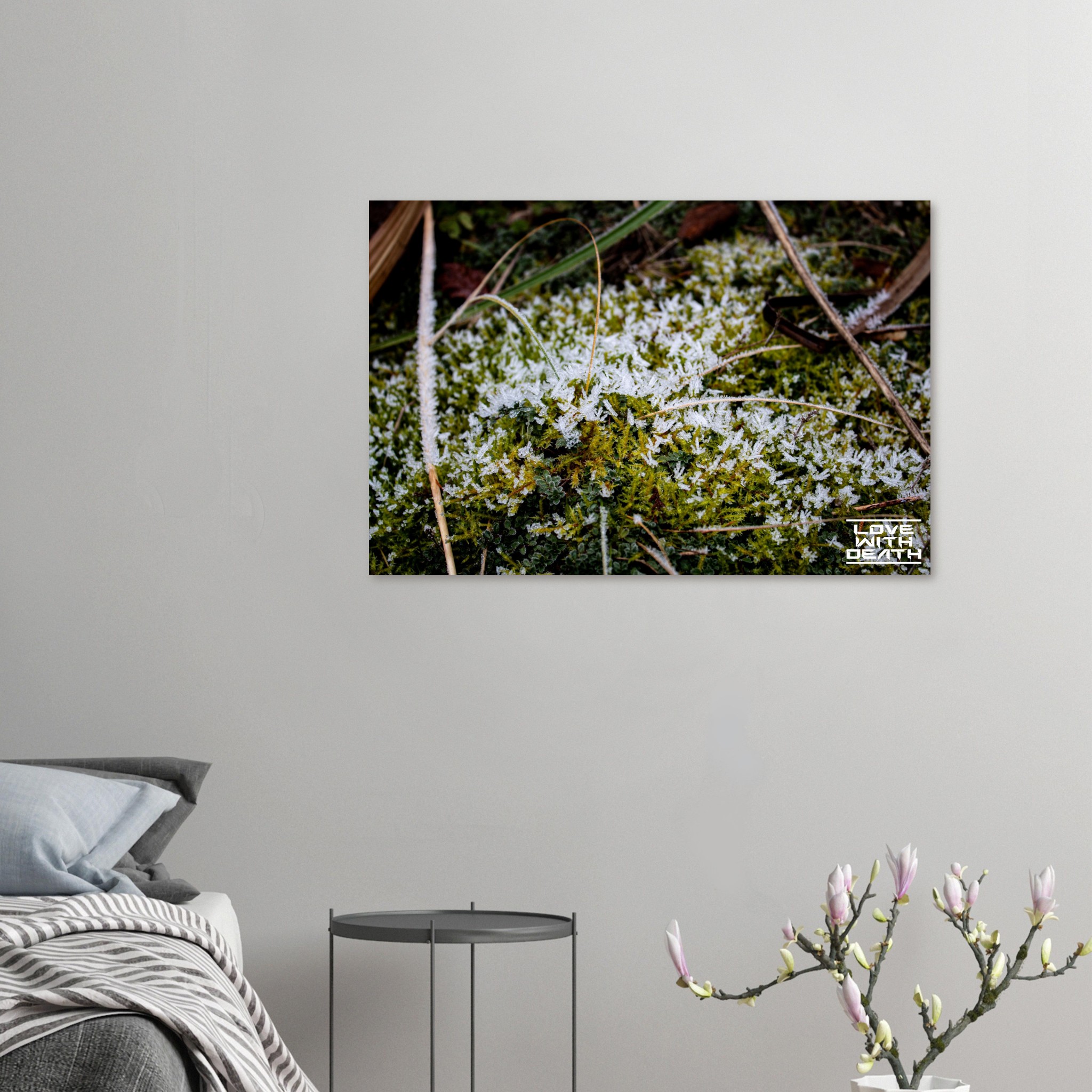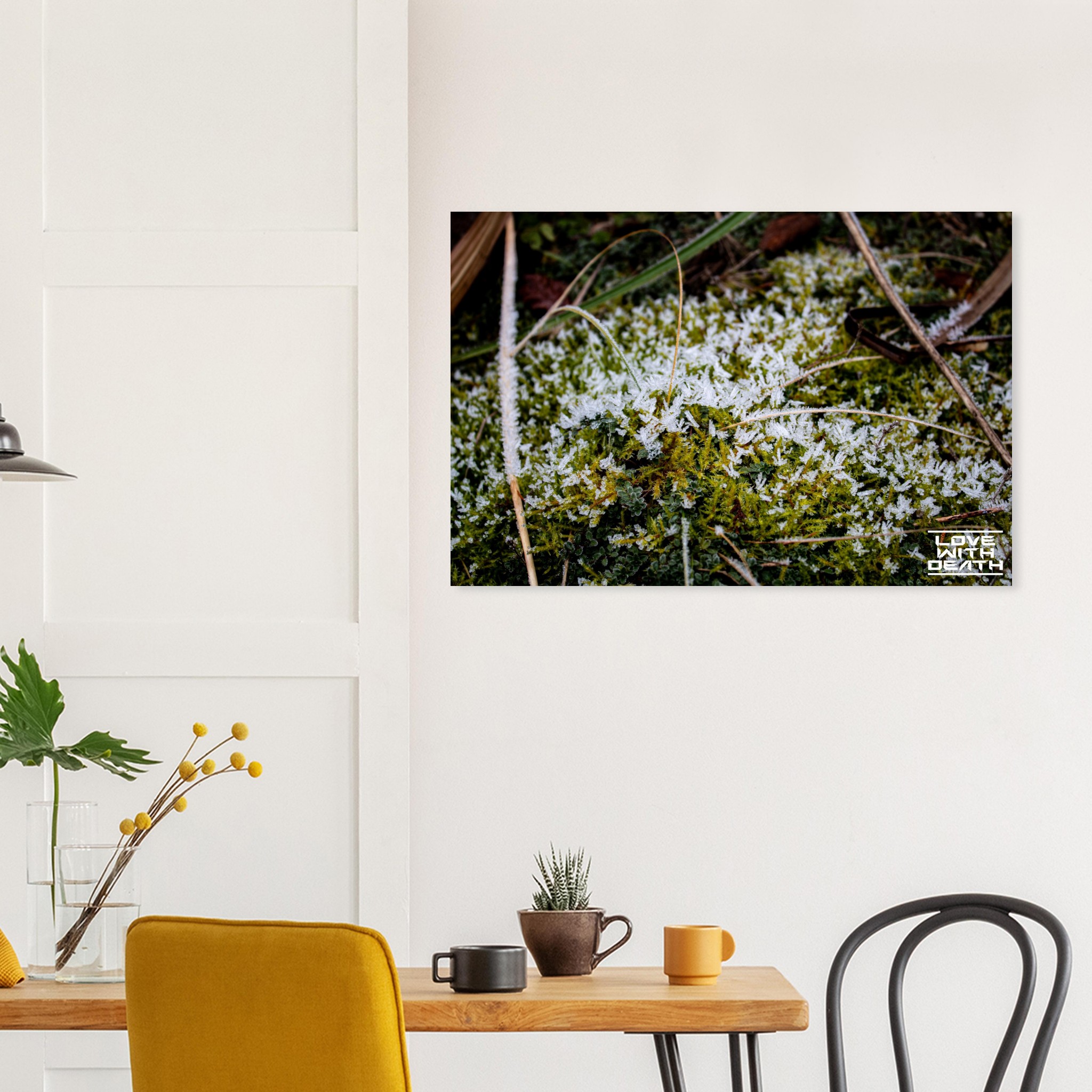 A detailed macro shot of moss covered in a layer of frost. The intricate ice crystals create an artistic pattern, capturing the chill and beauty of winter. The interplay between moss structures and grasses brings harmony to the green and white tones.