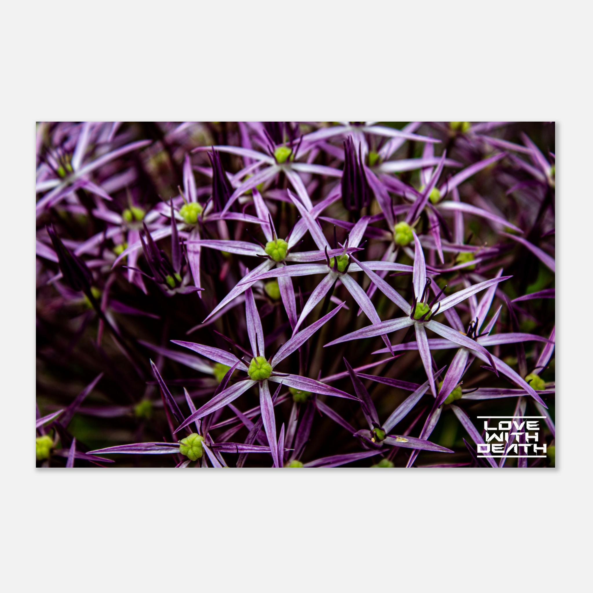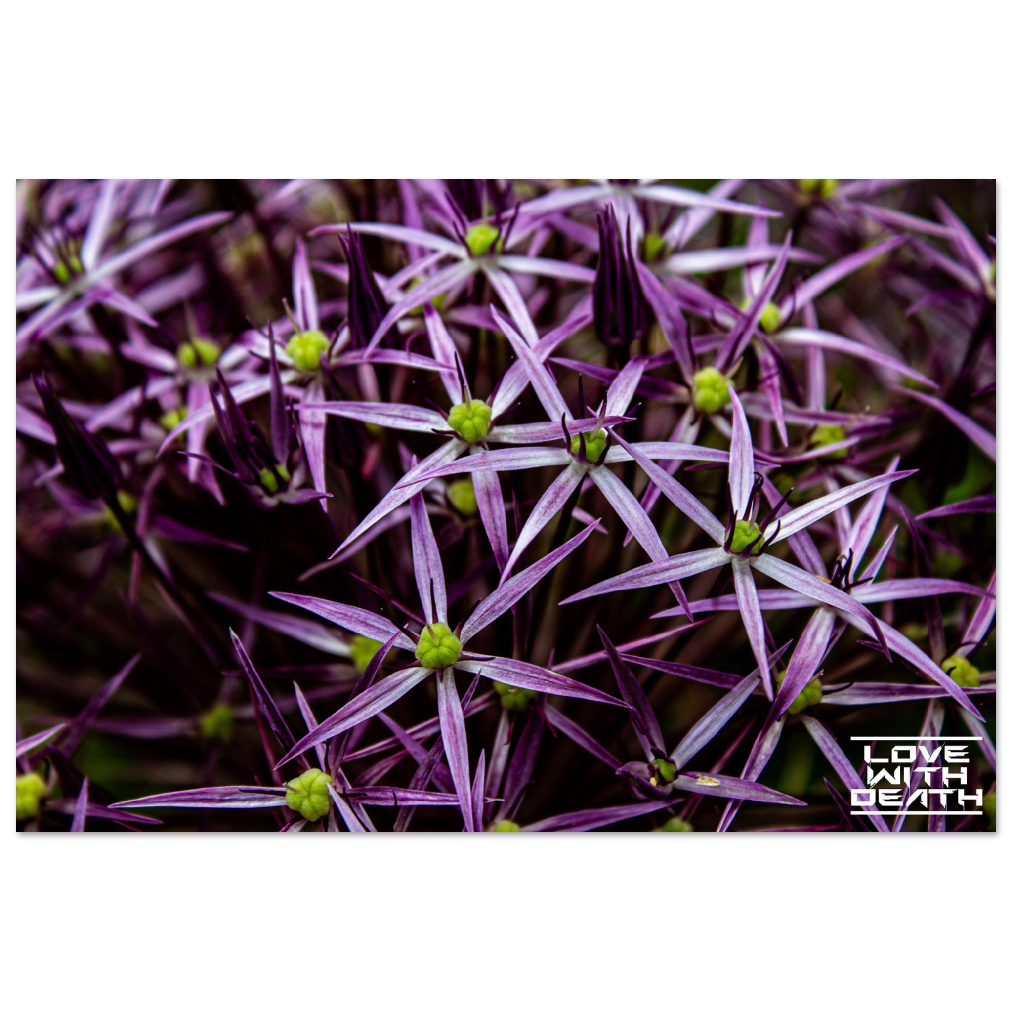 This image captures the captivating beauty of star-shaped purple blossoms densely clustered together. The sharp edges of the petals and the vibrant interplay of purple and green create an enthralling geometric composition that highlights nature’s harmony.