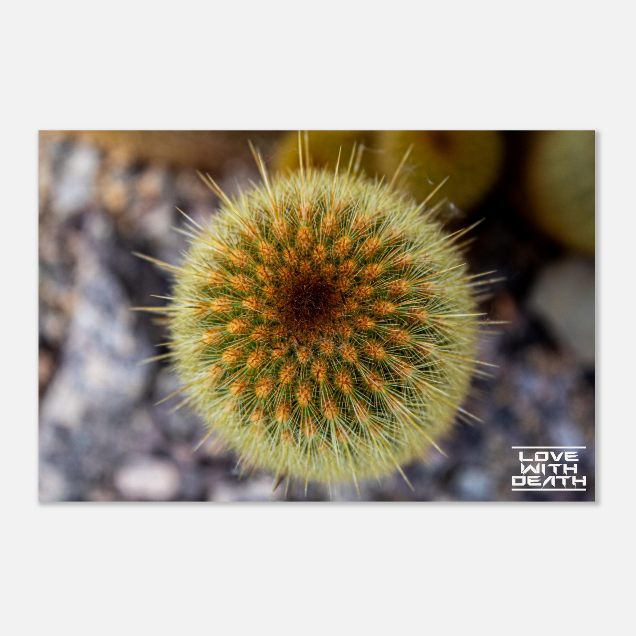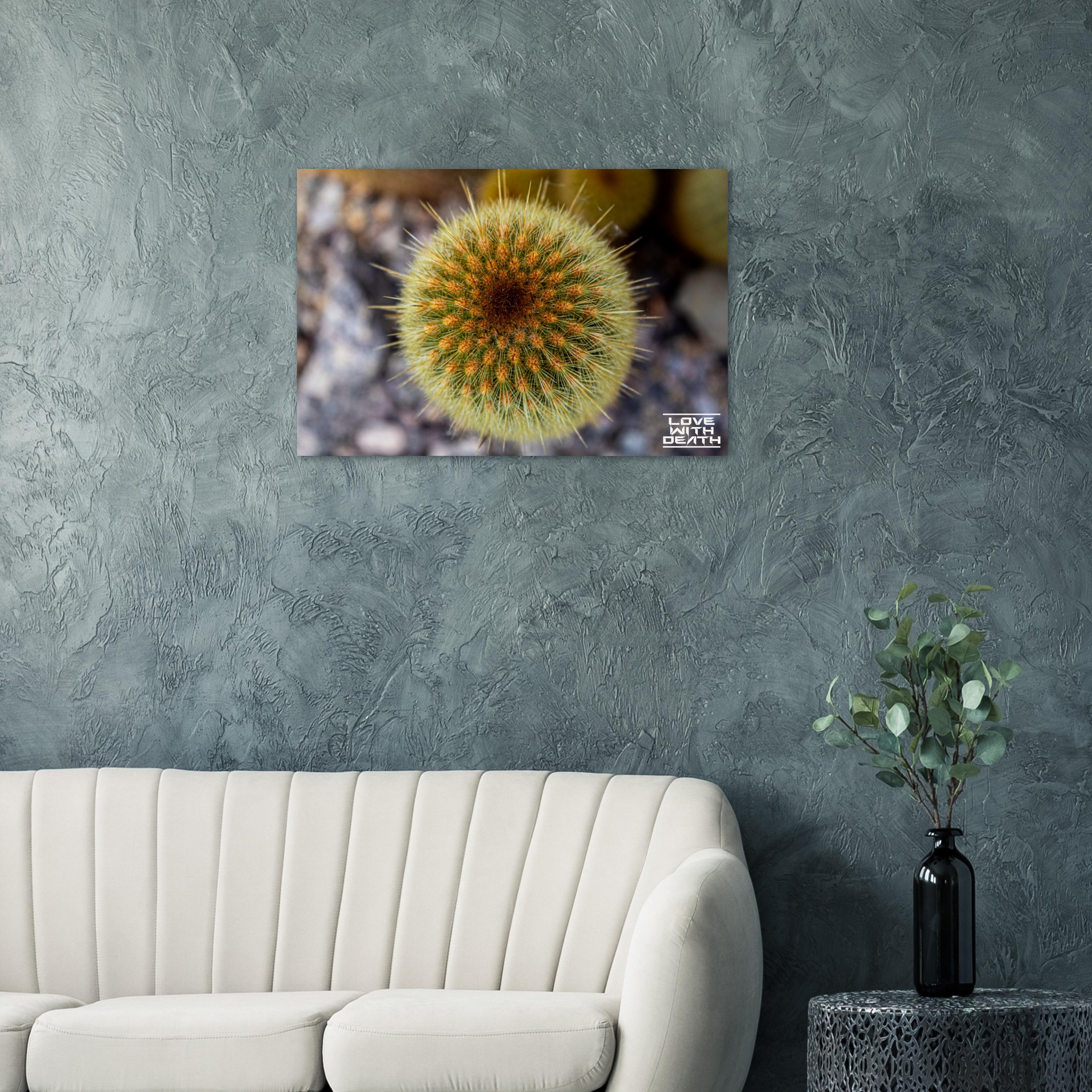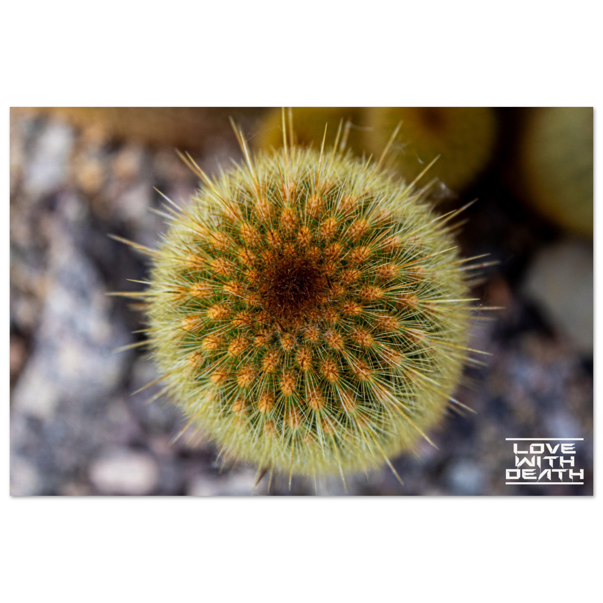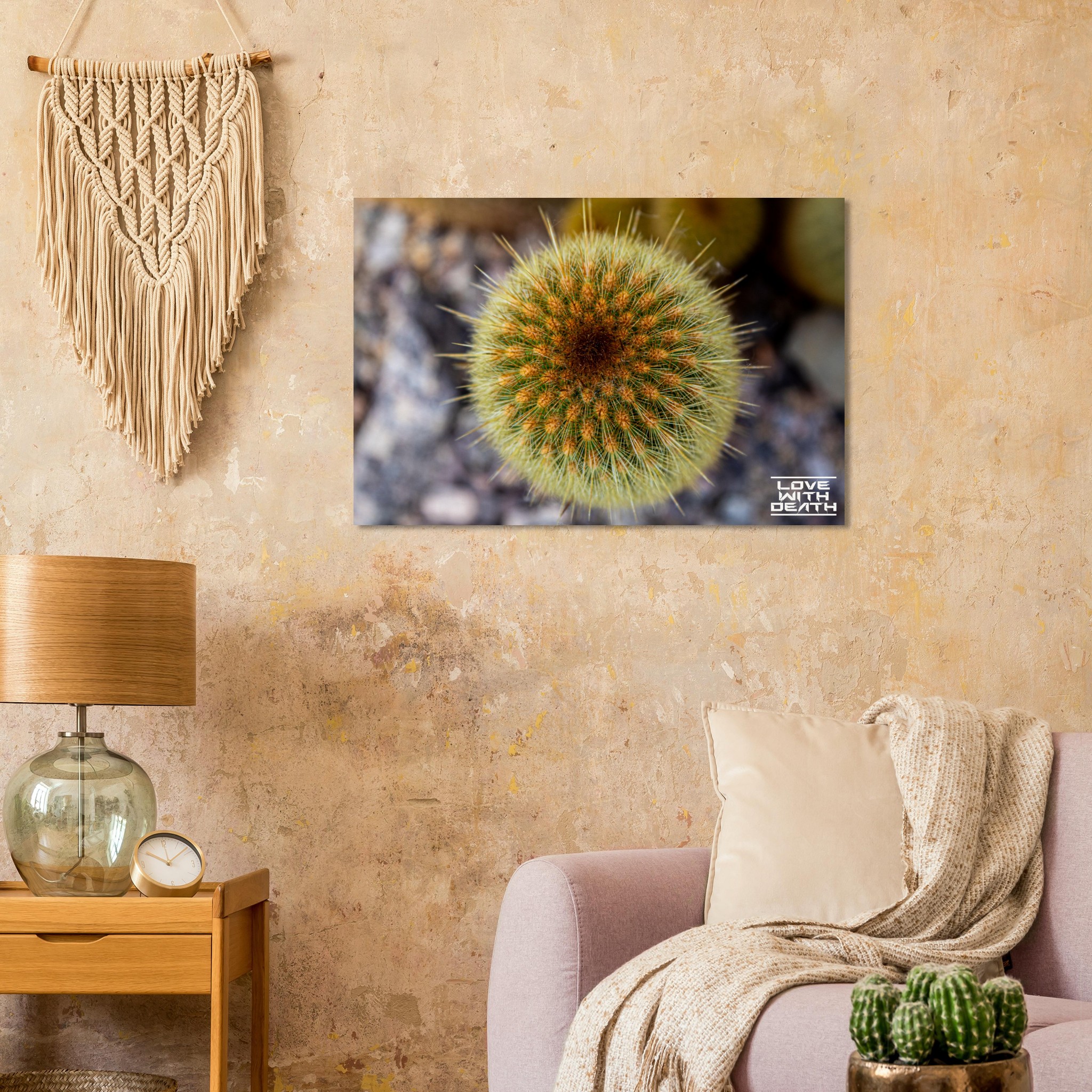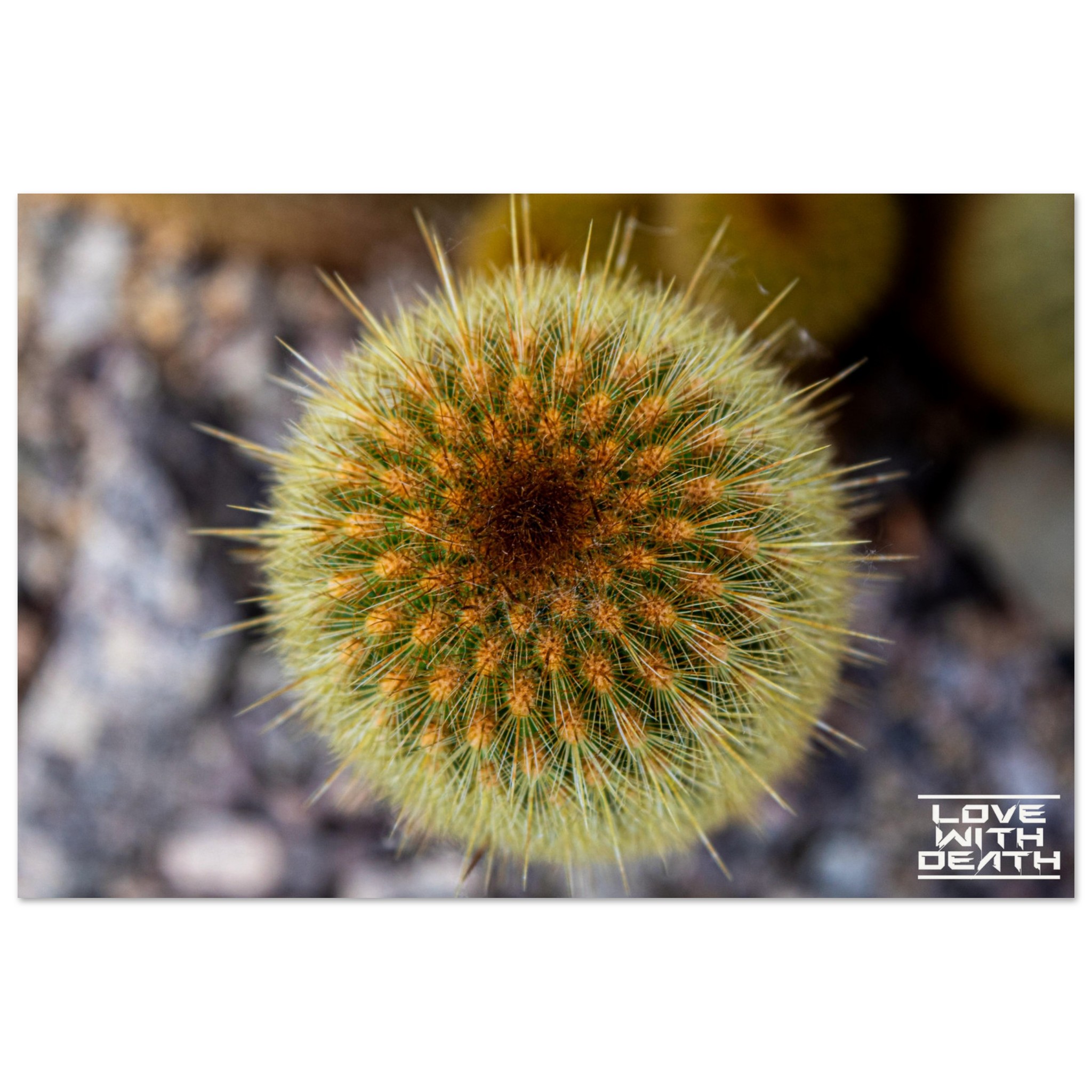 This captivating shot of a spherical cactus highlights the precise and symmetrical arrangement of its spines. Captured from above, the perspective reveals patterns and shapes often hidden in nature. The warm yellow and green hues beautifully contrast with the blurred, earthy background, giving the image a soothing, organic aesthetic.
