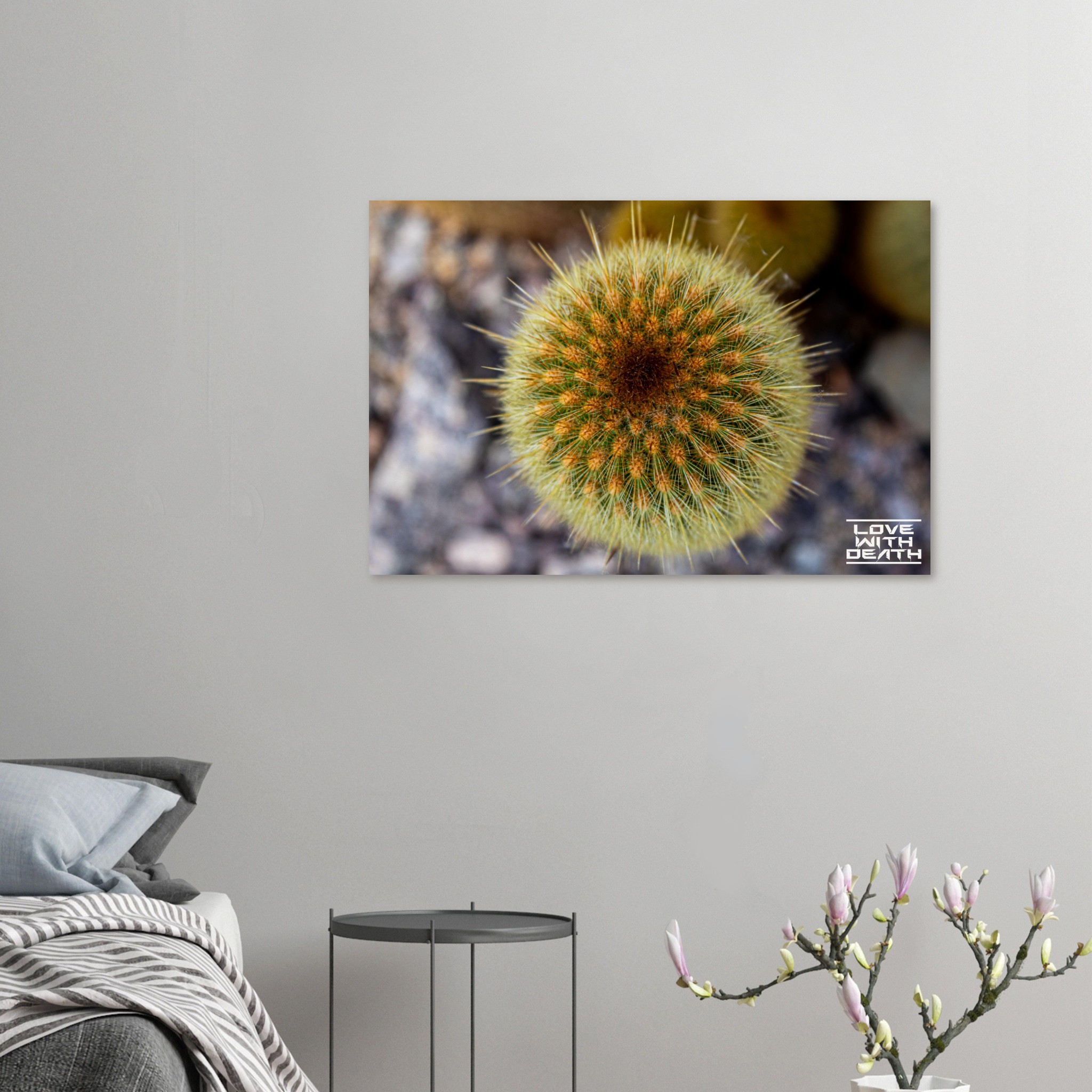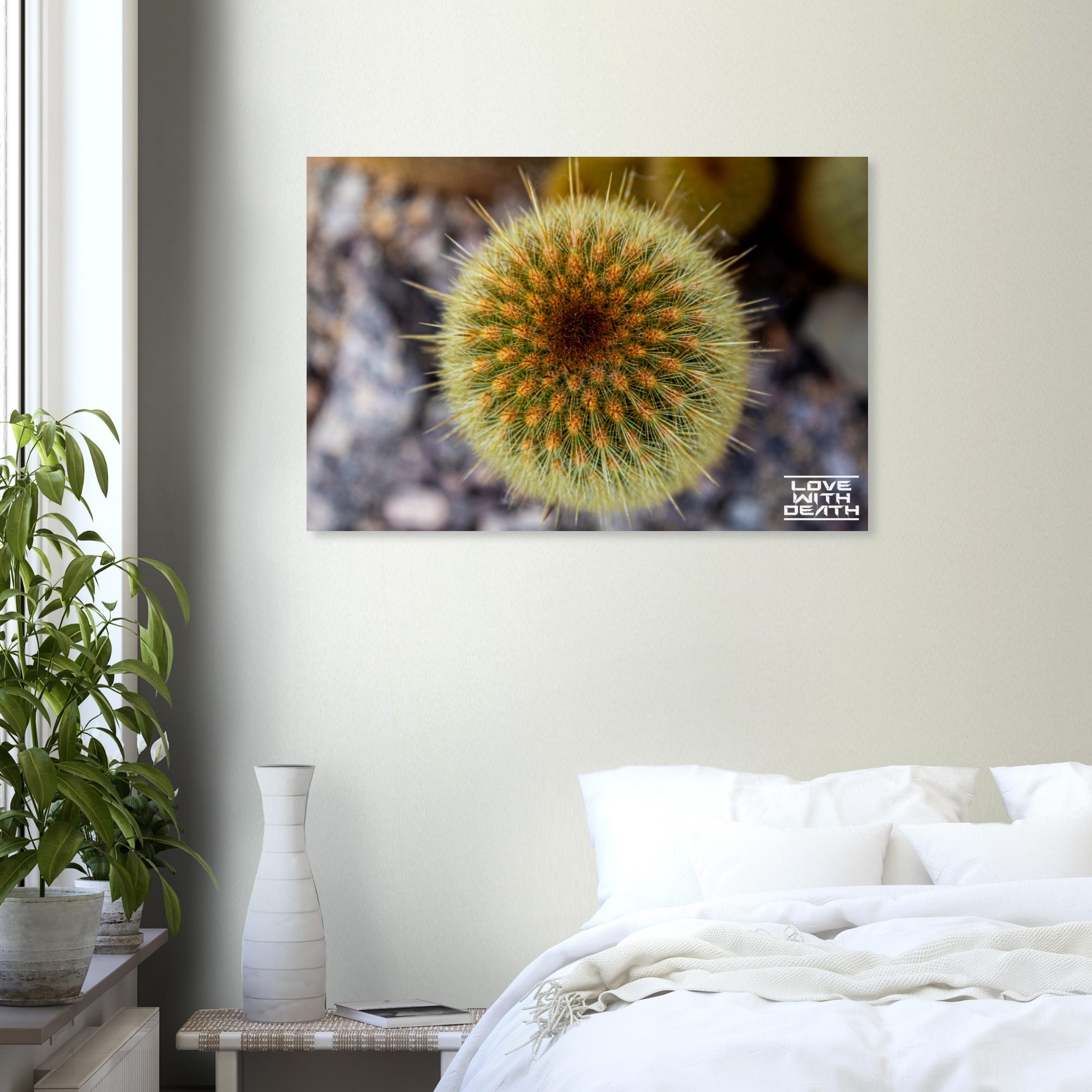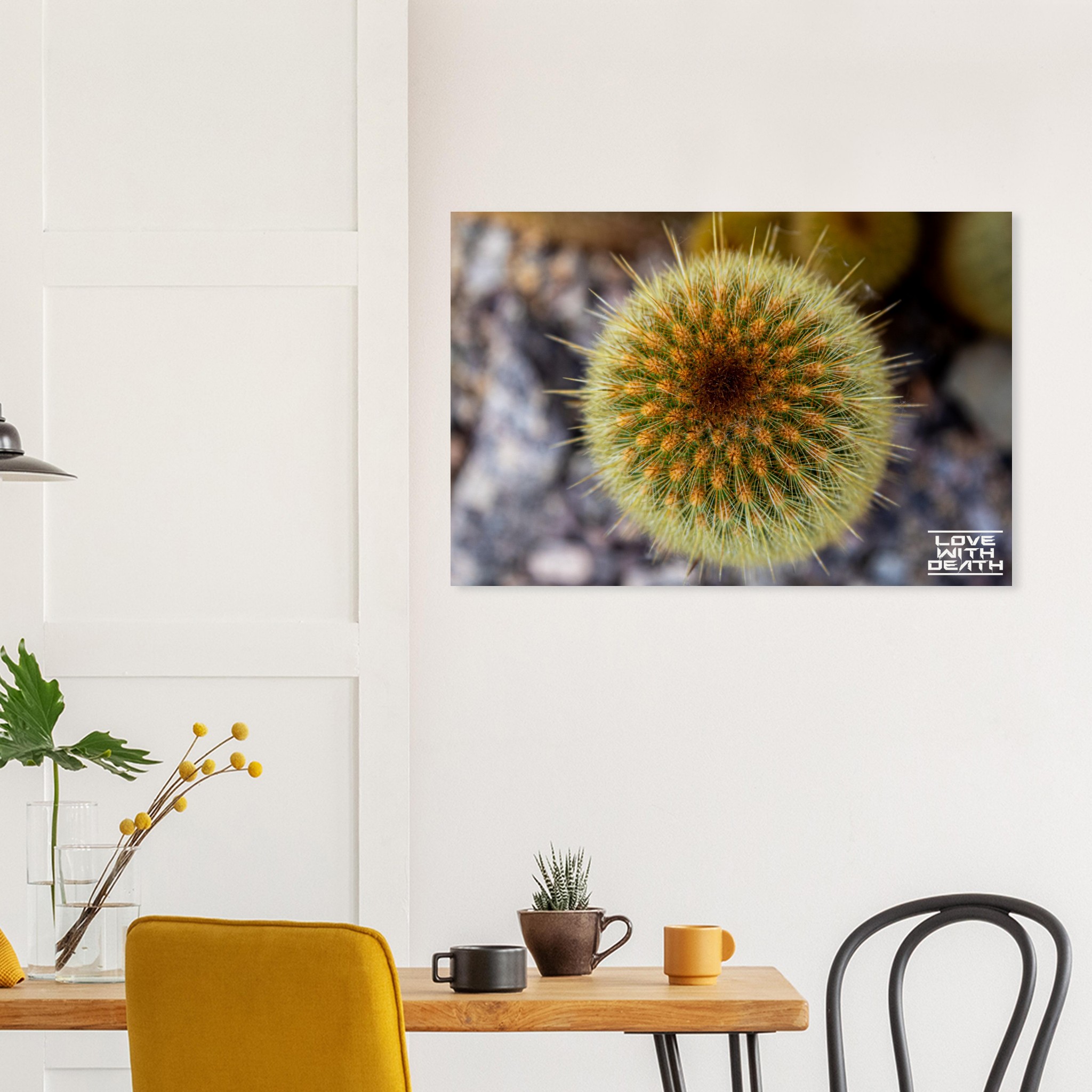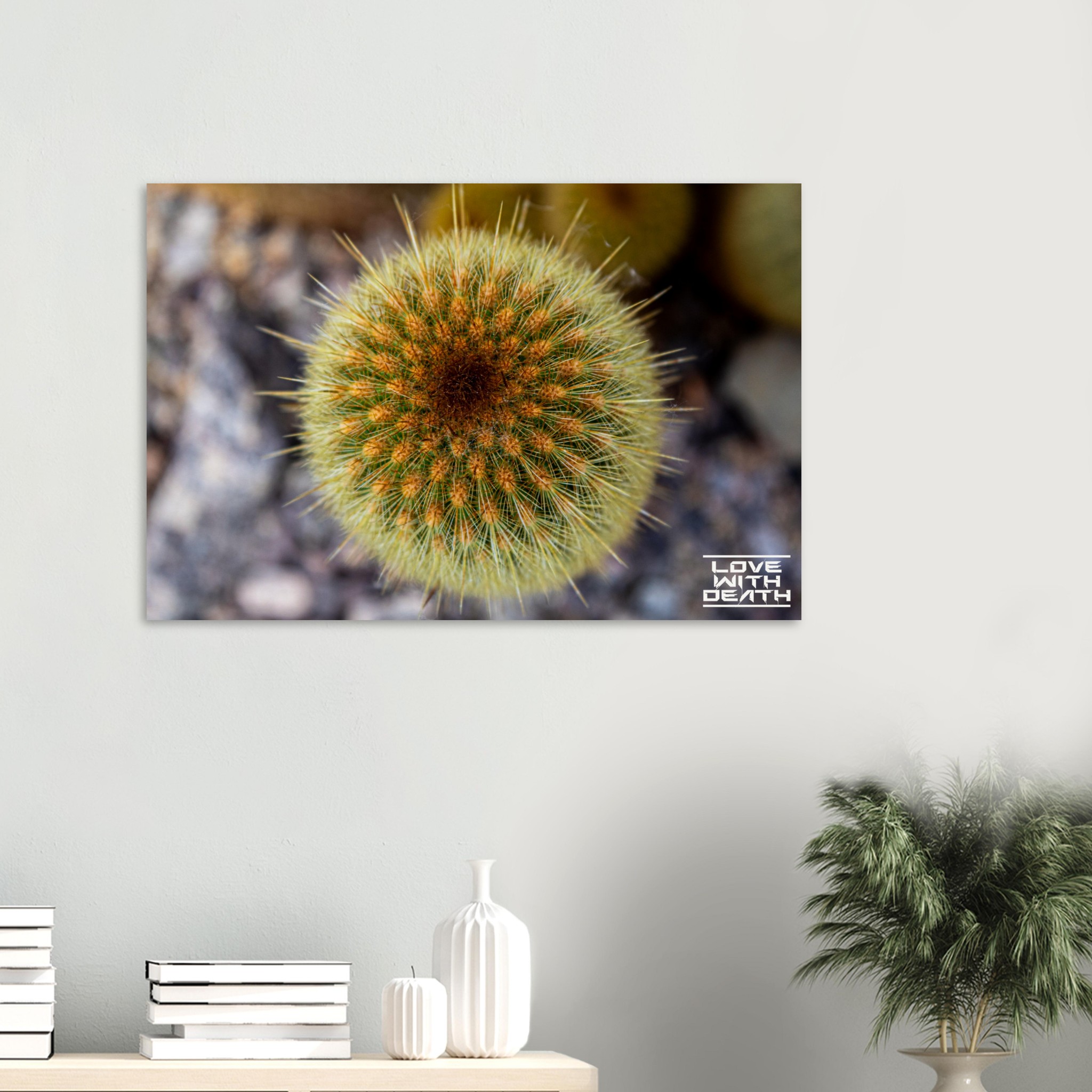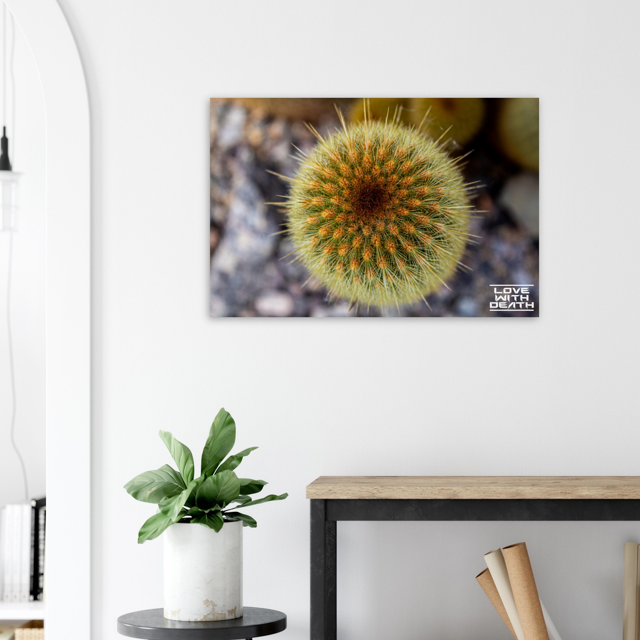 This captivating shot of a spherical cactus highlights the precise and symmetrical arrangement of its spines. Captured from above, the perspective reveals patterns and shapes often hidden in nature. The warm yellow and green hues beautifully contrast with the blurred, earthy background, giving the image a soothing, organic aesthetic.