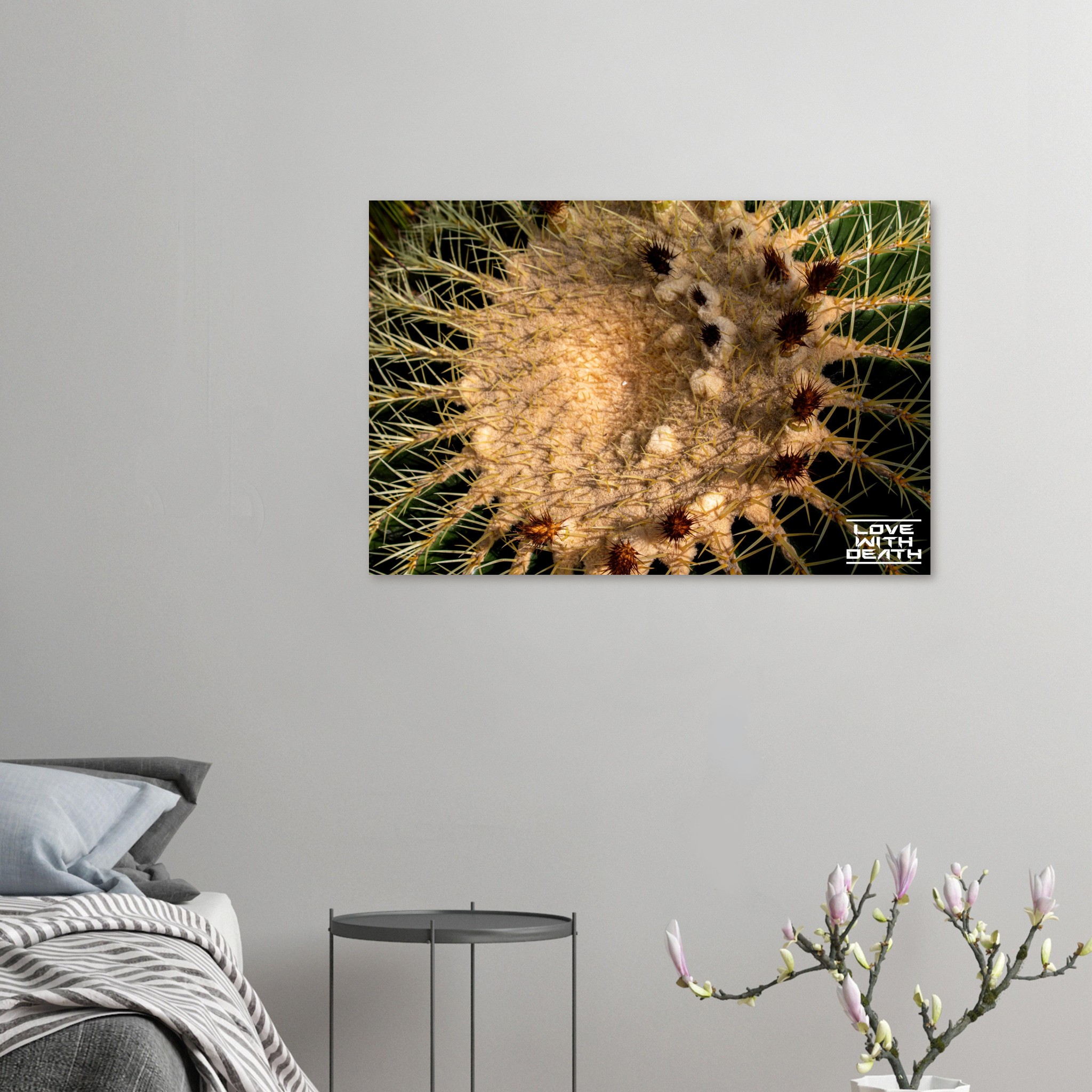 This stunning photograph showcases the intricate and beautiful structure of the “Golden Barrel Cactus” up close. The delicate, golden spines and the velvety center create a harmonious interplay of texture and light. A natural display of strength and adaptation, perfect for plant lovers or art collectors who admire the hidden beauty of nature.