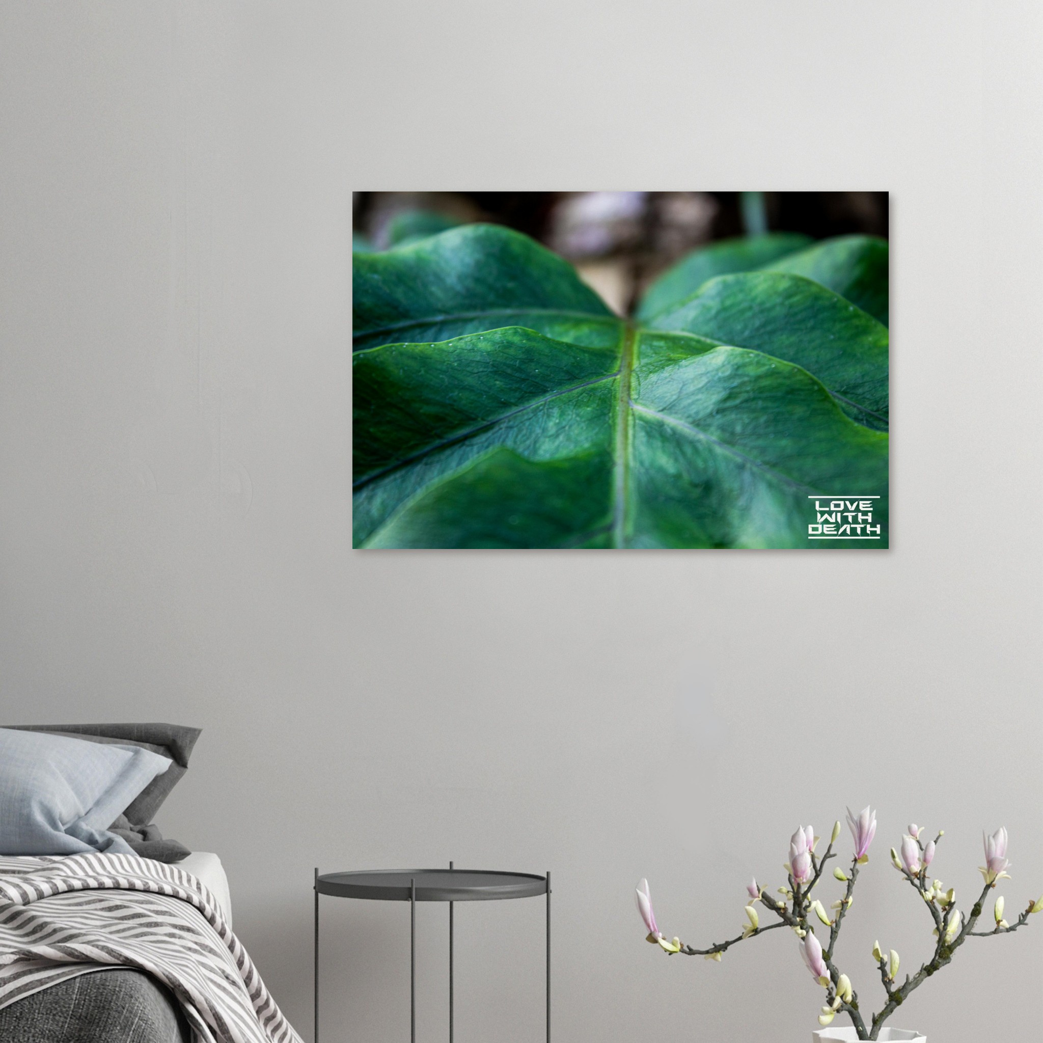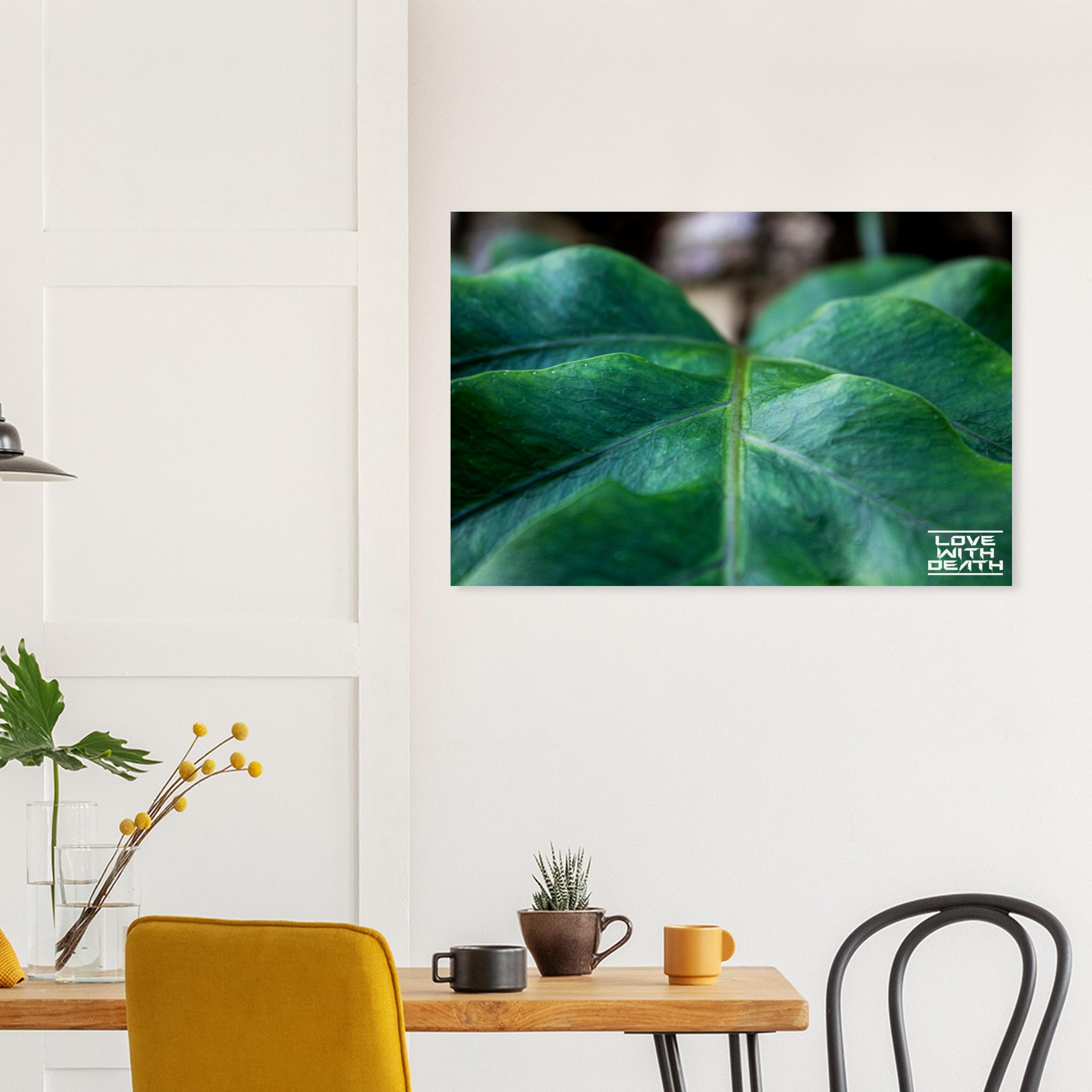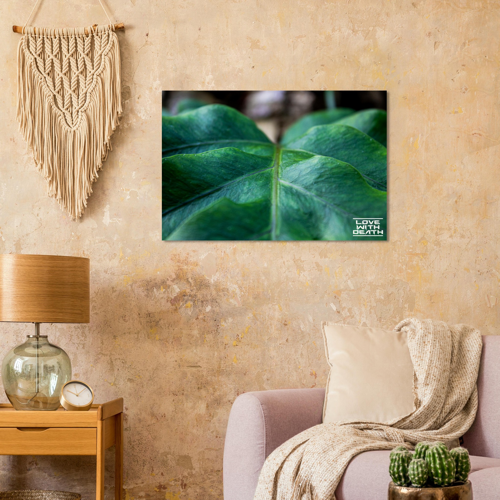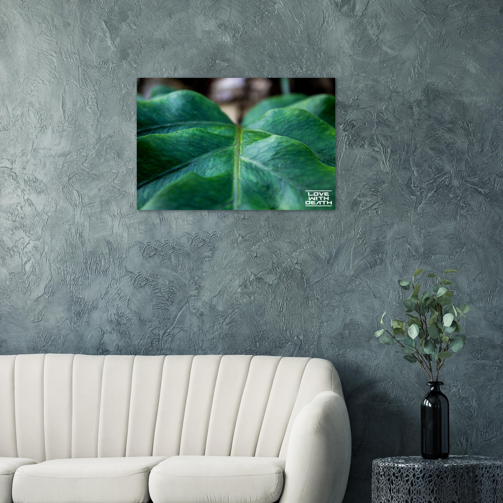 A striking macro shot of a large leaf, capturing the beauty and vitality of nature. The green surface of the leaf reveals fine textures and prominent veins that spread like a network across its surface. The natural light accentuates the wave-like shape of the leaf, making it appear almost three-dimensional.