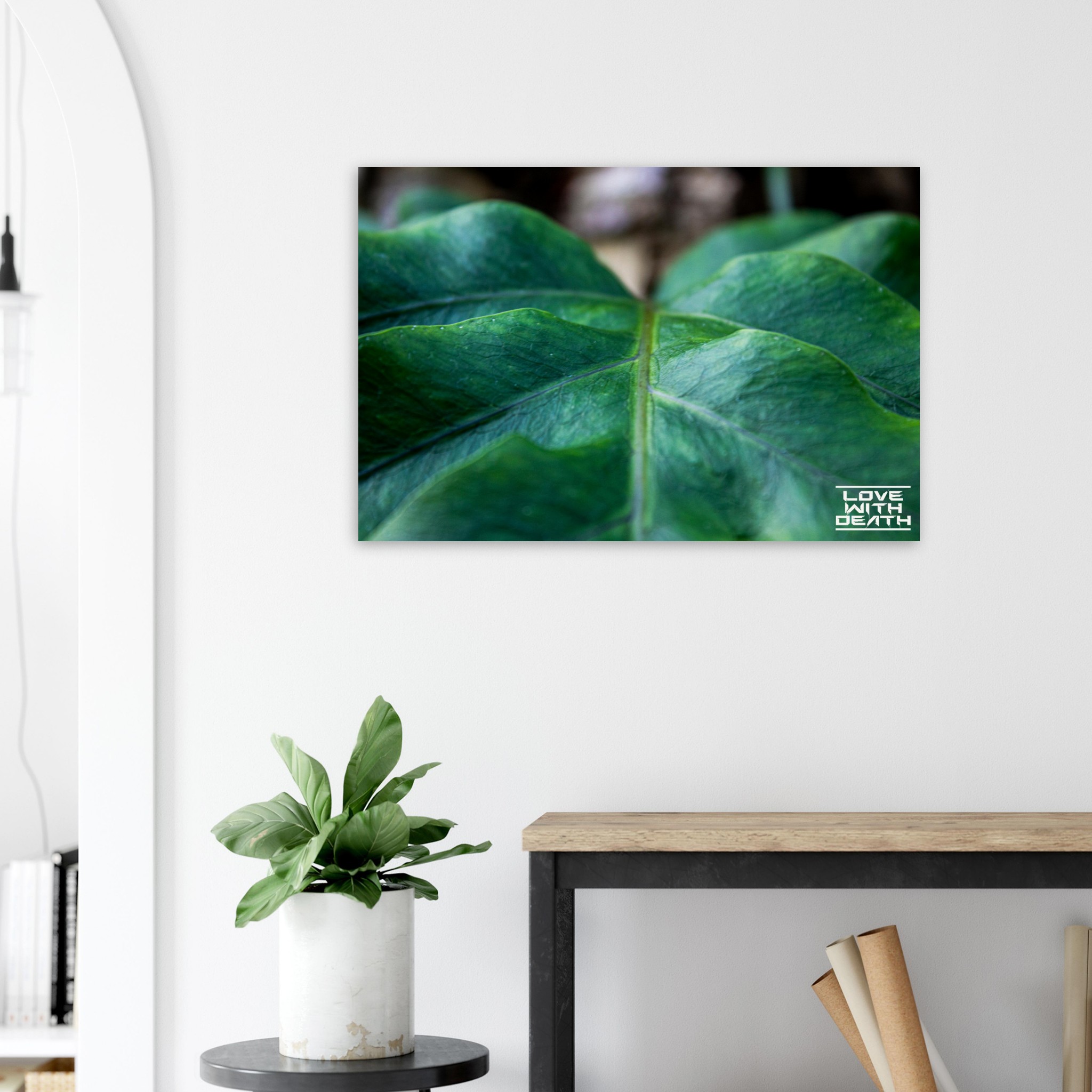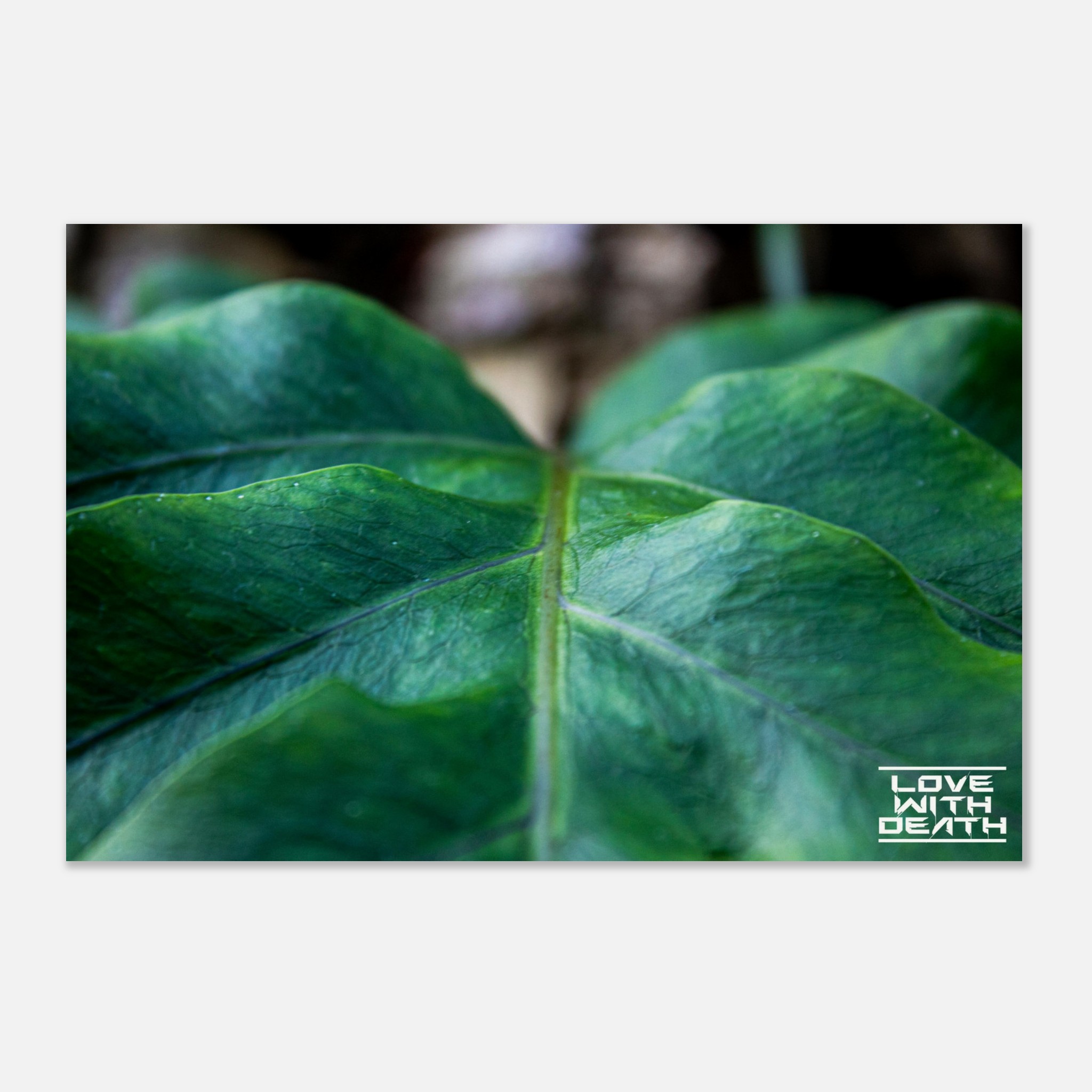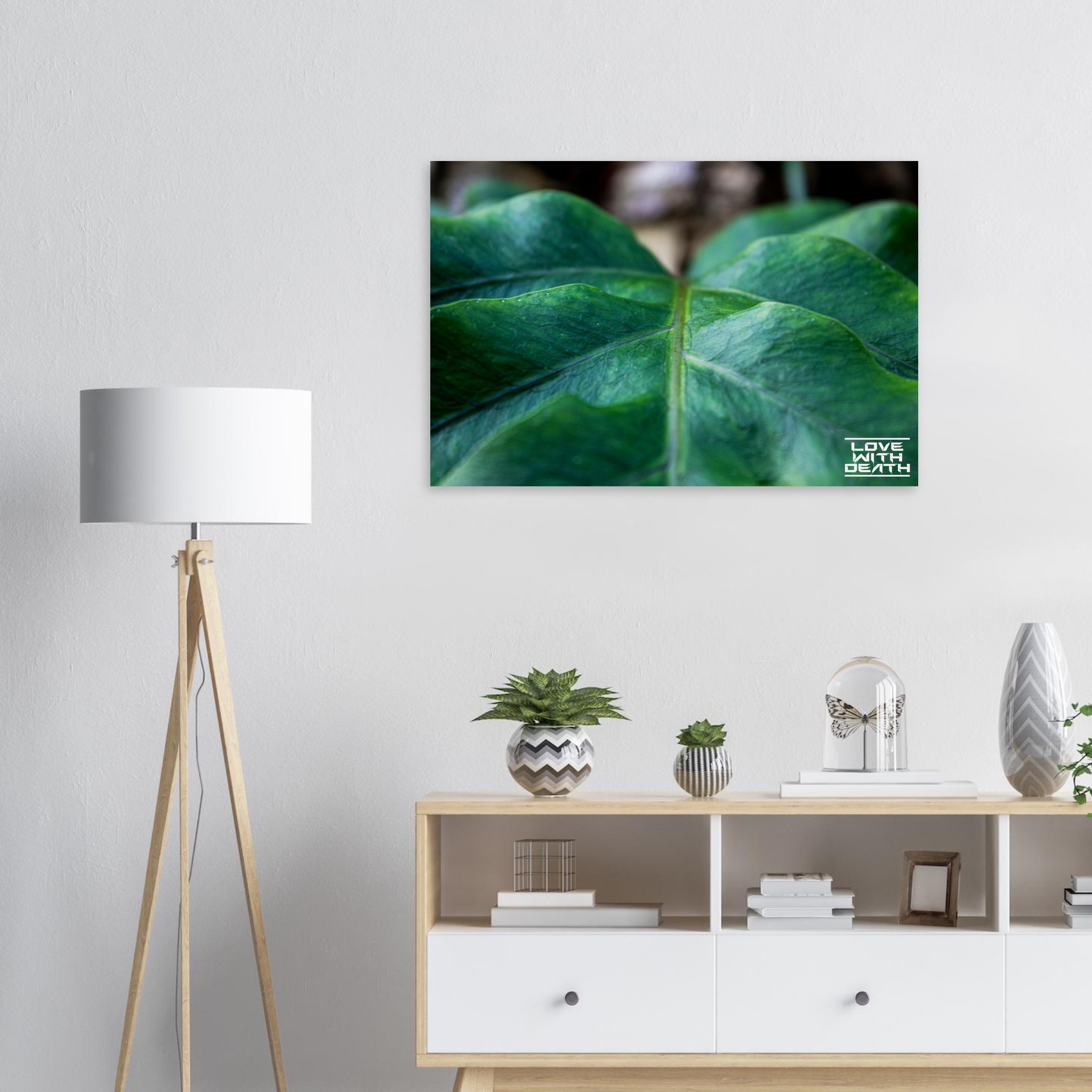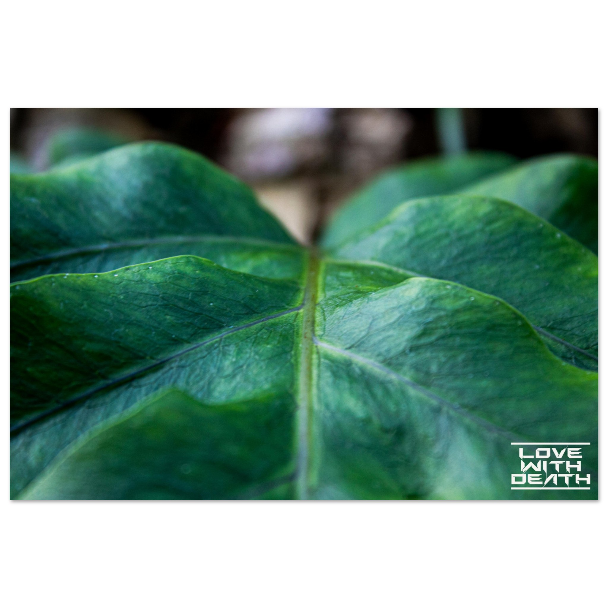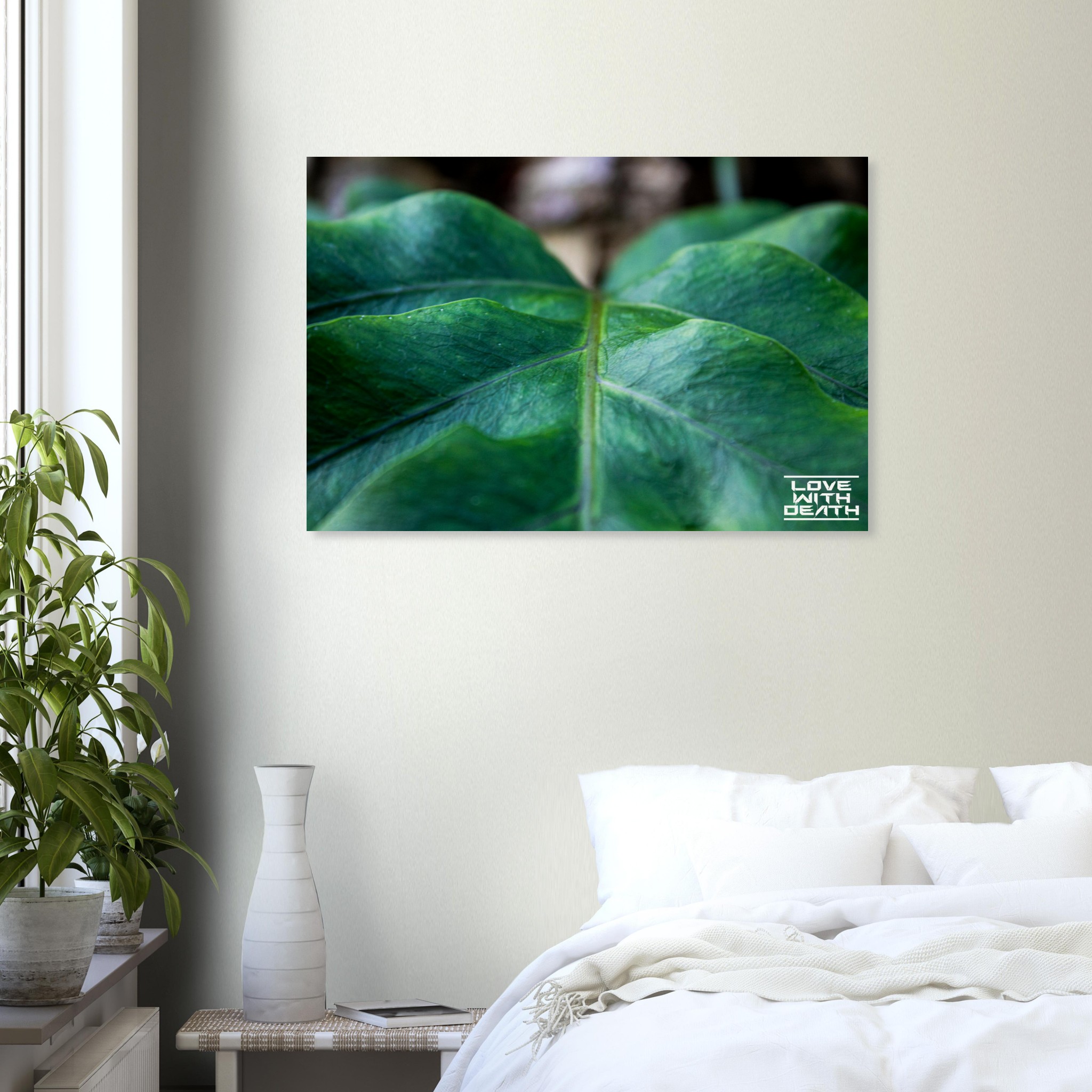 A striking macro shot of a large leaf, capturing the beauty and vitality of nature. The green surface of the leaf reveals fine textures and prominent veins that spread like a network across its surface. The natural light accentuates the wave-like shape of the leaf, making it appear almost three-dimensional.