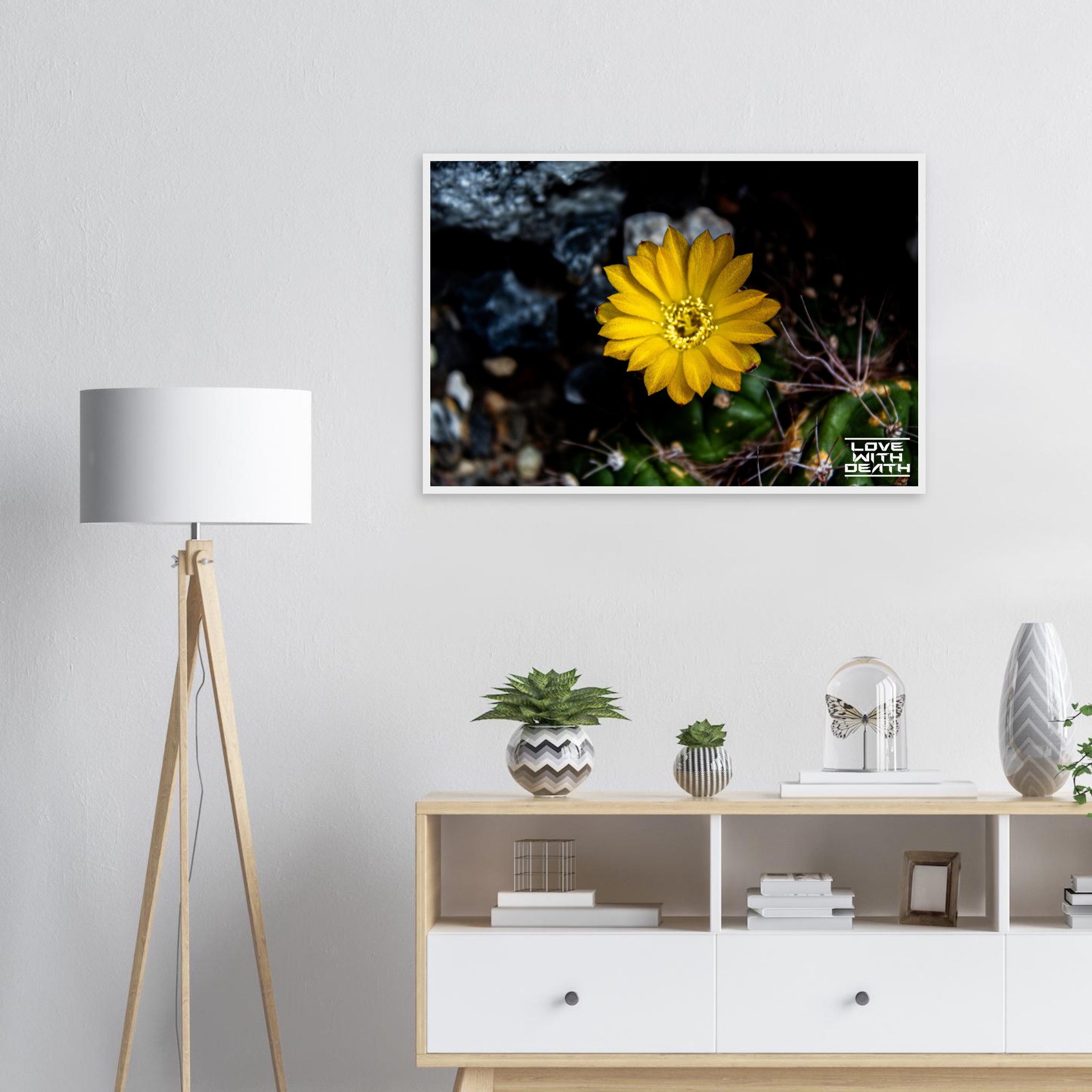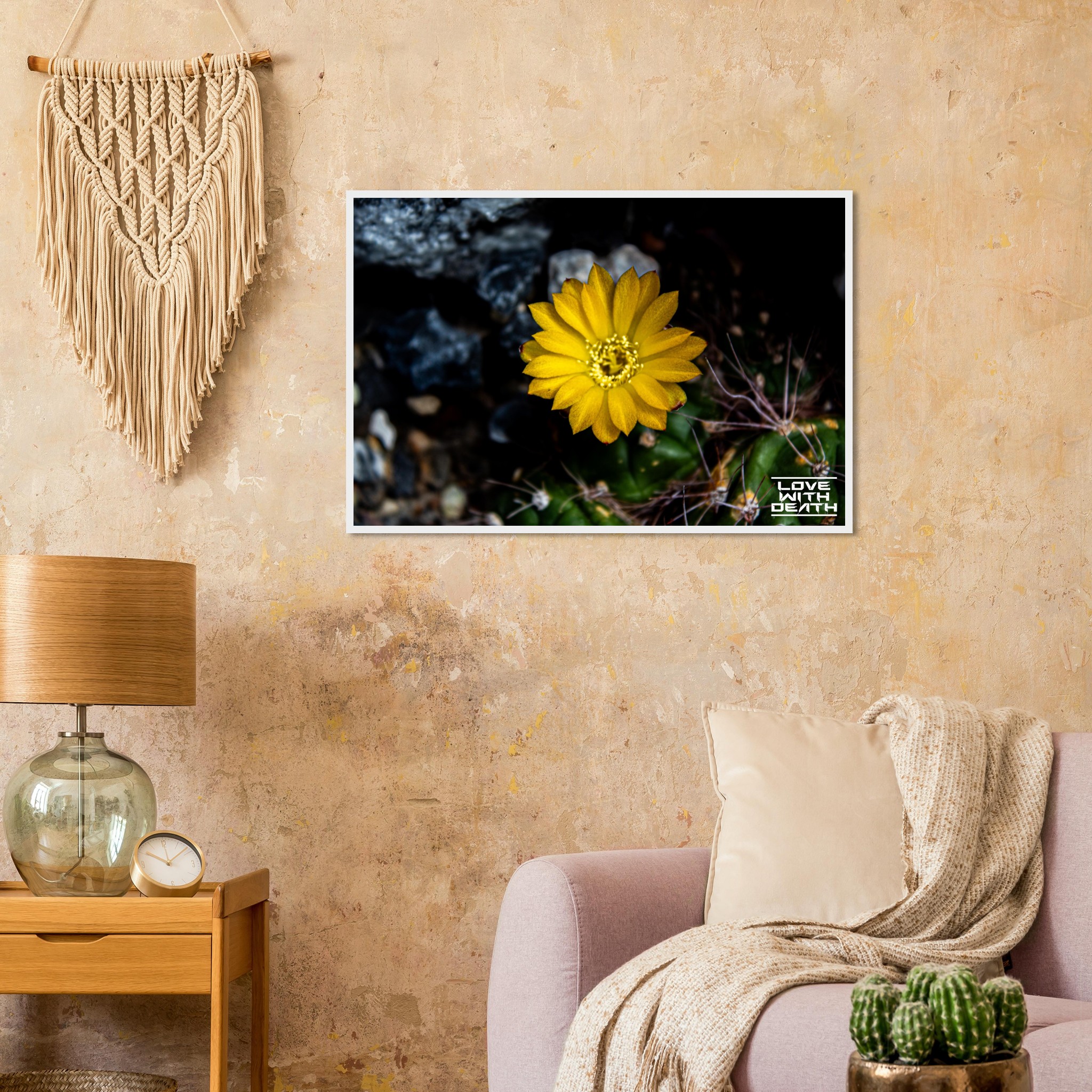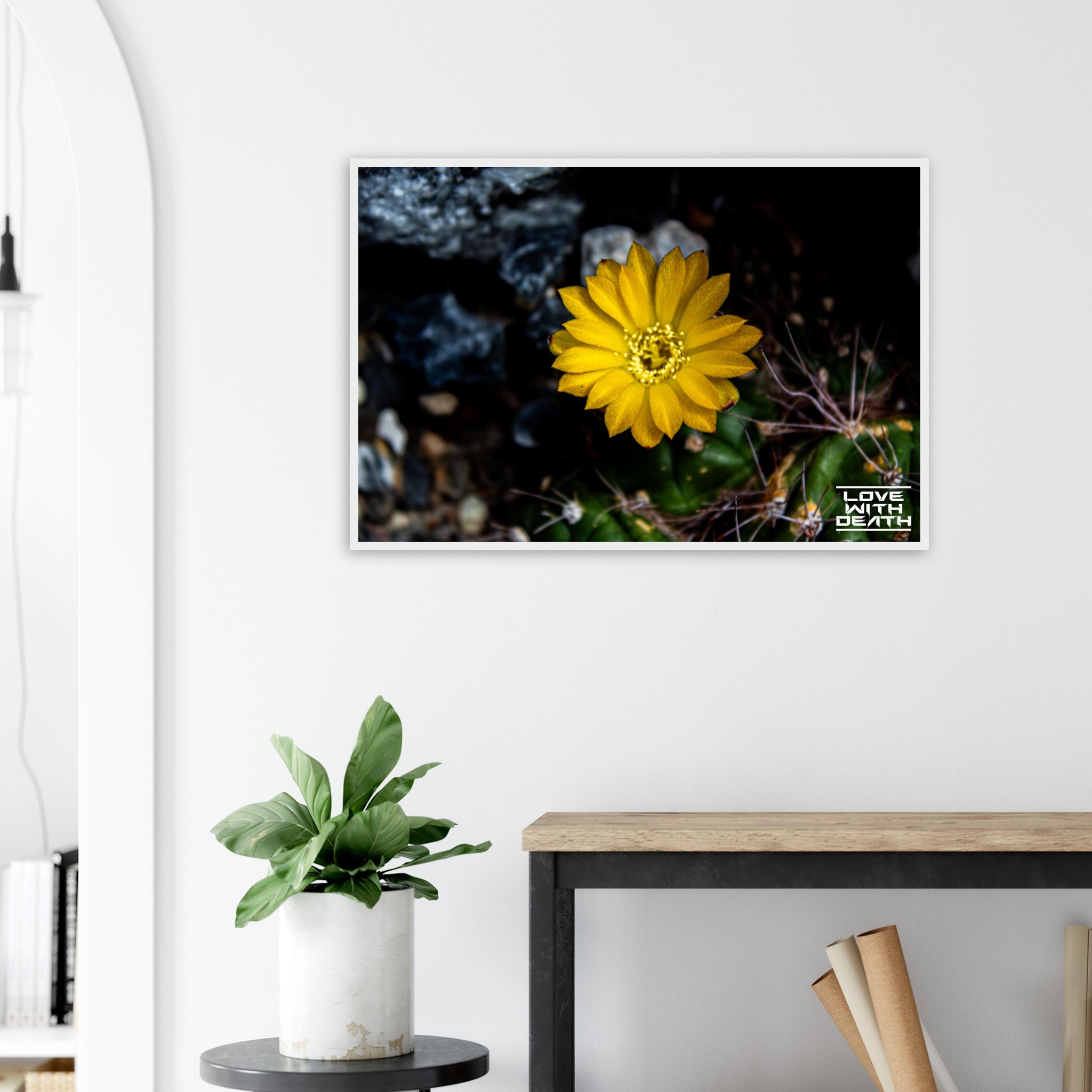 A radiant yellow cactus flower blooms in the midst of a harsh, rocky environment. Its delicate petals shine like a small sunbeam, contrasting with the dark, spiky base of the cactus. A captivating example of nature’s beauty and resilience.
