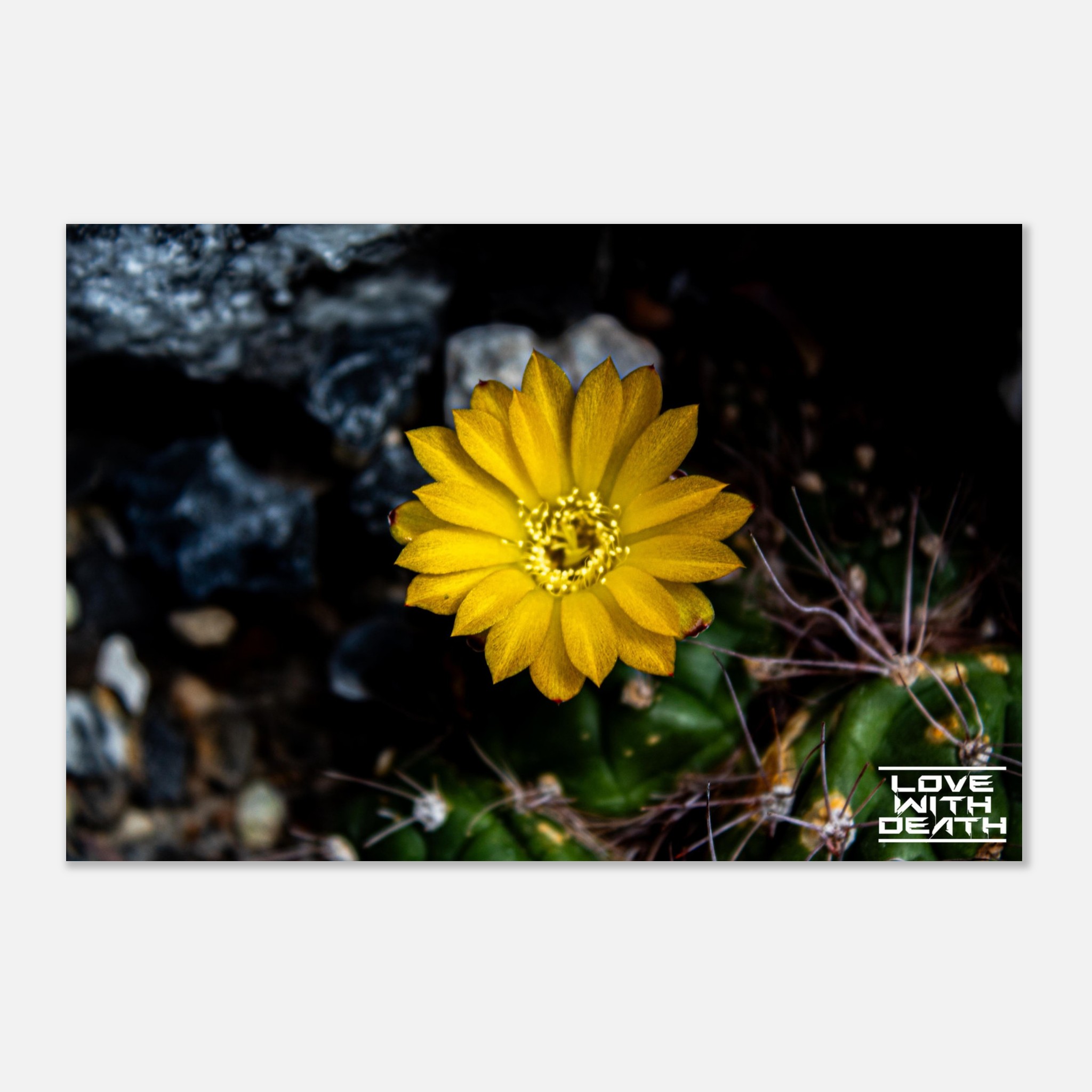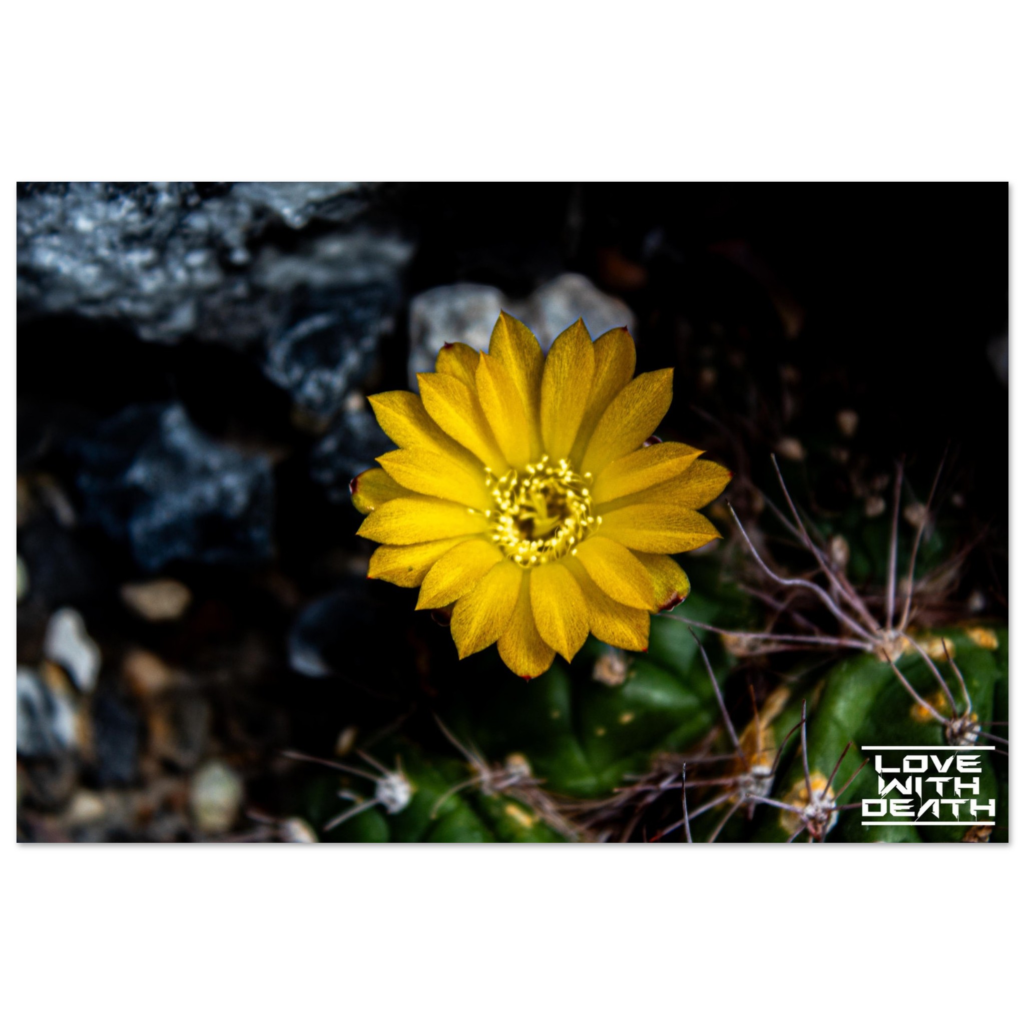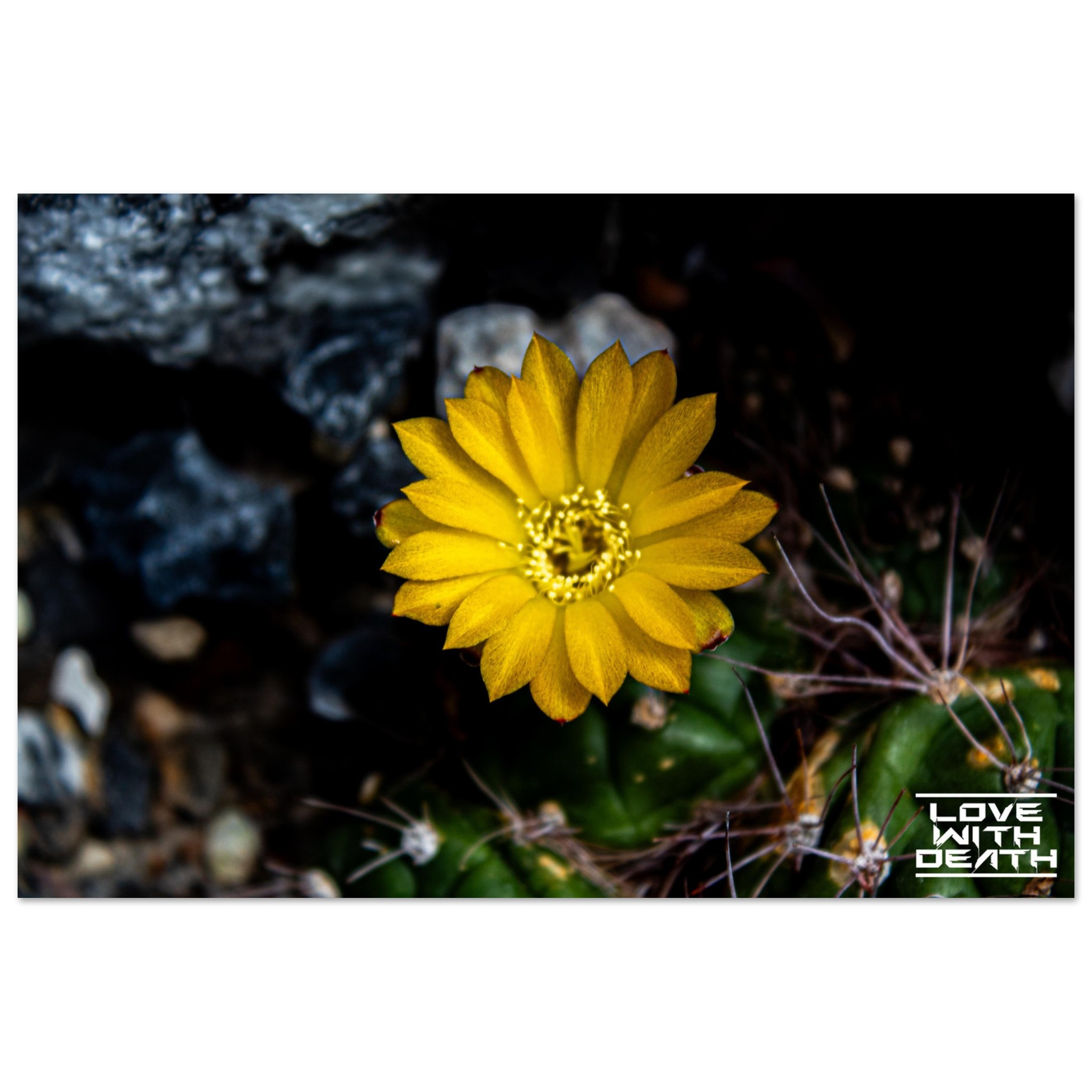 A radiant yellow cactus flower blooms in the midst of a harsh, rocky environment. Its delicate petals shine like a small sunbeam, contrasting with the dark, spiky base of the cactus. A captivating example of nature’s beauty and resilience.
