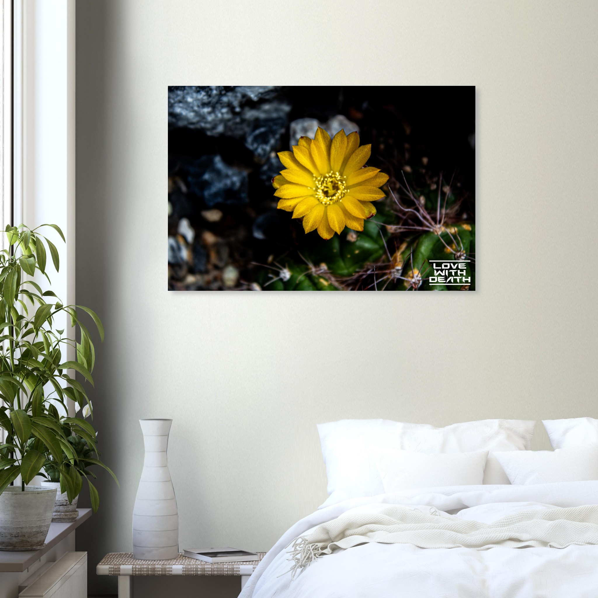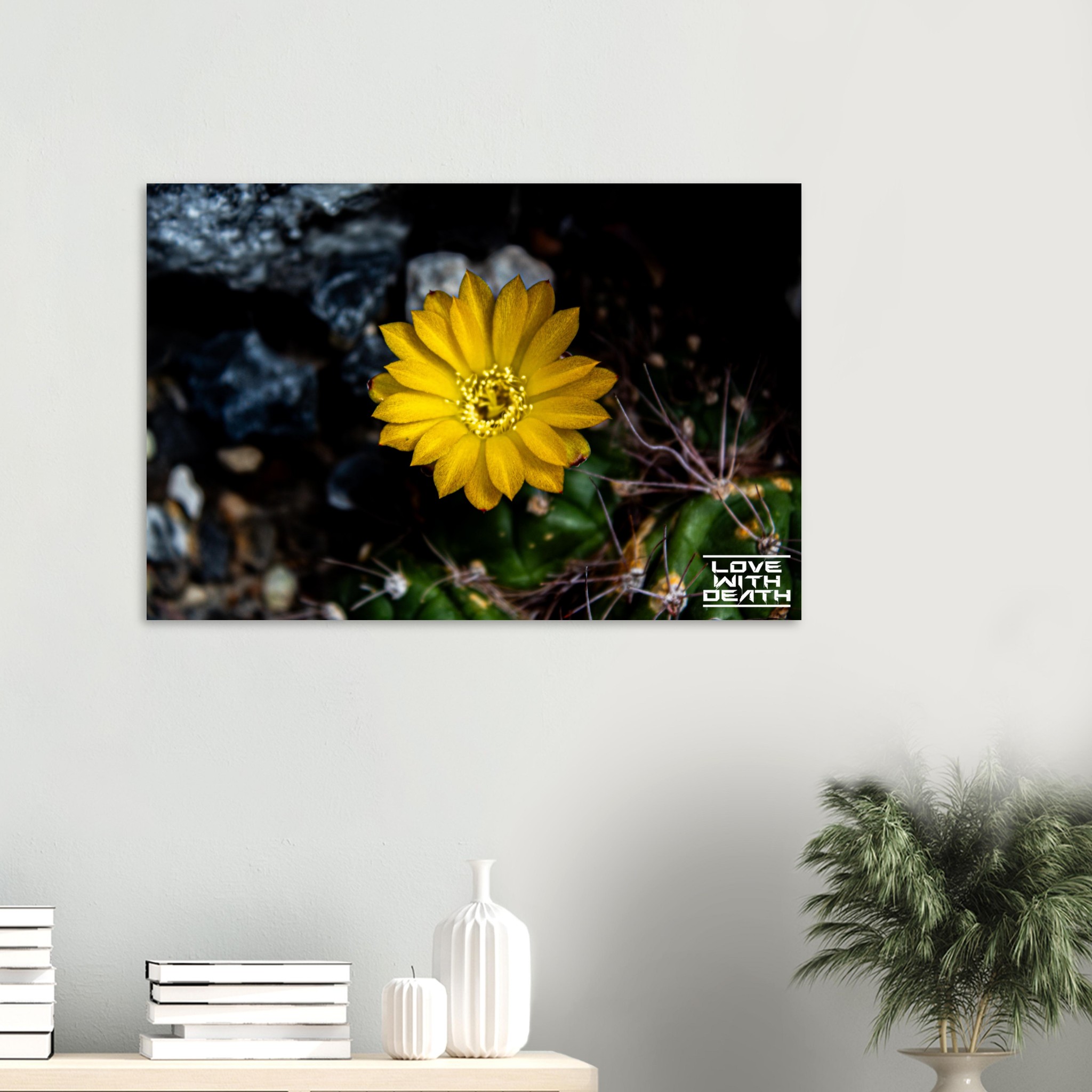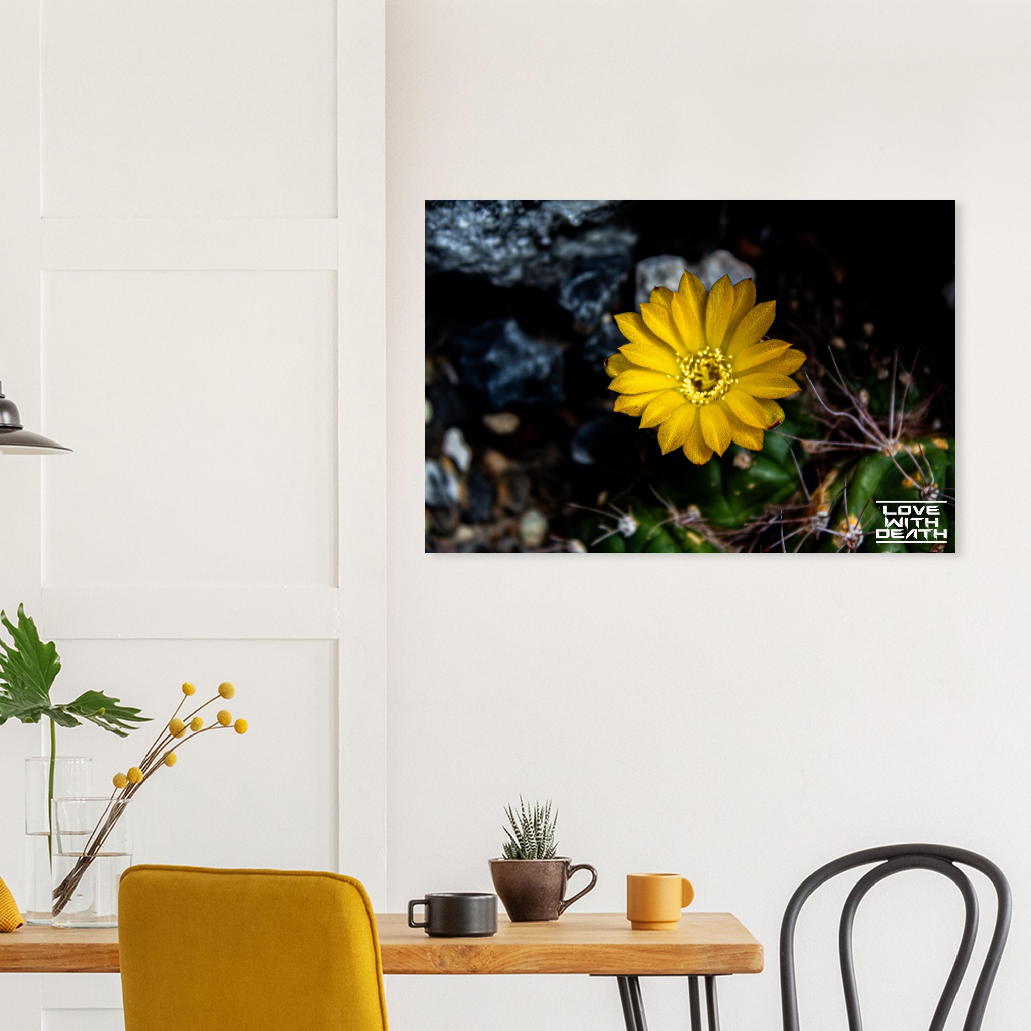A radiant yellow cactus flower blooms in the midst of a harsh, rocky environment. Its delicate petals shine like a small sunbeam, contrasting with the dark, spiky base of the cactus. A captivating example of nature’s beauty and resilience.