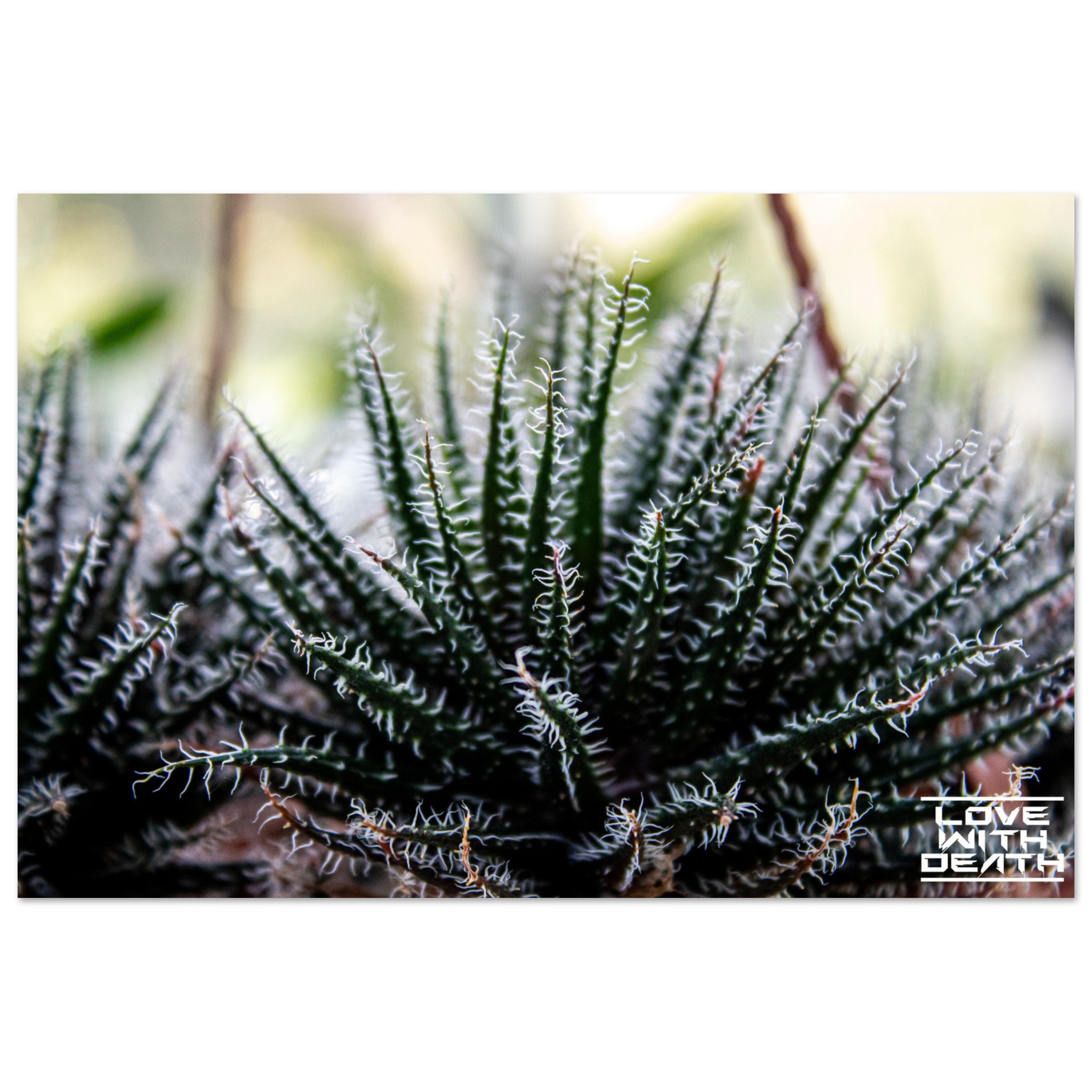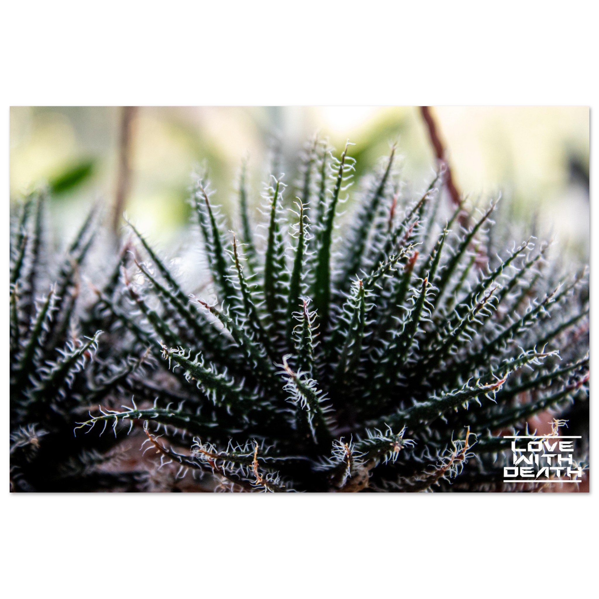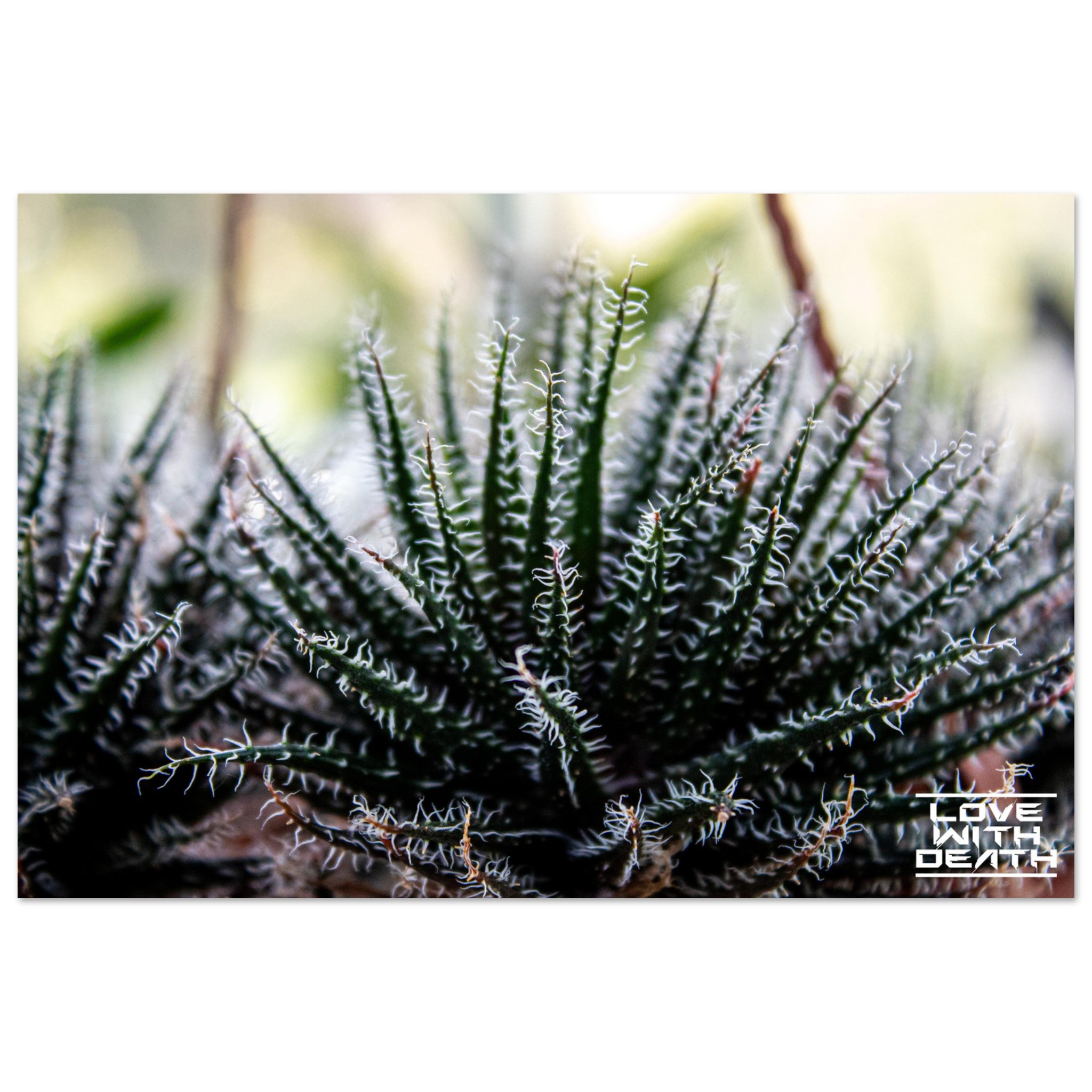 This stunning close-up highlights the captivating structure of a desert plant, likely a Haworthia or Aloe variety. The dark green leaves are lined with delicate, white thread-like structures that twist like tiny spirals along the edges. The sharp focus brings out the incredible details and angular form of the plant, while the background fades into soft, muted hues.