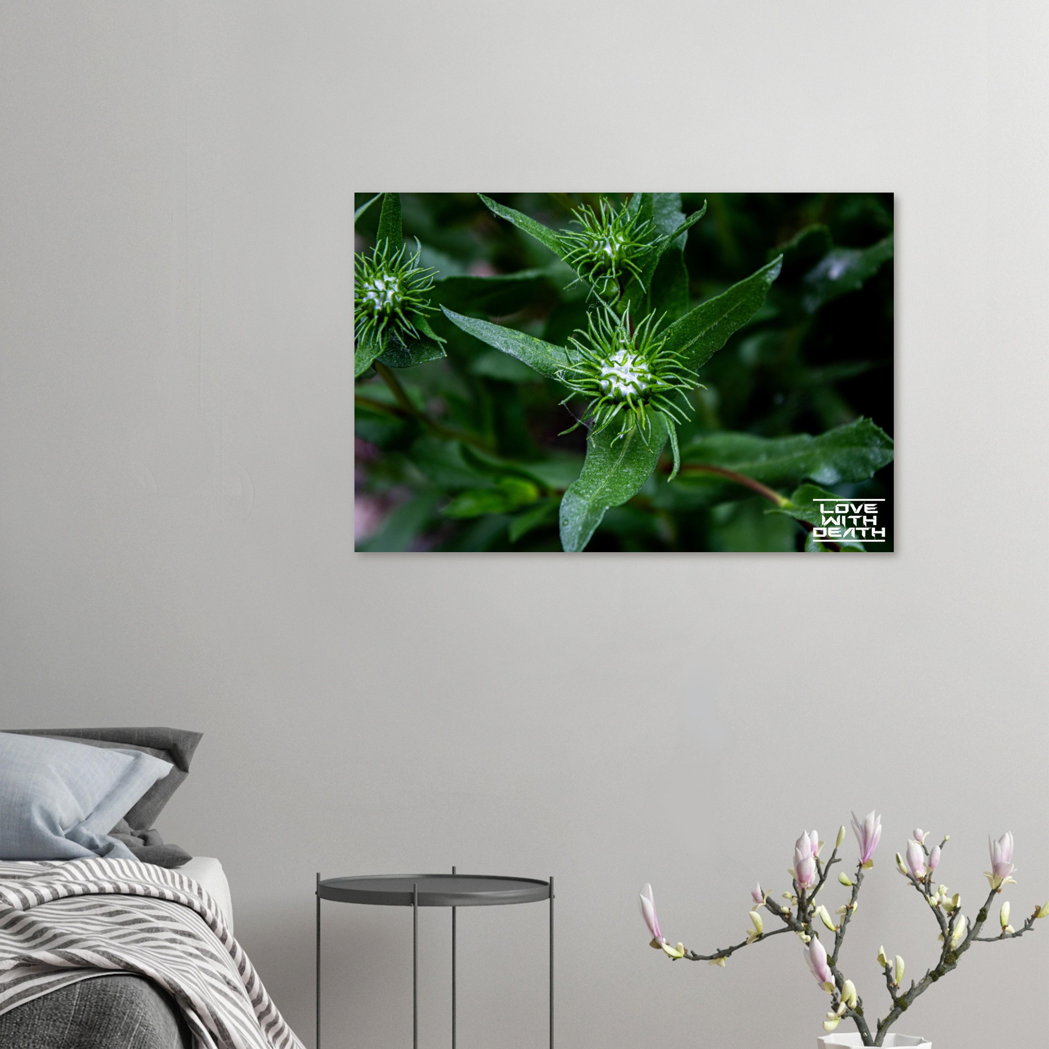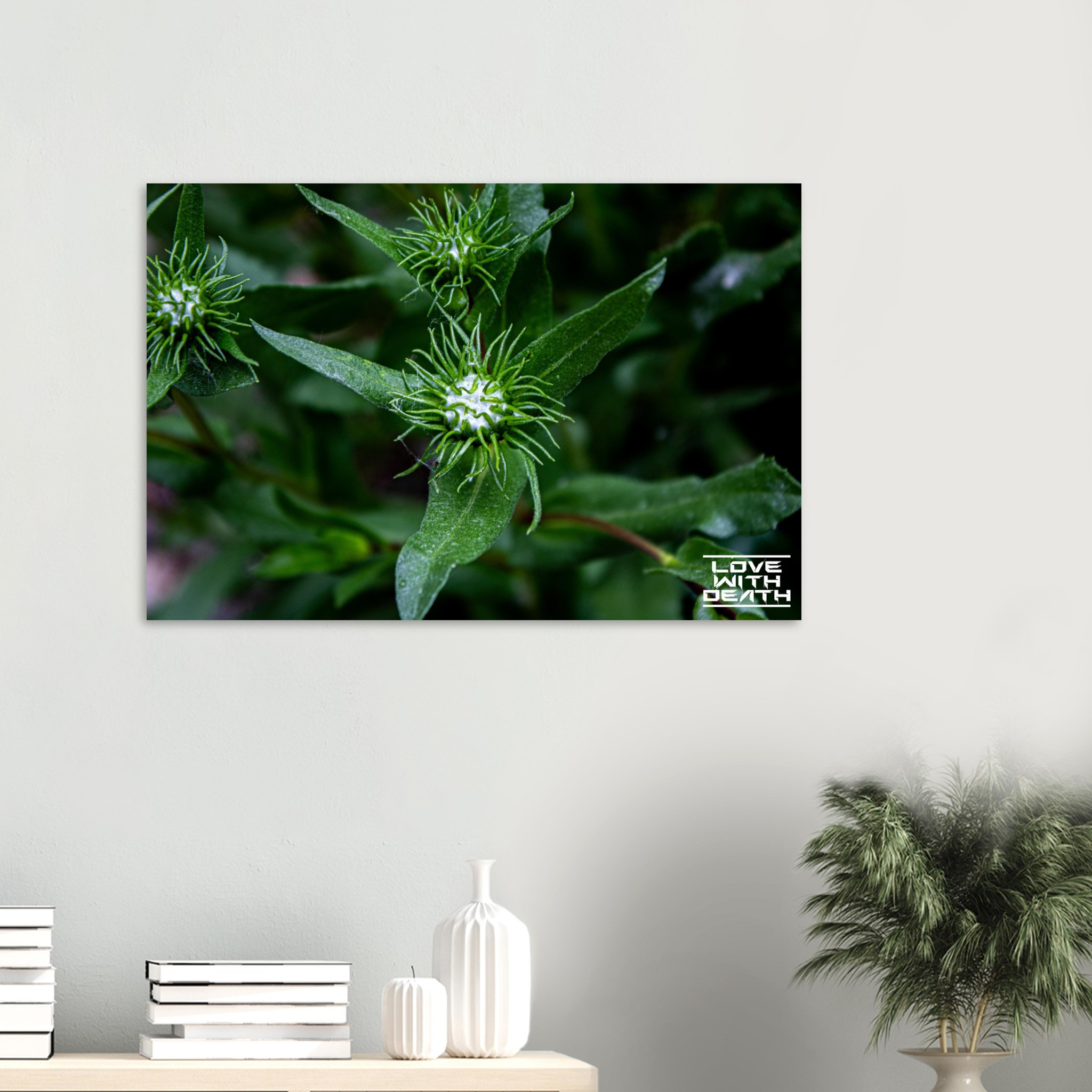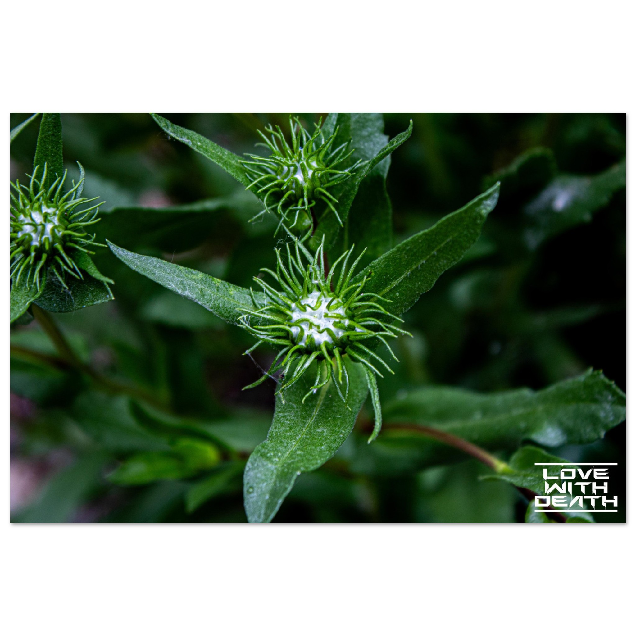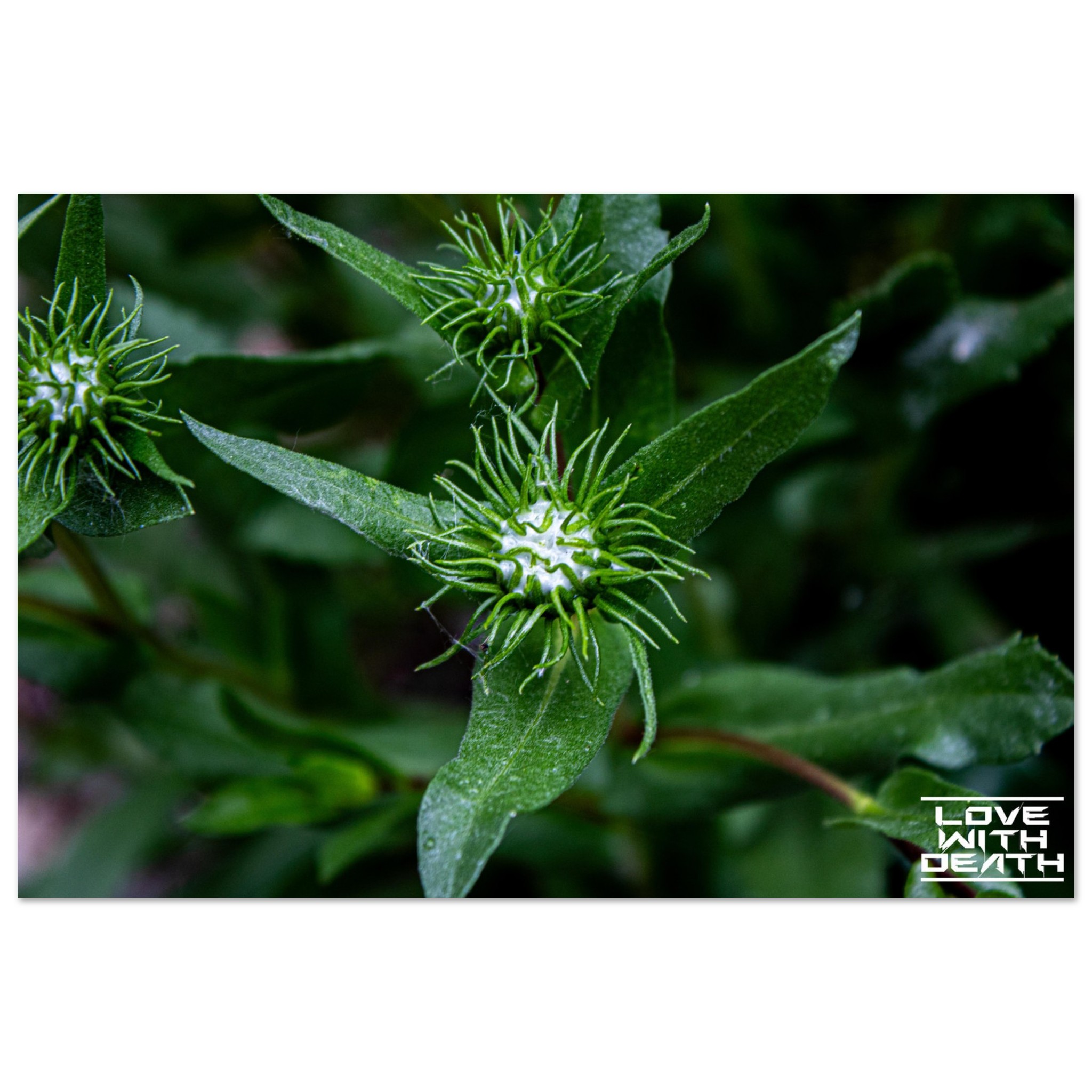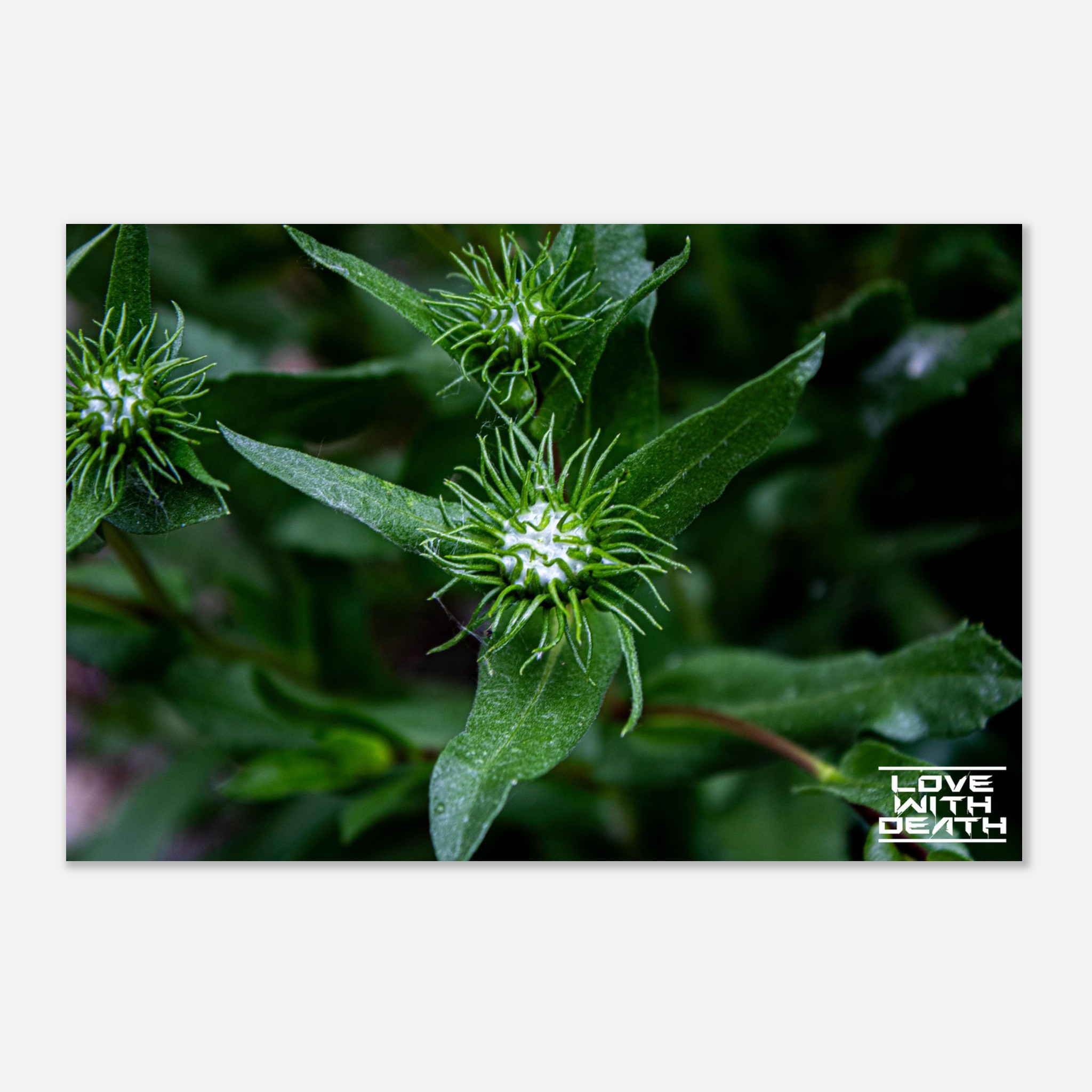 This macro shot highlights the fascinating structure of green plant buds surrounded by symmetrical, spiked leaf-like extensions. The soft green tones in the background enhance the focus on the intricate details of the buds, evoking a sense of calm and natural harmony.