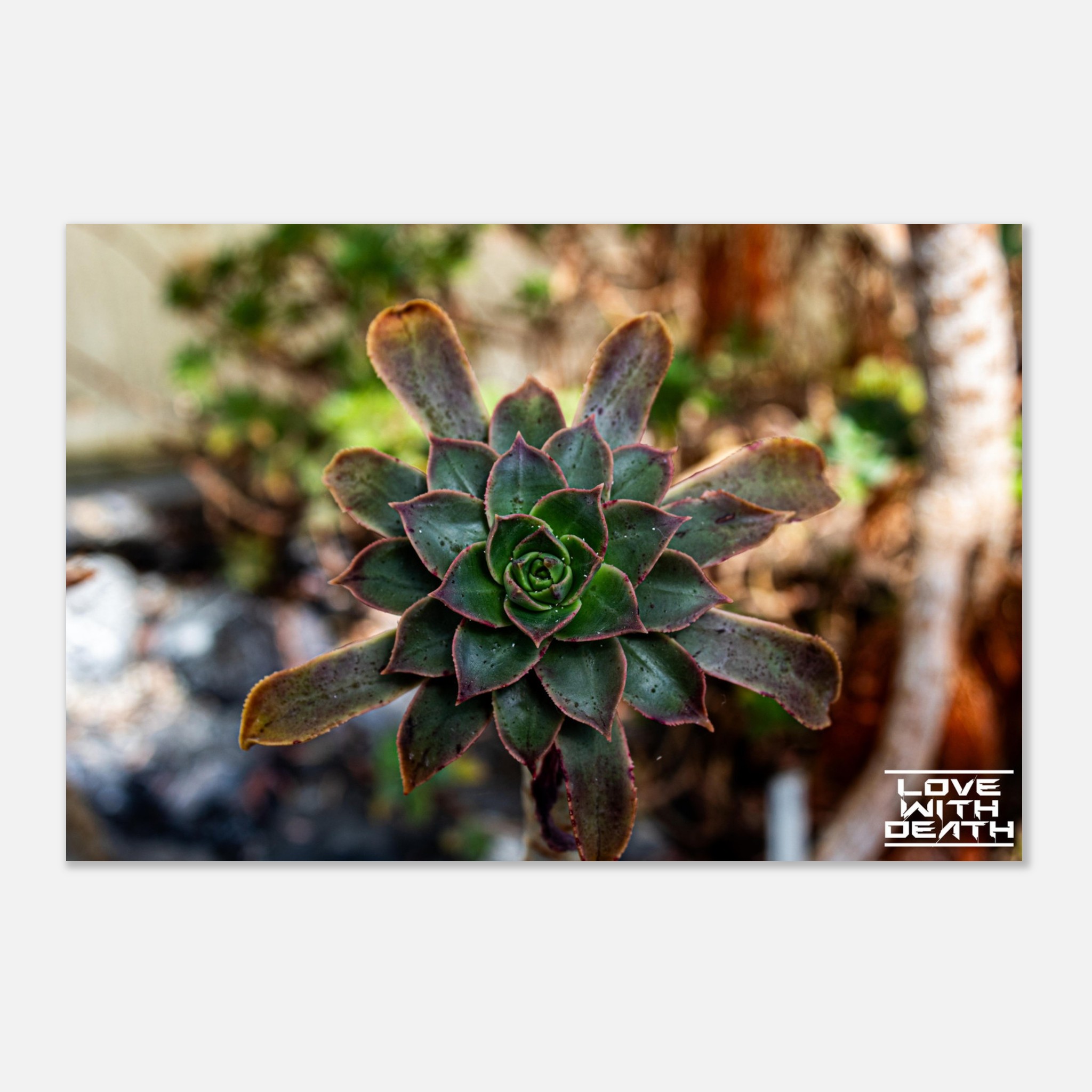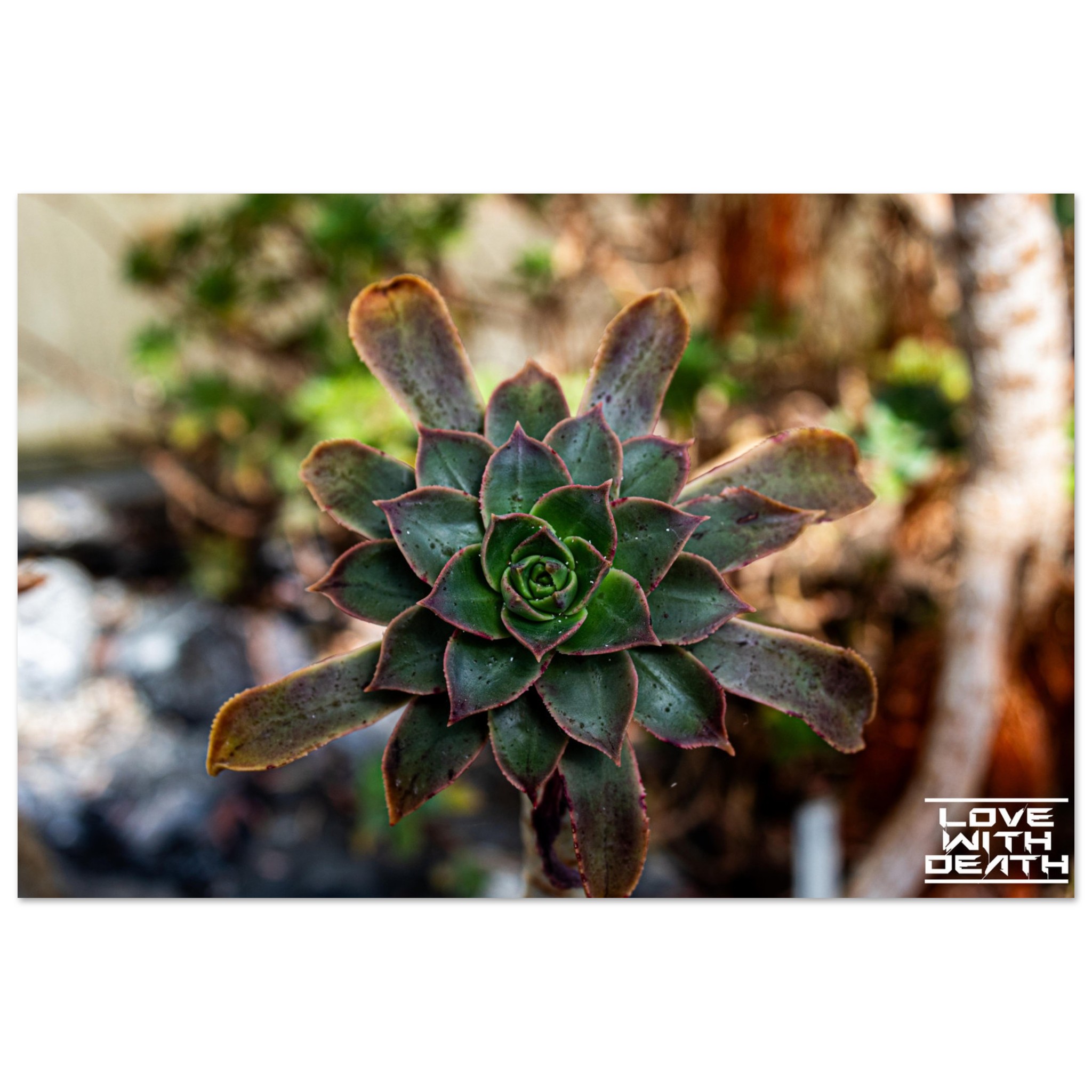 This unique succulent showcases a fascinating blend of green and reddish hues, with its leaves forming a harmonious rosette shape. The slightly wavy edges and natural color gradients give the plant a distinctive character. The blurred background enhances the focus on the structure and beauty of the succulent.