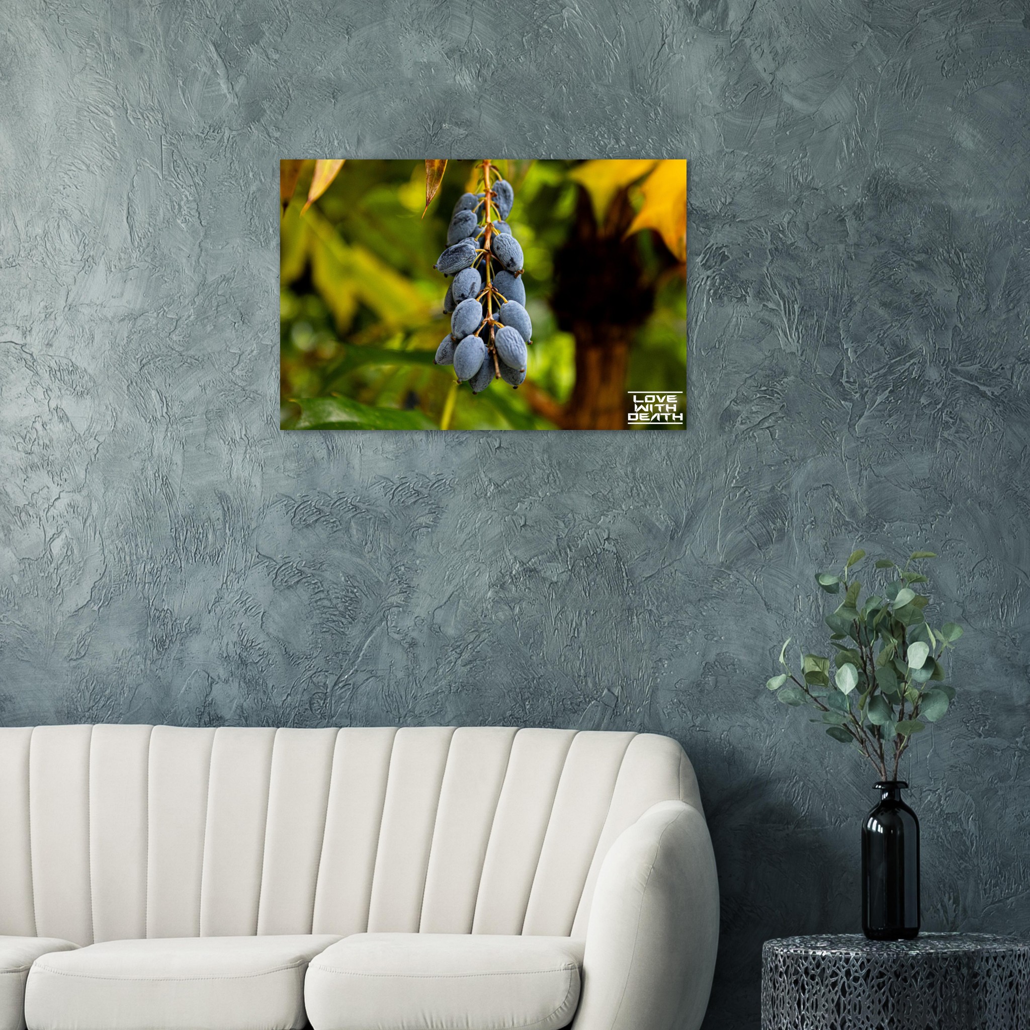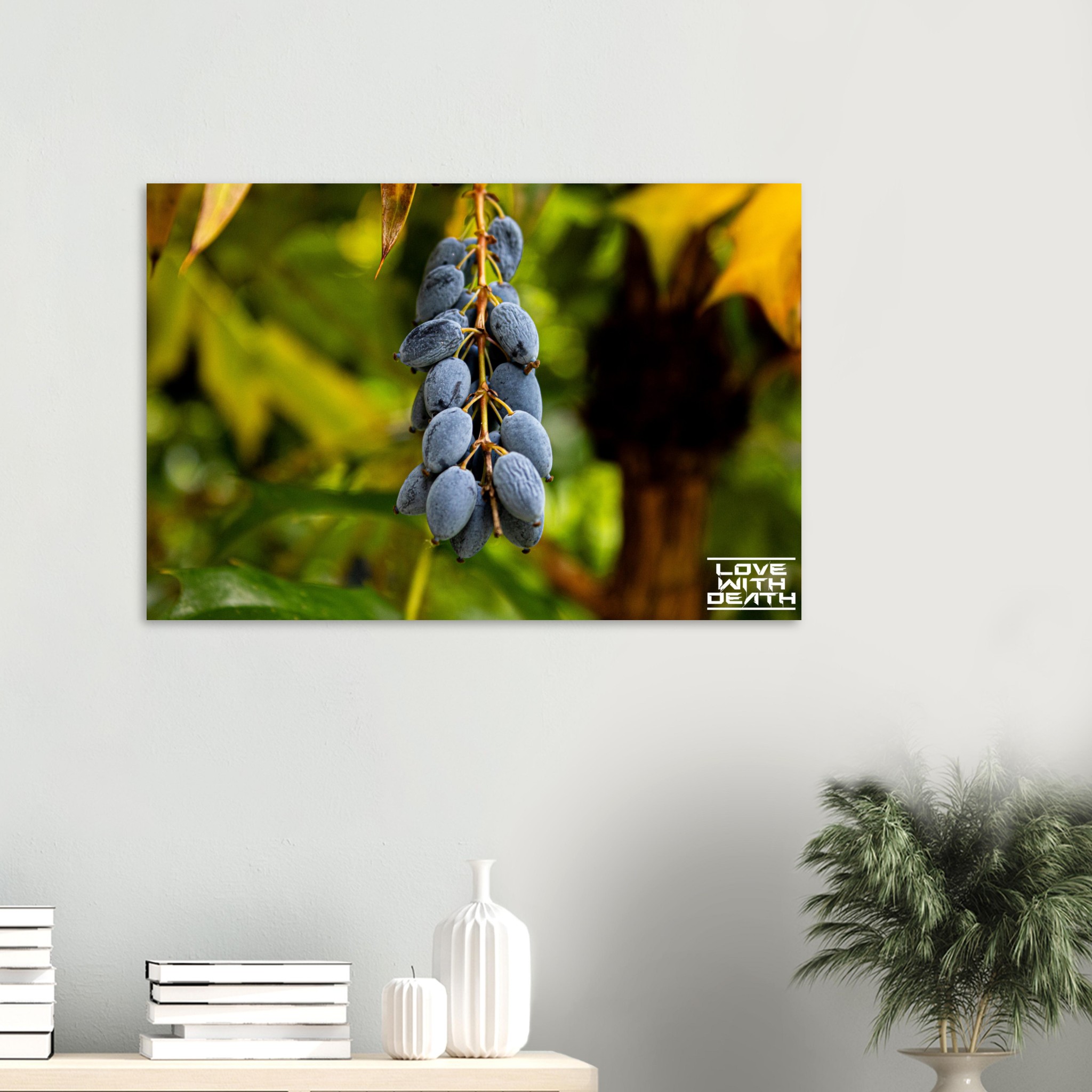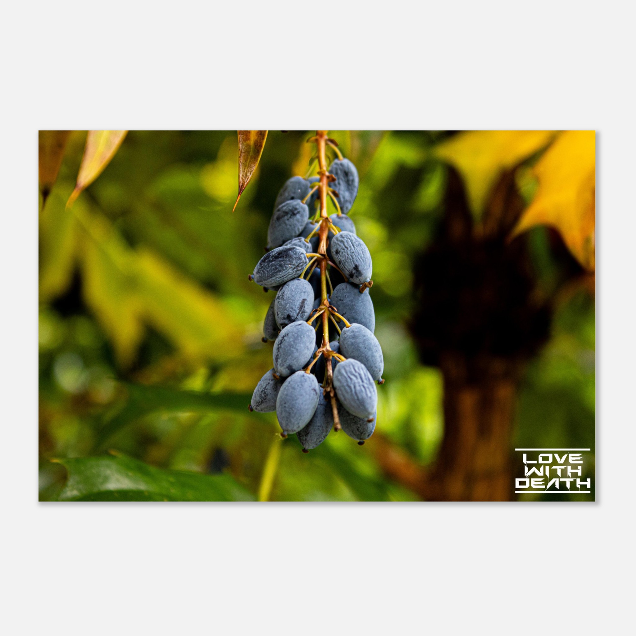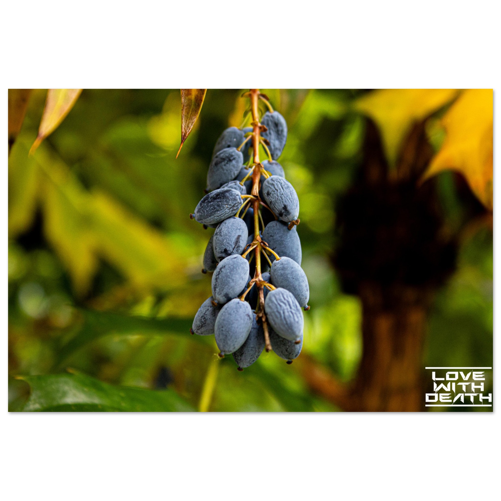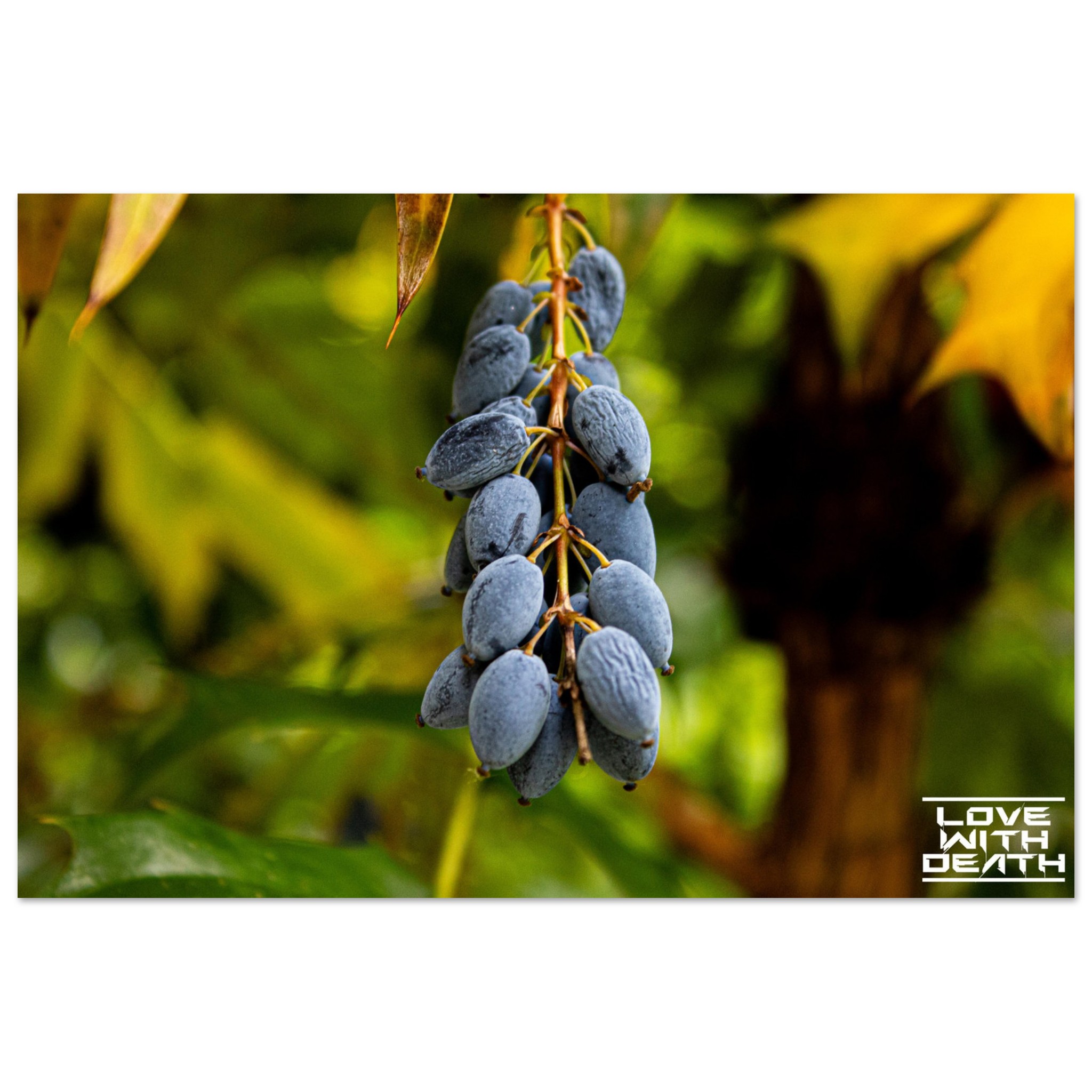 This close-up captures a cluster of blue berries surrounded by a lush green background. The composition emphasizes the beauty and delicacy of nature.