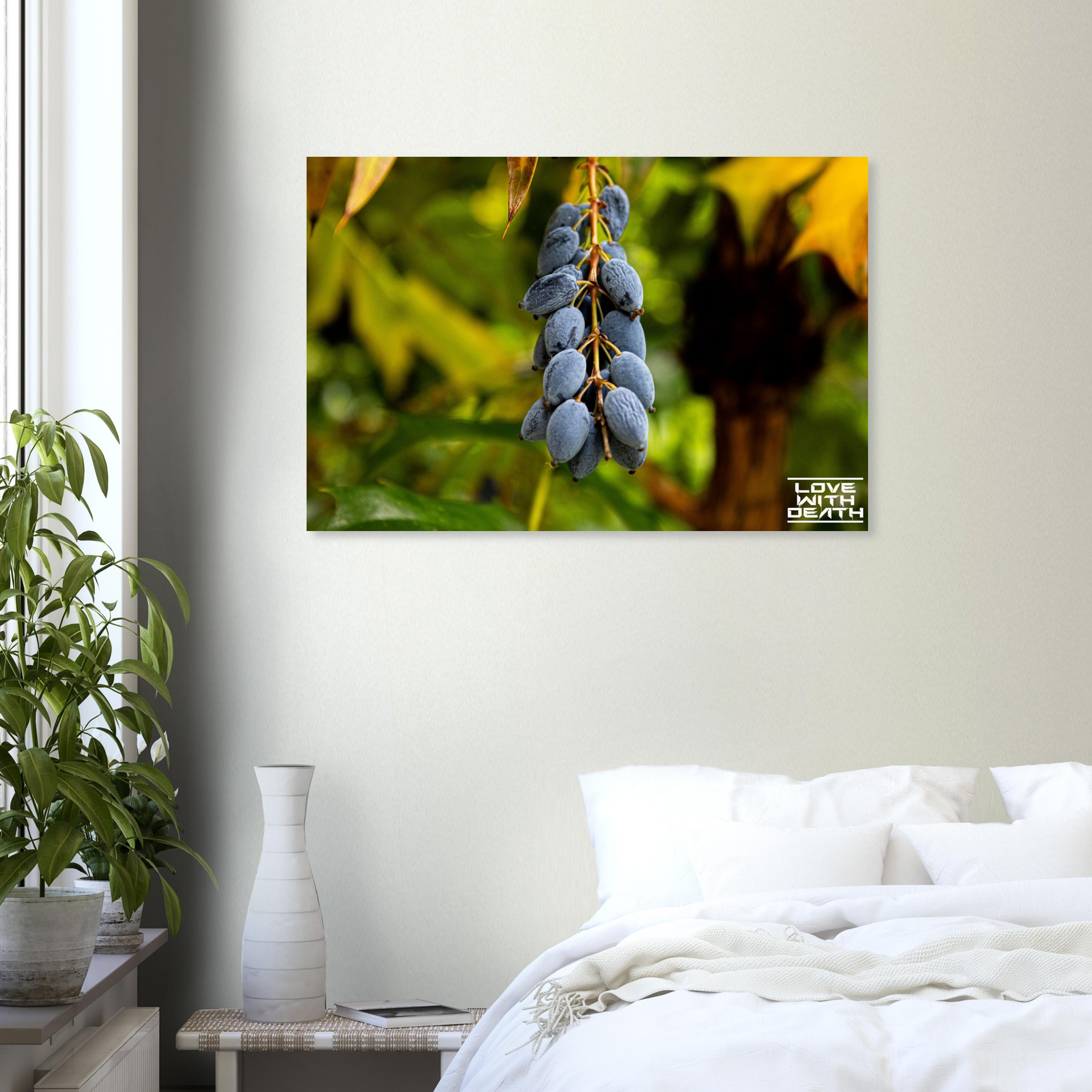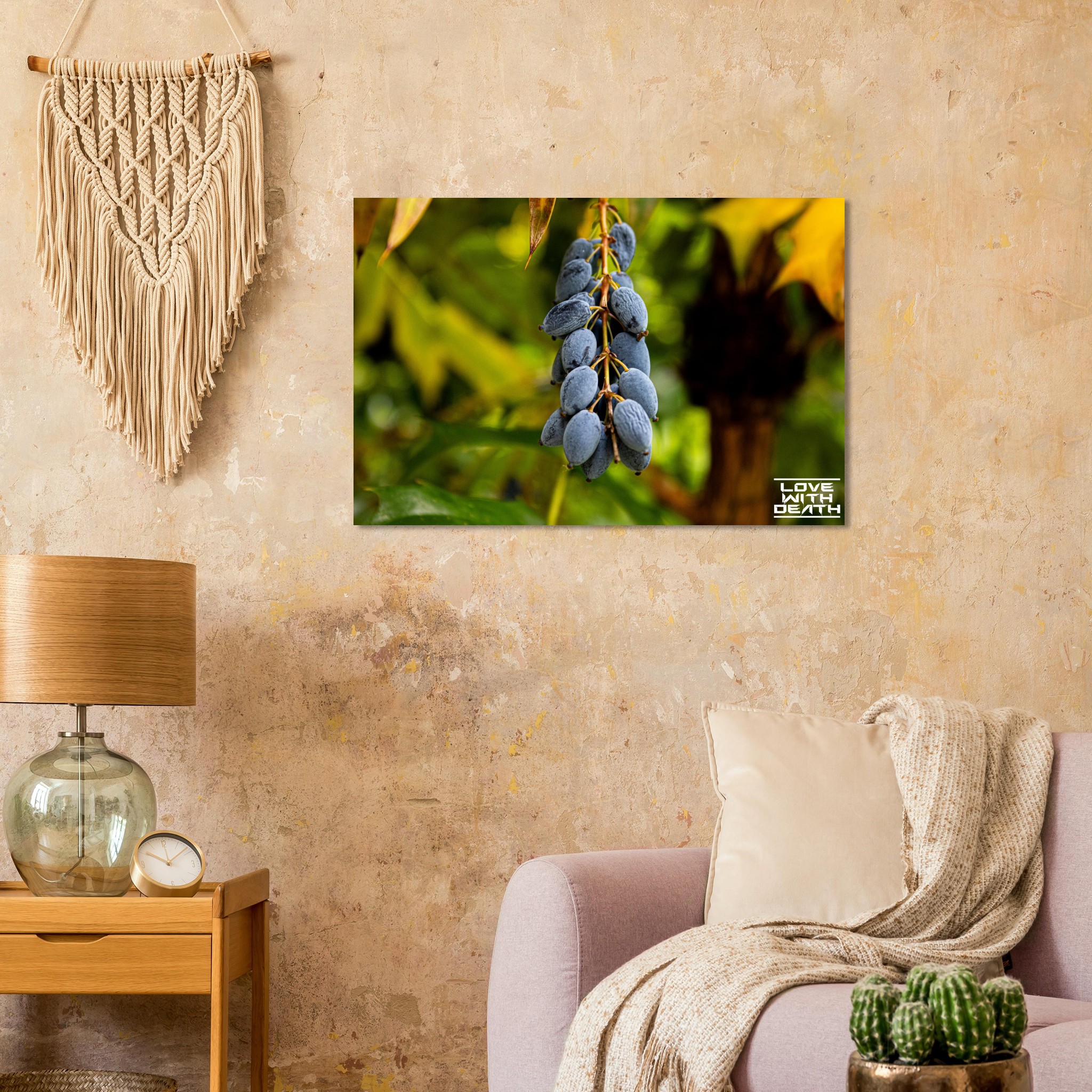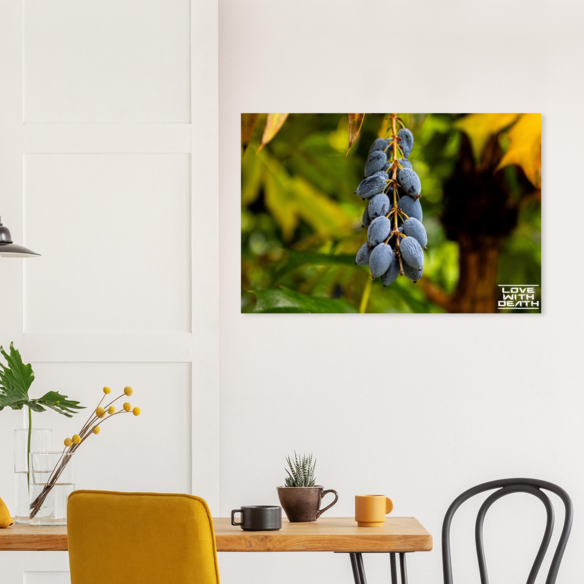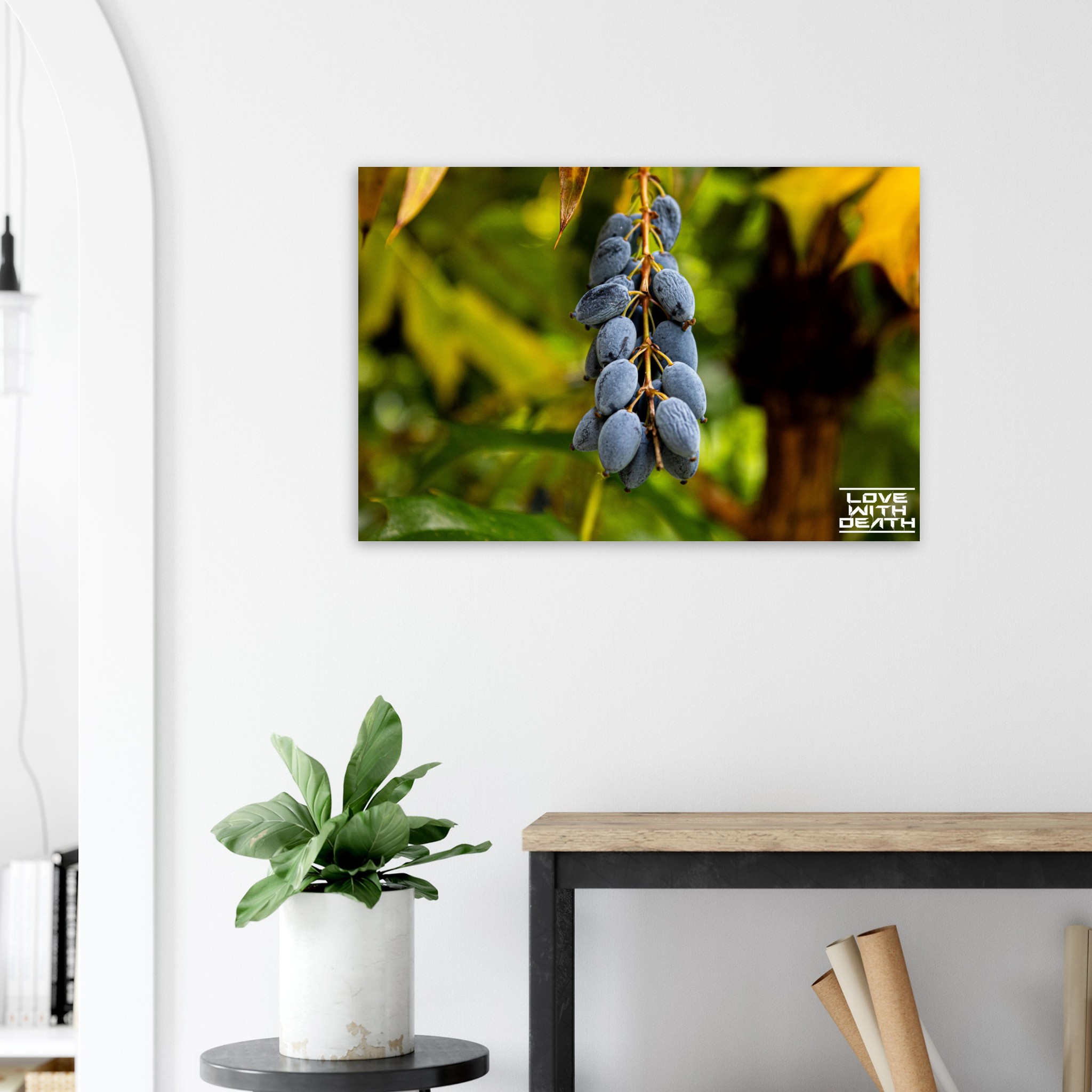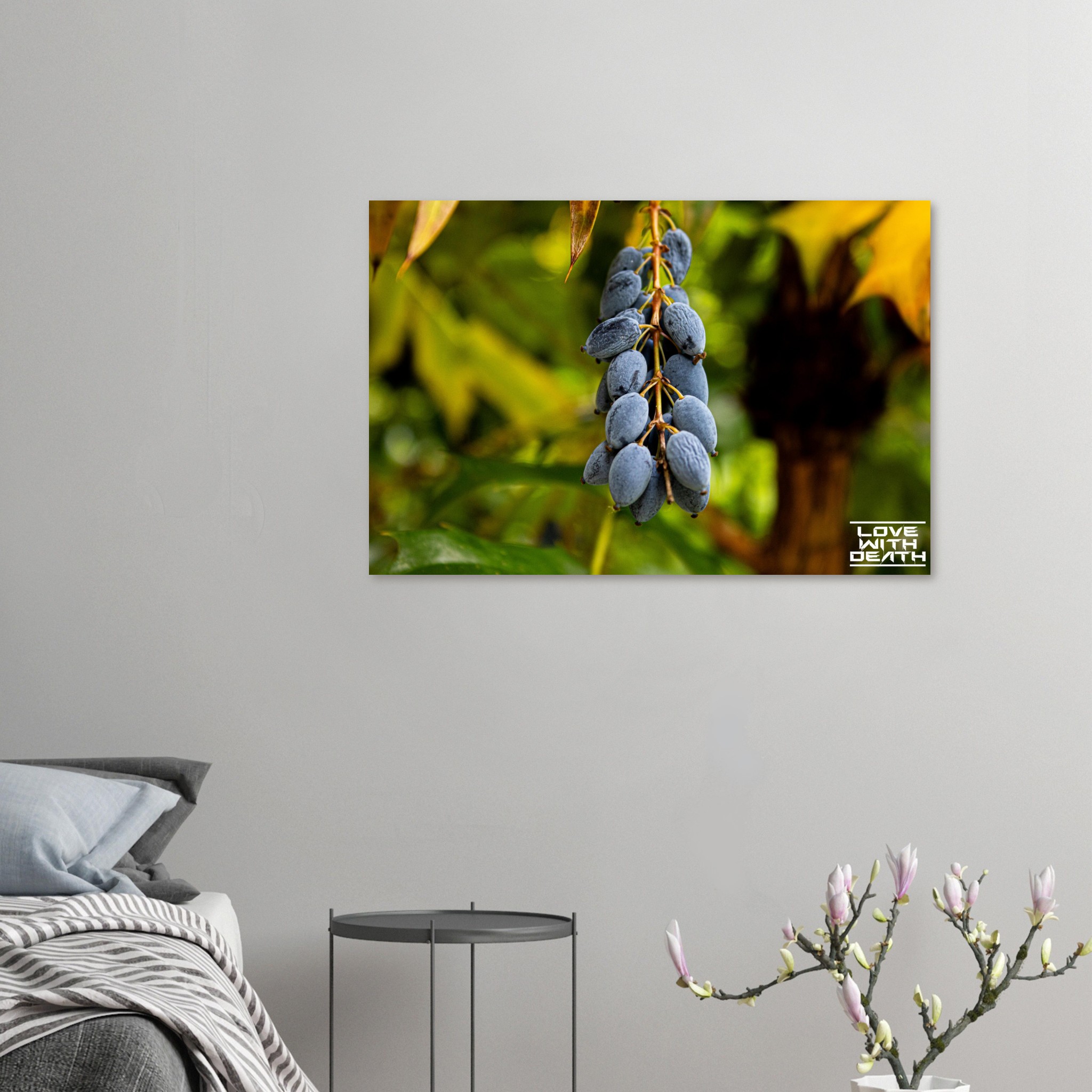 This close-up captures a cluster of blue berries surrounded by a lush green background. The composition emphasizes the beauty and delicacy of nature.