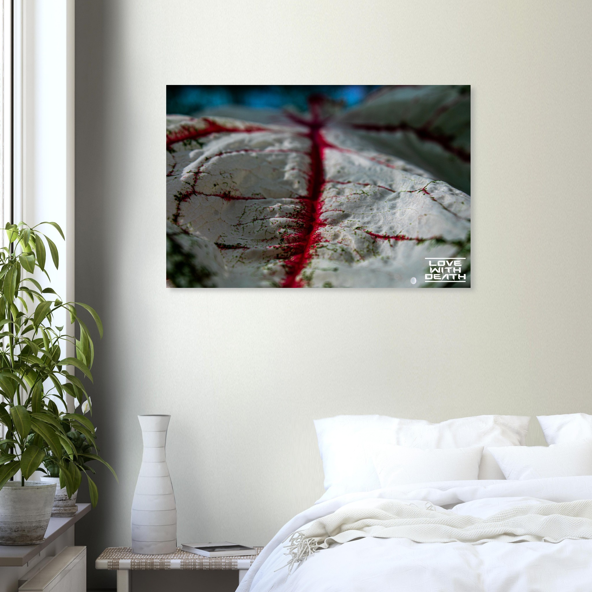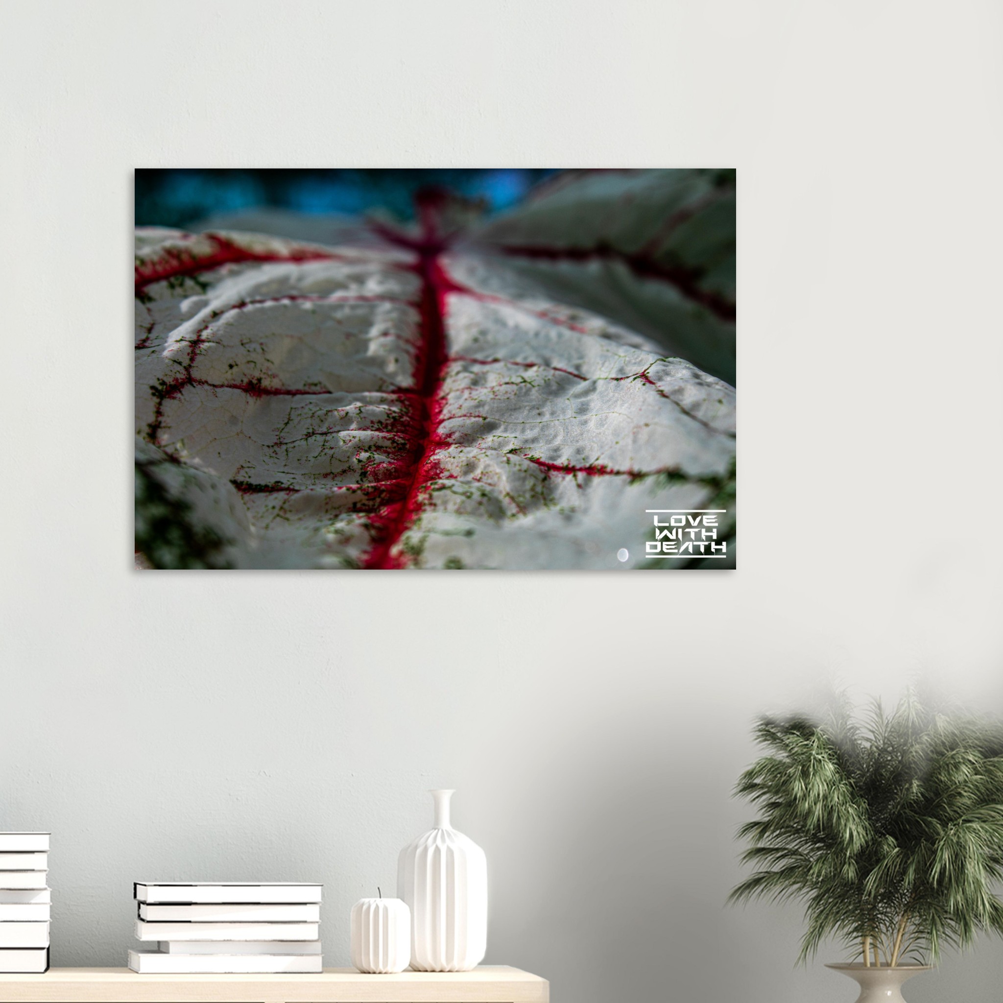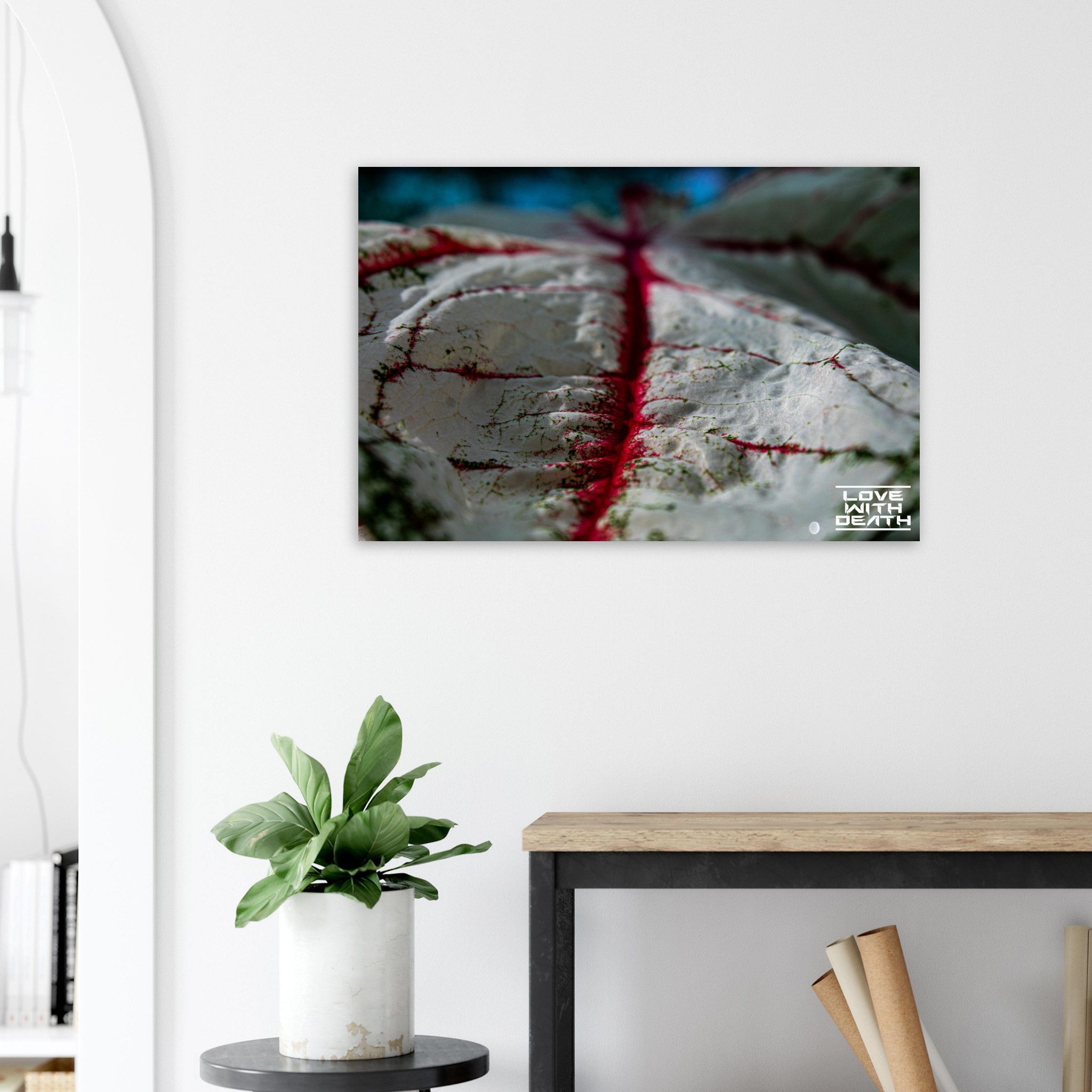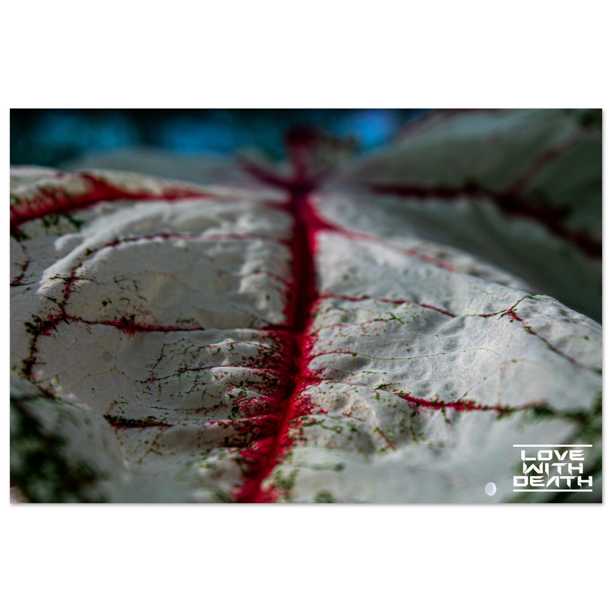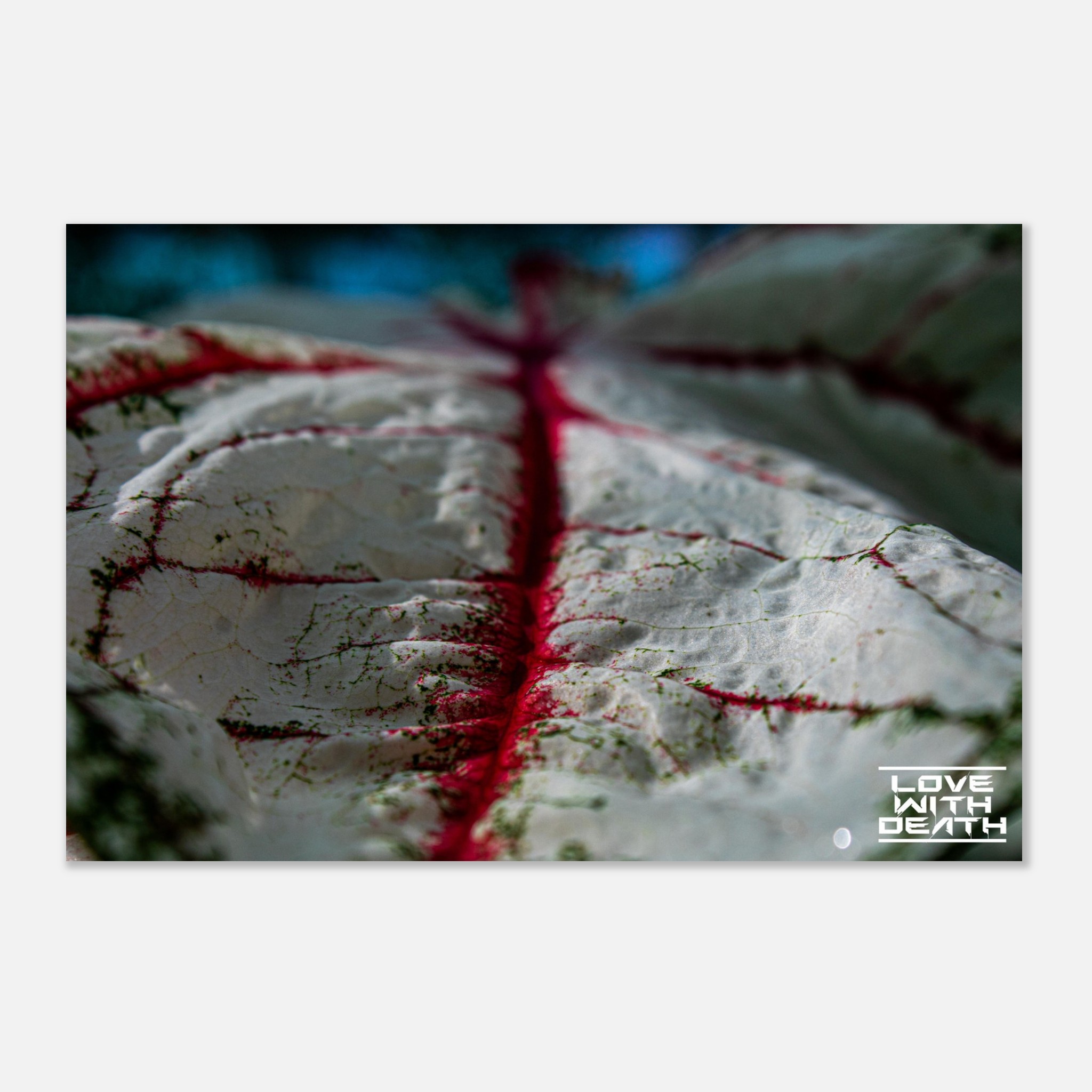 An impressive macro photograph offering a fresh perspective on an extraordinary leaf with red veins. The white surface, speckled with green details, is accentuated by the red veins flowing through the soft contours of the leaf. The side view provides depth and makes the texture of the leaf come alive, resembling a miniature landscape.