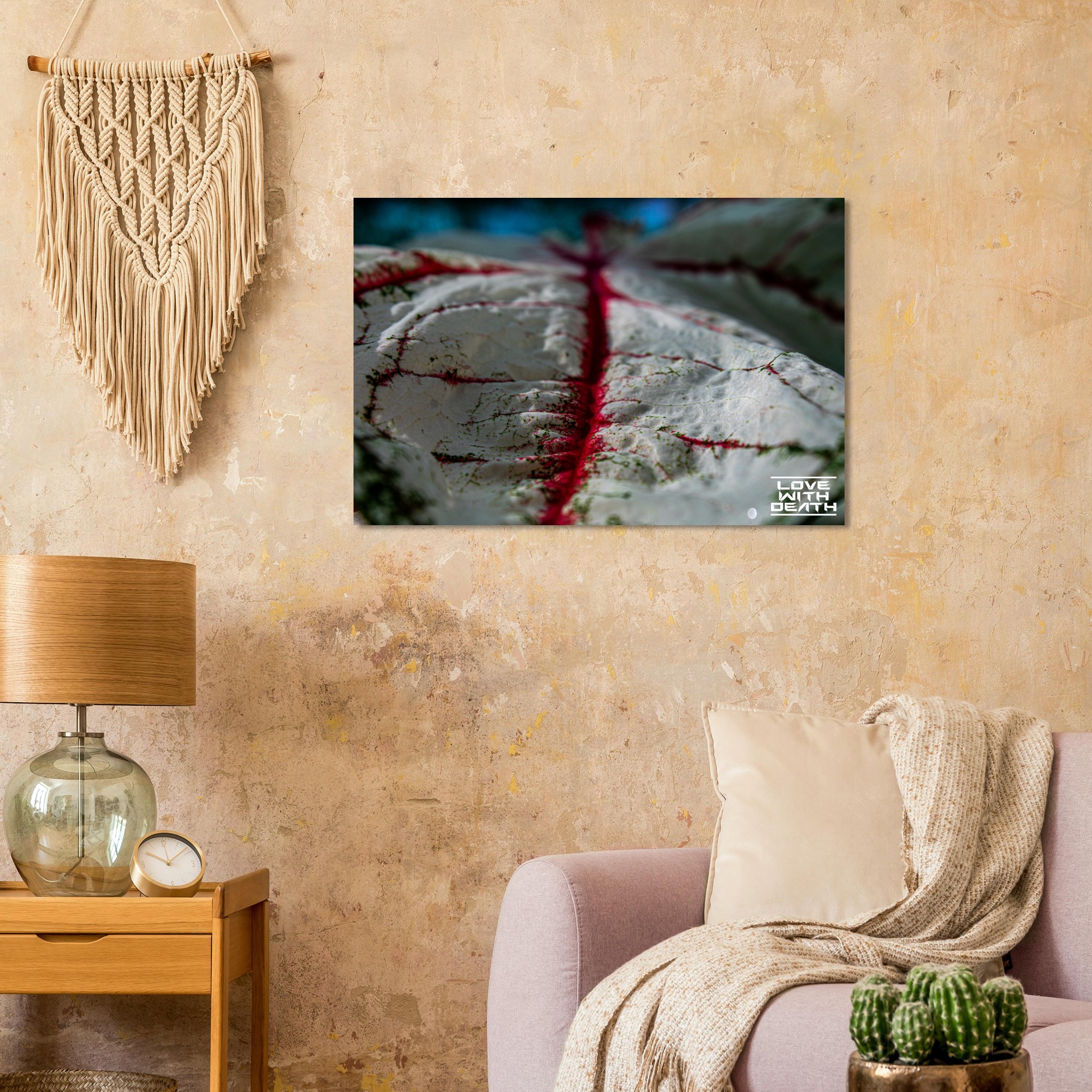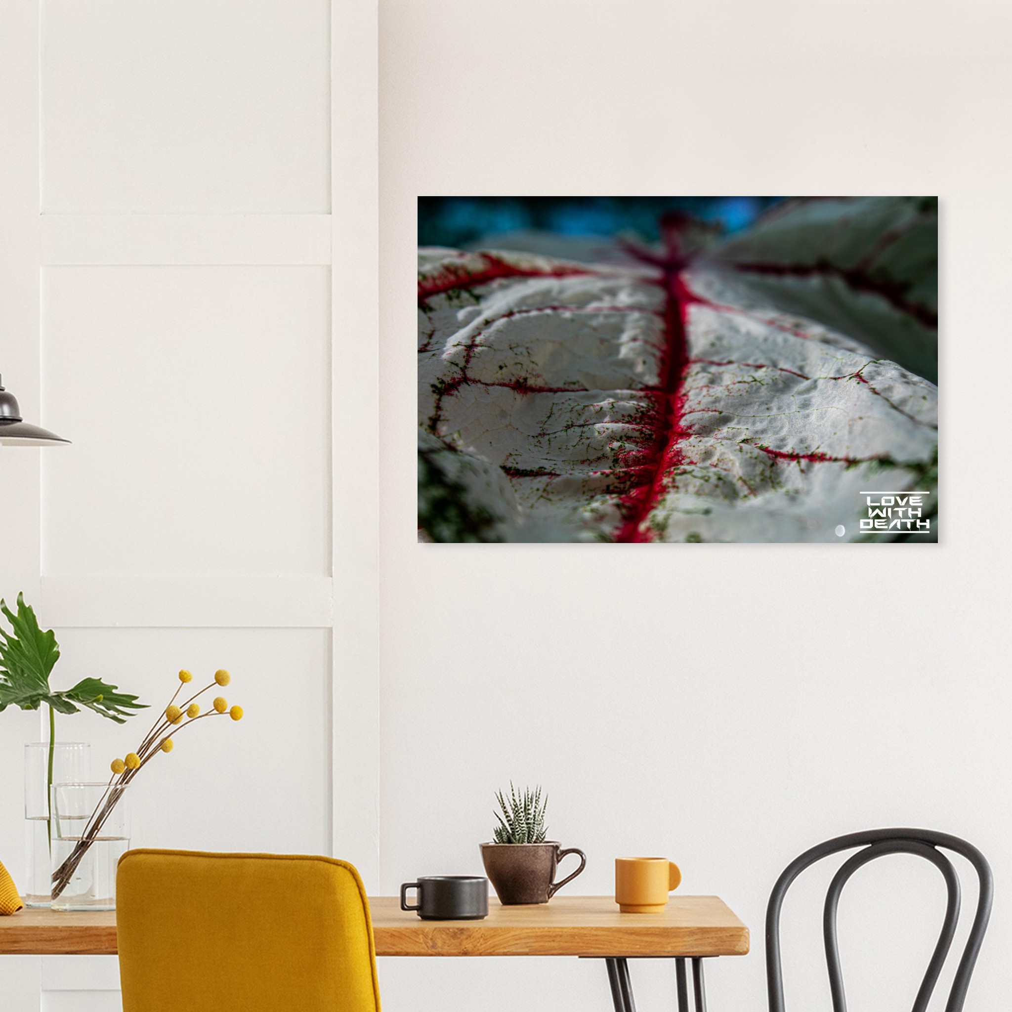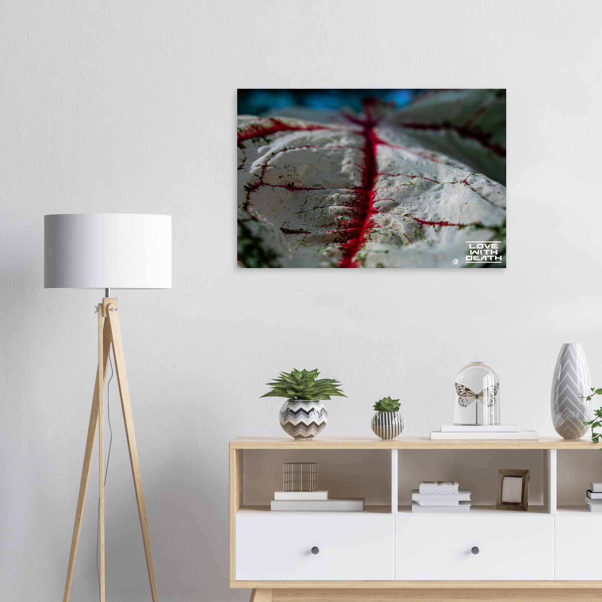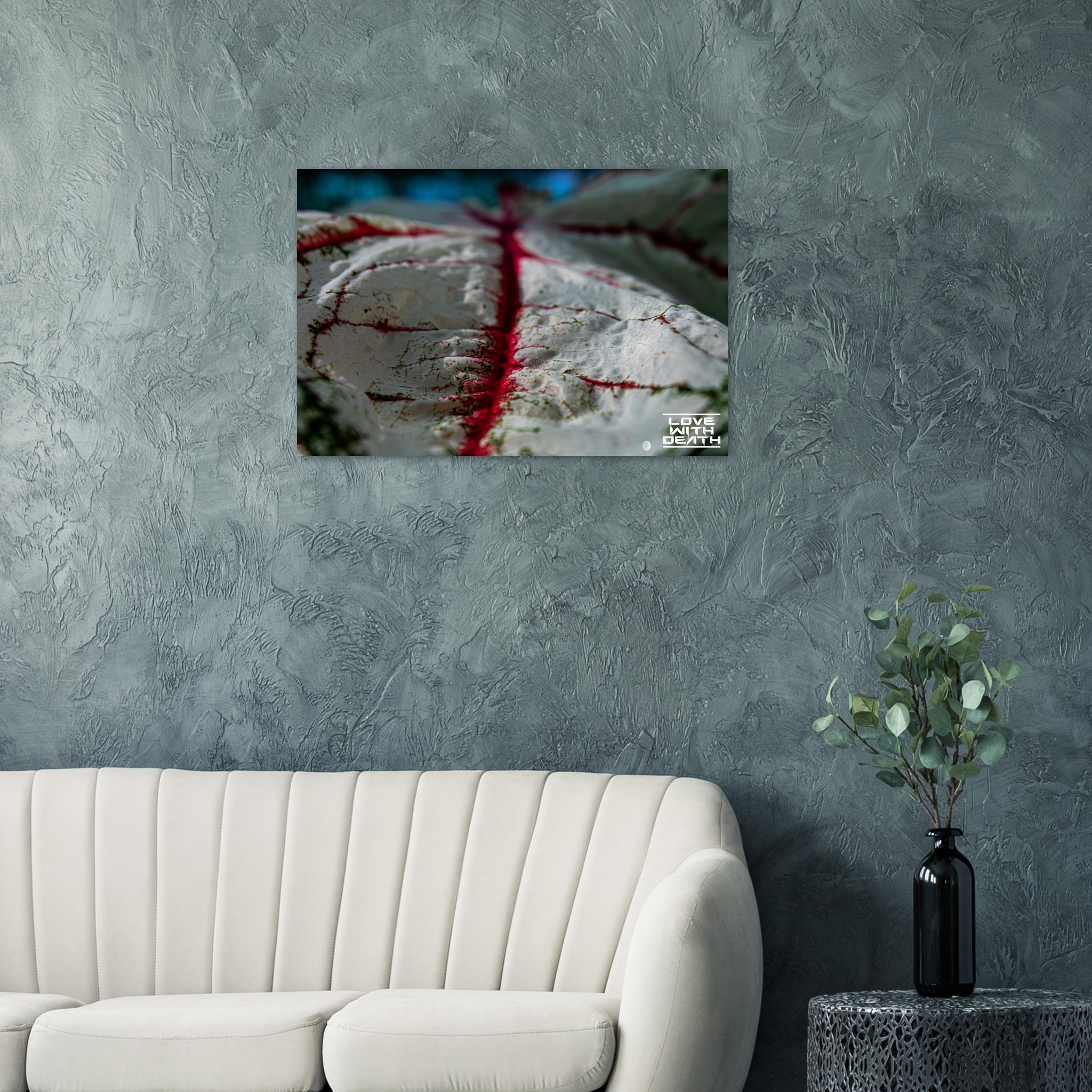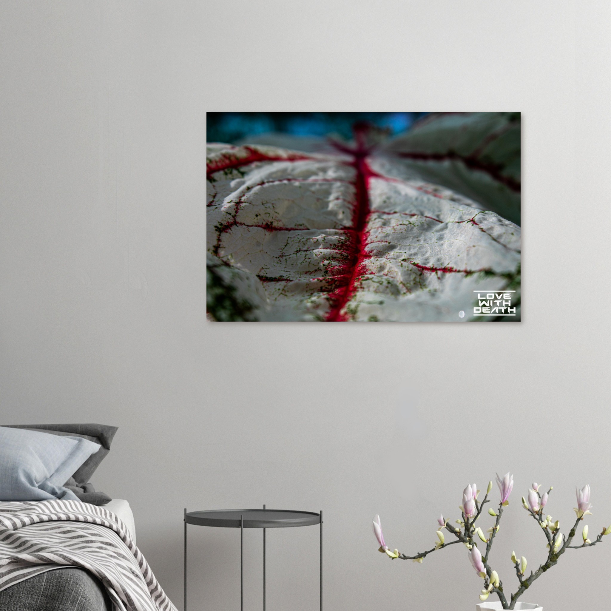 An impressive macro photograph offering a fresh perspective on an extraordinary leaf with red veins. The white surface, speckled with green details, is accentuated by the red veins flowing through the soft contours of the leaf. The side view provides depth and makes the texture of the leaf come alive, resembling a miniature landscape.