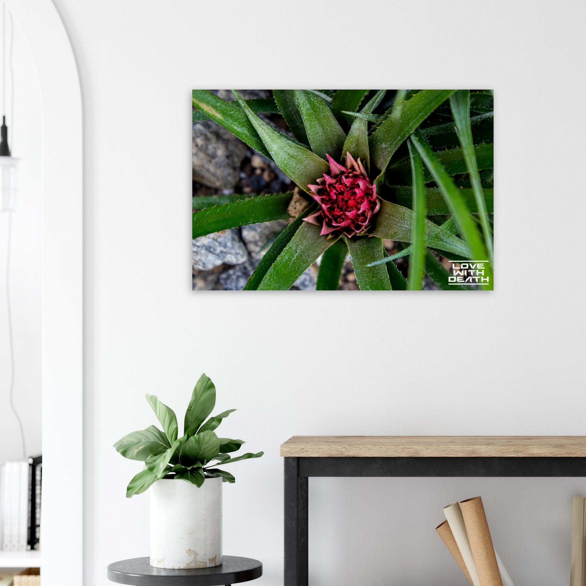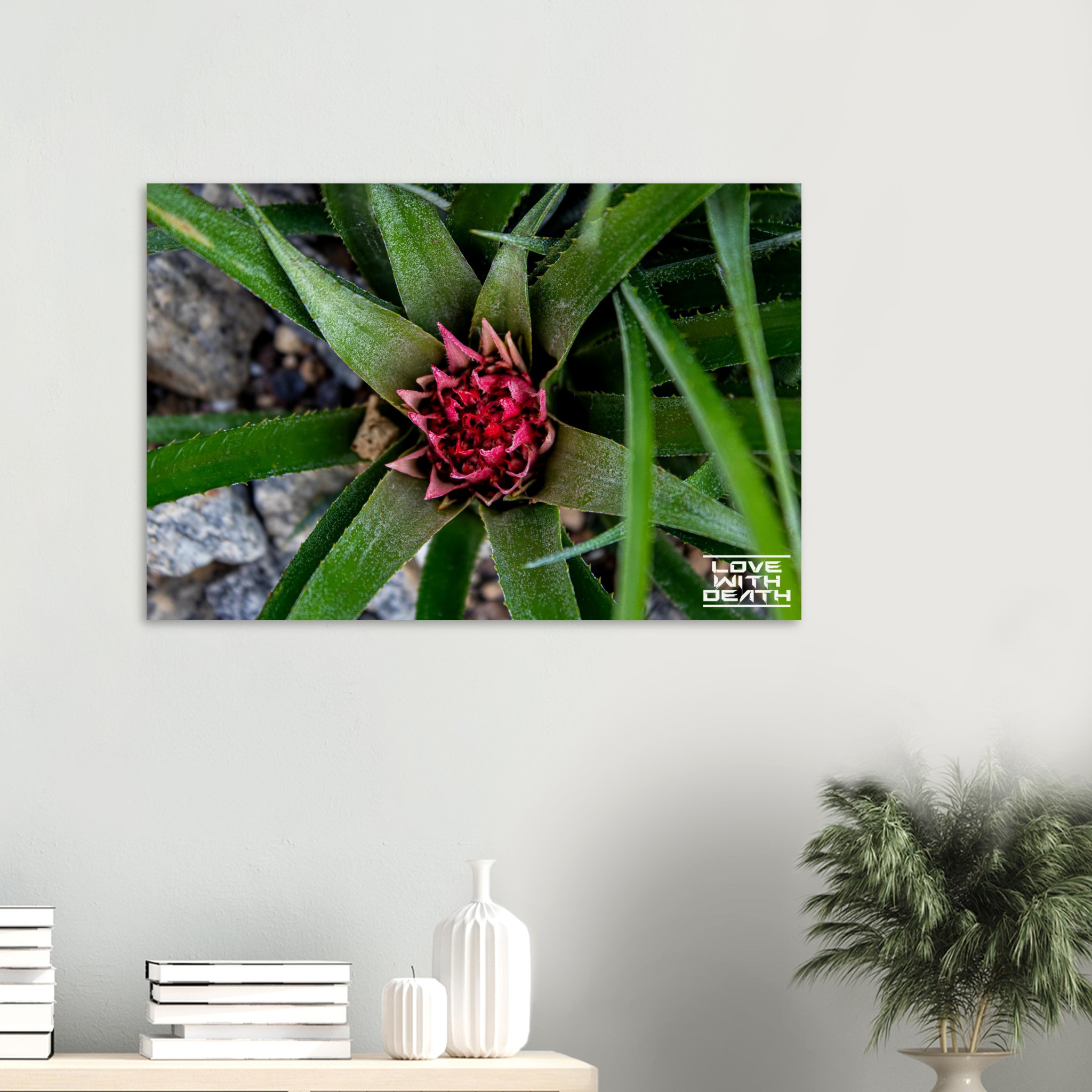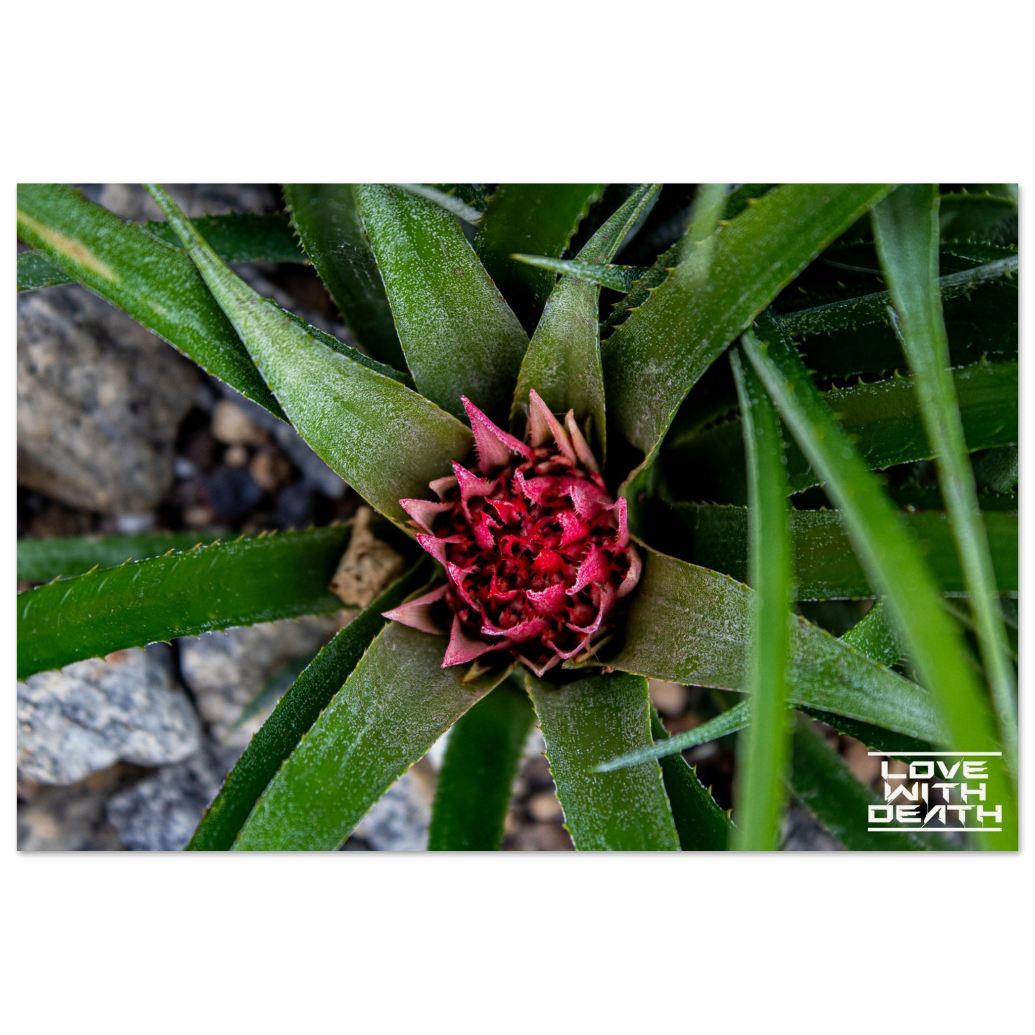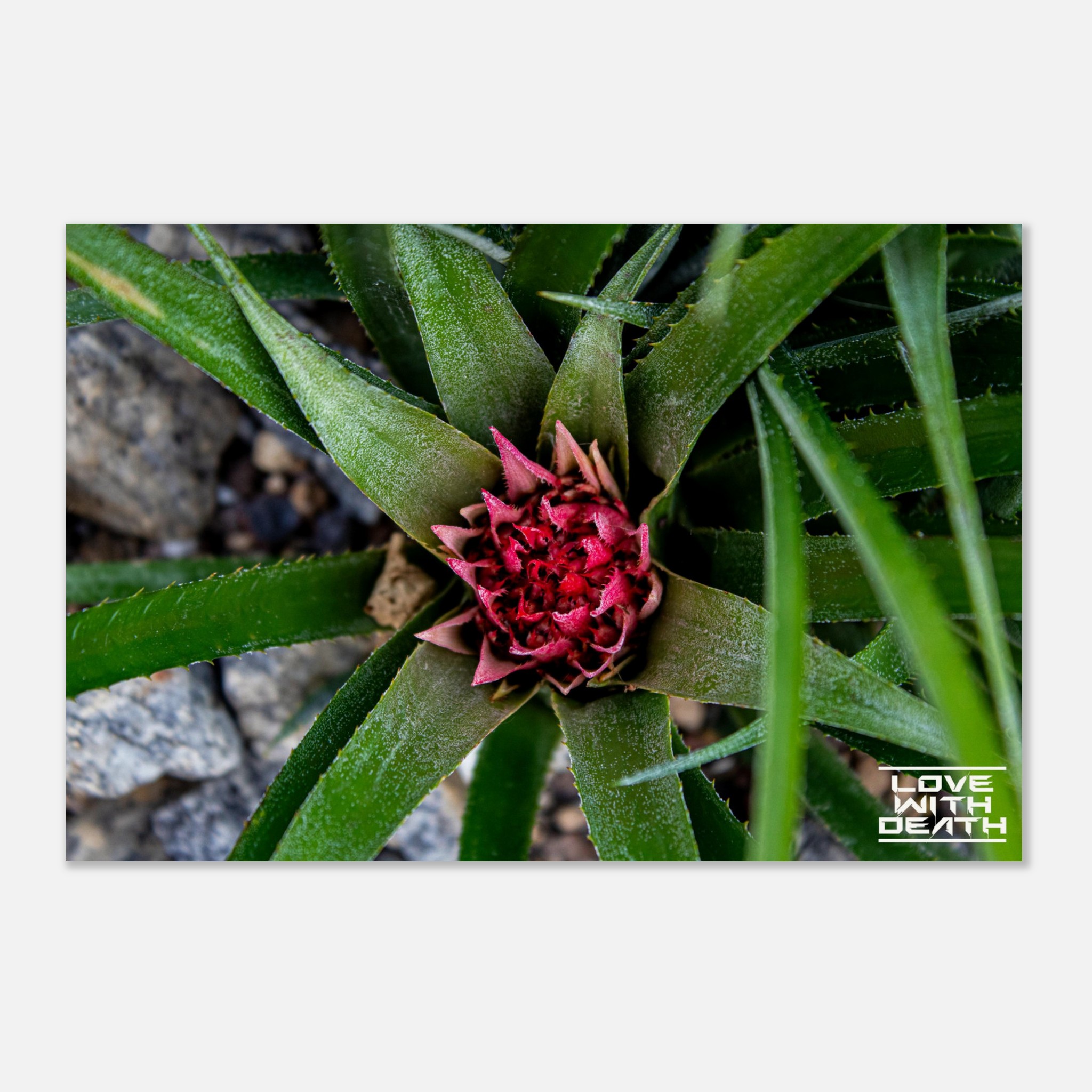 A beautifully captured image of an exotic plant, featuring vibrant green leaves encircling a striking red blossom. The interplay between the sharp edges of the leaves and the delicate details of the flower embodies nature’s remarkable balance of strength and fragility. The contrasting rocky background enhances the focus on the plant itself.