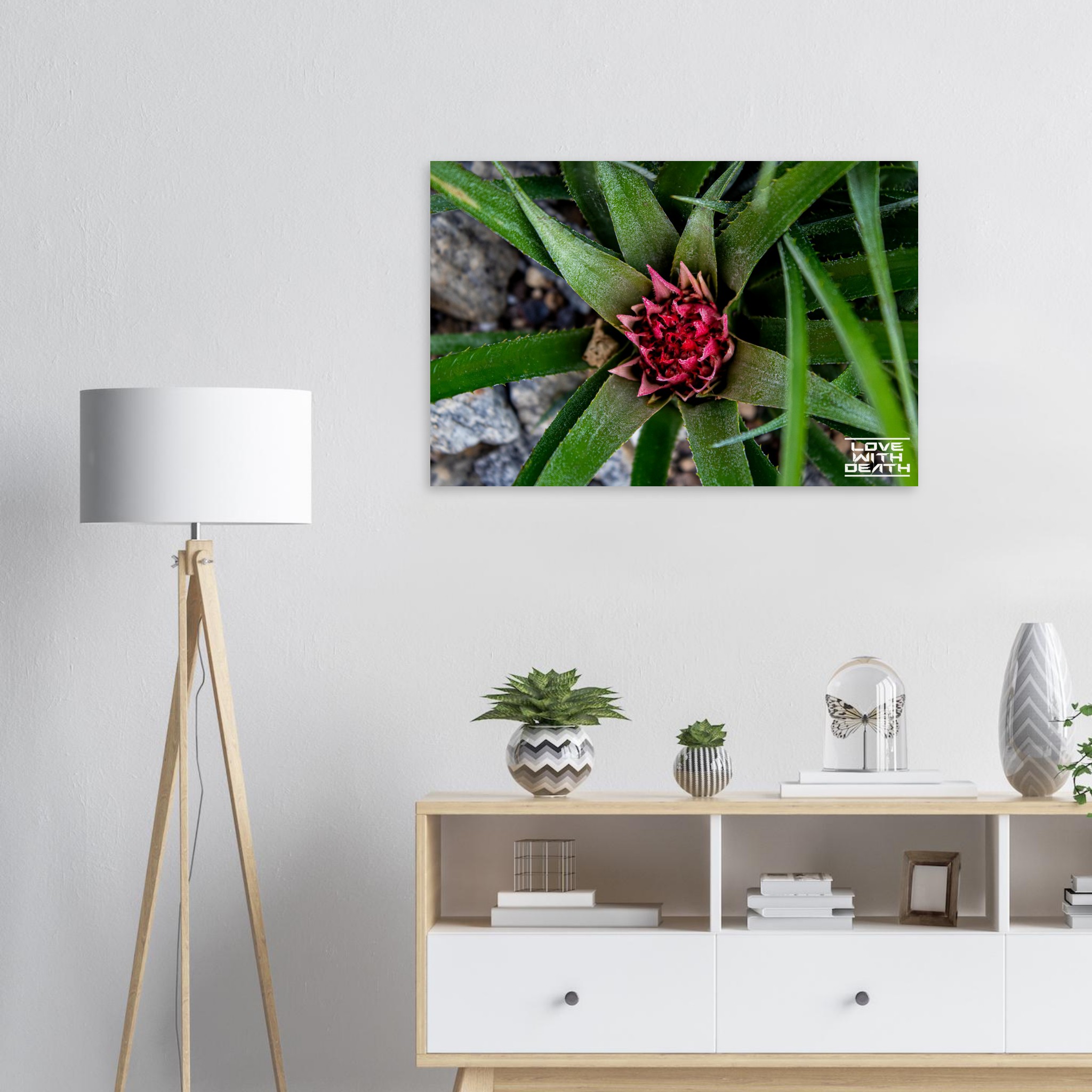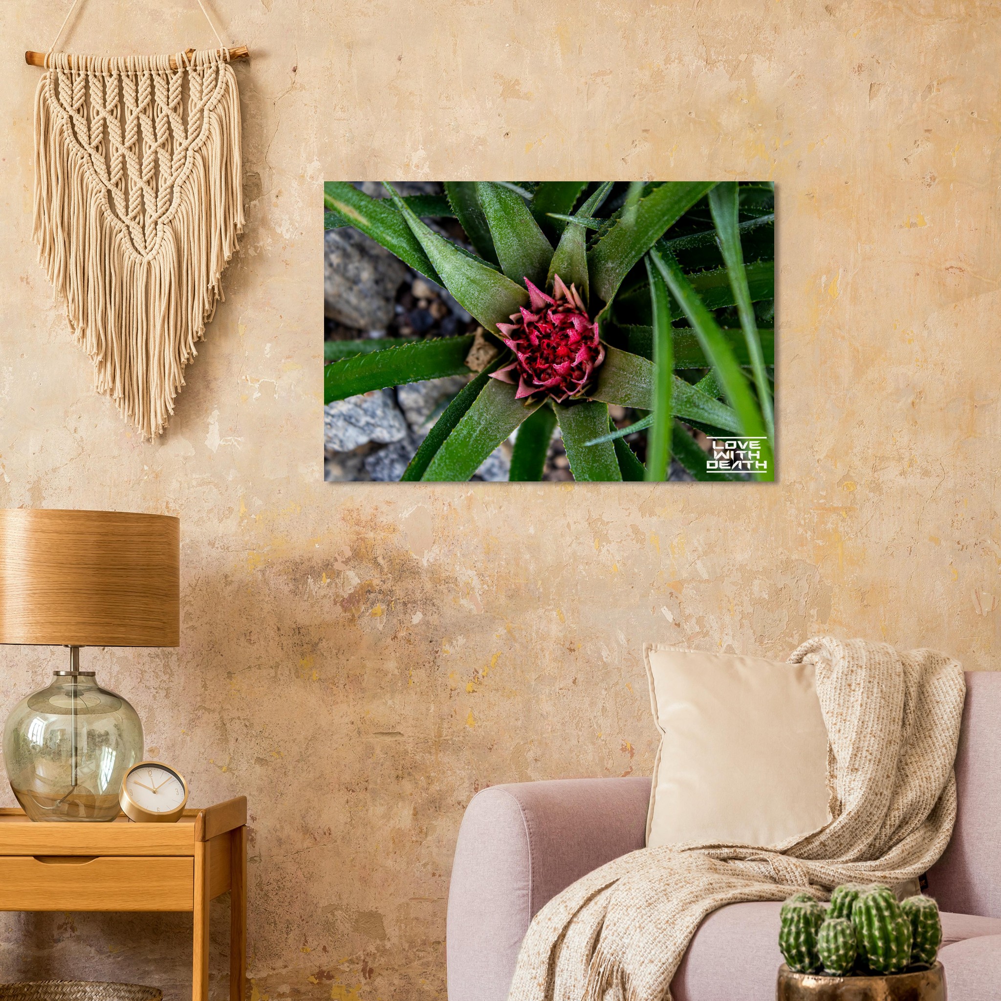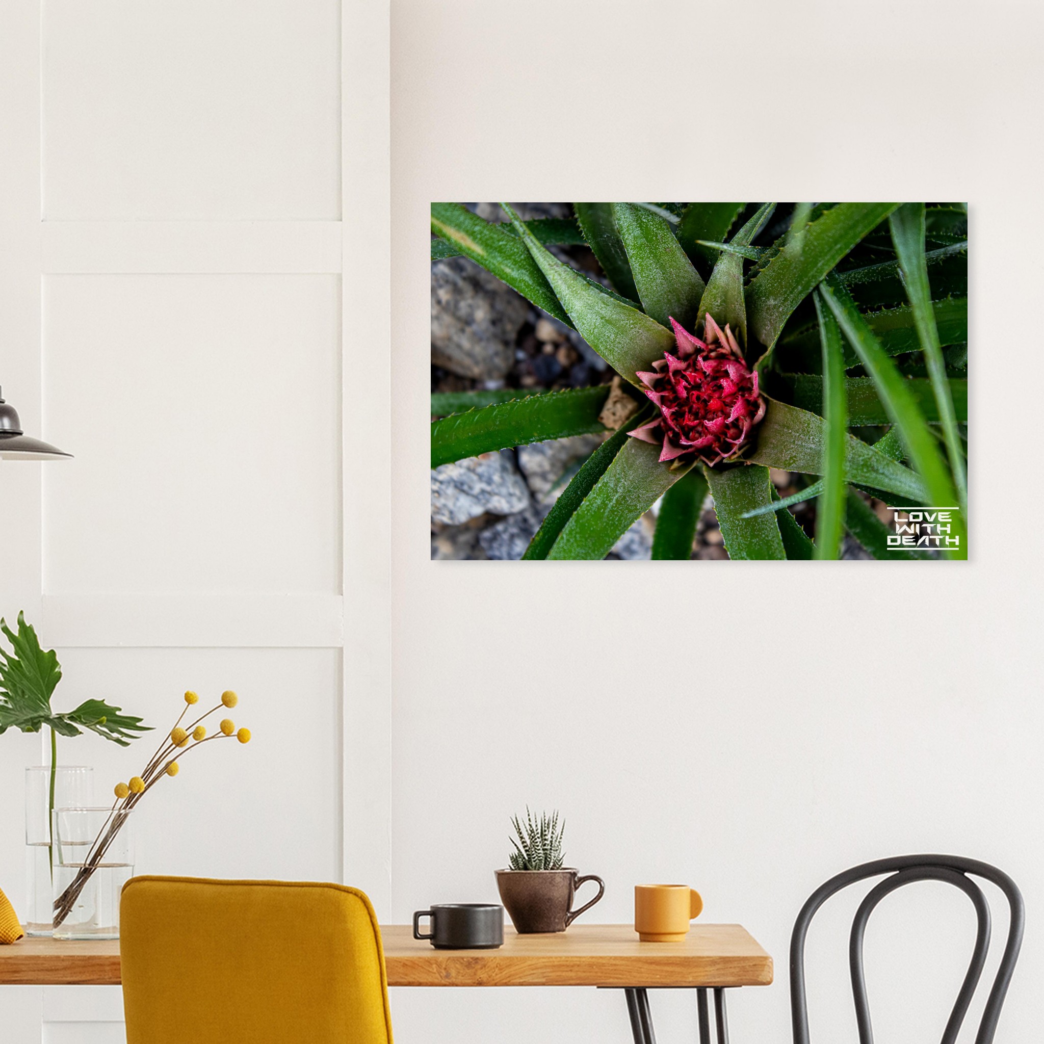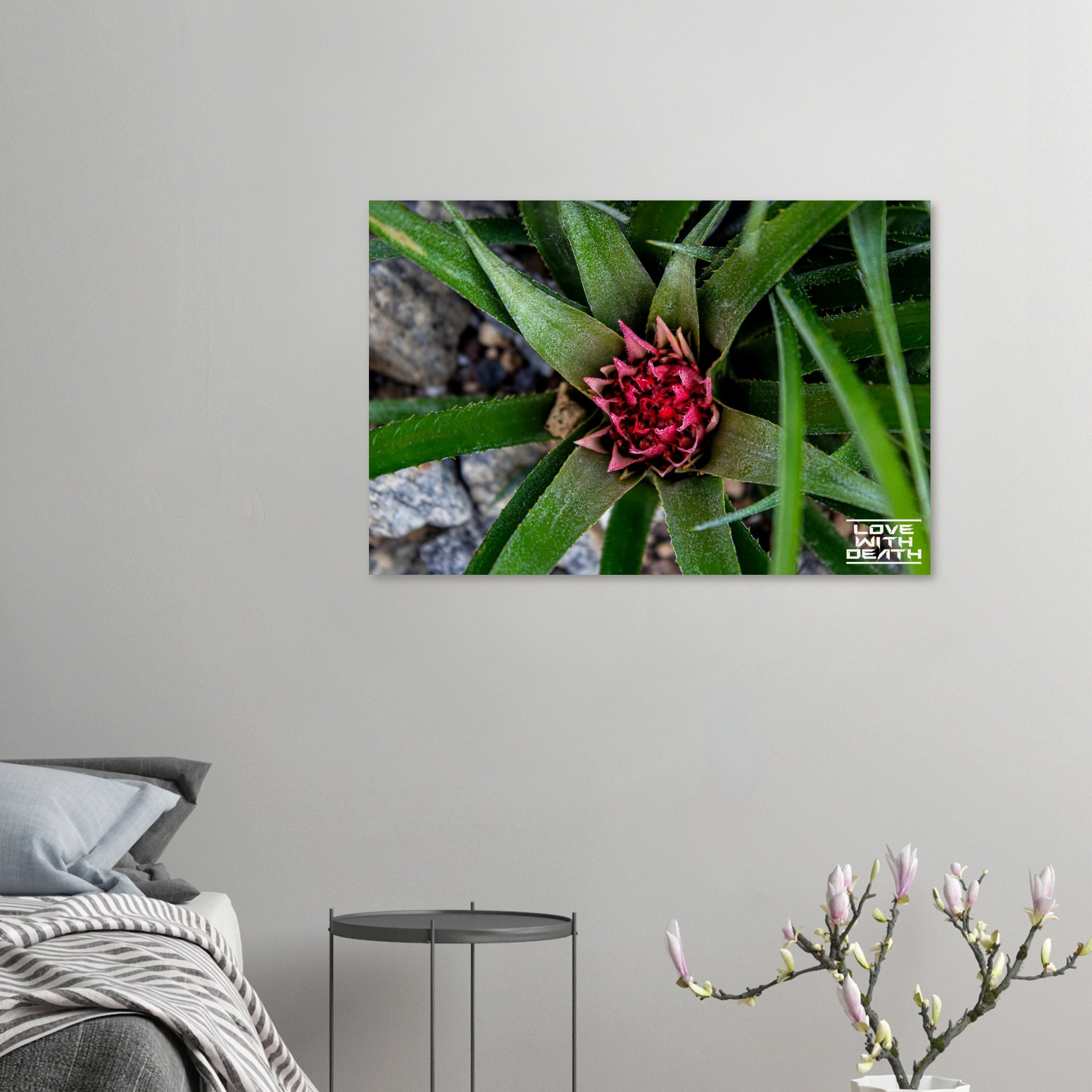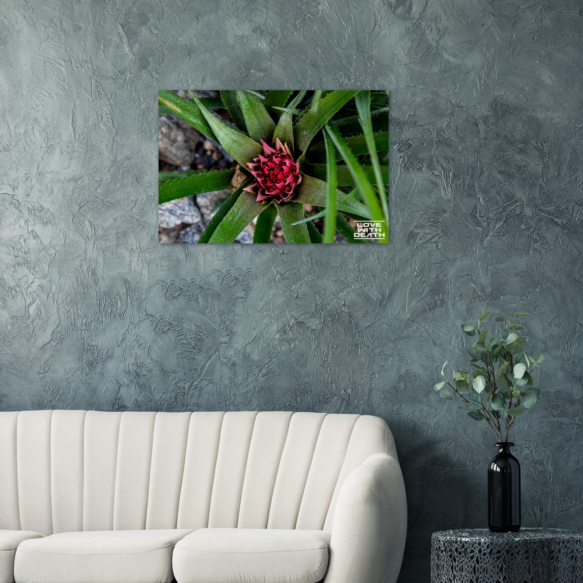 A beautifully captured image of an exotic plant, featuring vibrant green leaves encircling a striking red blossom. The interplay between the sharp edges of the leaves and the delicate details of the flower embodies nature’s remarkable balance of strength and fragility. The contrasting rocky background enhances the focus on the plant itself.