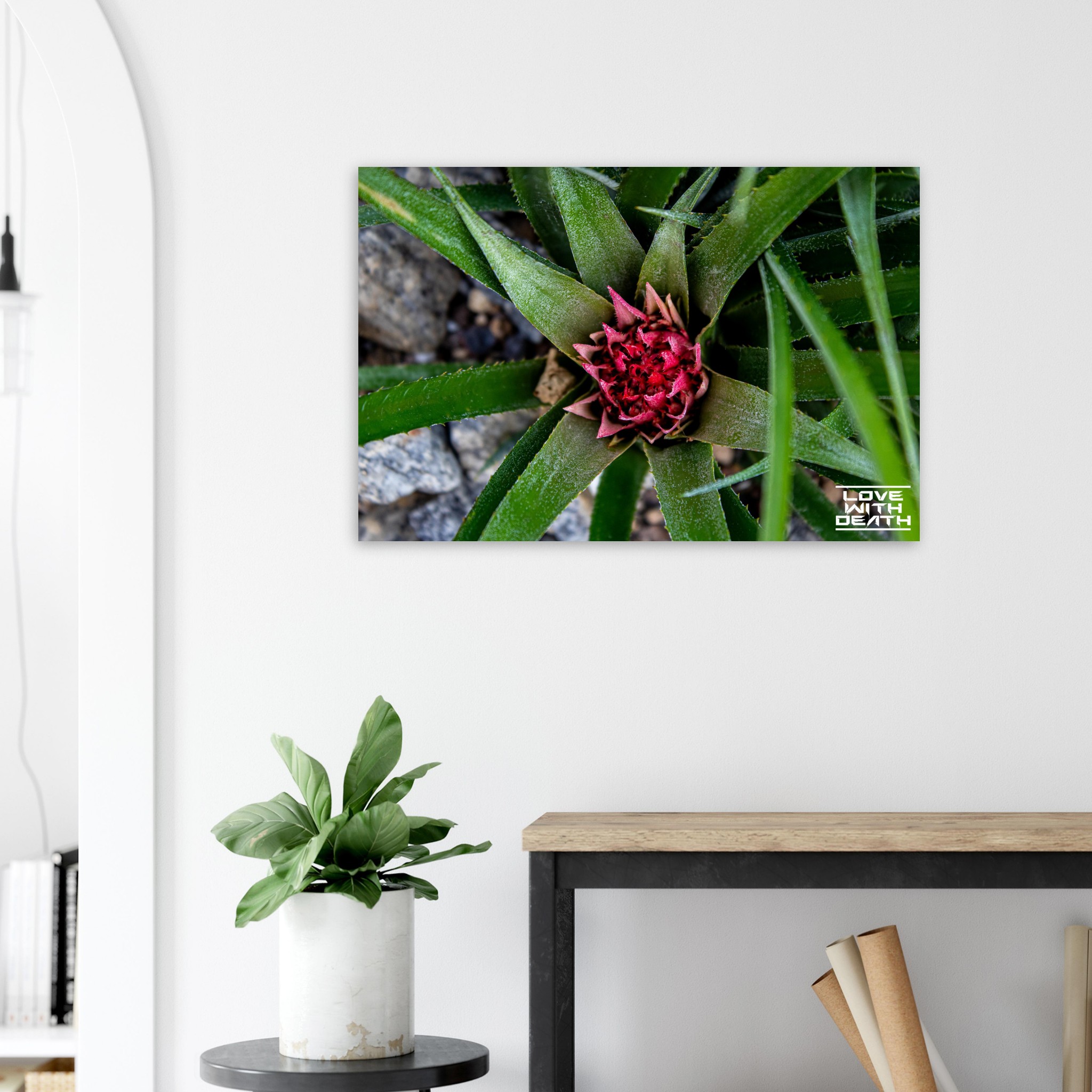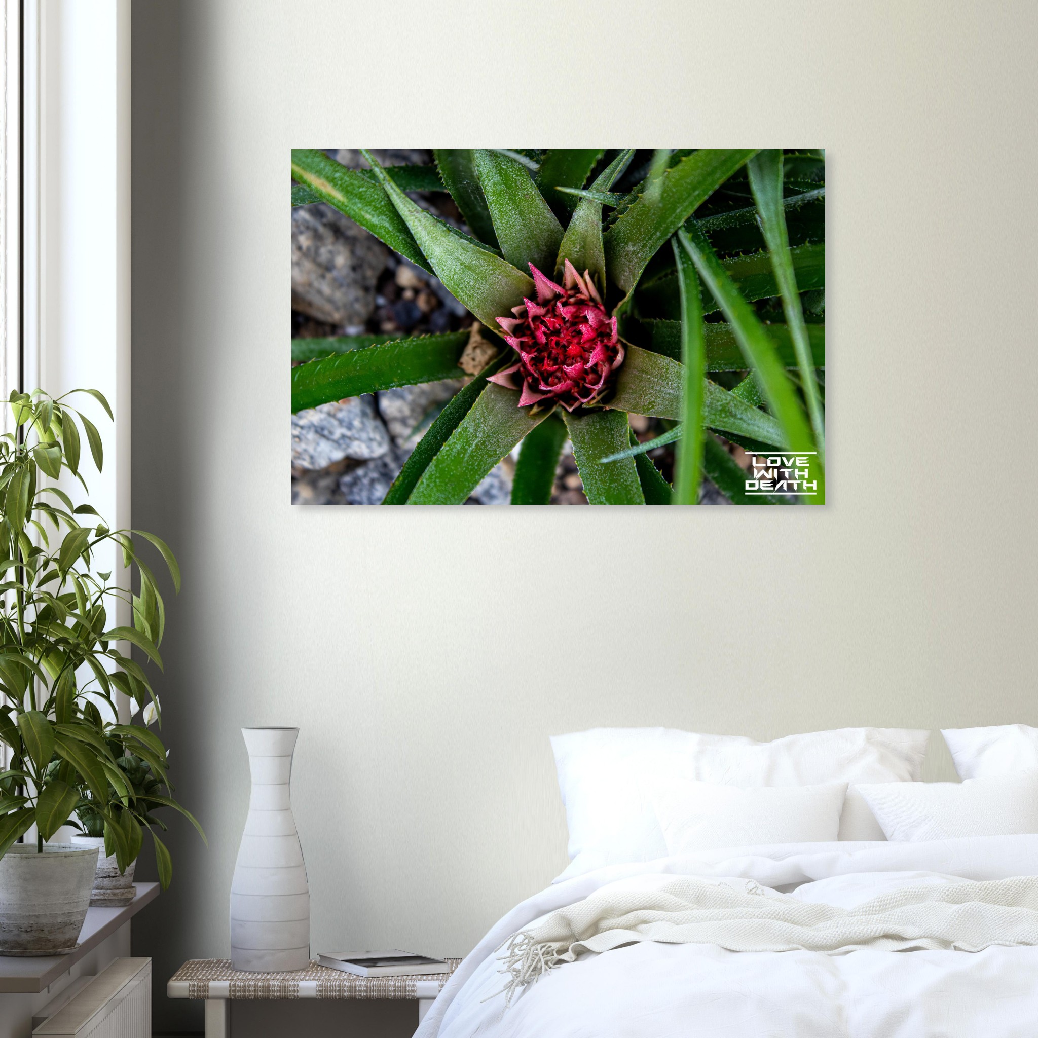 A beautifully captured image of an exotic plant, featuring vibrant green leaves encircling a striking red blossom. The interplay between the sharp edges of the leaves and the delicate details of the flower embodies nature’s remarkable balance of strength and fragility. The contrasting rocky background enhances the focus on the plant itself.