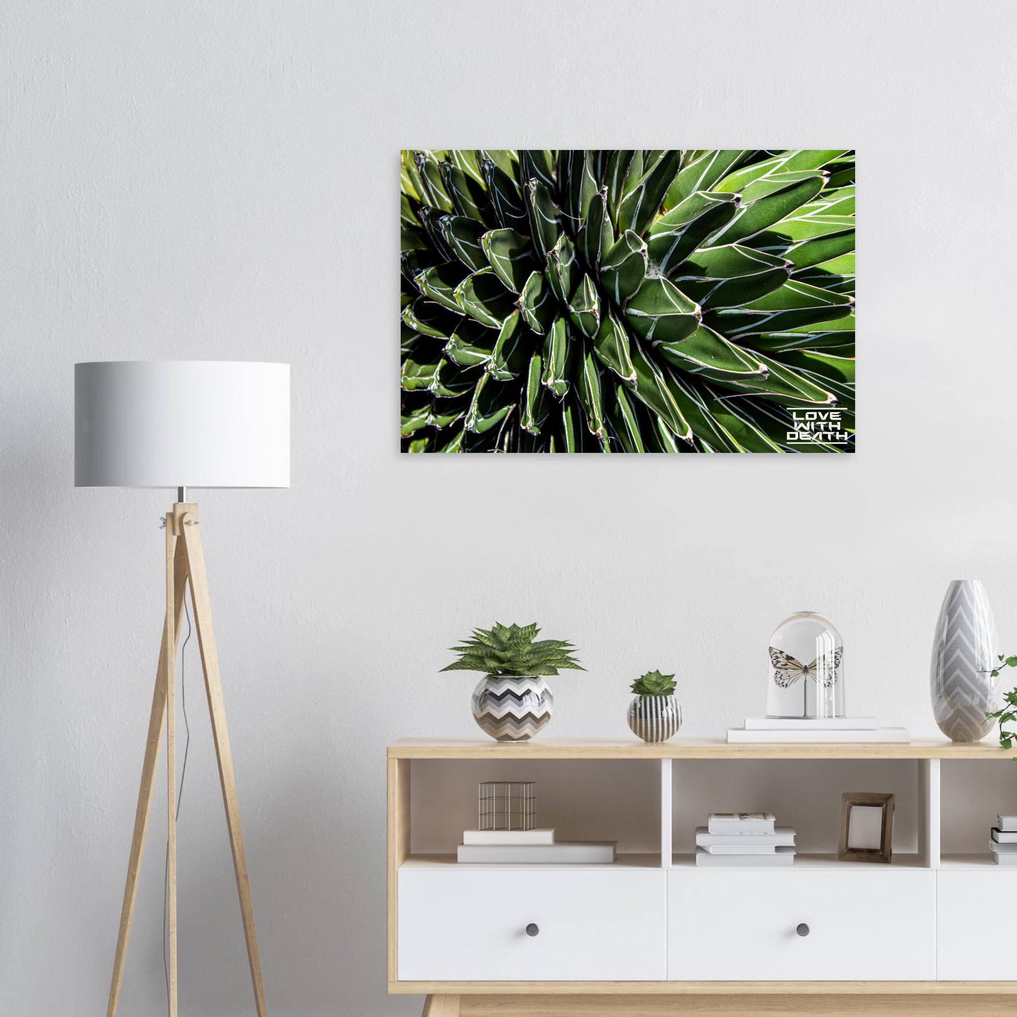 This image captures the mesmerizing structure of a succulent plant. The symmetrical arrangement of the leaves and the contrasting white lines create a harmonious yet powerful visual. The subtle play of light and shadow adds depth and vibrancy to the composition. A natural masterpiece that brings a unique atmosphere to any space.