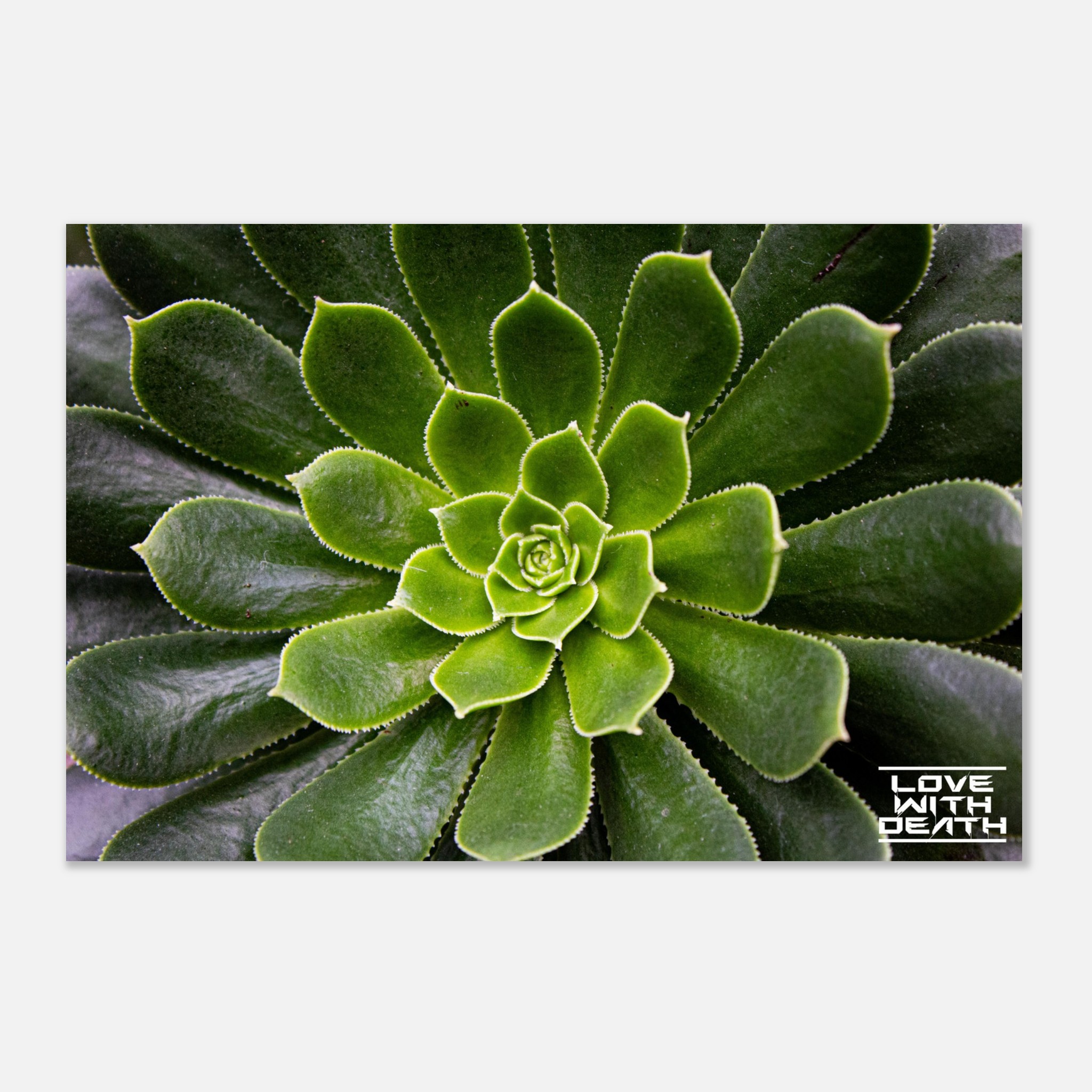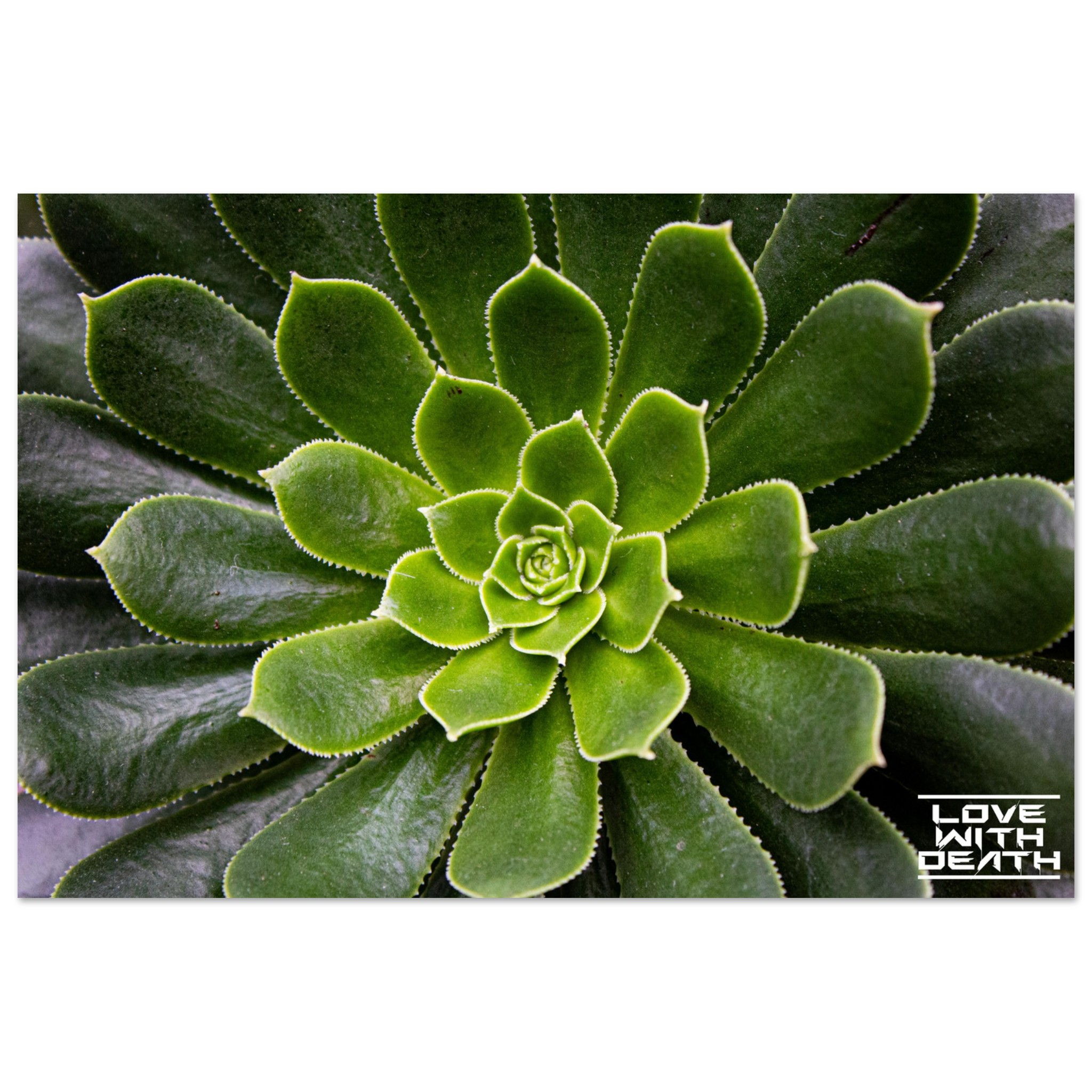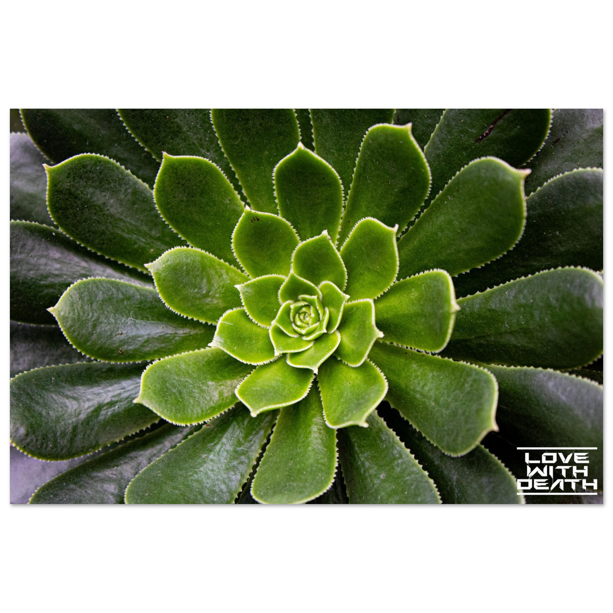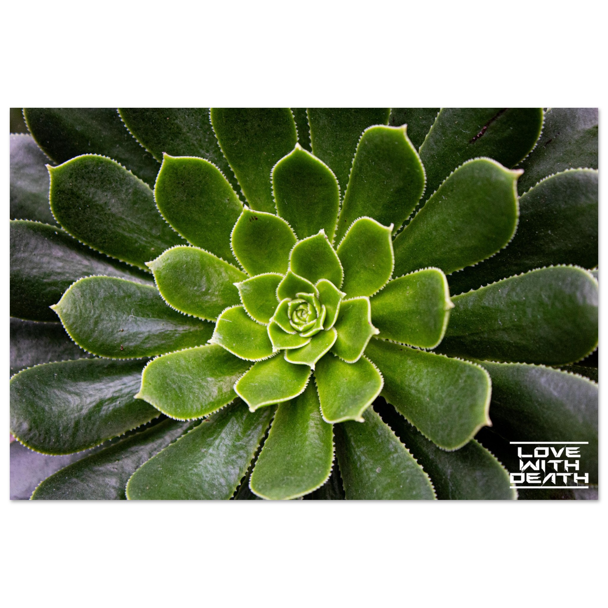 A close-up of a green succulent with leaves arranged in a perfect spiral. The sharp, serrated edges add a striking structure, while the deep green hues symbolize freshness and life. This image captures the fascinating geometry and symmetry of nature.
