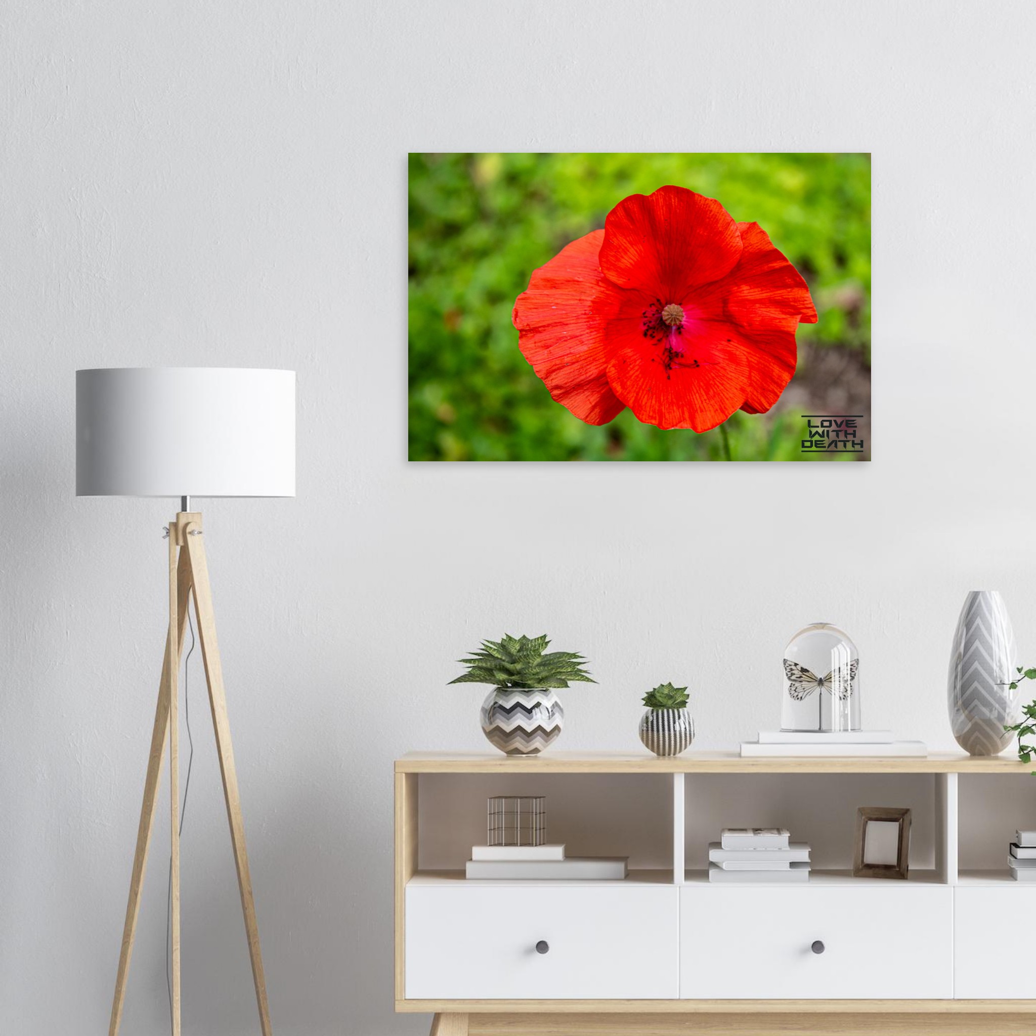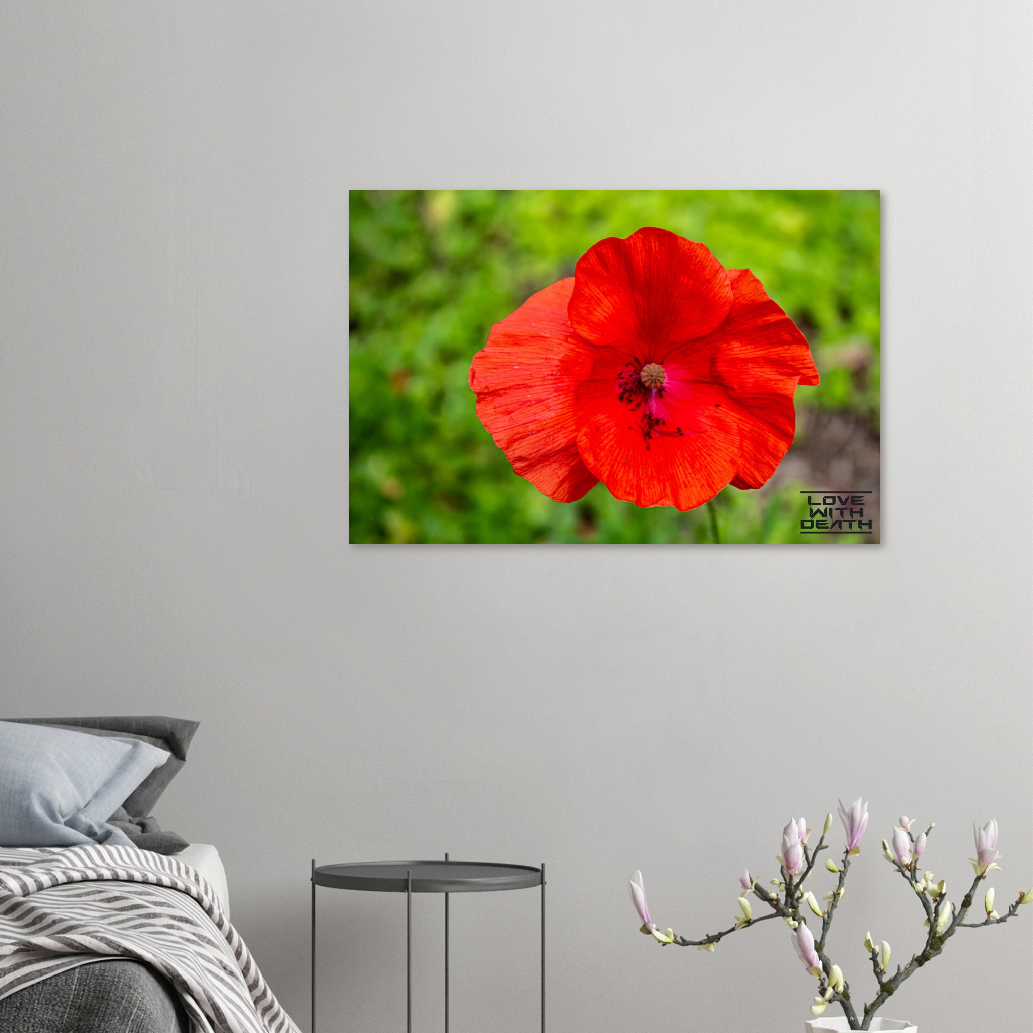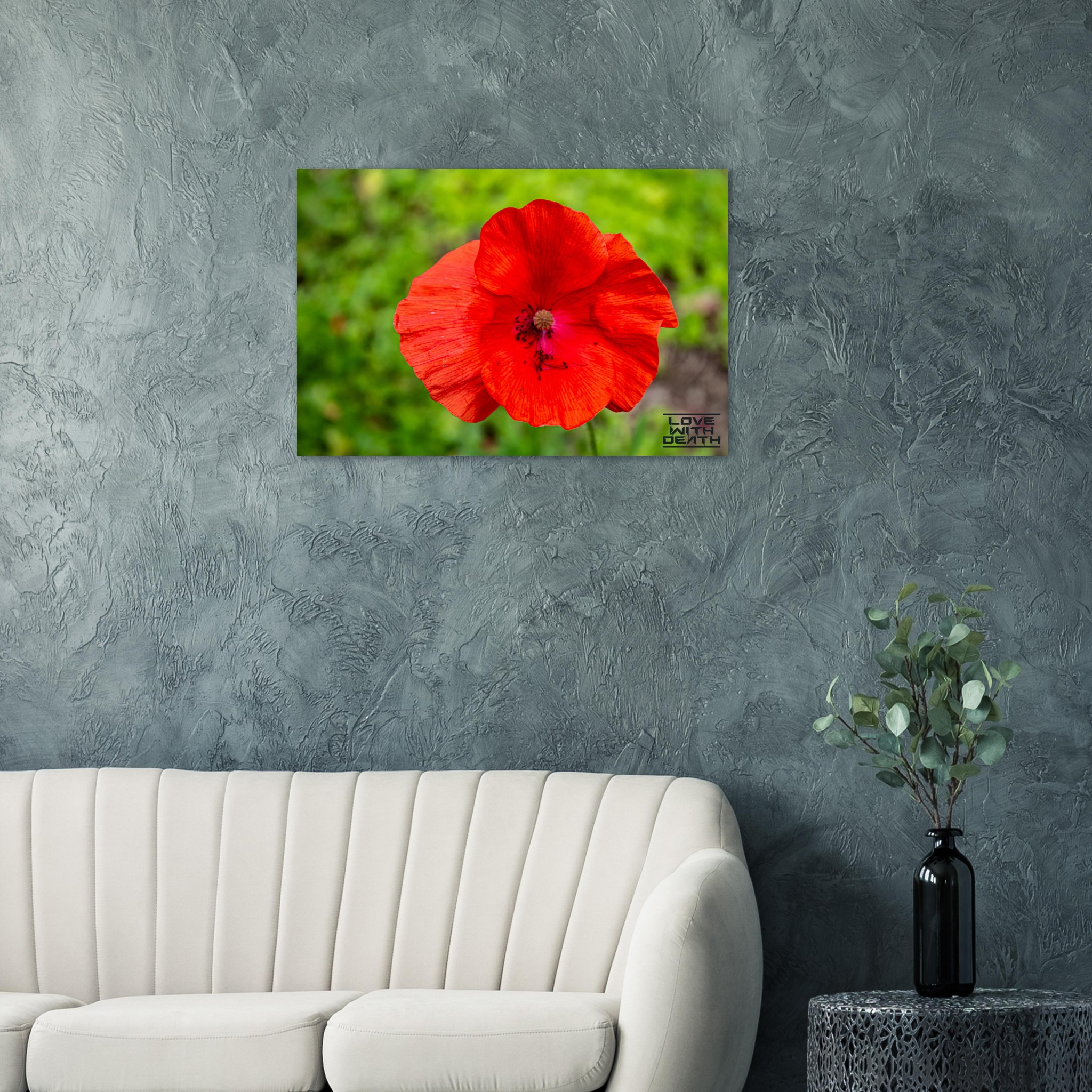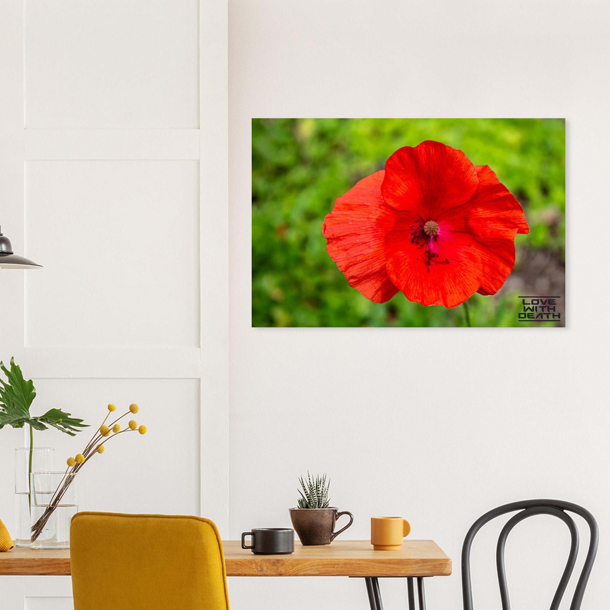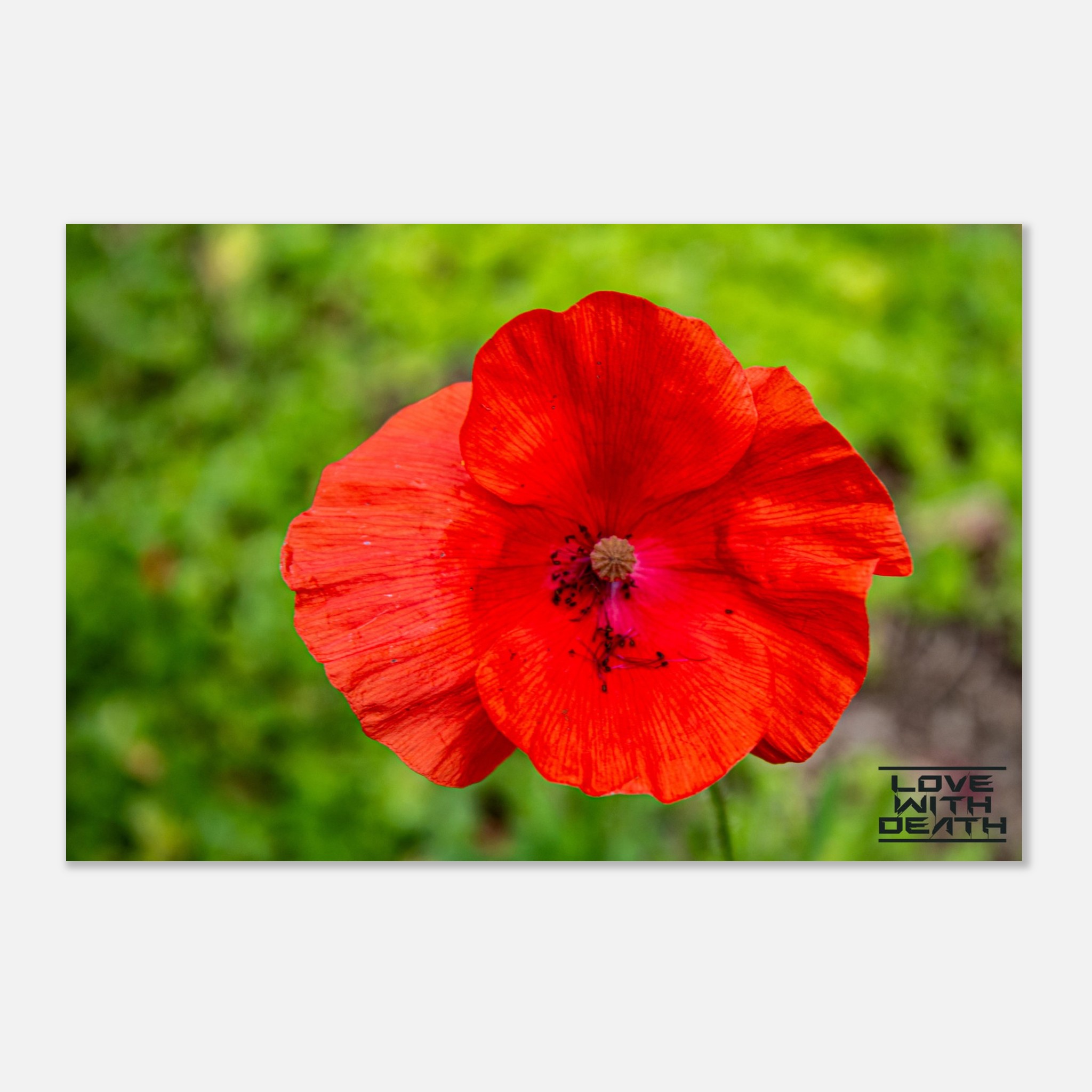 This striking image of a red poppy highlights the delicate structure of its petals and the bold black stigma. The green, blurred background accentuates the vibrant color of the bloom, adding depth to the photo.